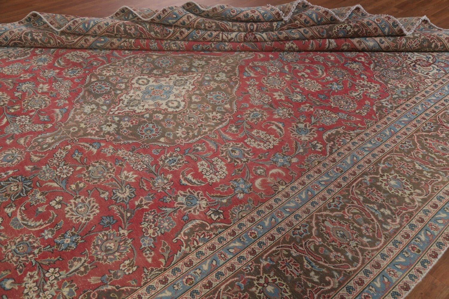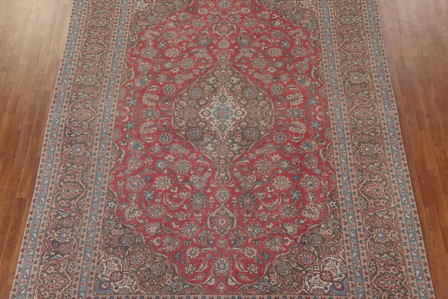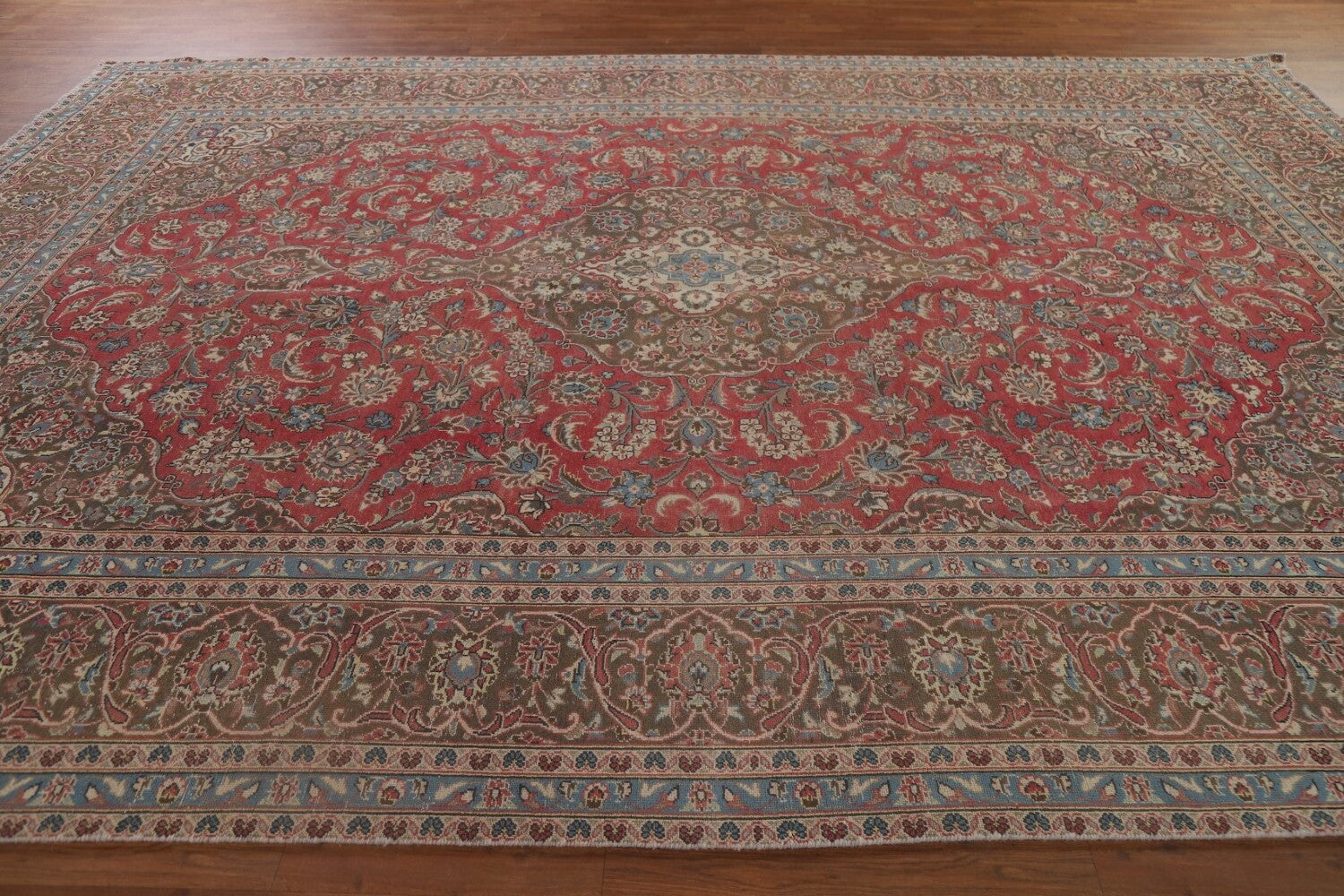 A Beautiful Genuine Persia ( Persia ) Kashan rug is Hand Knotted by skillful weavers in Persia ( Persia ) with 100% Wool Material. This rug is in Very Good (Evenly Low Pile) condition. dimensions are 12' 11'' X 9' 6'' in foot and 394 X 290 in centimeter. the primary color is Red.