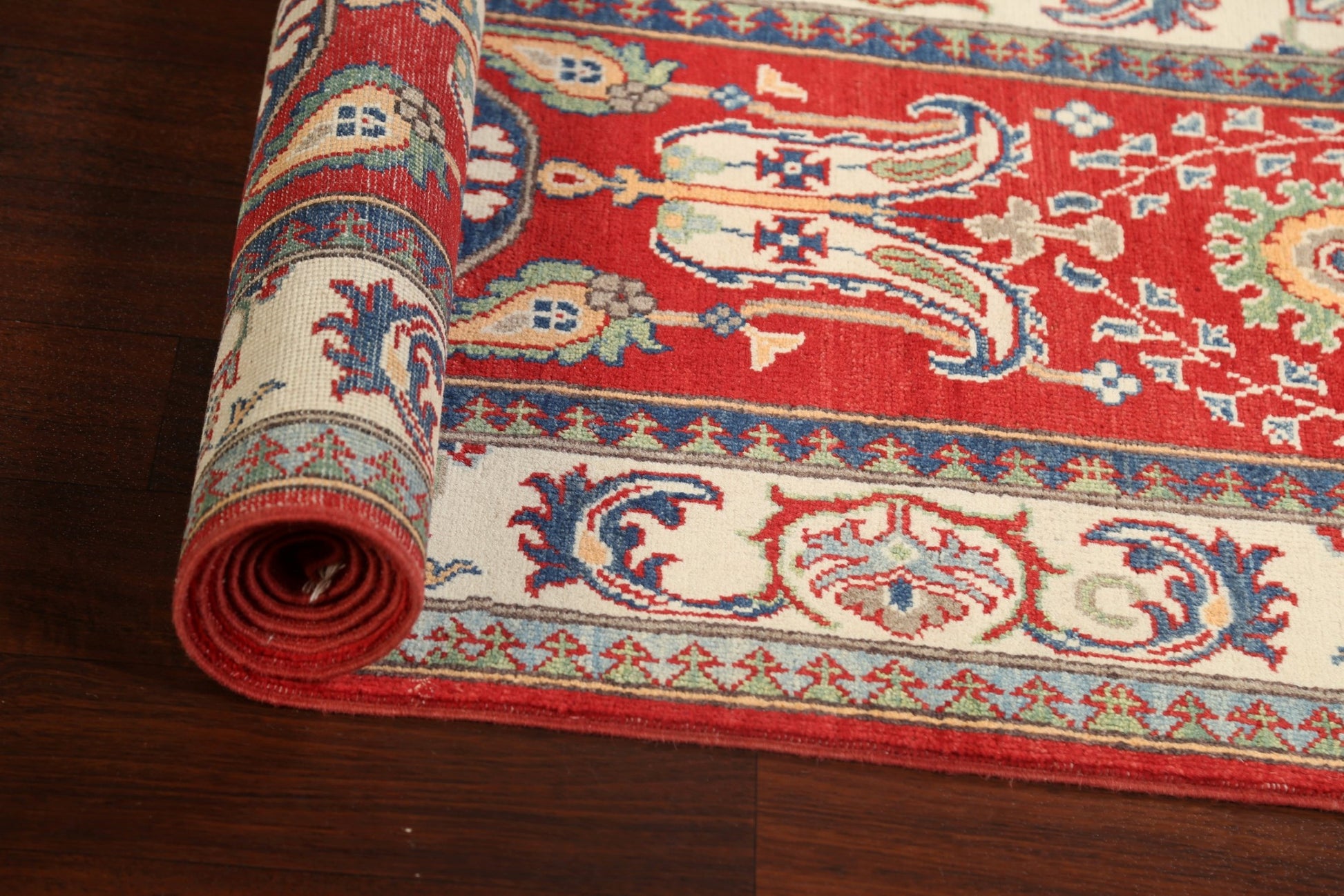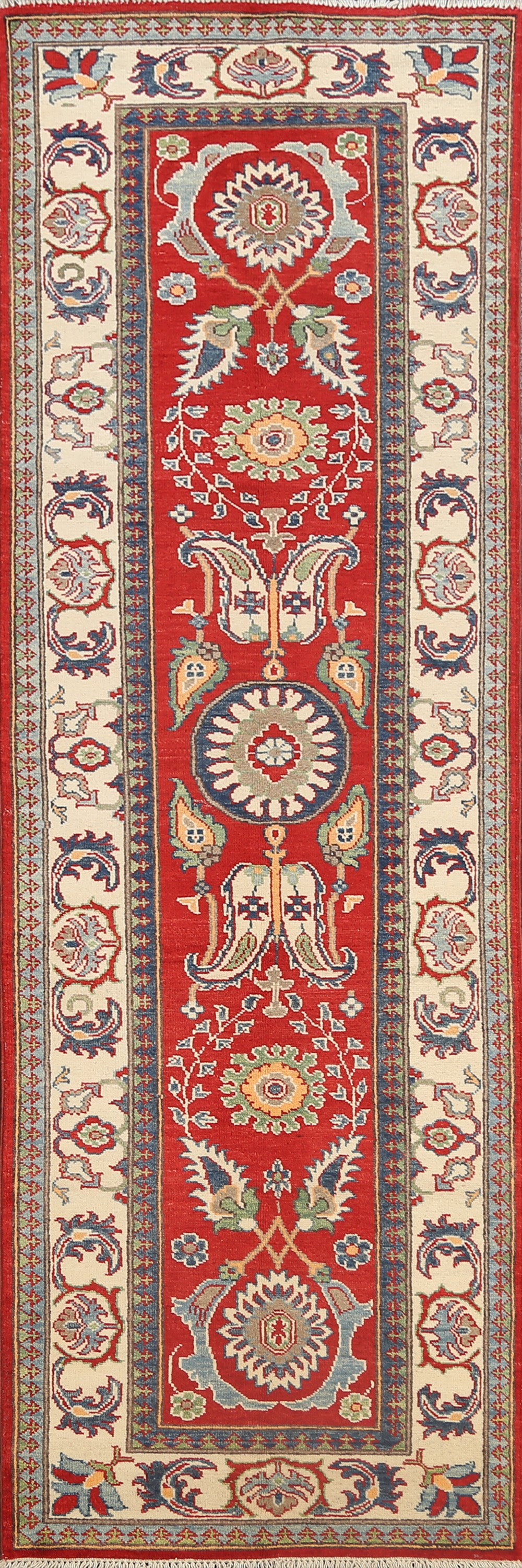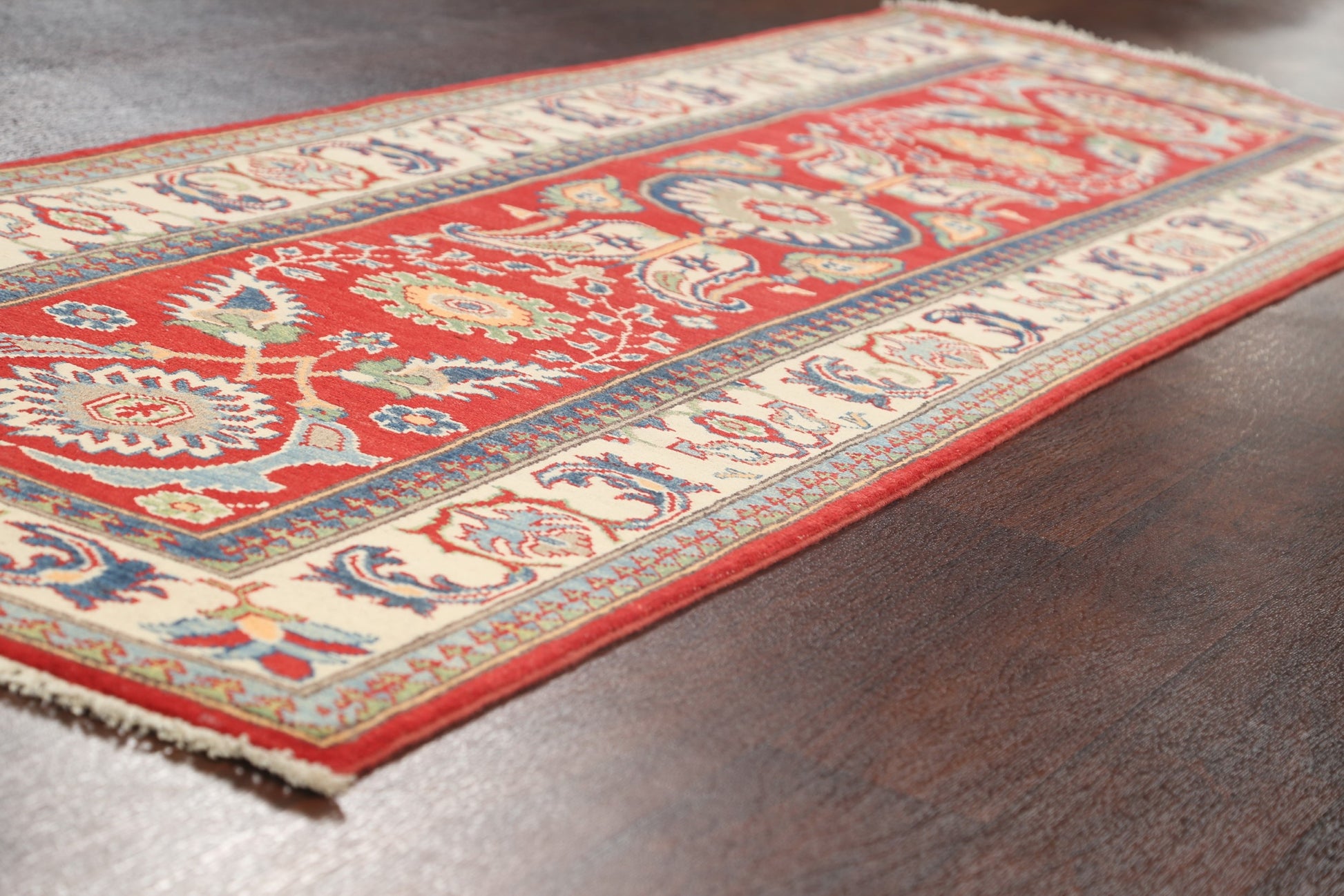 A Beautiful Genuine Pakistan Kazak rug is Hand Knotted by skillful weavers in Pakistan with 100% Wool Material. This rug is in New, First Quality condition. dimensions are 9' 1'' X 2' 8'' in foot and 277 X 81 in centimeter. the primary color is Red.