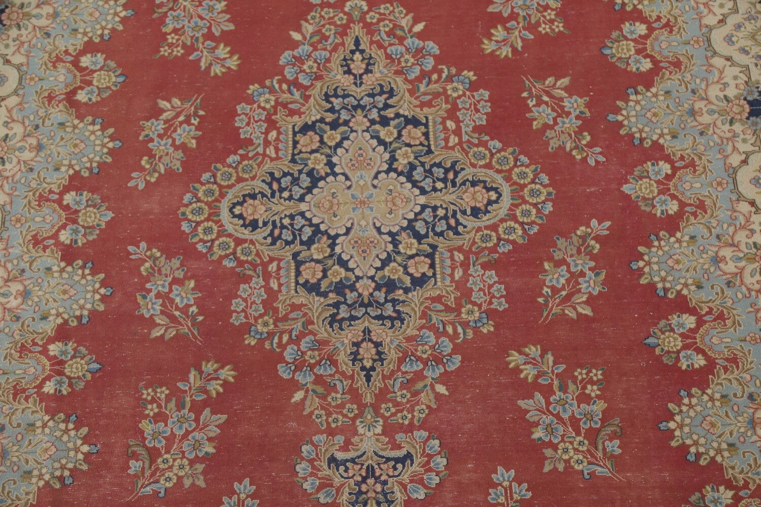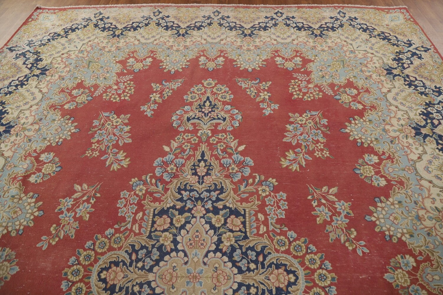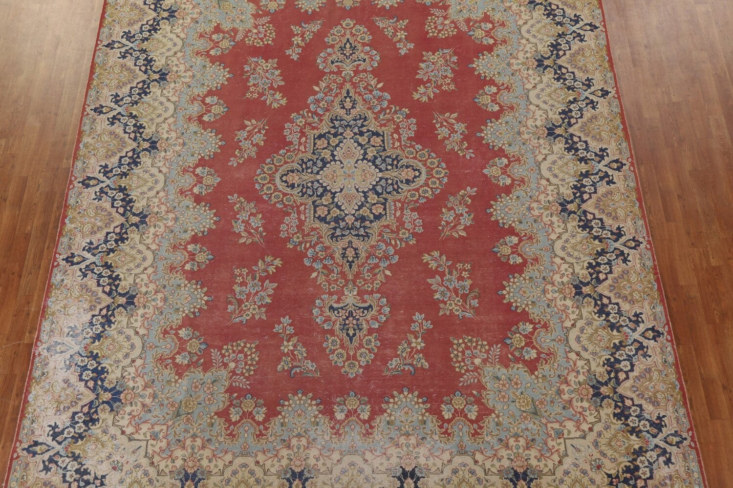 A Beautiful Genuine Persia ( Persia ) Kerman rug is Hand Knotted by skillful weavers in Persia ( Persia ) with 100% Wool Material. This rug is in Very Good (Low Pile-Repair) condition. dimensions are 13' 1'' X 9' 11'' in foot and 399 X 302 in centimeter. the primary color is Red.