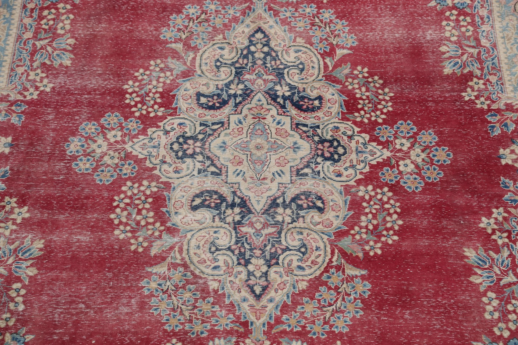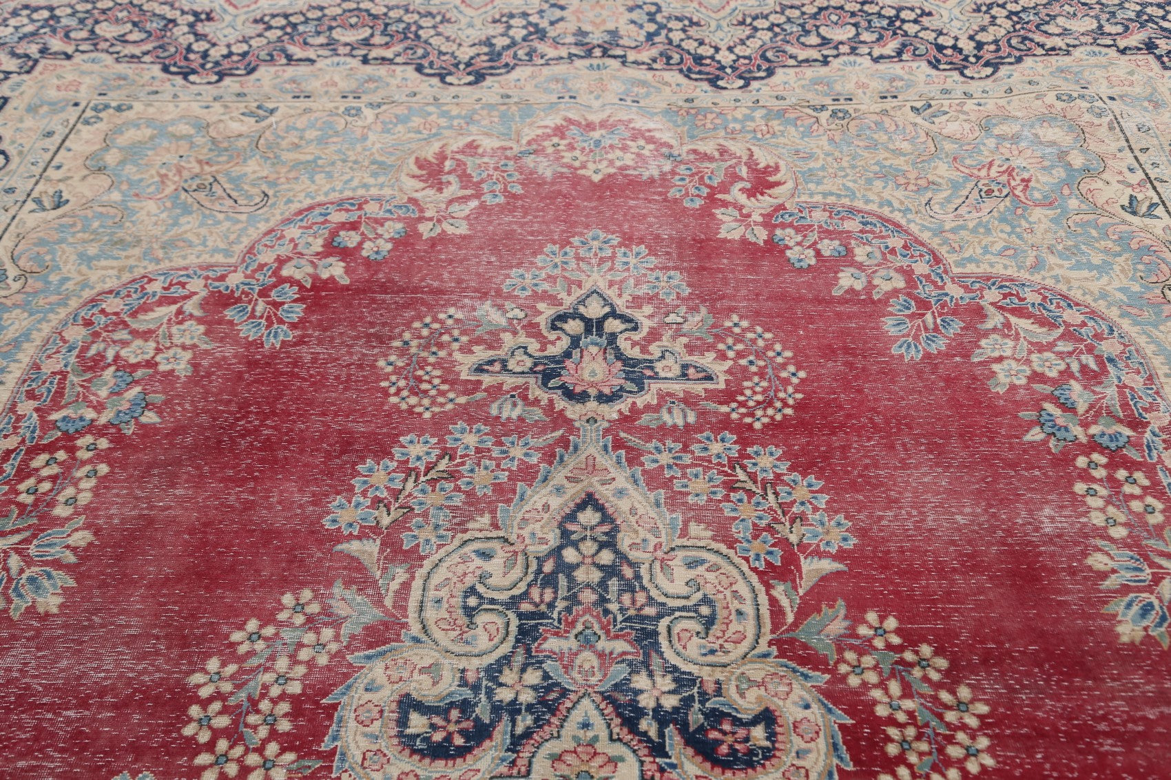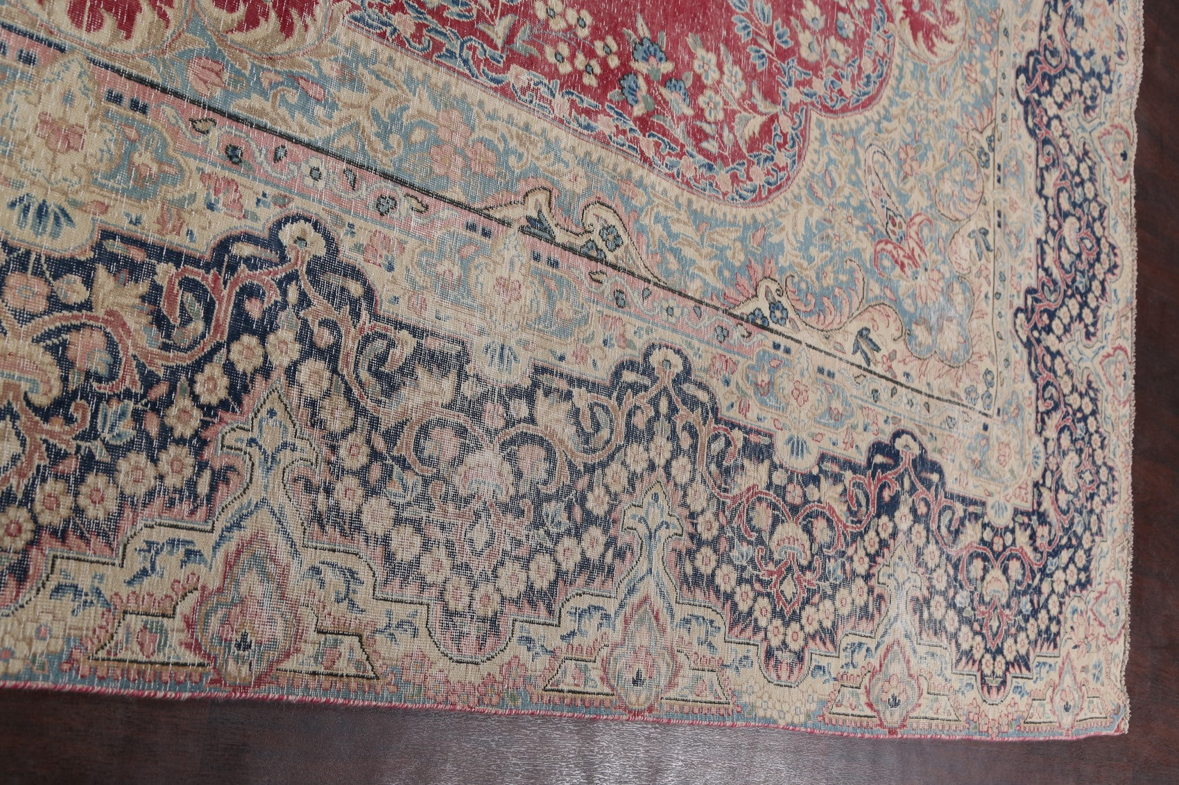 A Beautiful Genuine Persia ( Persia ) Kerman rug is Hand Knotted by skillful weavers in Persia ( Persia ) with 100% Wool Material. This rug is in Very Good (Evenly Low Pile) condition. dimensions are 13' 7'' X 9' 8'' in foot and 414 X 295 in centimeter. the primary color is Red.