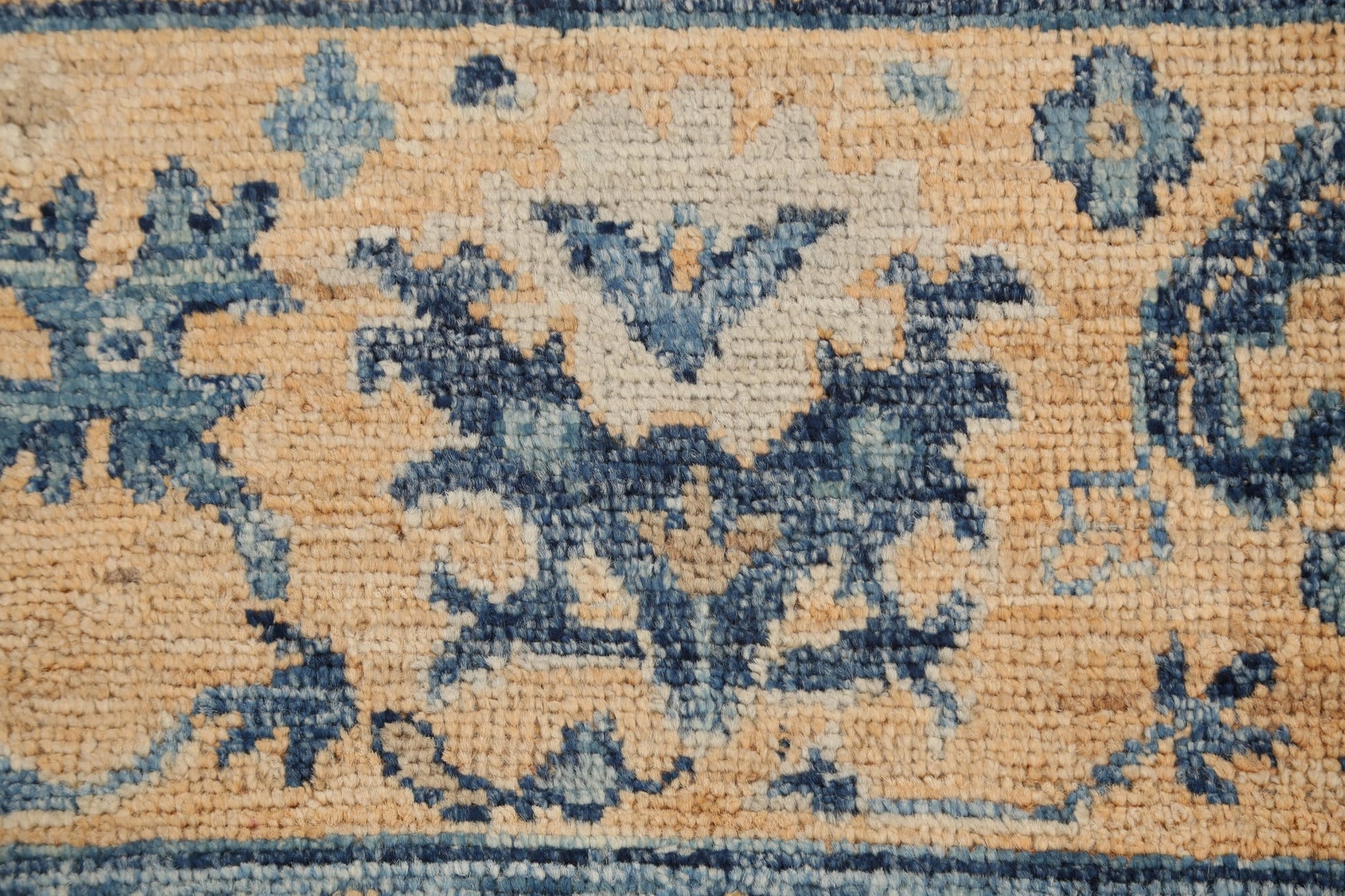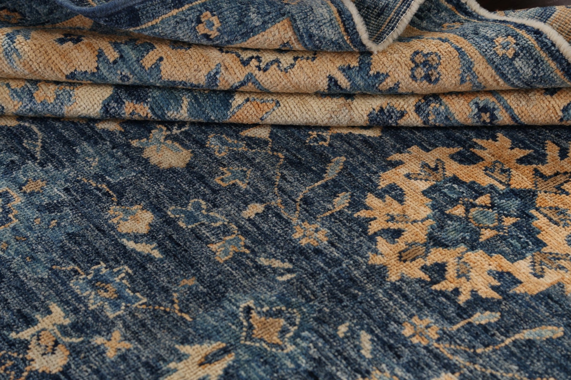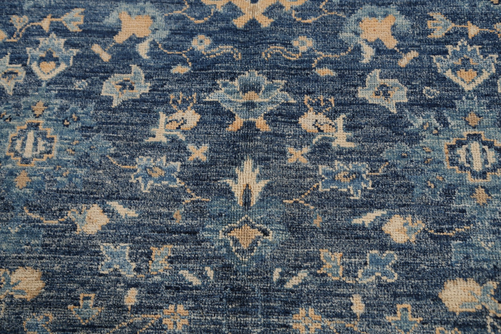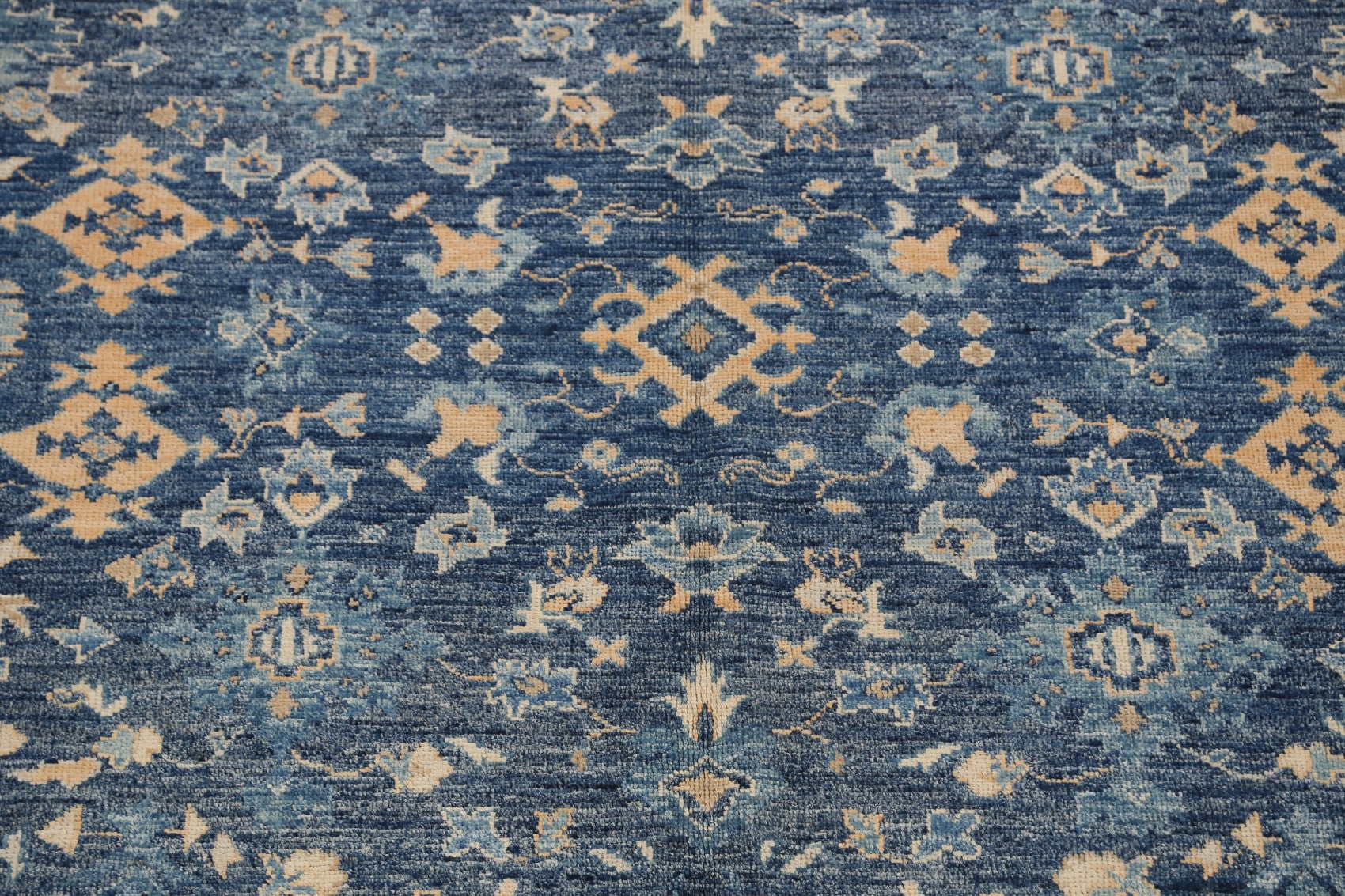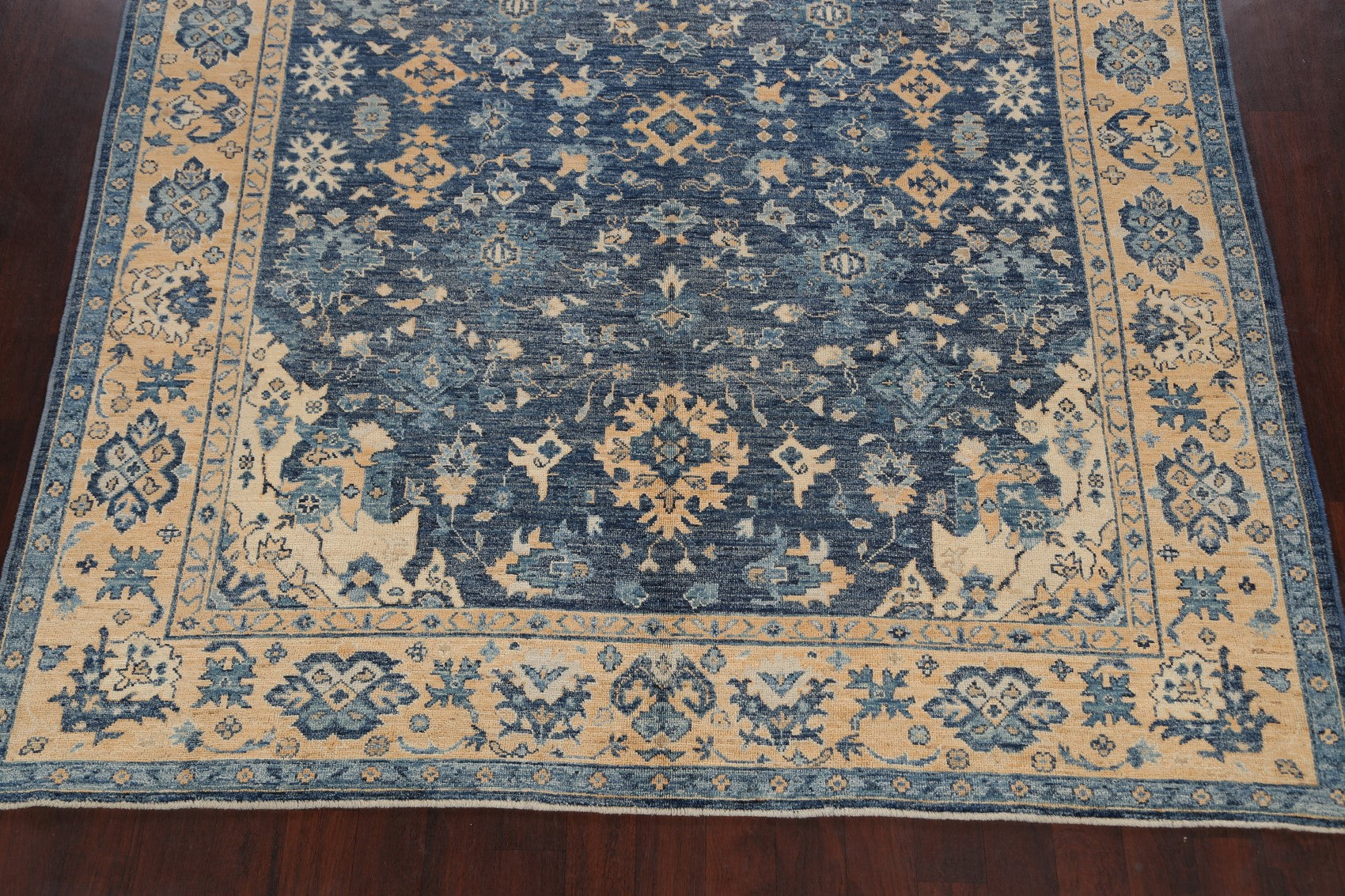 A Beautiful Genuine Pakistan Khotan rug is Hand Knotted by skillful weavers in Pakistan with 100% Wool Material. This rug is in New, First Quality condition. dimensions are 10' 1'' X 8' 5'' in foot and 307 X 257 in centimeter. the primary color is Navy Blue & Blues.