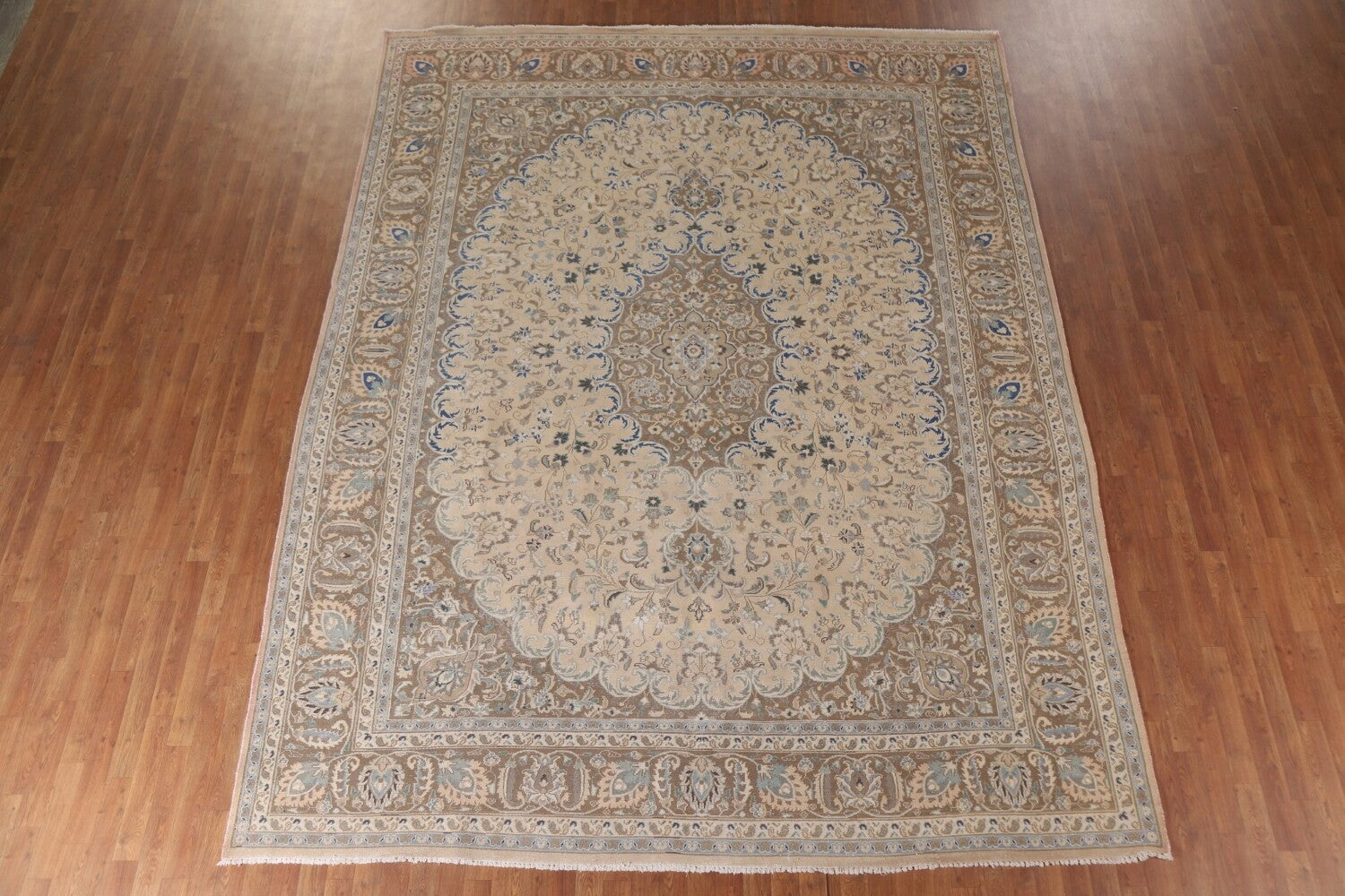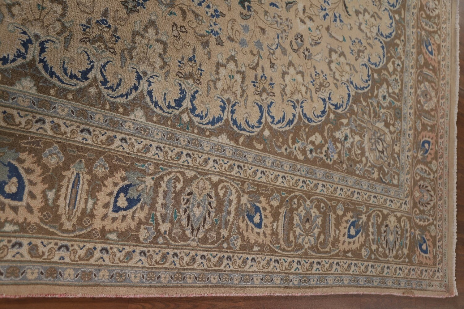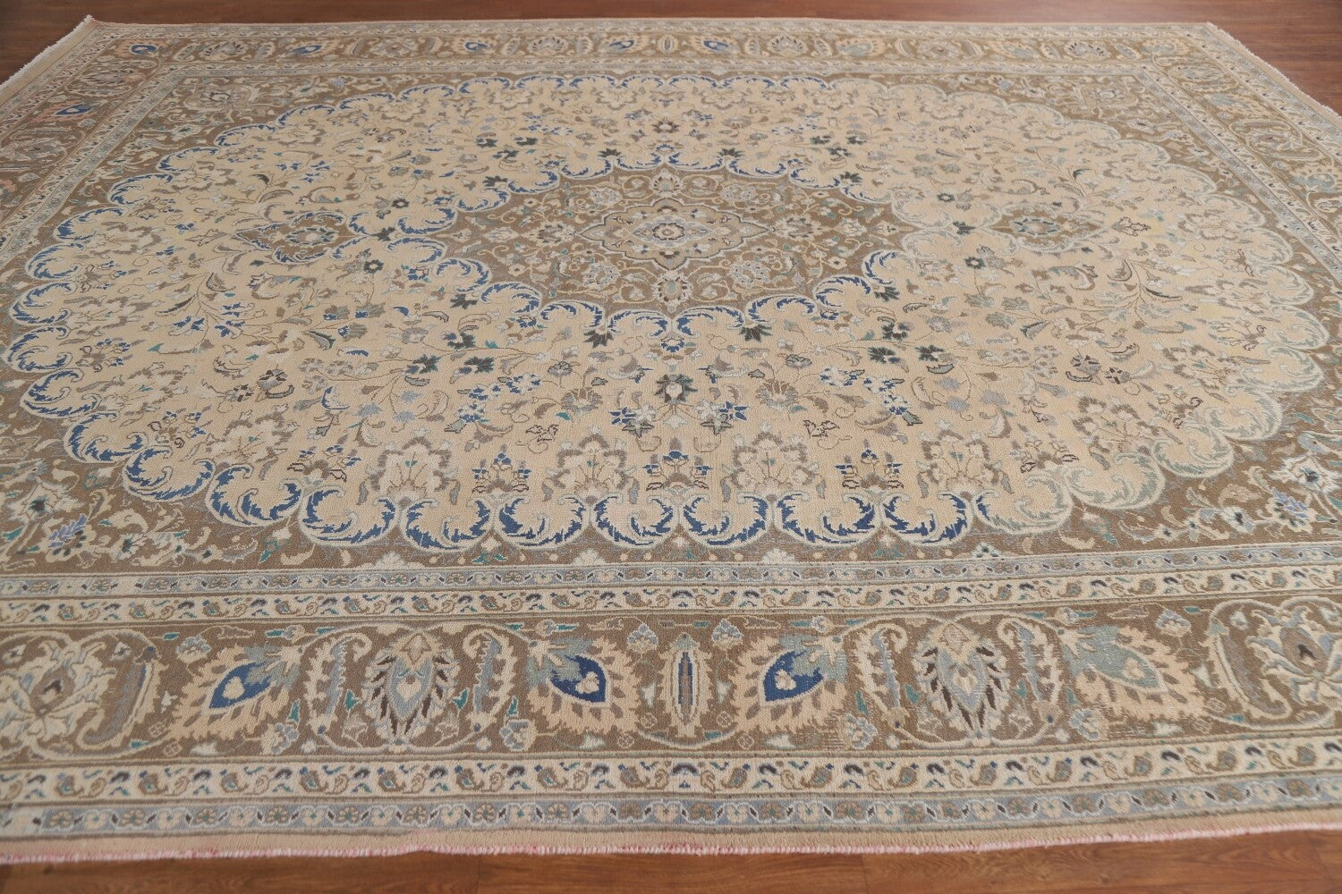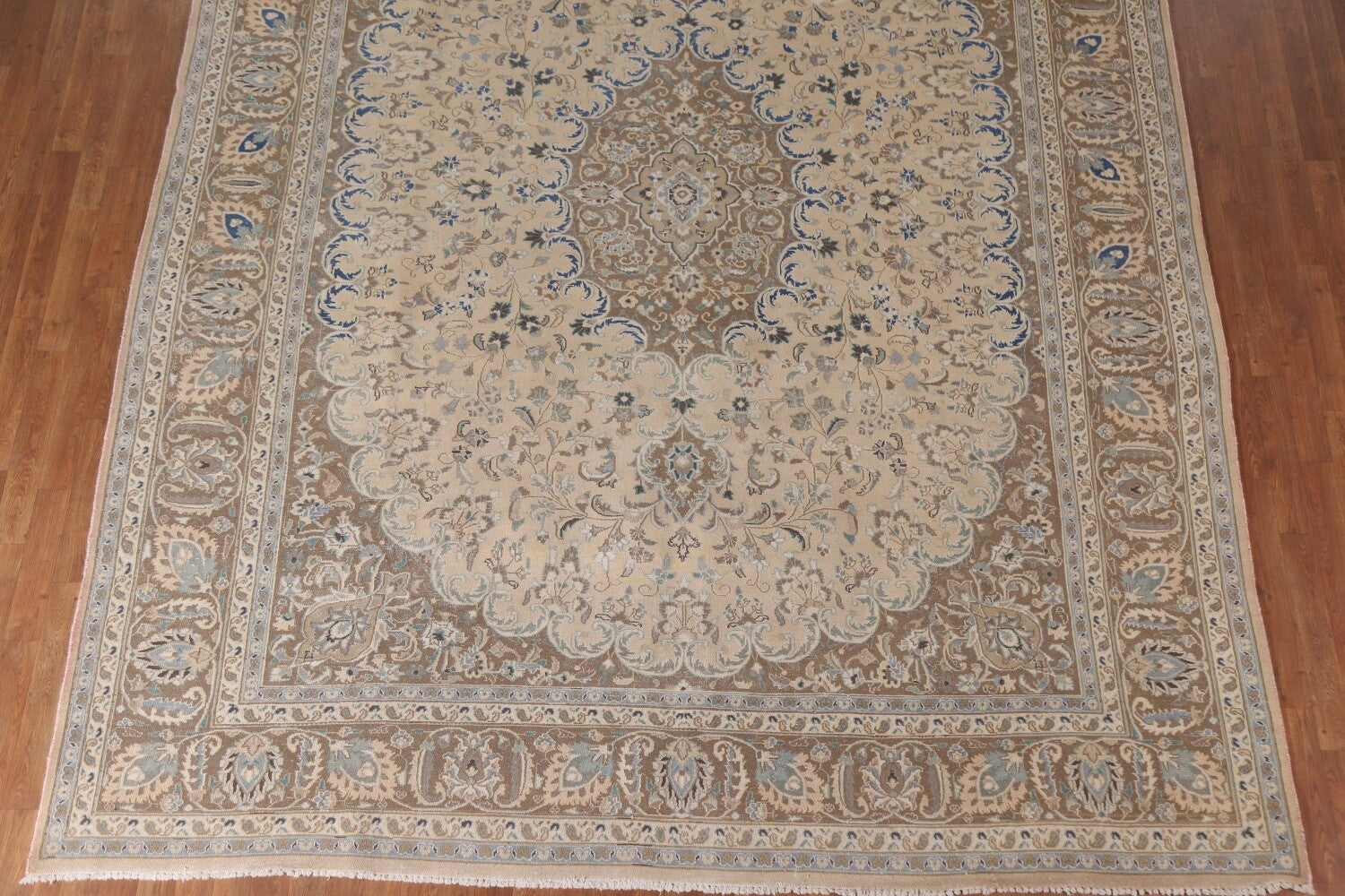 A Beautiful Genuine Persia ( Persia ) Mashad rug is Hand Knotted by skillful weavers in Persia ( Persia ) with 100% Wool Material. This rug is in Very Good (Evenly Low Pile-Repair) condition. dimensions are 12' 6'' X 9' 7'' in foot and 381 X 292 in centimeter. the primary color is Peach.