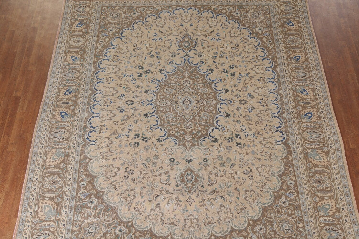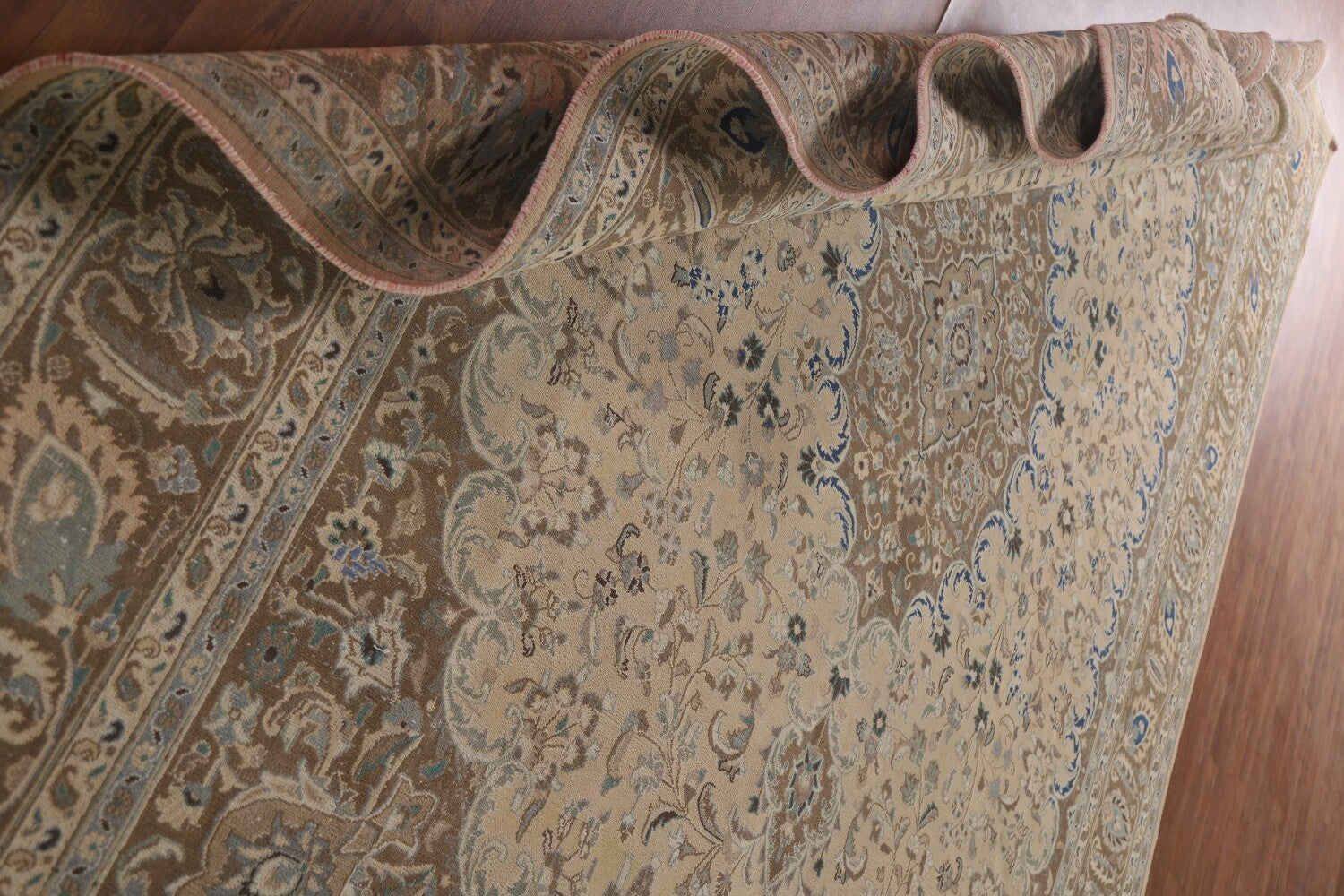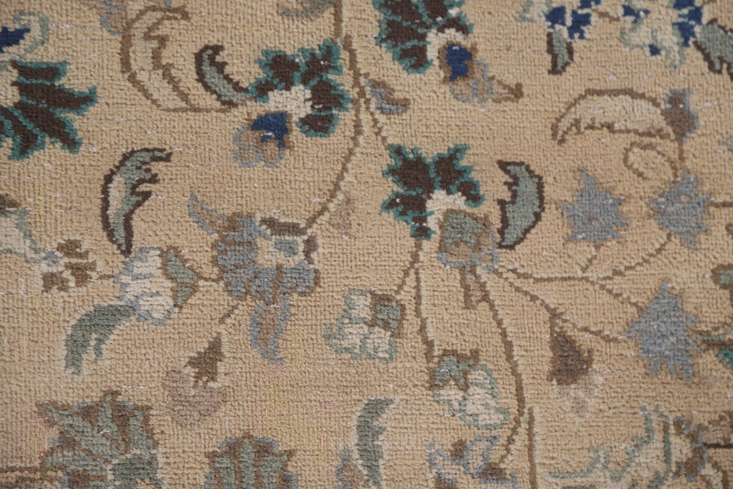 A Beautiful Genuine Persia ( Persia ) Mashad rug is Hand Knotted by skillful weavers in Persia ( Persia ) with 100% Wool Material. This rug is in Very Good (Evenly Low Pile-Repair) condition. dimensions are 12' 6'' X 9' 7'' in foot and 381 X 292 in centimeter. the primary color is Peach.