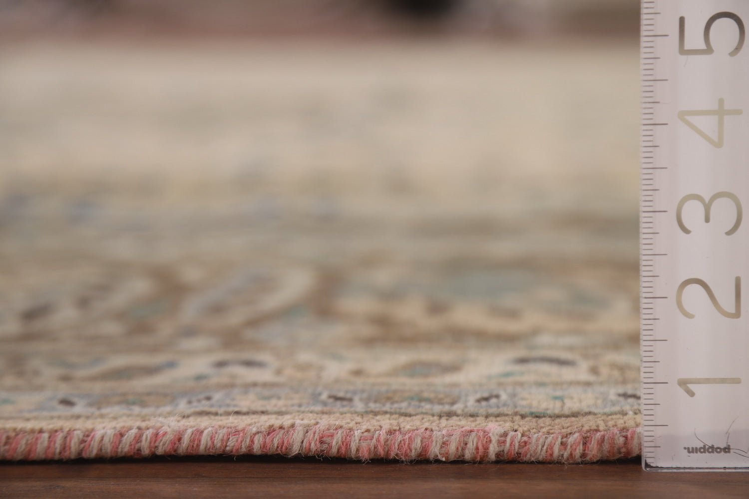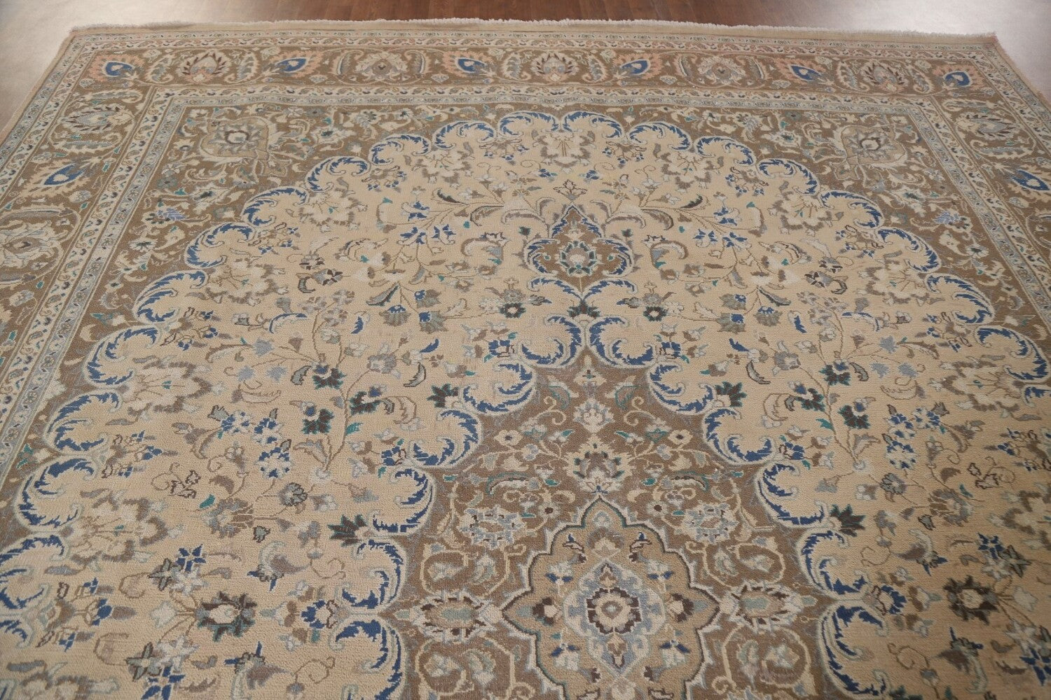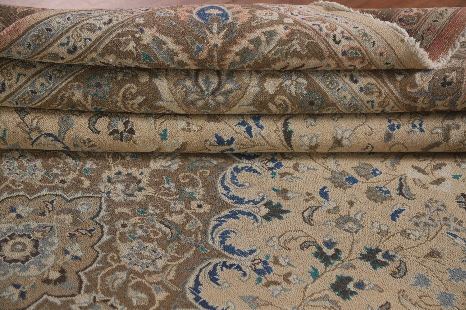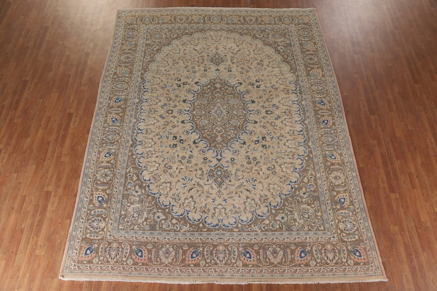 A Beautiful Genuine Persia ( Persia ) Mashad rug is Hand Knotted by skillful weavers in Persia ( Persia ) with 100% Wool Material. This rug is in Very Good (Evenly Low Pile-Repair) condition. dimensions are 12' 6'' X 9' 7'' in foot and 381 X 292 in centimeter. the primary color is Peach.