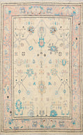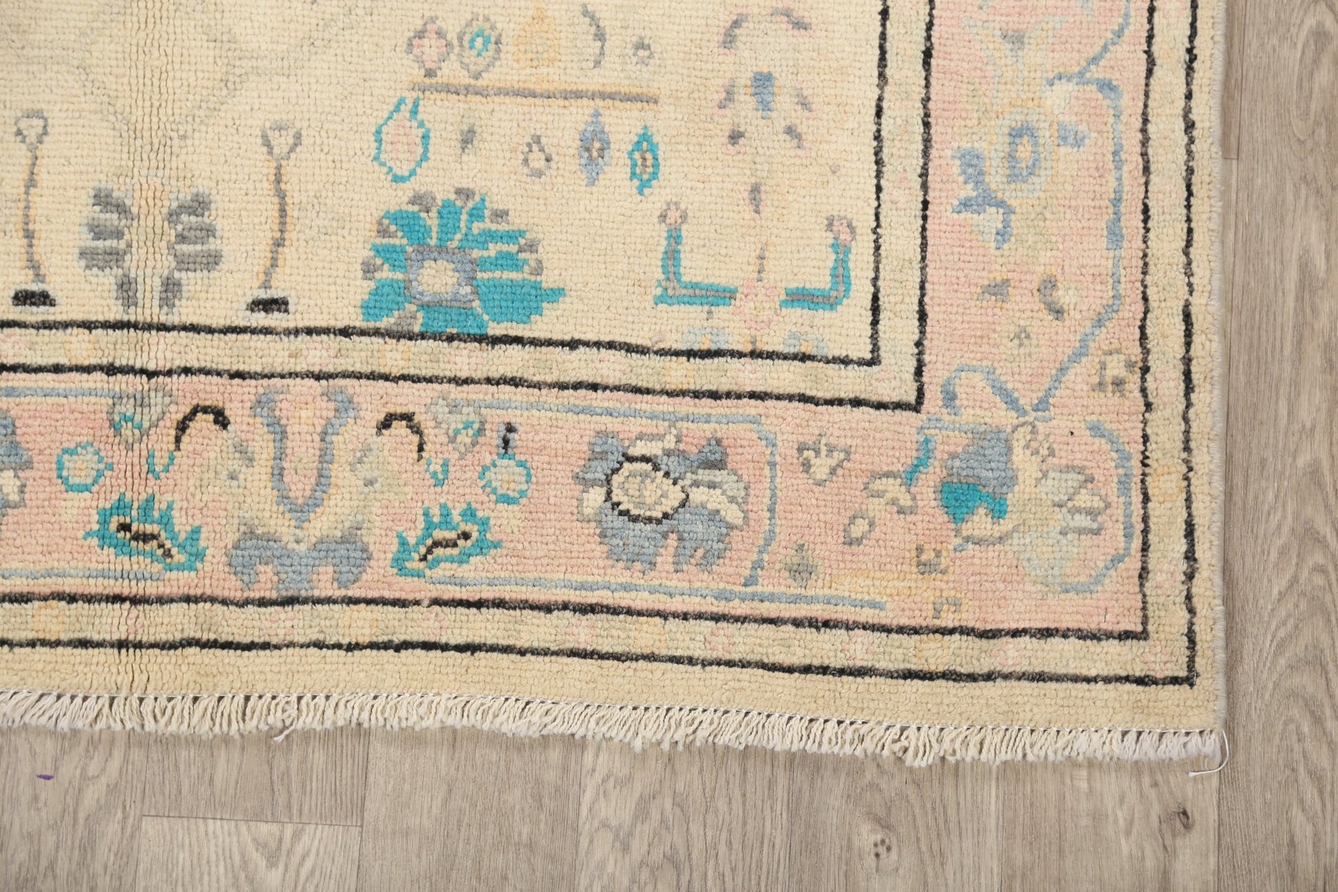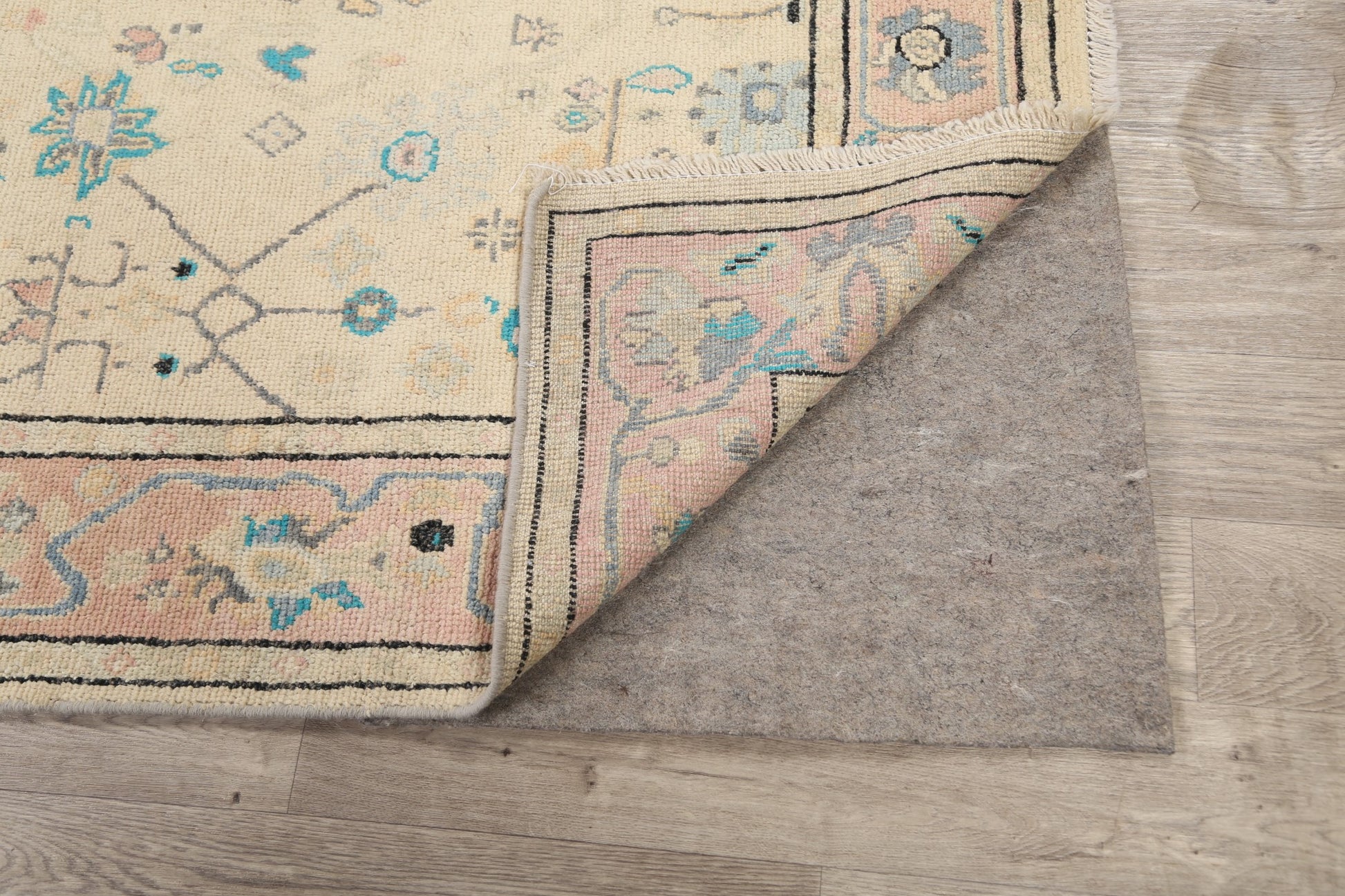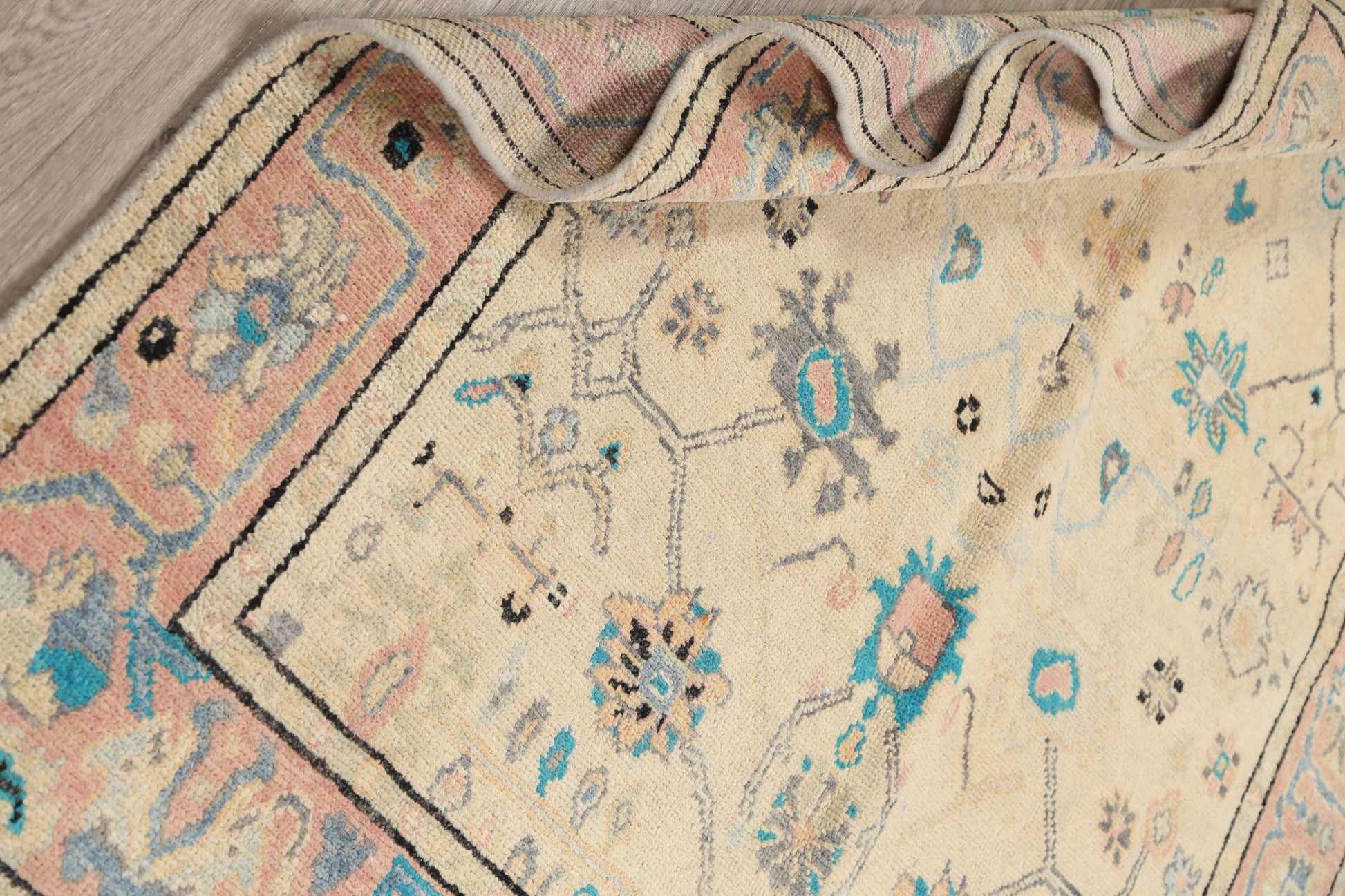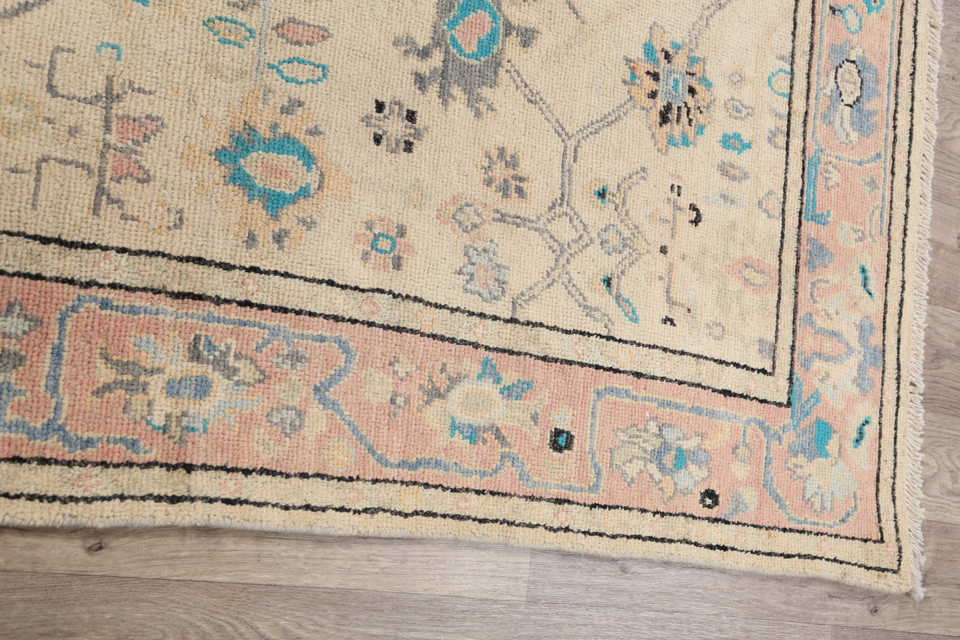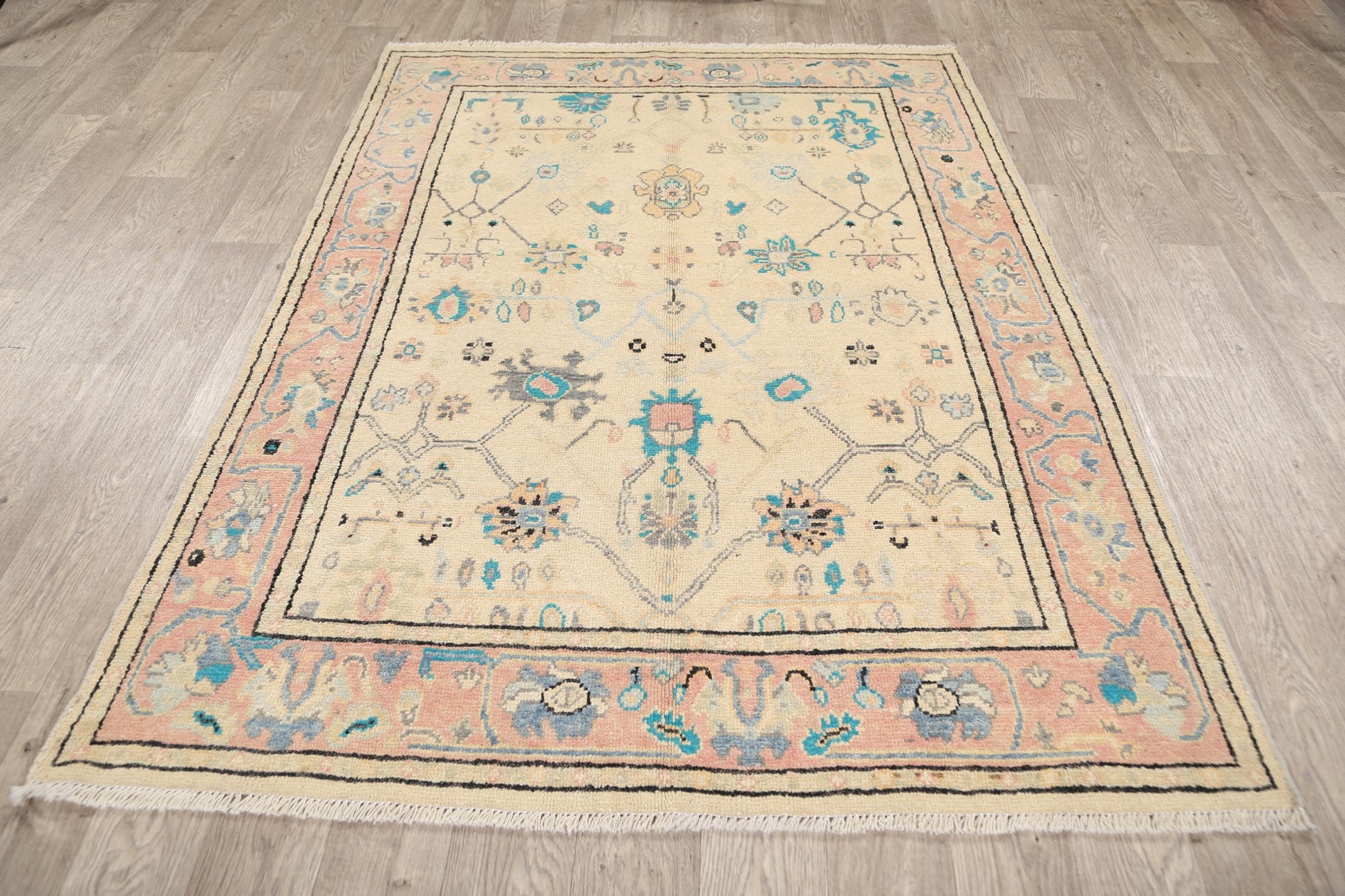 A Beautiful Genuine Turkey Oushak rug is Hand Knotted by skillful weavers in Turkey with 100% Wool Material. This rug is in New, First Quality condition. dimensions are 6' 5'' X 4' 8'' in foot and 196 X 142 in centimeter. the primary color is Beige & Ivories.