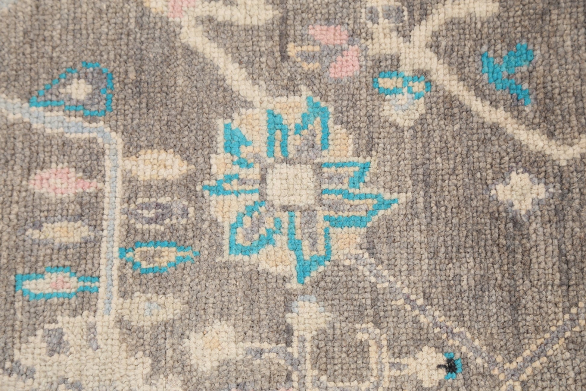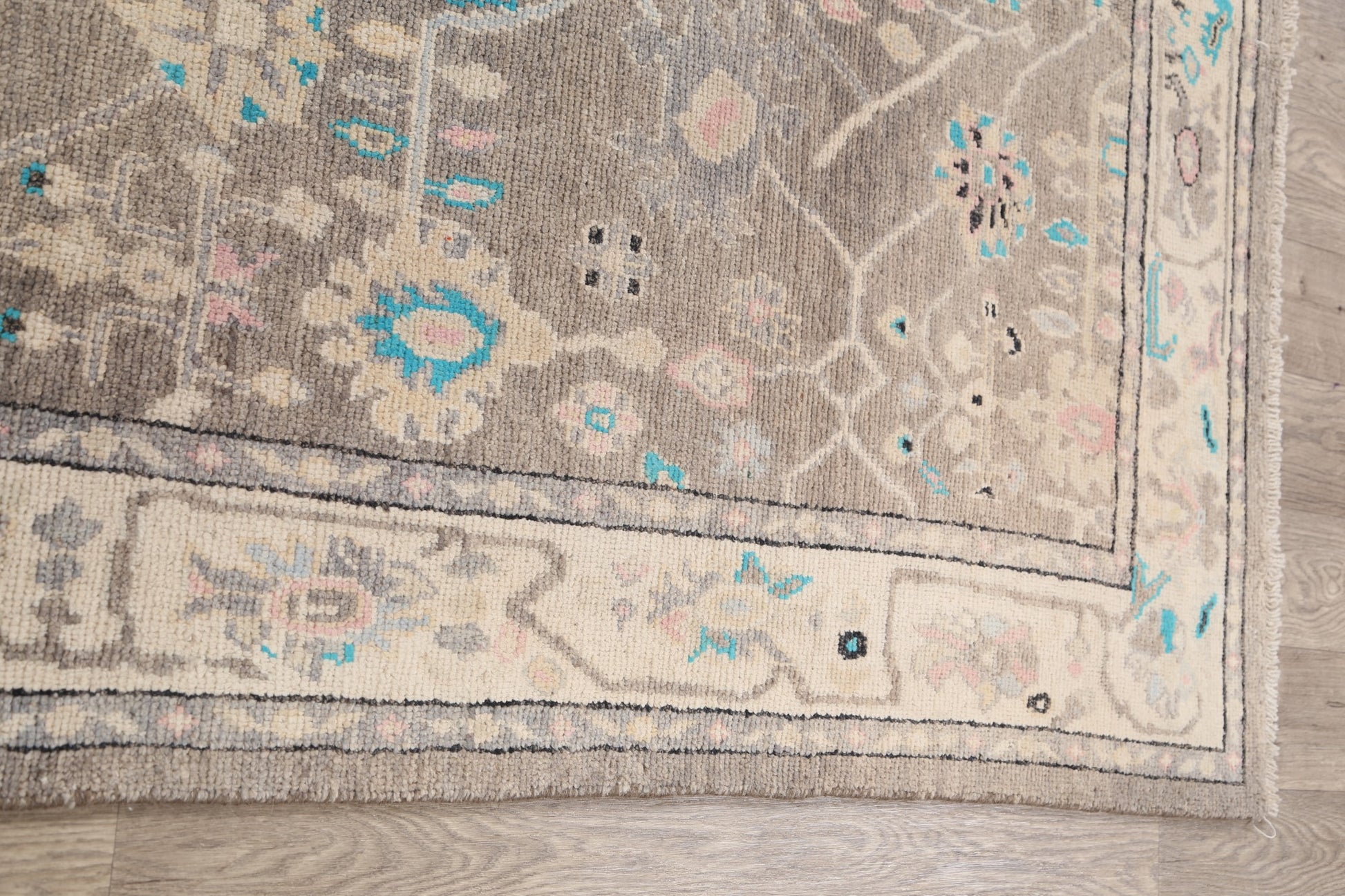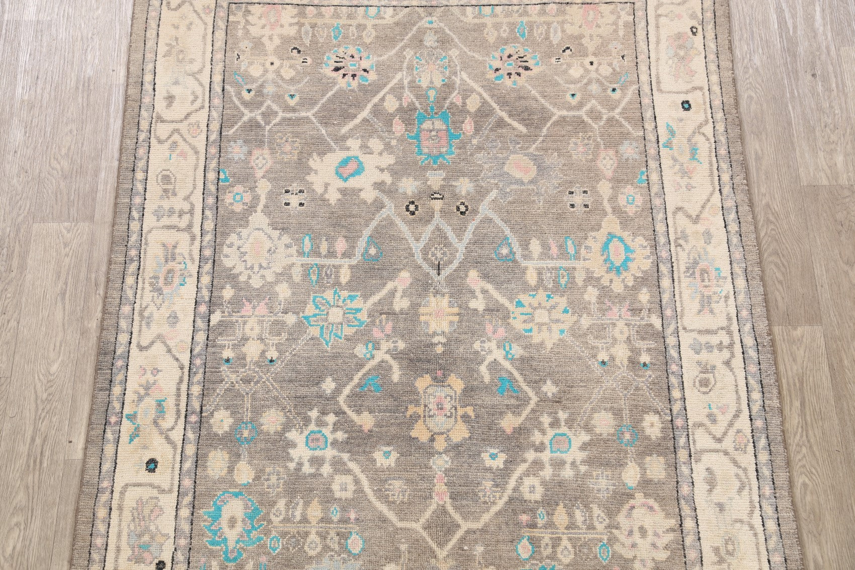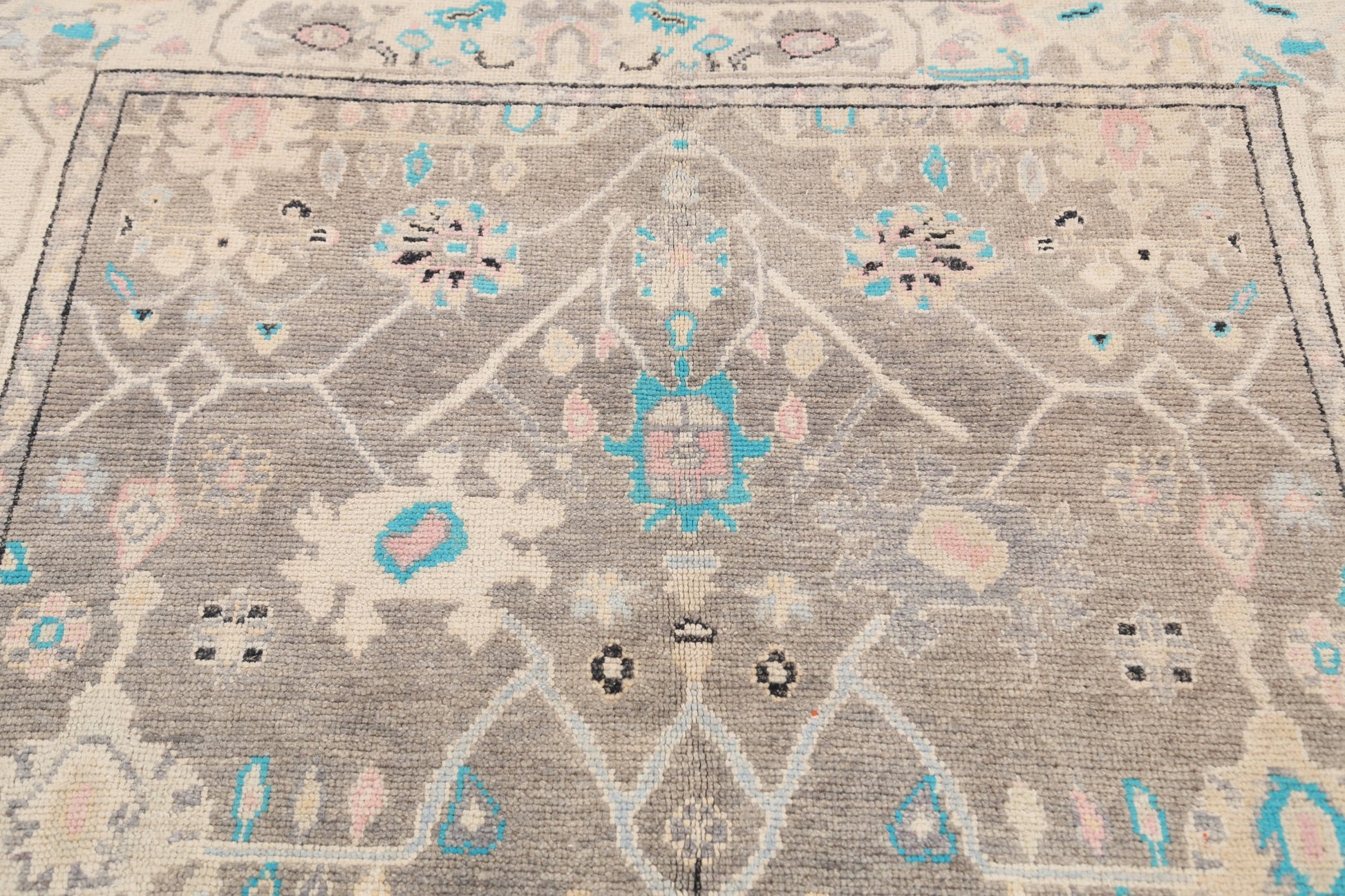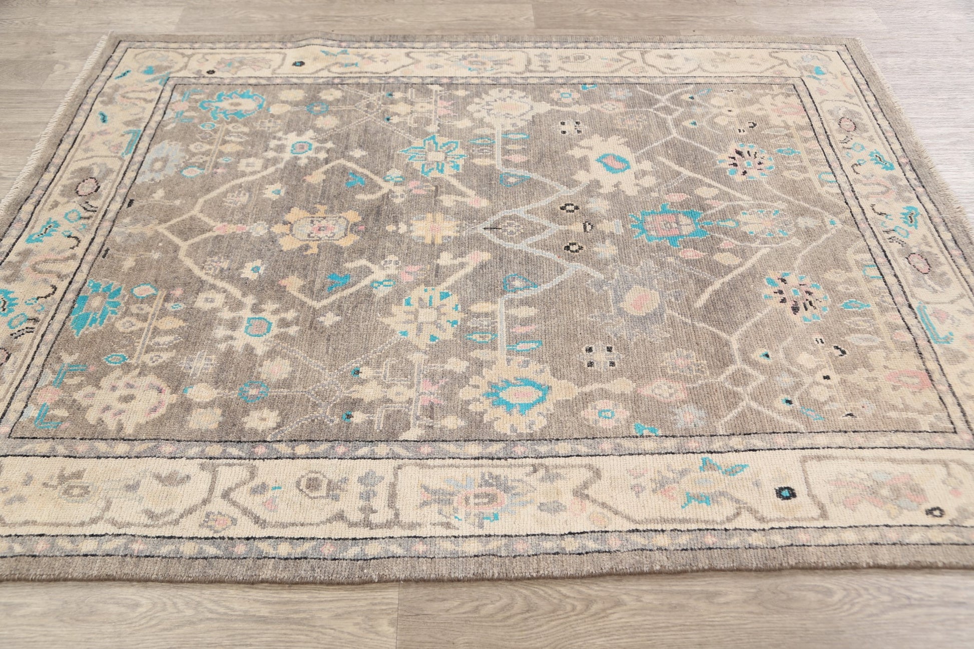A Beautiful Genuine Turkey Oushak rug is Hand Knotted by skillful weavers in Turkey with 100% Wool Material. This rug is in New, First Quality condition. dimensions are 6' 6'' X 5' 0'' in foot and 198 X 152 in centimeter. the primary color is Greys & Charcoal.