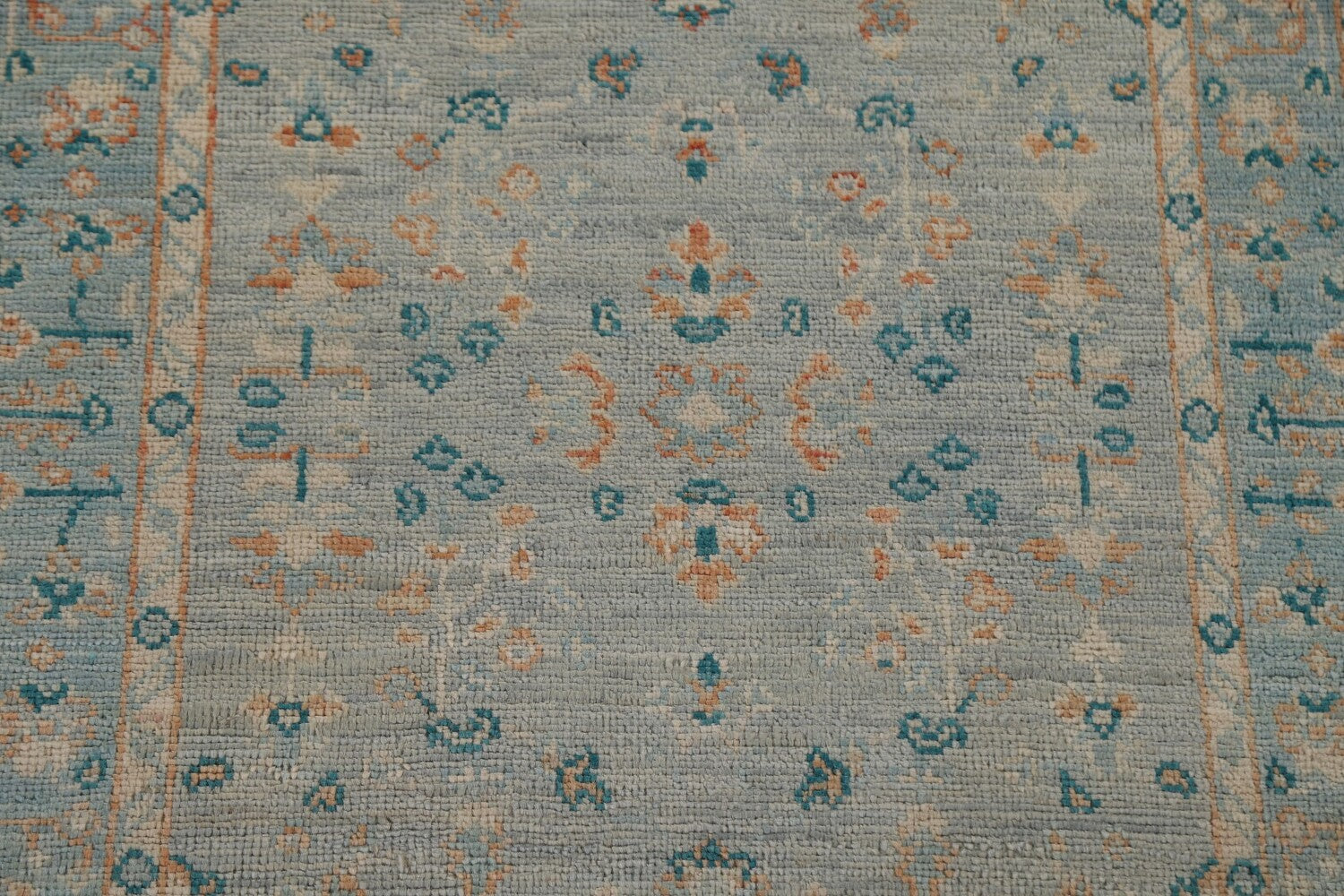 A Beautiful Genuine Turkey Oushak rug is Hand Knotted by skillful weavers in Turkey with 100% Wool Material. This rug is in New, First Quality condition. dimensions are 3' 11'' X 2' 11'' in foot and 119 X 89 in centimeter. the primary color is Navy Blue & Blues.