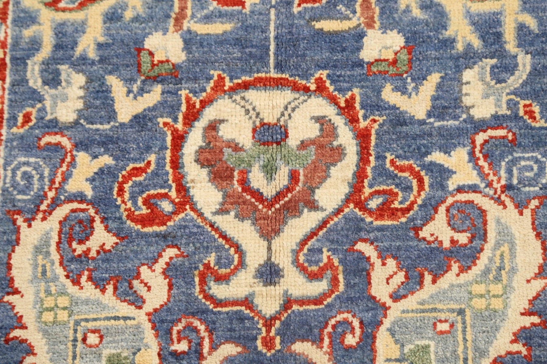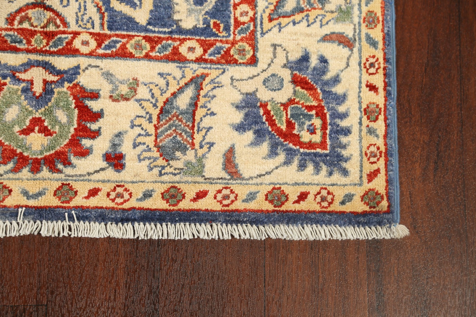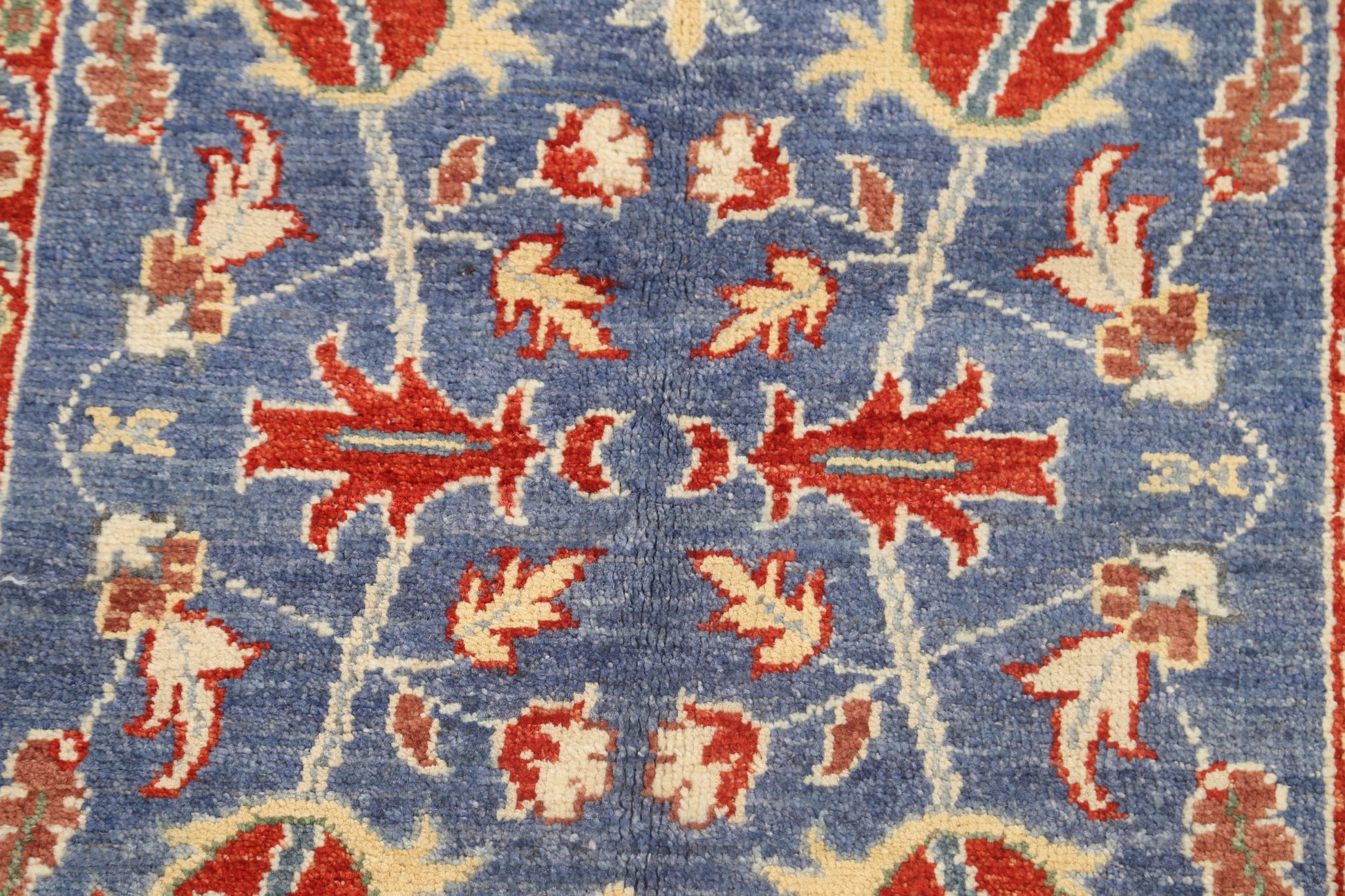 A Beautiful Genuine Pakistan Kazak rug is Hand Knotted by skillful weavers in Pakistan with 100% Wool Material. This rug is in New, First Quality condition. dimensions are 9' 8'' X 2' 9'' in foot and 295 X 84 in centimeter. the primary color is Navy Blue & Blues.