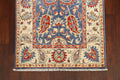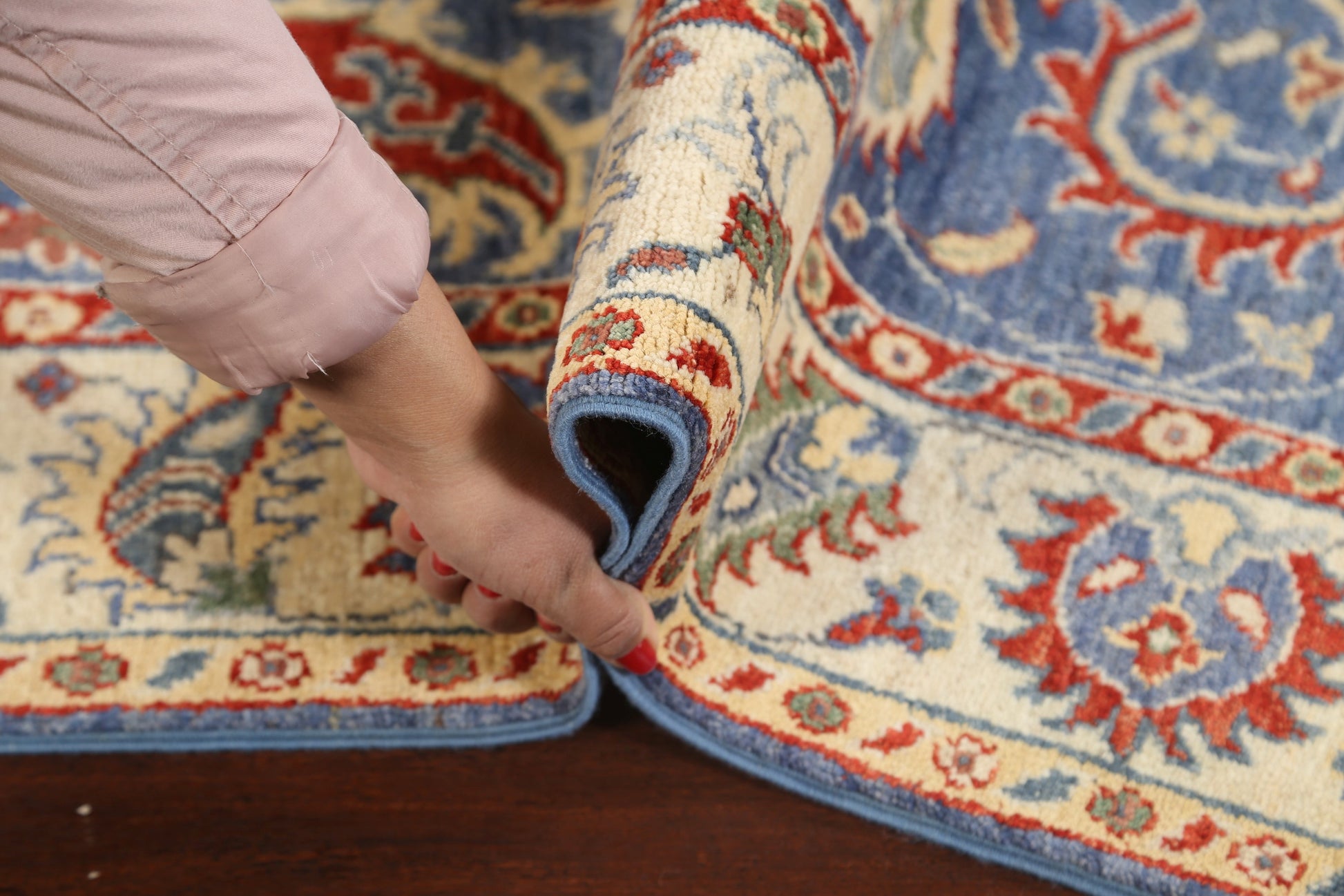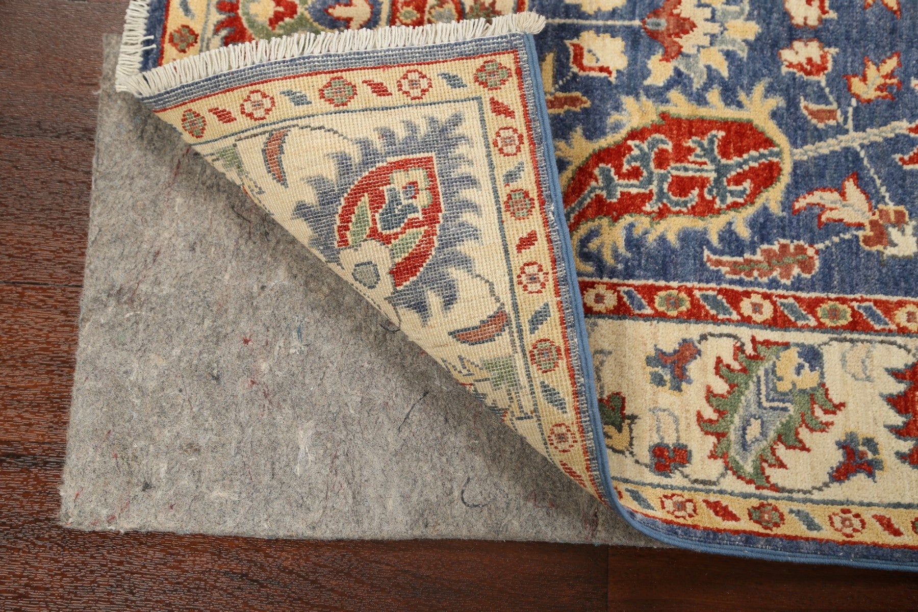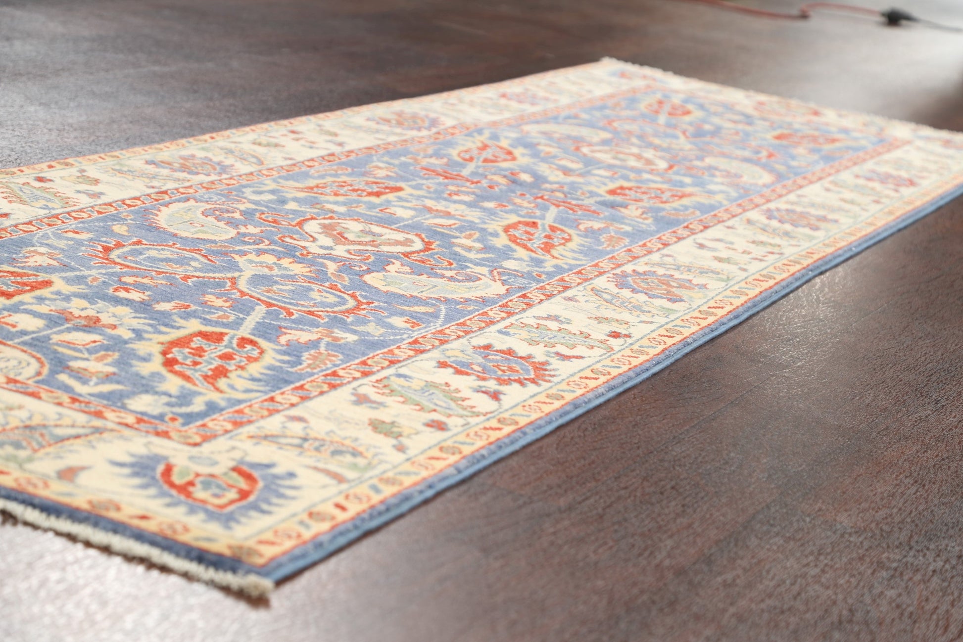 A Beautiful Genuine Pakistan Kazak rug is Hand Knotted by skillful weavers in Pakistan with 100% Wool Material. This rug is in New, First Quality condition. dimensions are 9' 8'' X 2' 9'' in foot and 295 X 84 in centimeter. the primary color is Navy Blue & Blues.