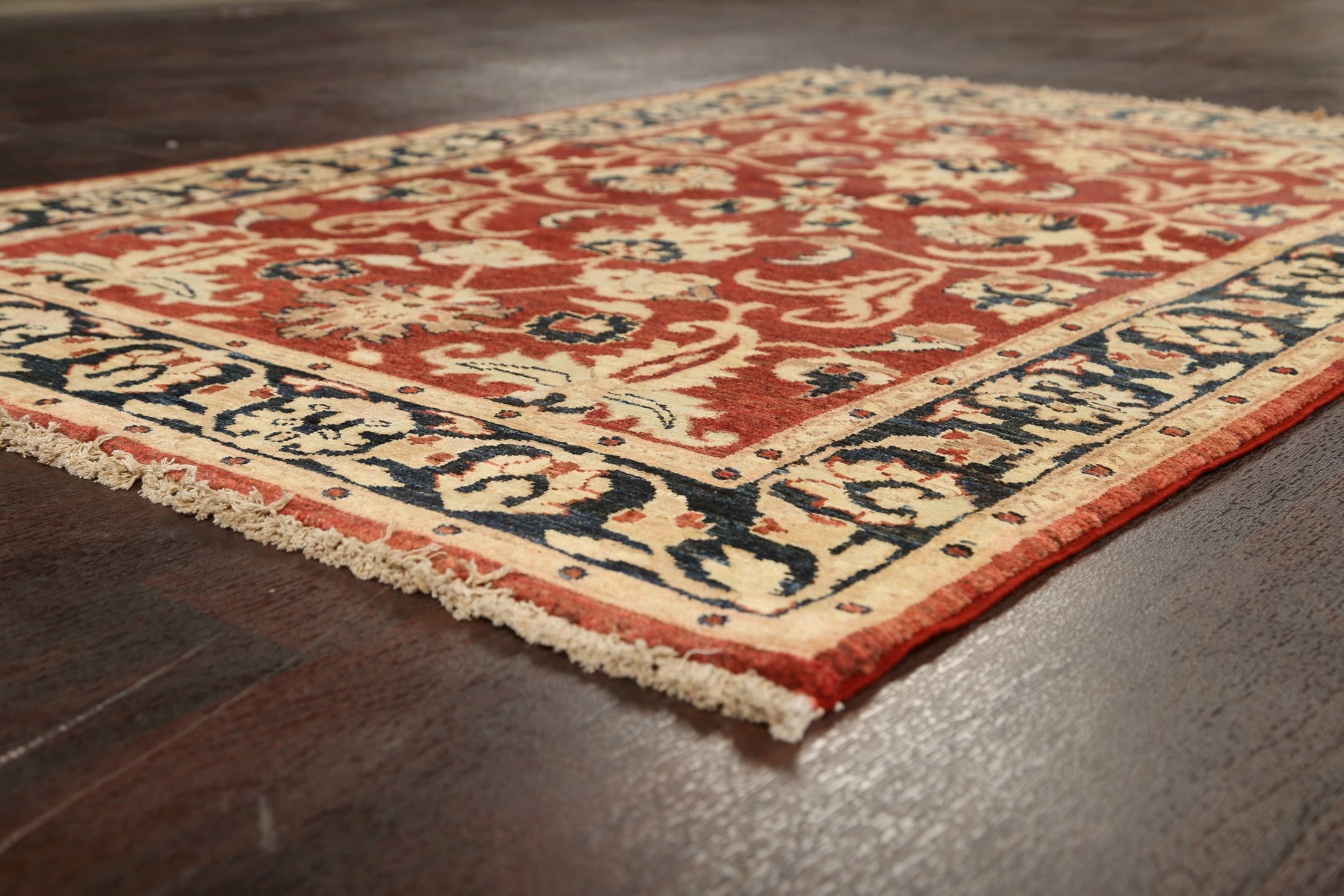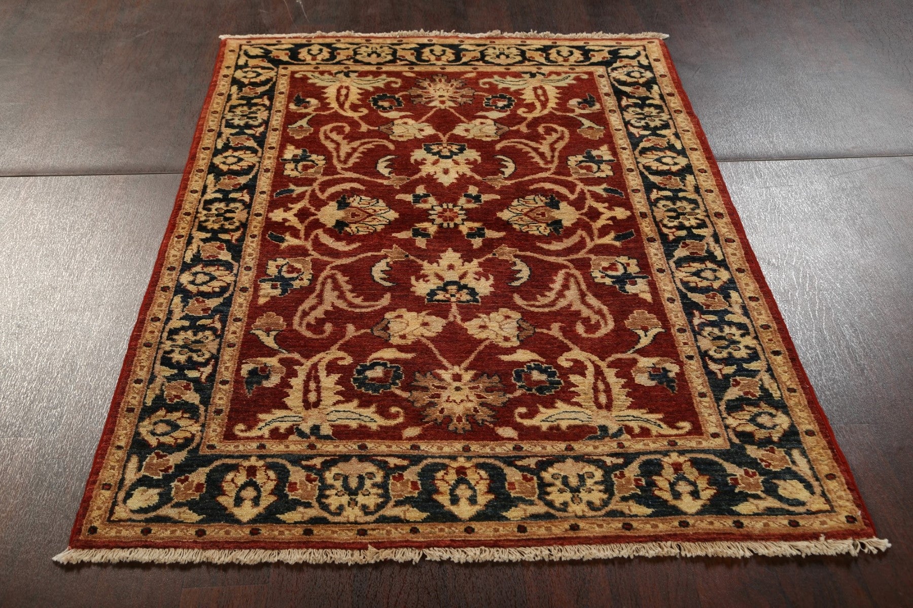 A Beautiful Genuine Pakistan Peshawar-Chobi rug is Hand Knotted by skillful weavers in Pakistan with 100% Wool Material. This rug is in New, First Quality condition. dimensions are 5' 10'' X 4' 0'' in foot and 178 X 122 in centimeter. the primary color is Red.