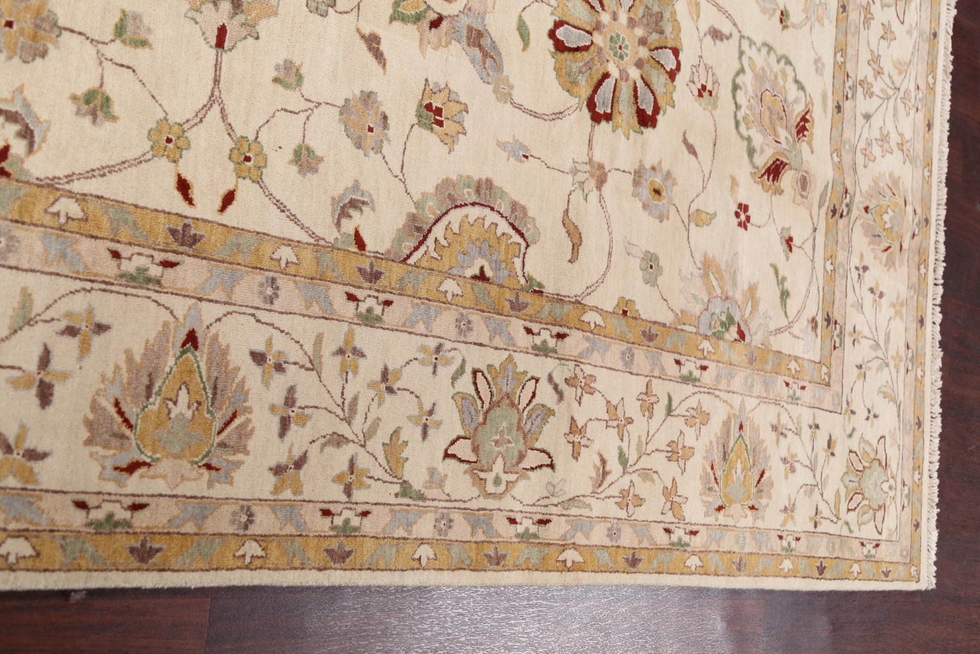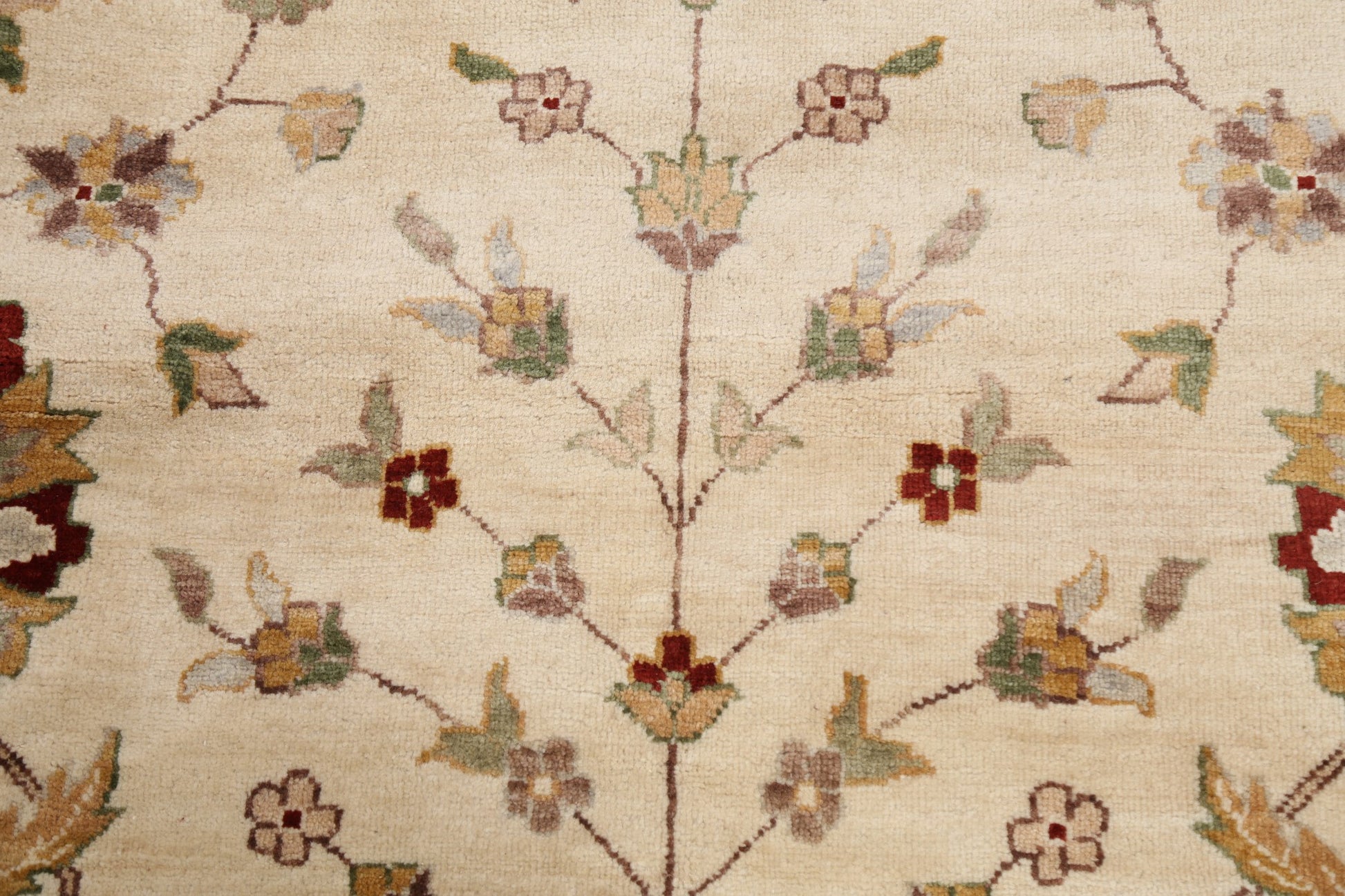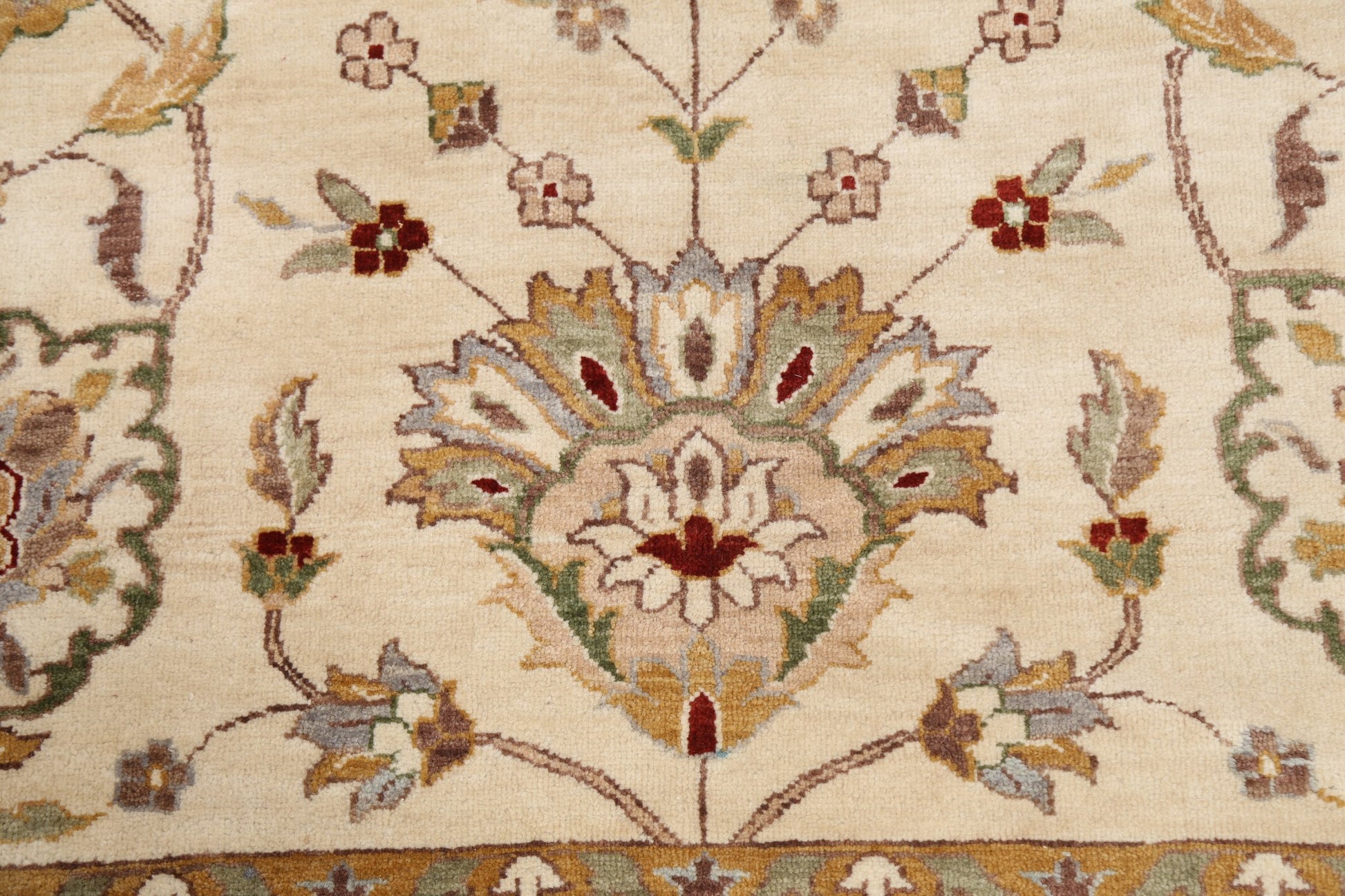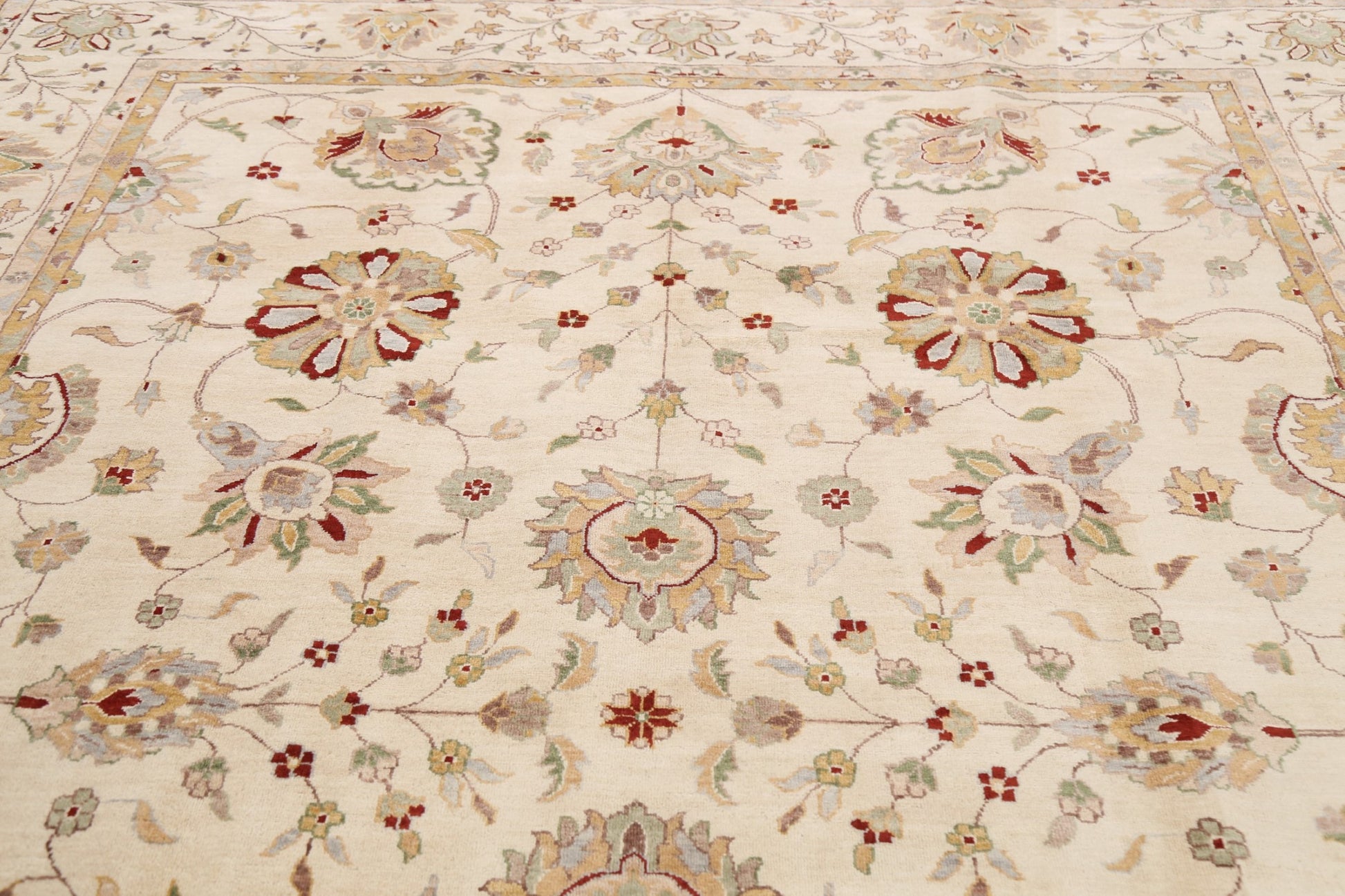 A Beautiful Genuine Pakistan Peshawar rug is Hand Knotted by skillful weavers in Pakistan with 100% Wool Material. This rug is in New, First Quality condition. dimensions are 10' 5'' X 8' 0'' in foot and 318 X 244 in centimeter. the primary color is Beige & Ivories.