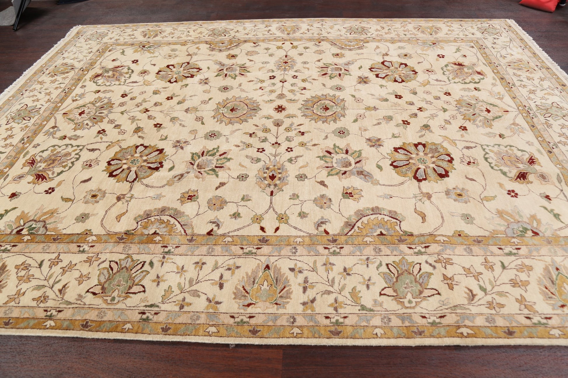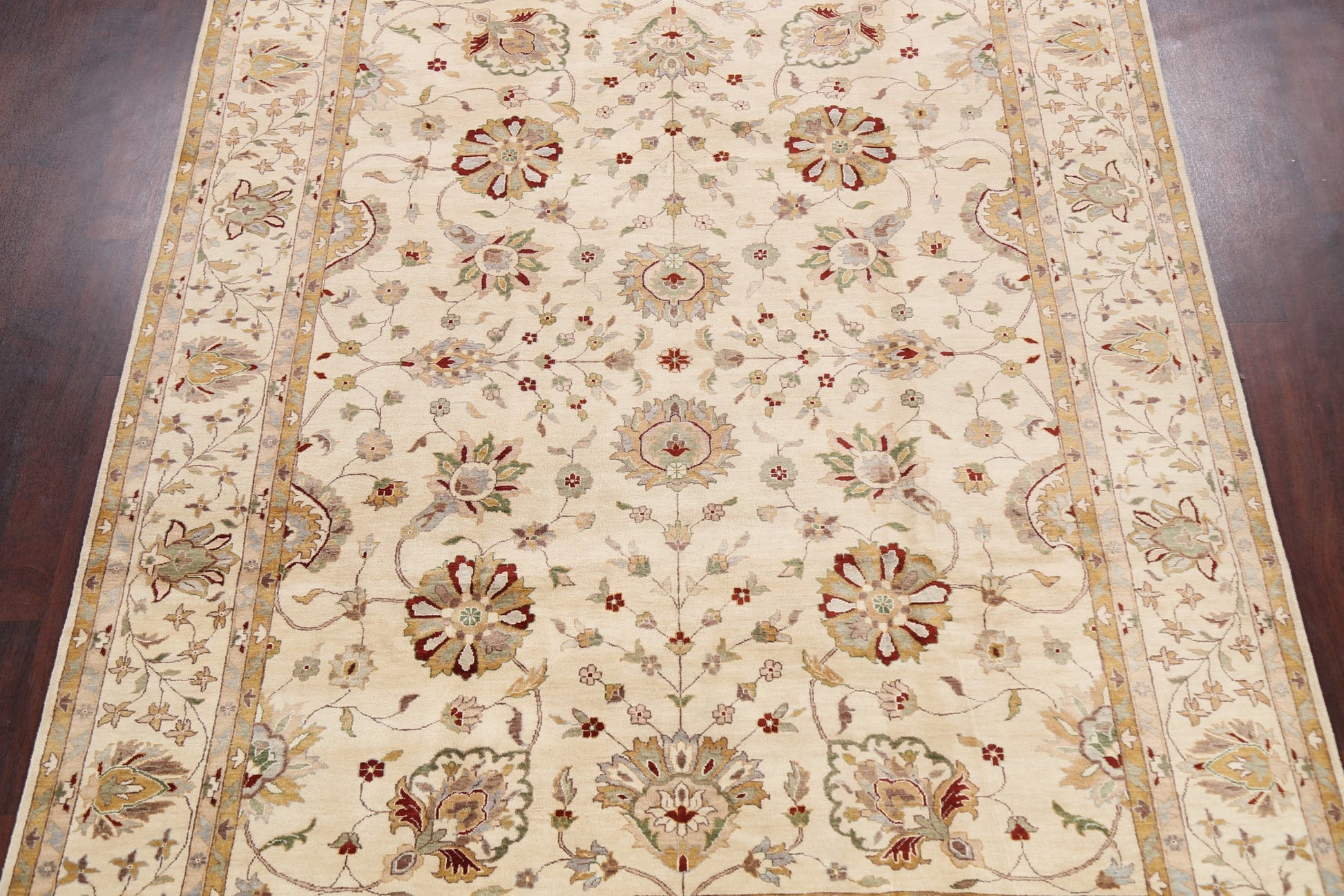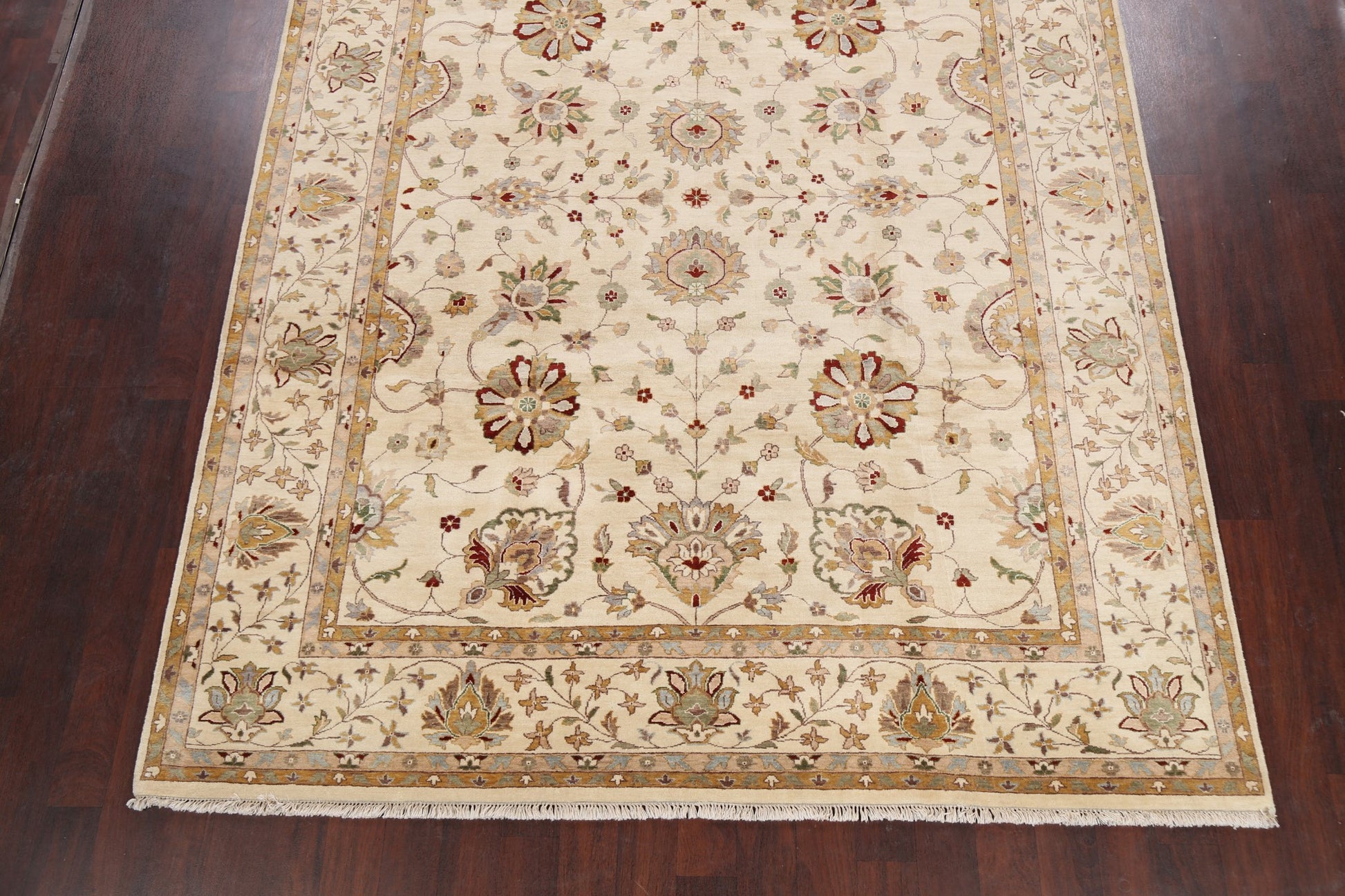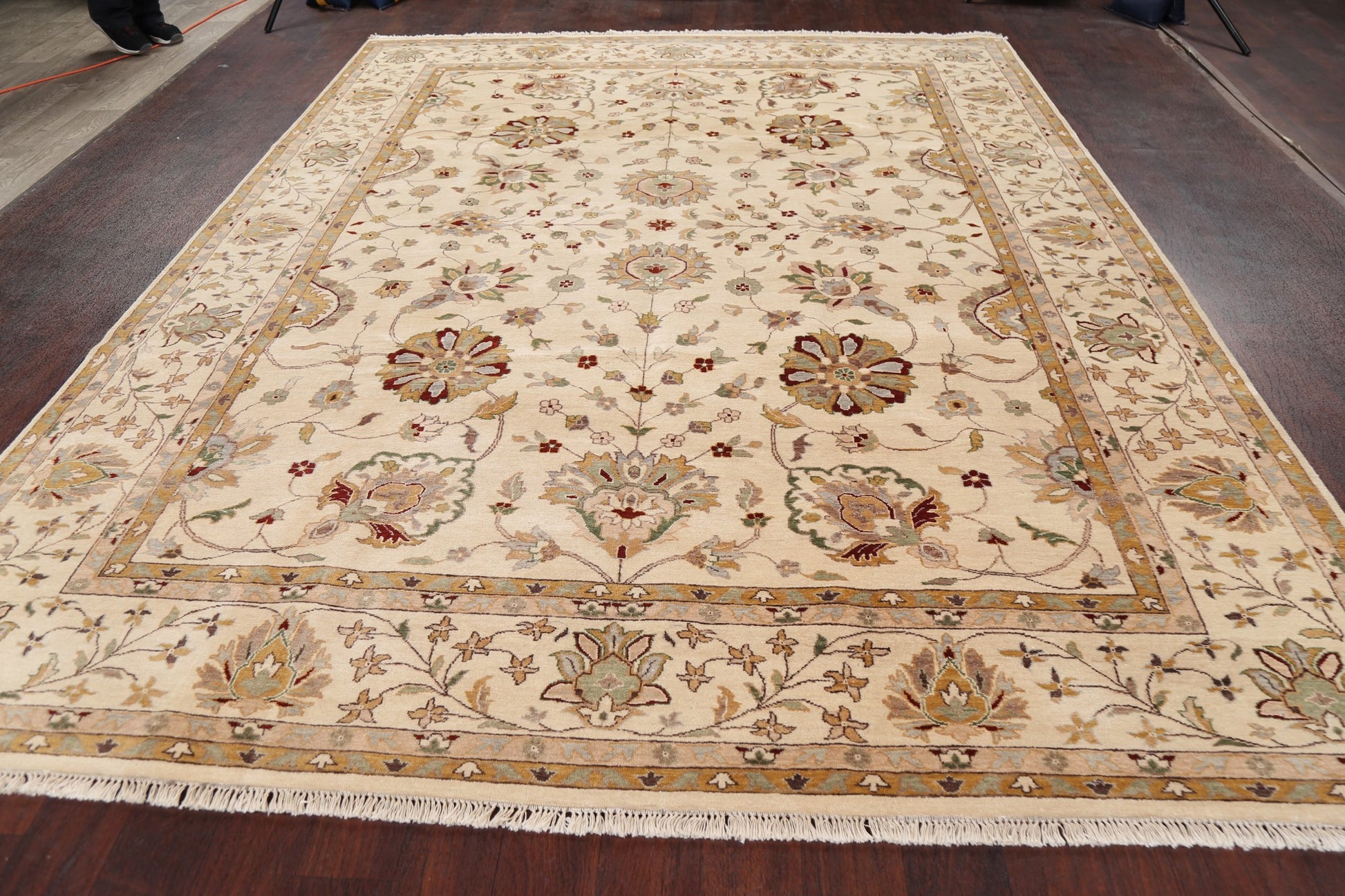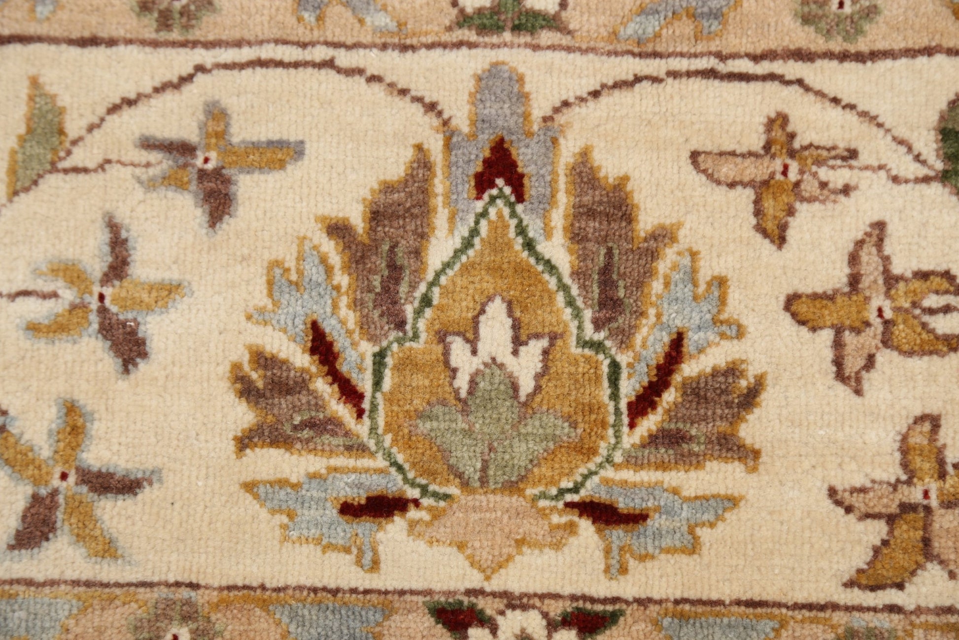 A Beautiful Genuine Pakistan Peshawar rug is Hand Knotted by skillful weavers in Pakistan with 100% Wool Material. This rug is in New, First Quality condition. dimensions are 10' 5'' X 8' 0'' in foot and 318 X 244 in centimeter. the primary color is Beige & Ivories.