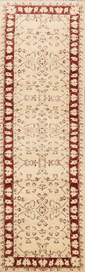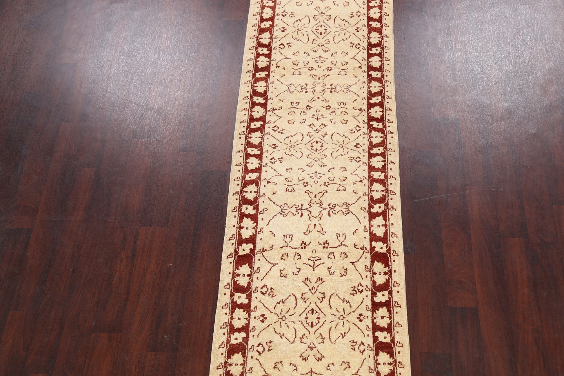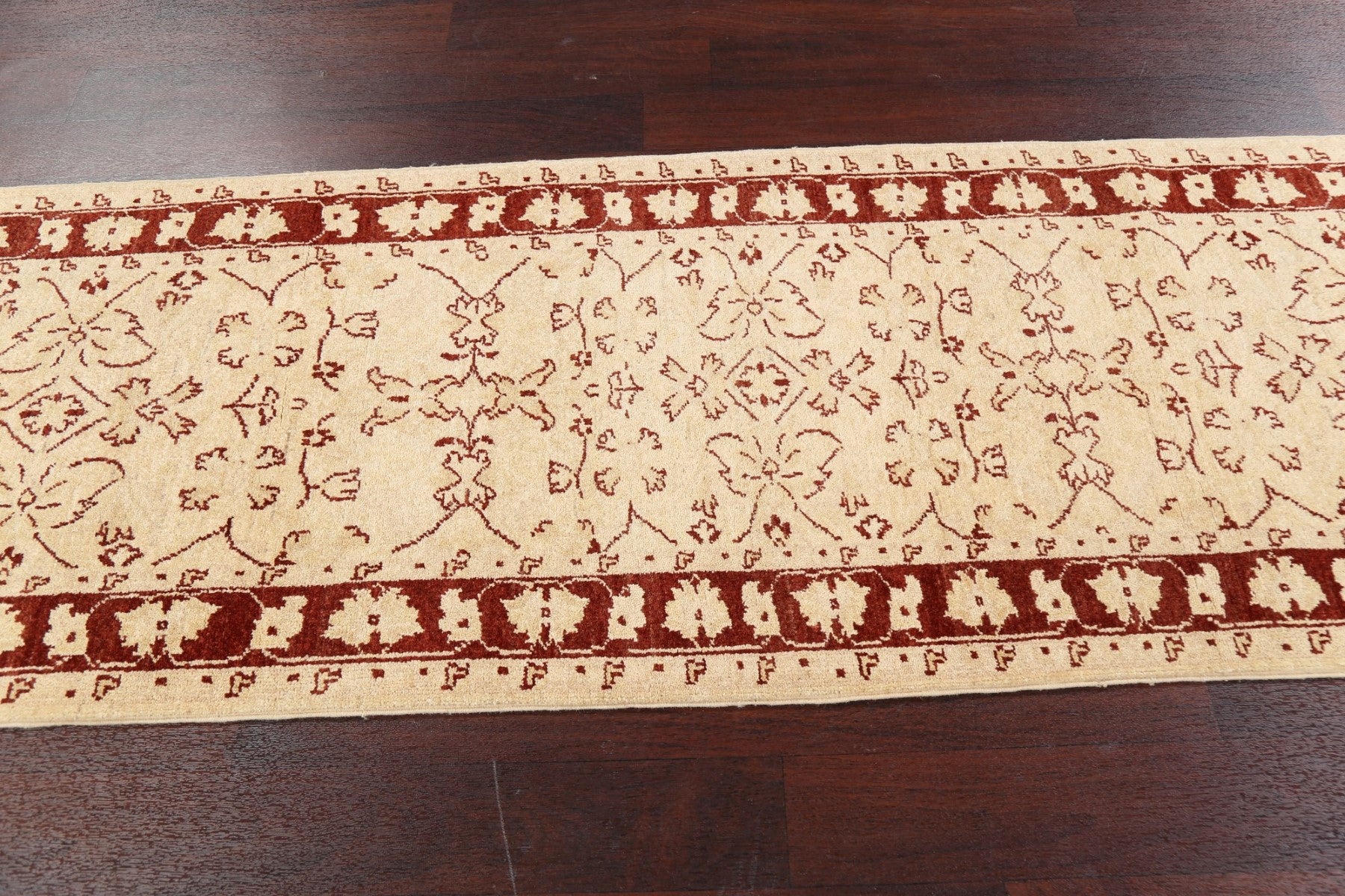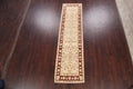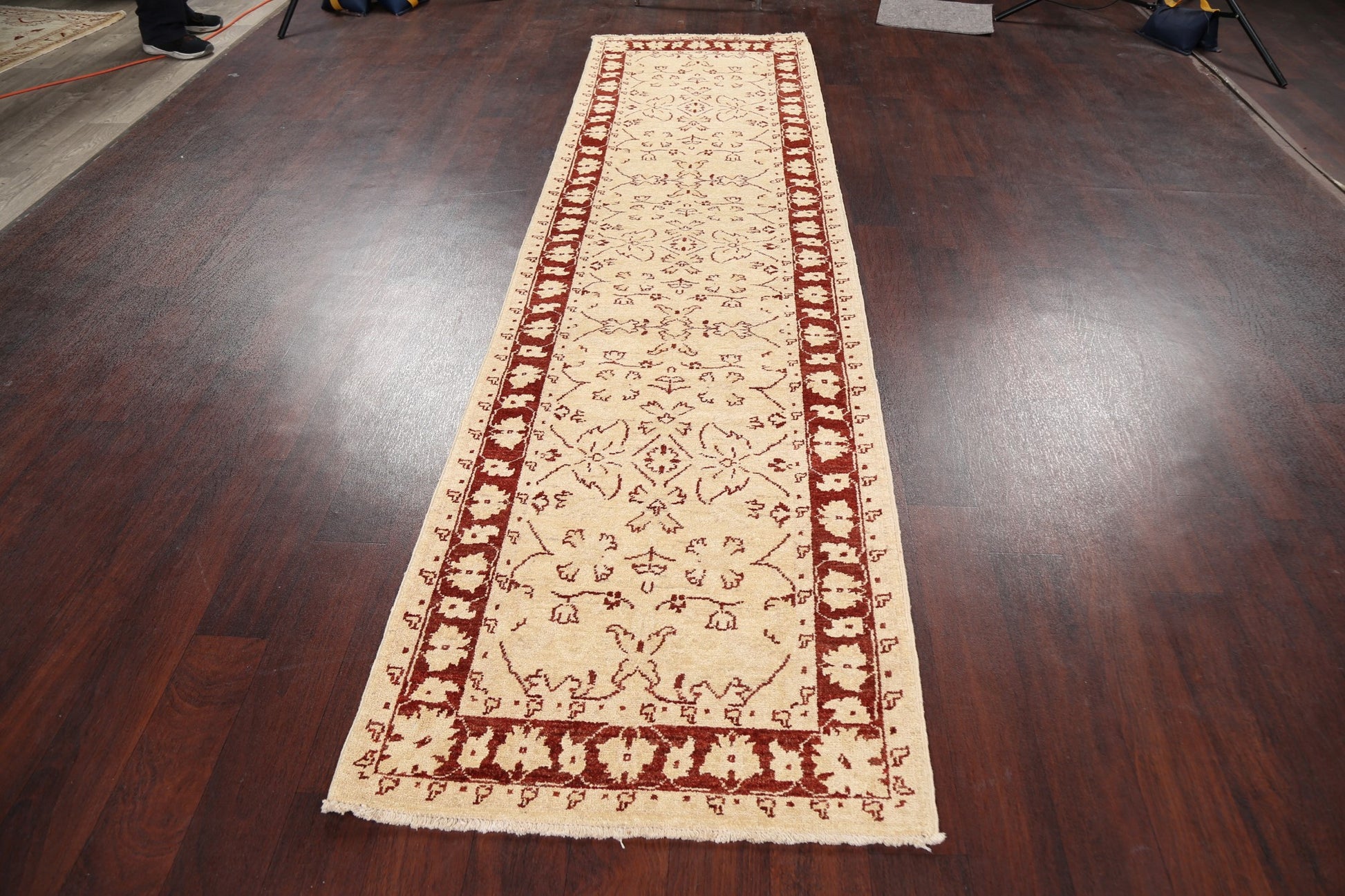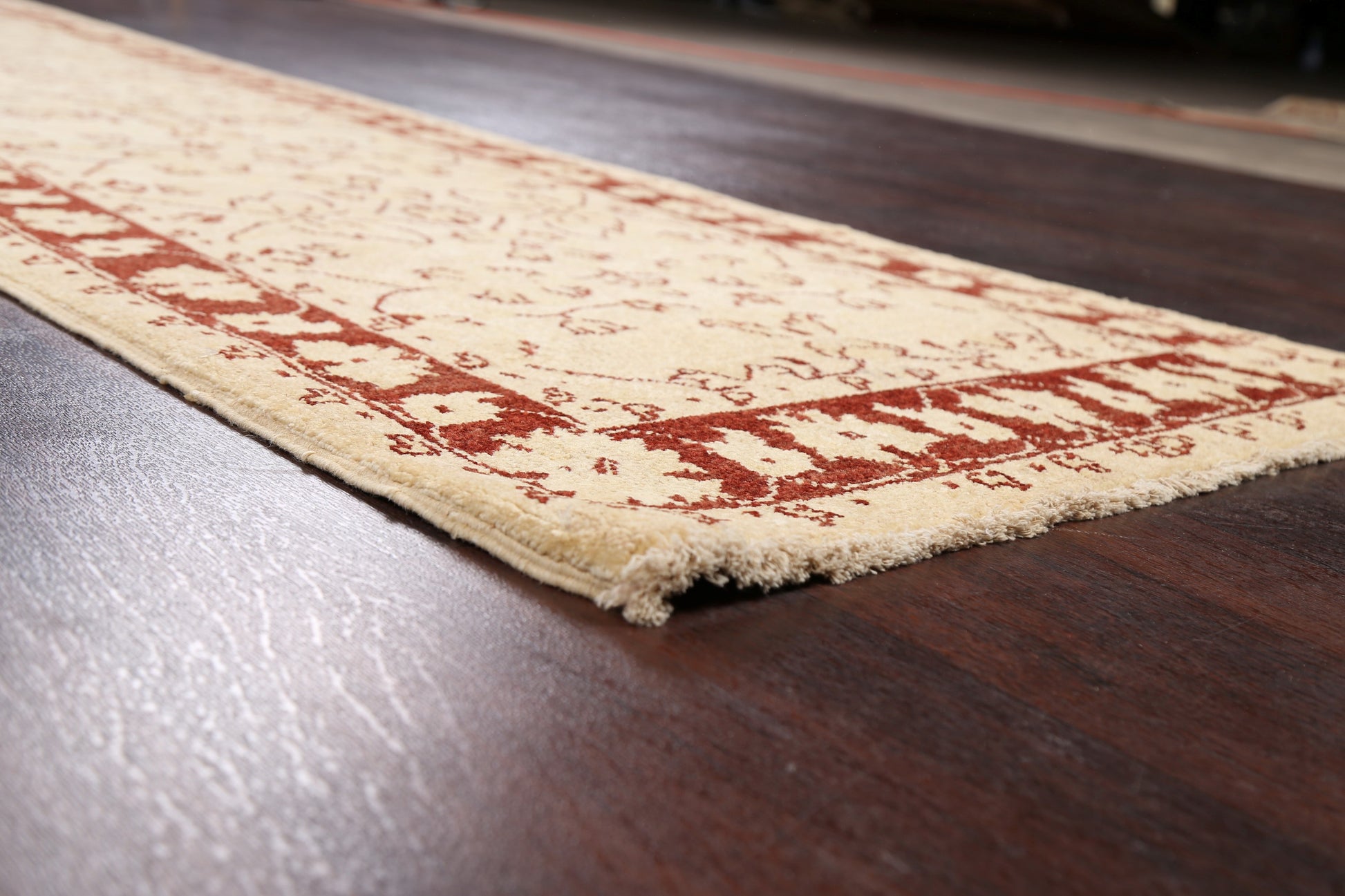 A Beautiful Genuine Pakistan Peshawar rug is Hand Knotted by skillful weavers in Pakistan with 100% Wool Material. This rug is in New, First Quality condition. dimensions are 10' 0'' X 2' 8'' in foot and 305 X 81 in centimeter. the primary color is Beige & Ivories.