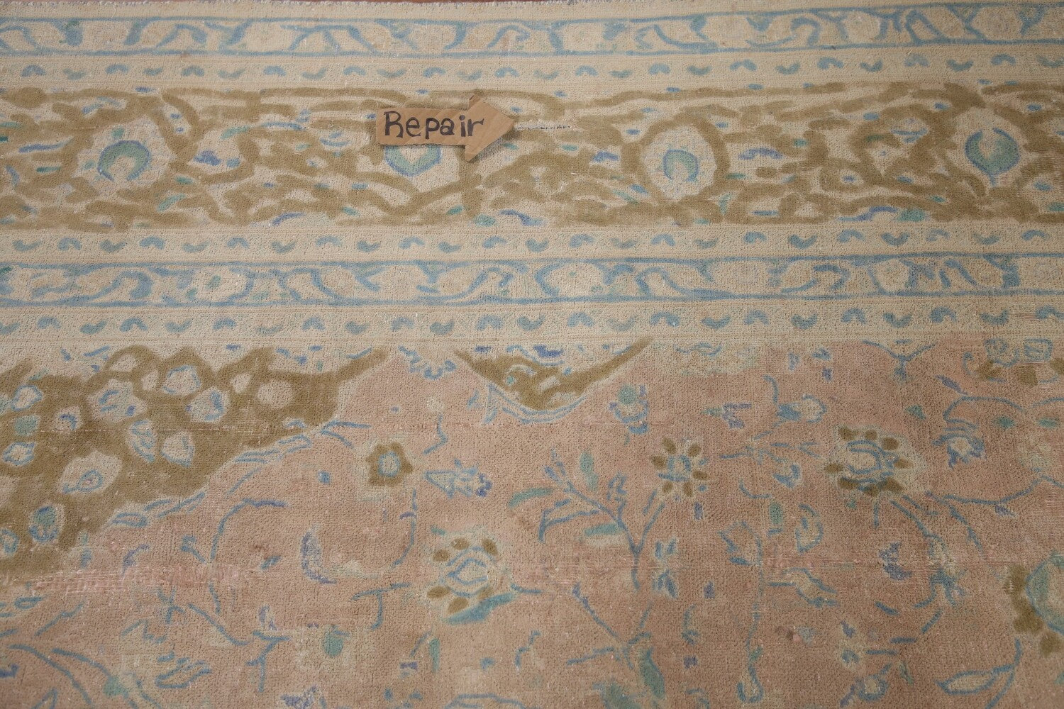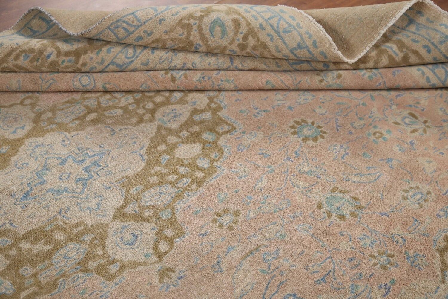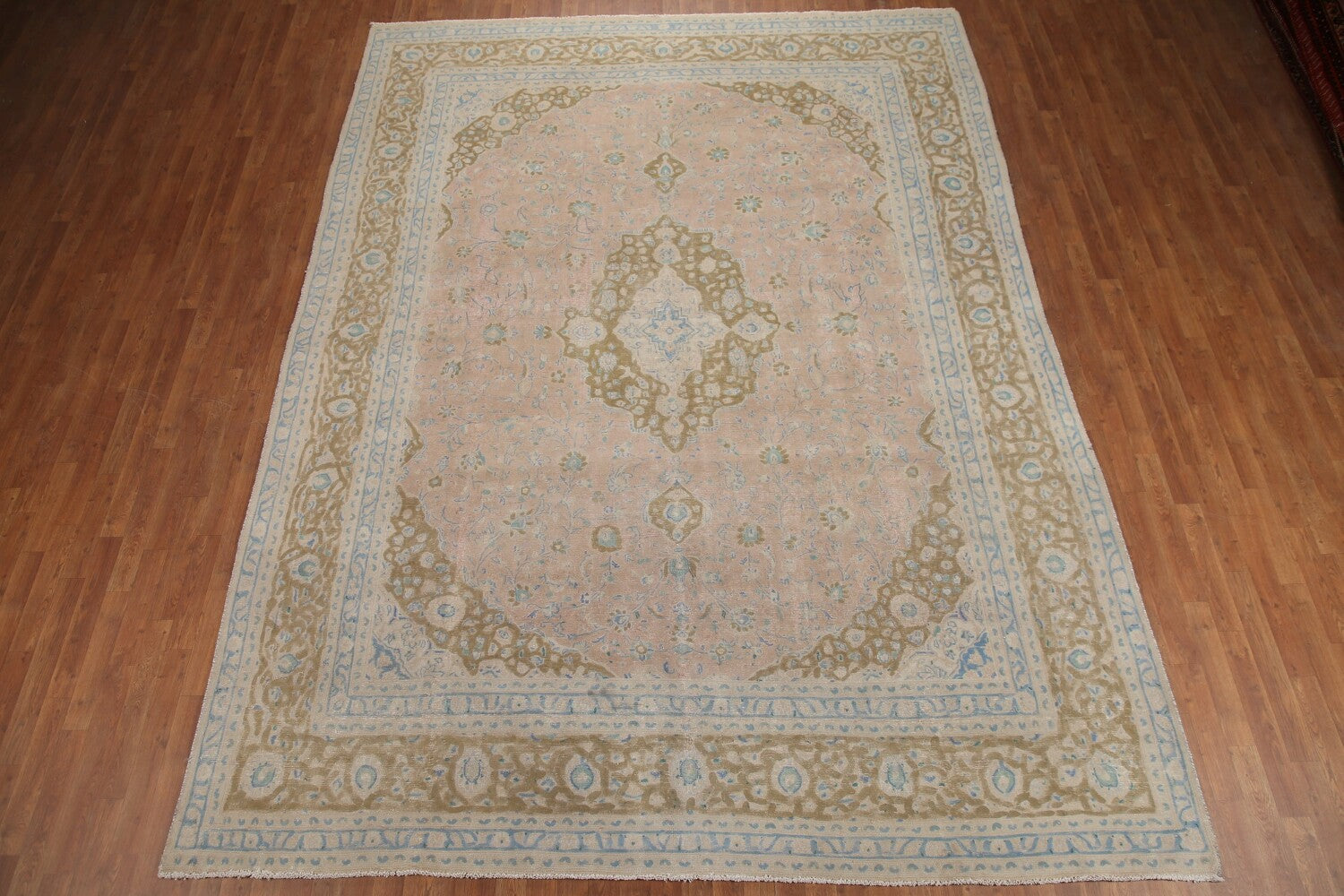 A Beautiful Genuine Persia ( Persia ) Mashad rug is Hand Knotted by skillful weavers in Persia ( Persia ) with 100% Wool Material. This rug is in Very Good (Evenly Low Pile-Repair) condition. dimensions are 12' 9'' X 9' 5'' in foot and 389 X 287 in centimeter. the primary color is Pink.