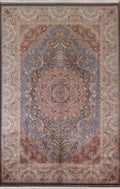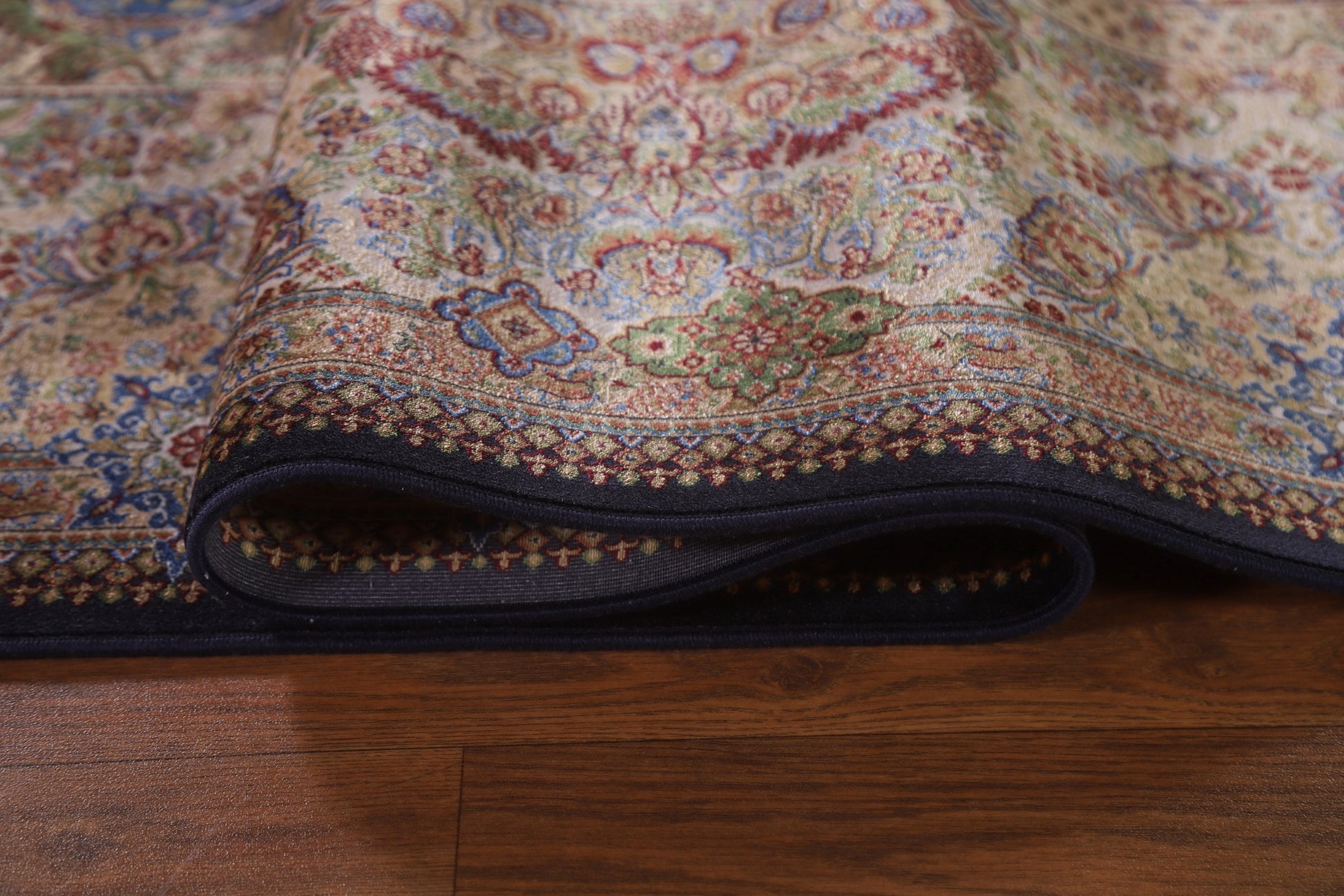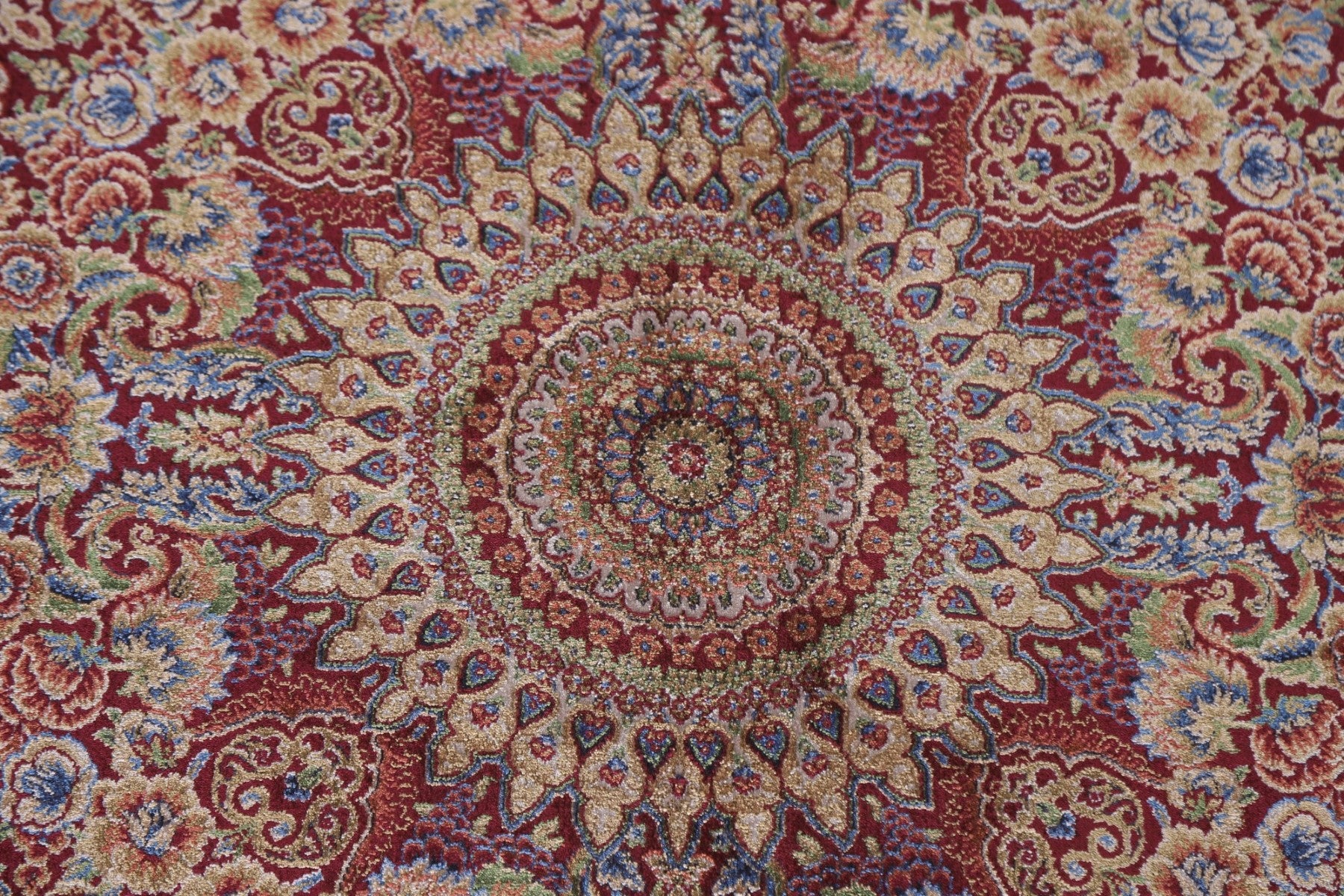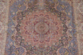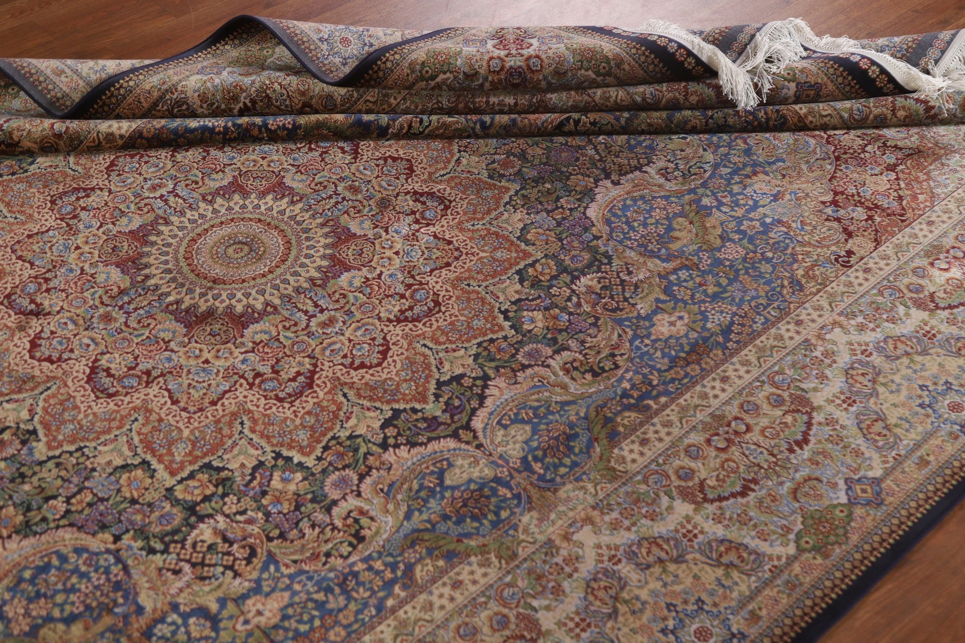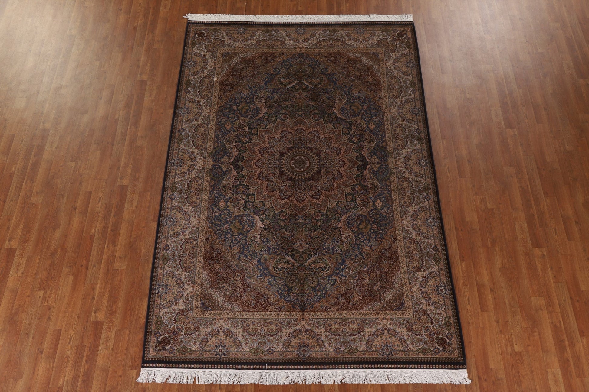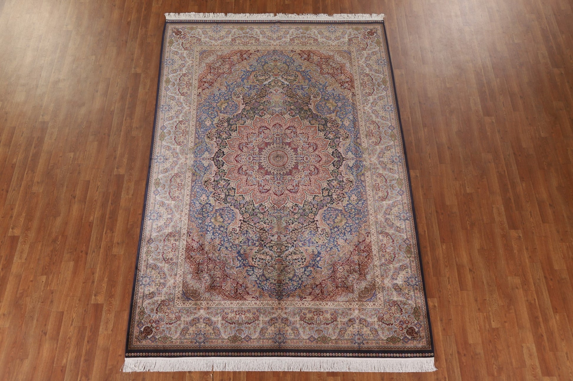 A Beautiful Genuine Turkey Qum rug is Machine Made by skillful weavers in Turkey with 90% Silk - 10% Polyester Material. This rug is in condition. dimensions are 9' 10'' X 6' 6'' in foot and 300 X 198 in centimeter. the primary color is Navy Blue & Blues.