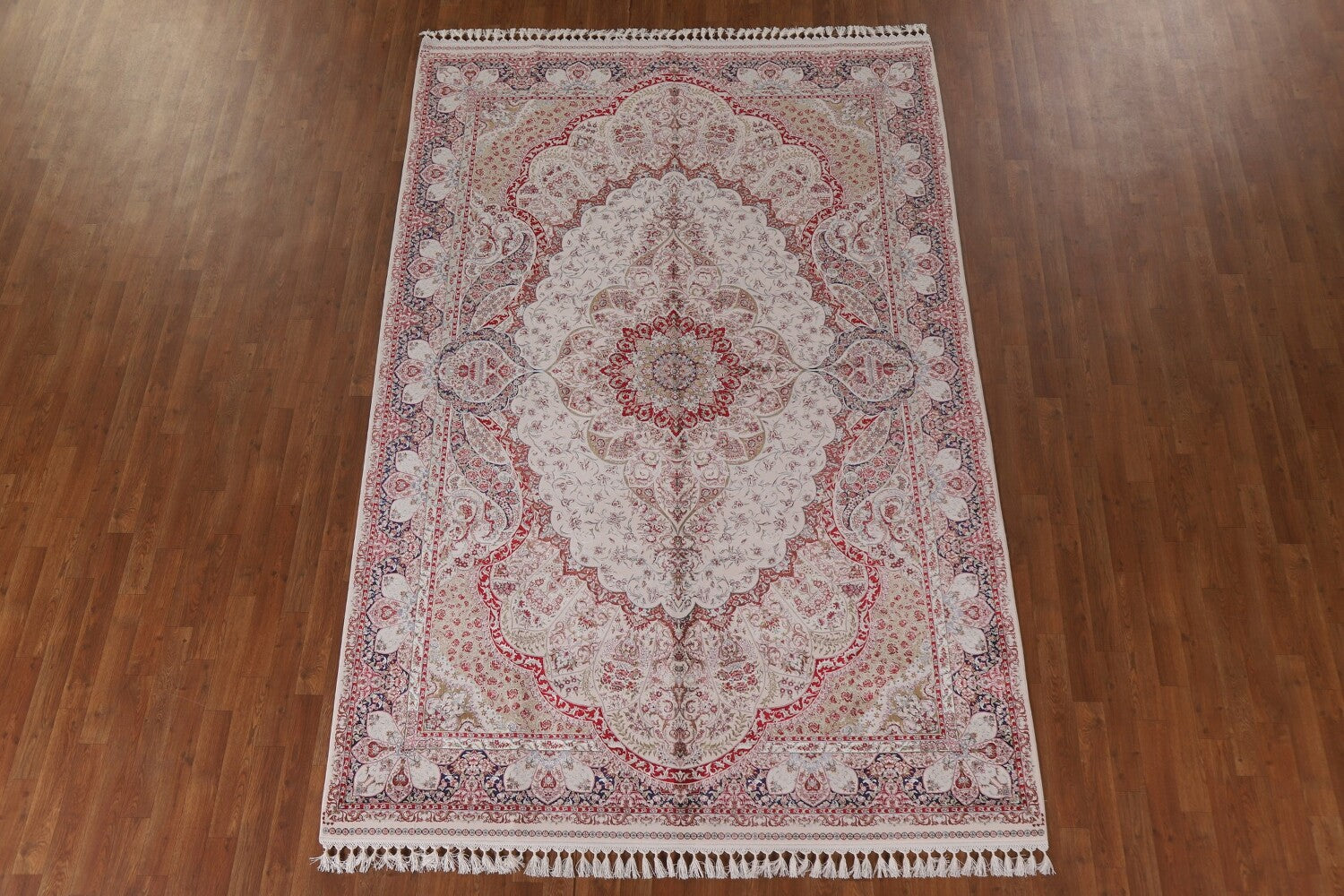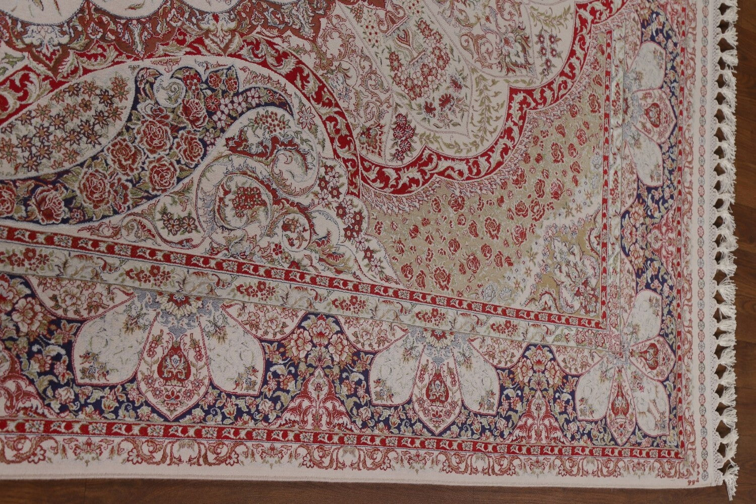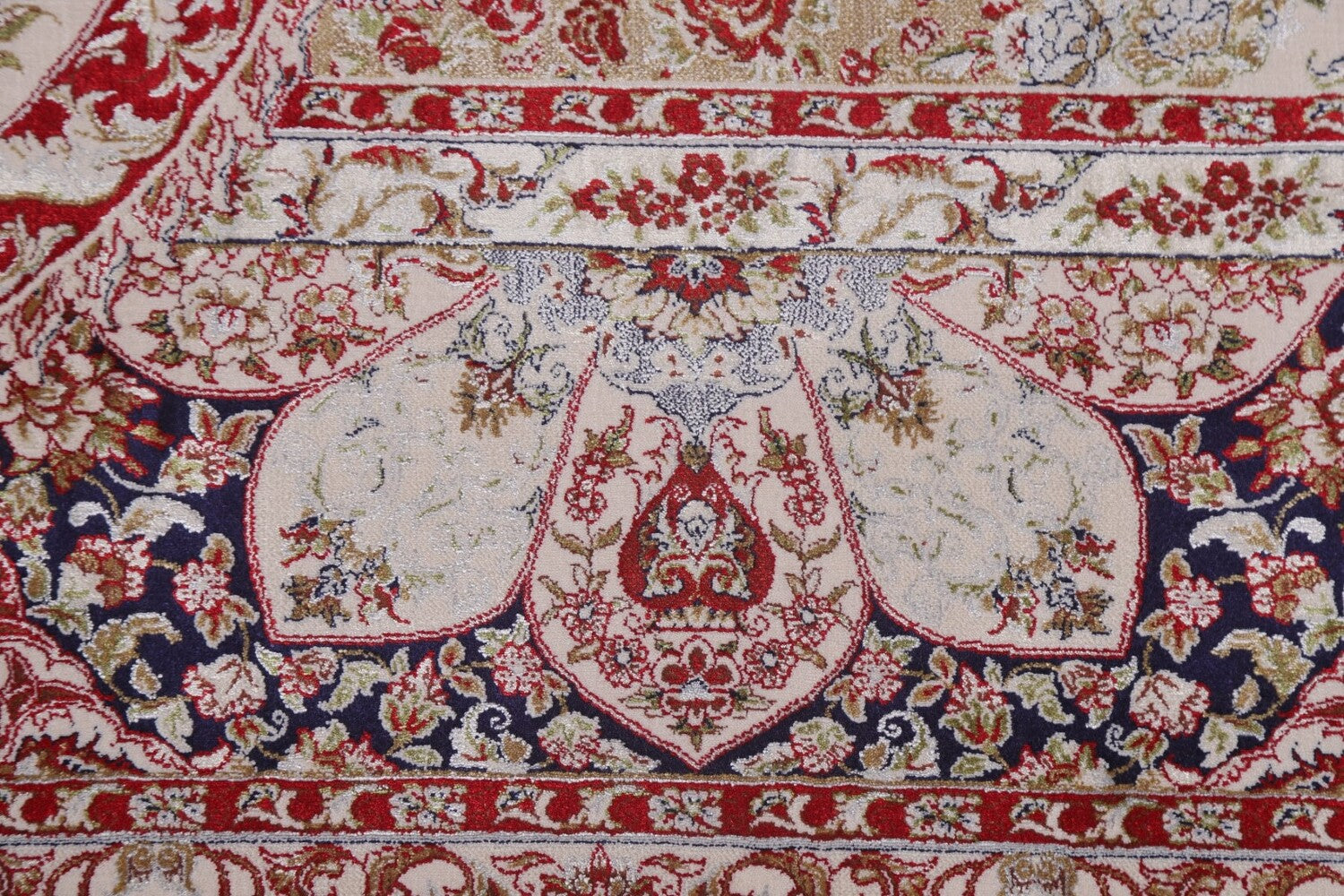 A Beautiful Genuine Turkey Qum rug is Machine Made by skillful weavers in Turkey with 90% Silk - 10% Polyester Material. This rug is in condition. dimensions are 9' 11'' X 6' 6'' in foot and 302 X 198 in centimeter. the primary color is Beige & Ivories.