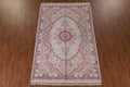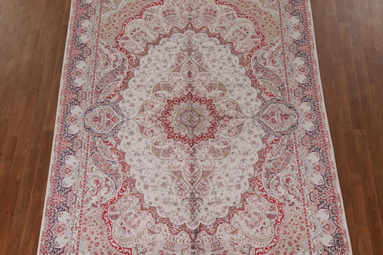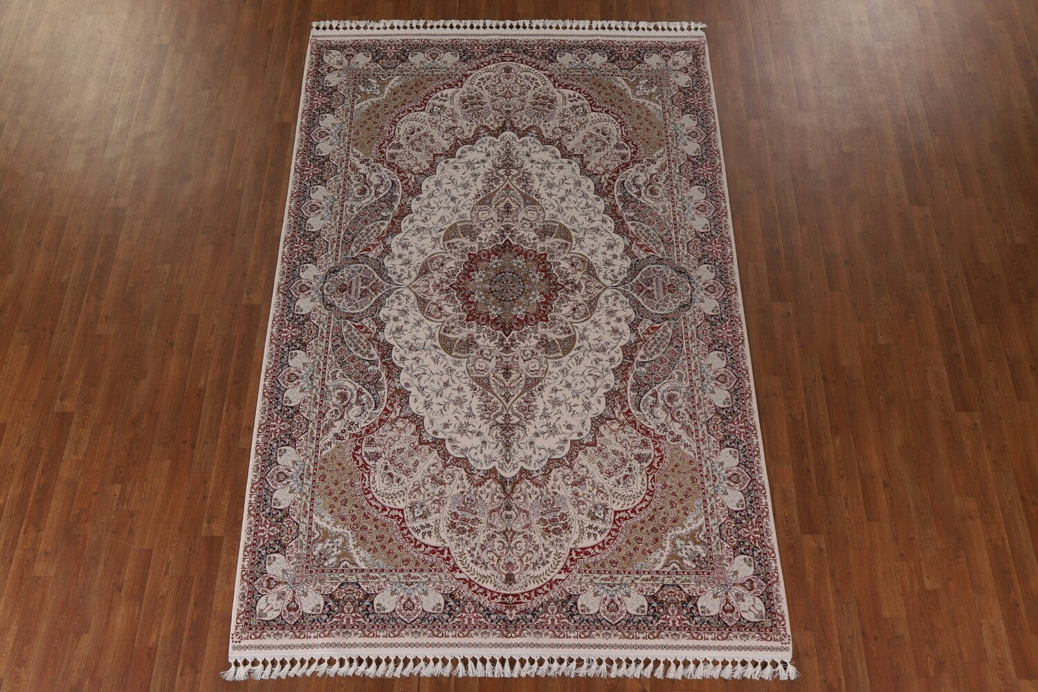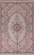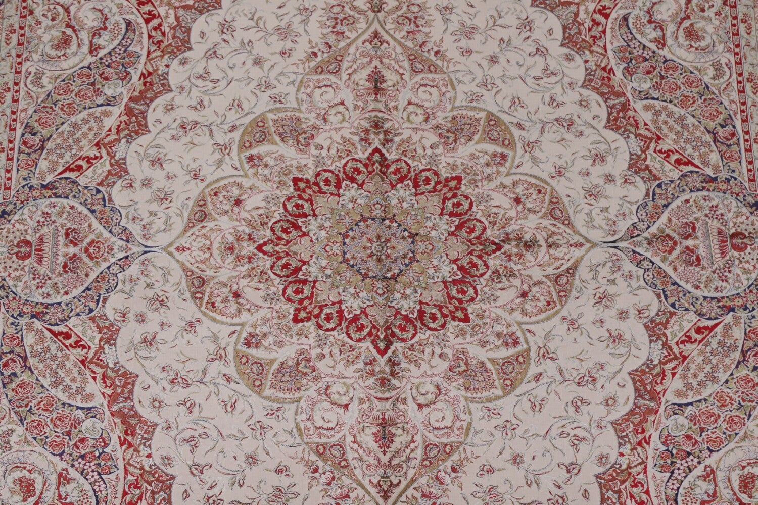 A Beautiful Genuine Turkey Qum rug is Machine Made by skillful weavers in Turkey with 90% Silk - 10% Polyester Material. This rug is in condition. dimensions are 9' 11'' X 6' 6'' in foot and 302 X 198 in centimeter. the primary color is Beige & Ivories.
