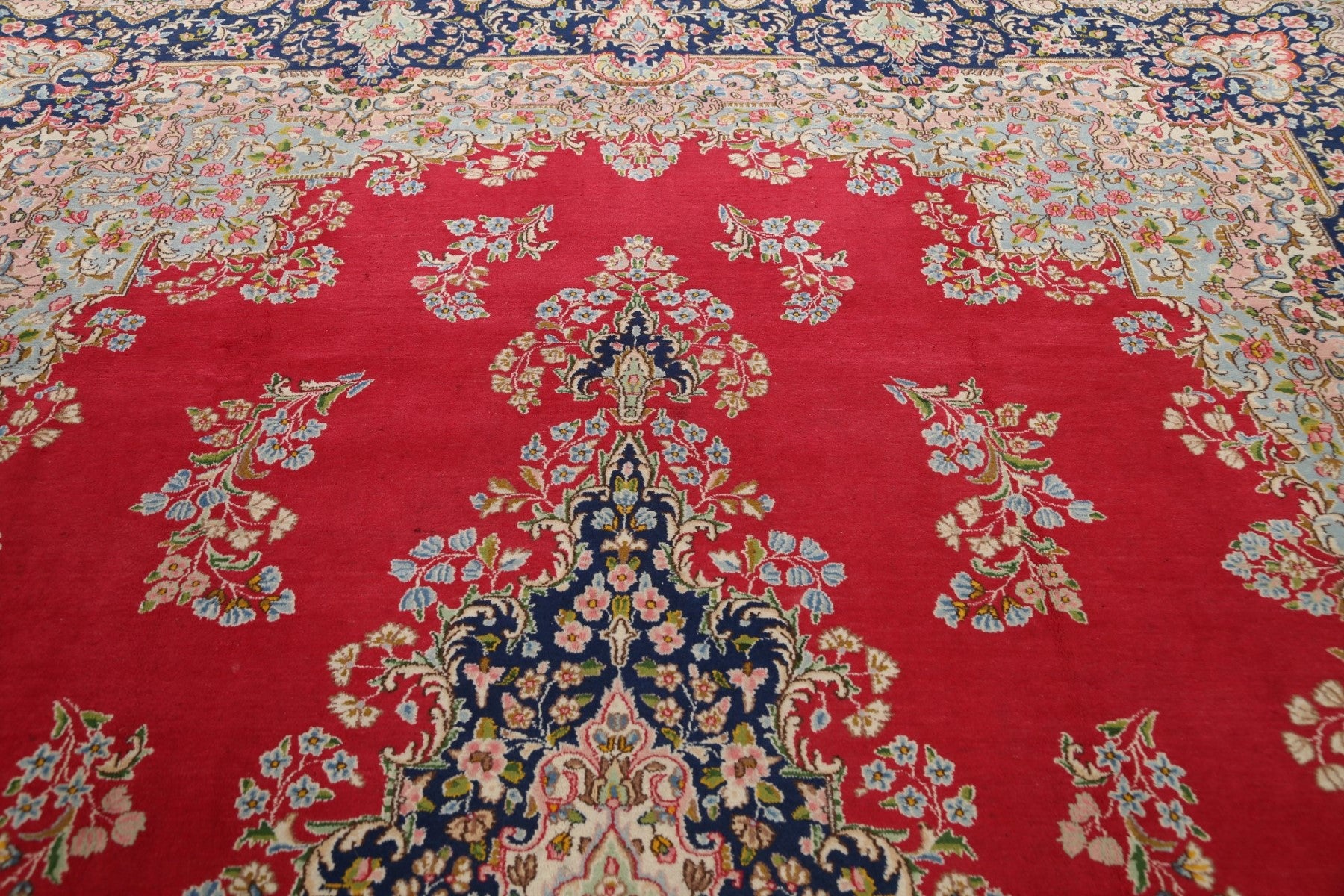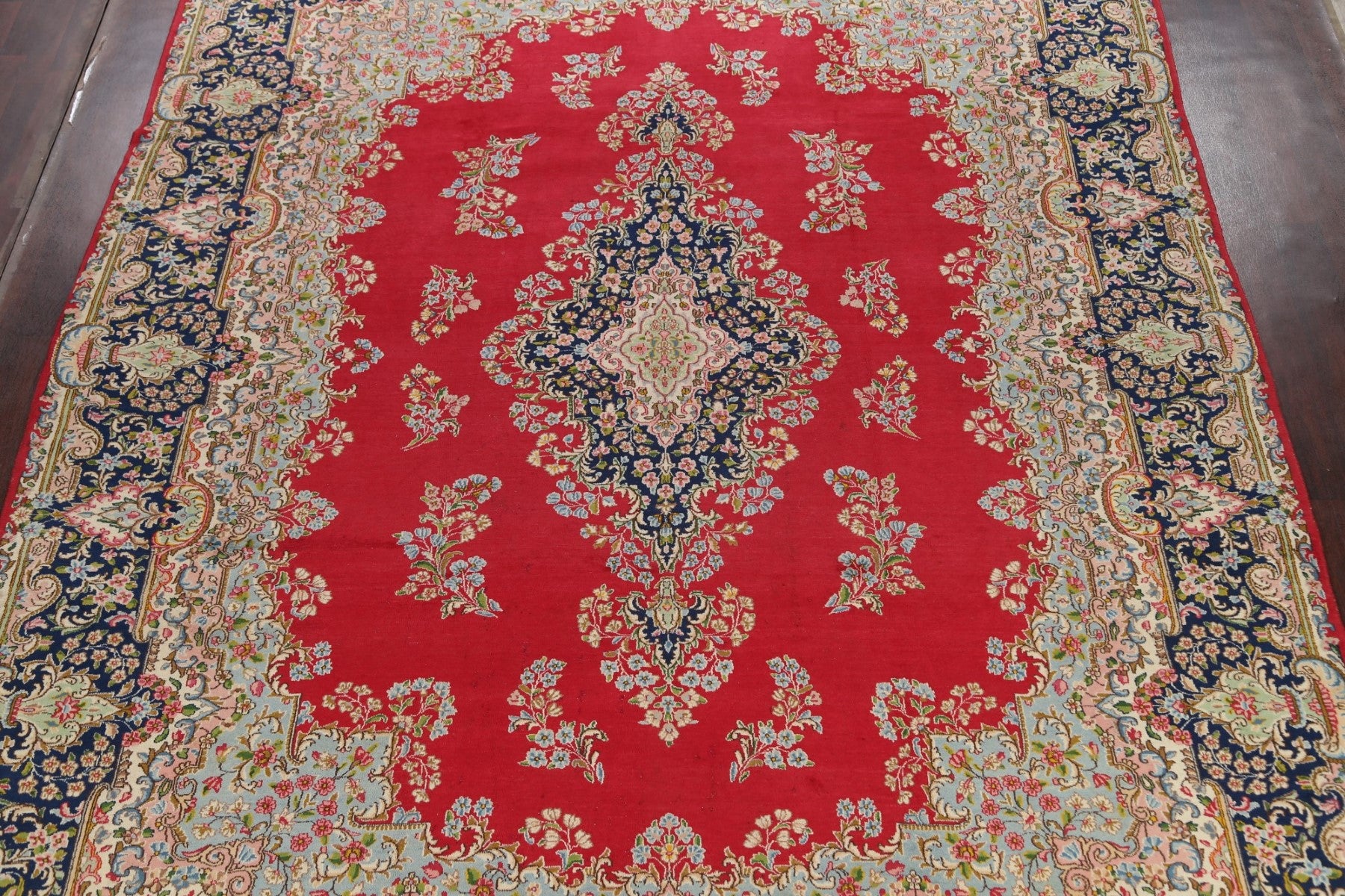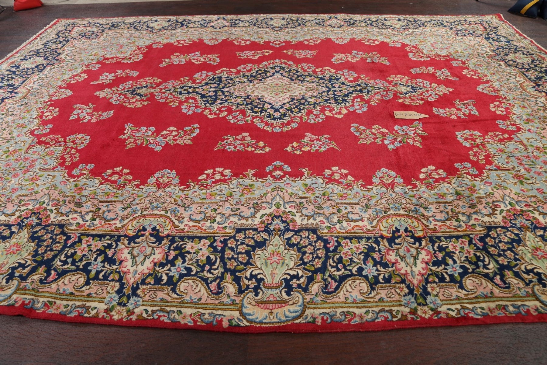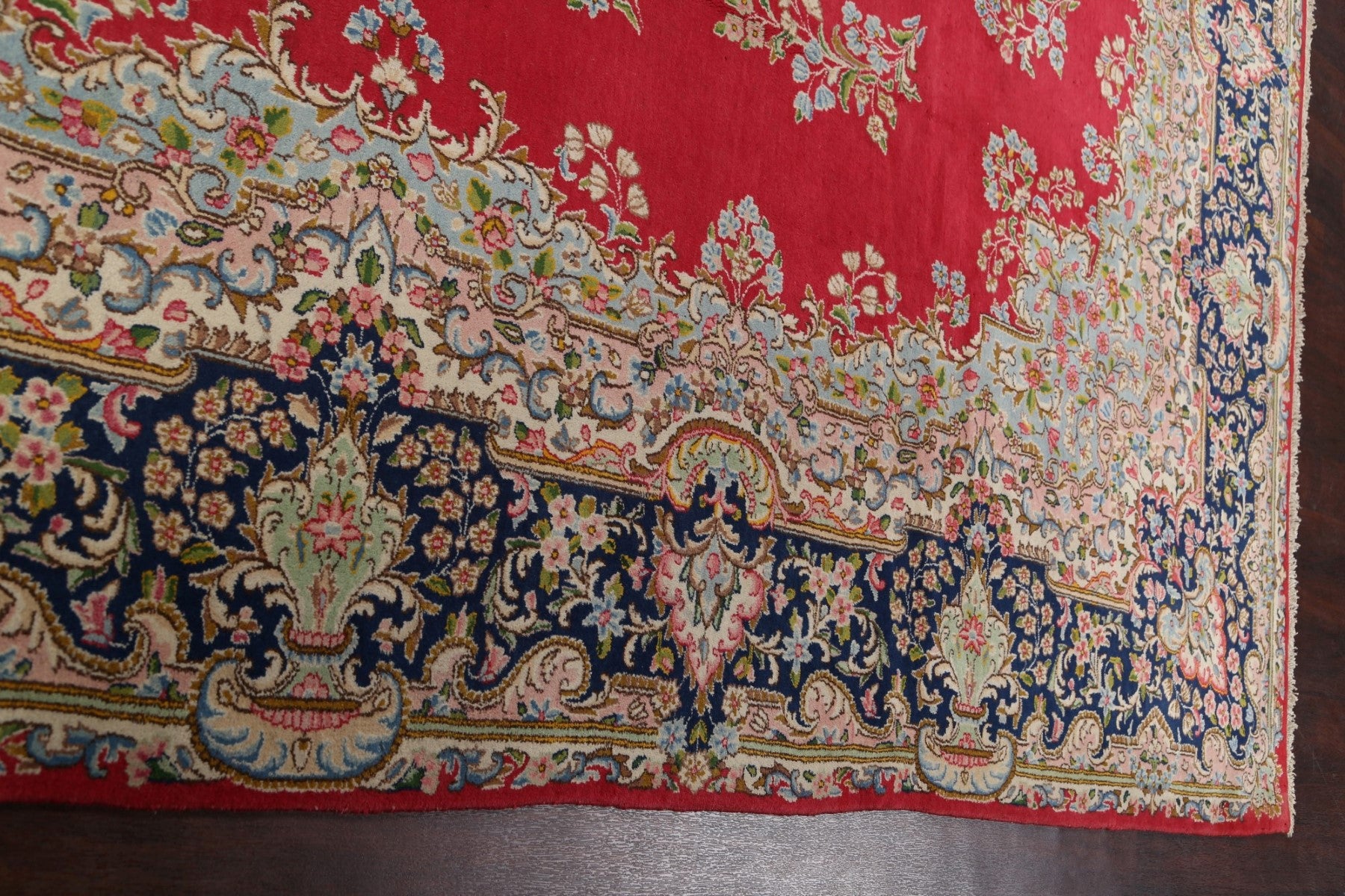 A Beautiful Genuine Persia ( Persia ) Kerman rug is Hand Knotted by skillful weavers in Persia ( Persia ) with 100% Wool Material. This rug is in Very Good (Low Pile Spots) condition. dimensions are 13' 4'' X 9' 11'' in foot and 406 X 302 in centimeter. the primary color is Red.