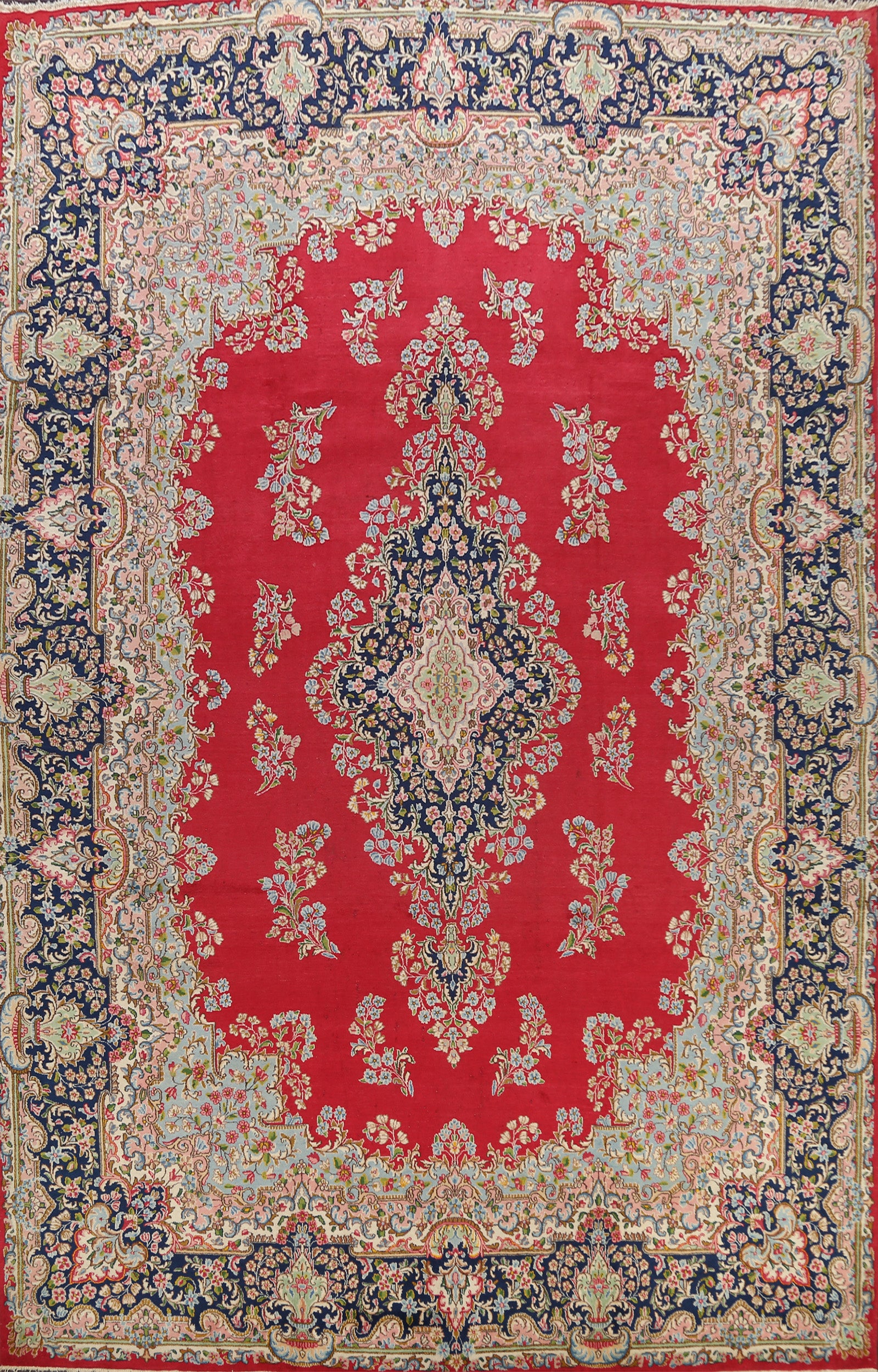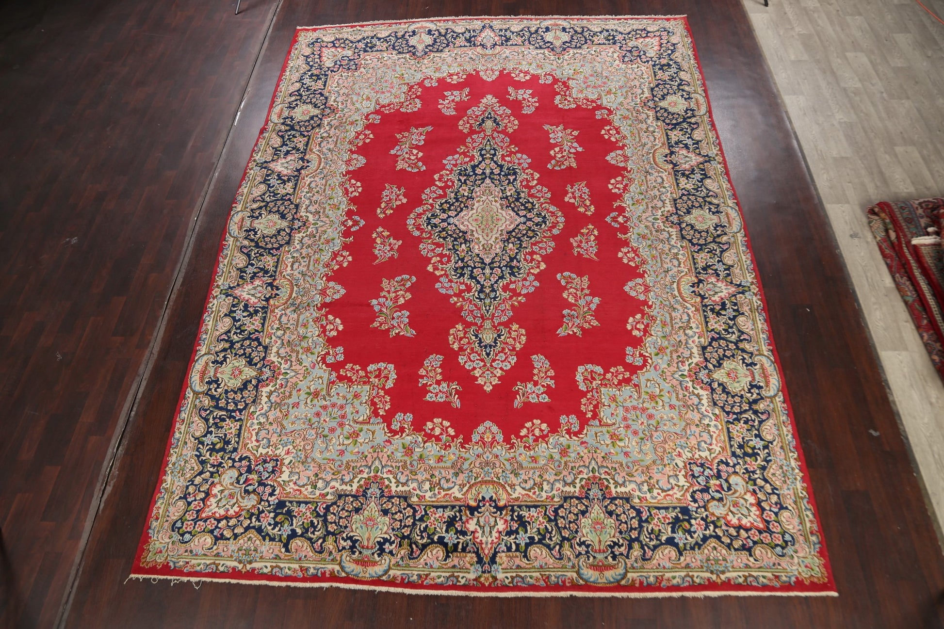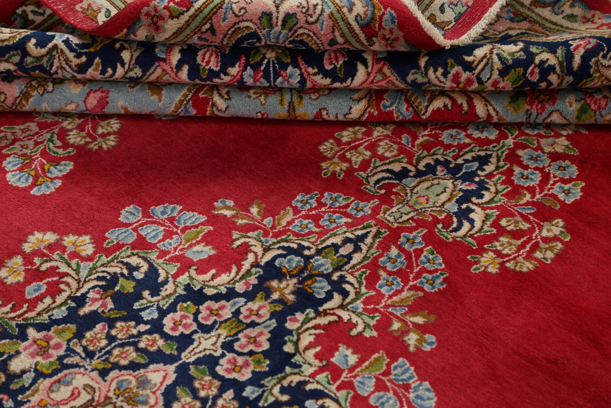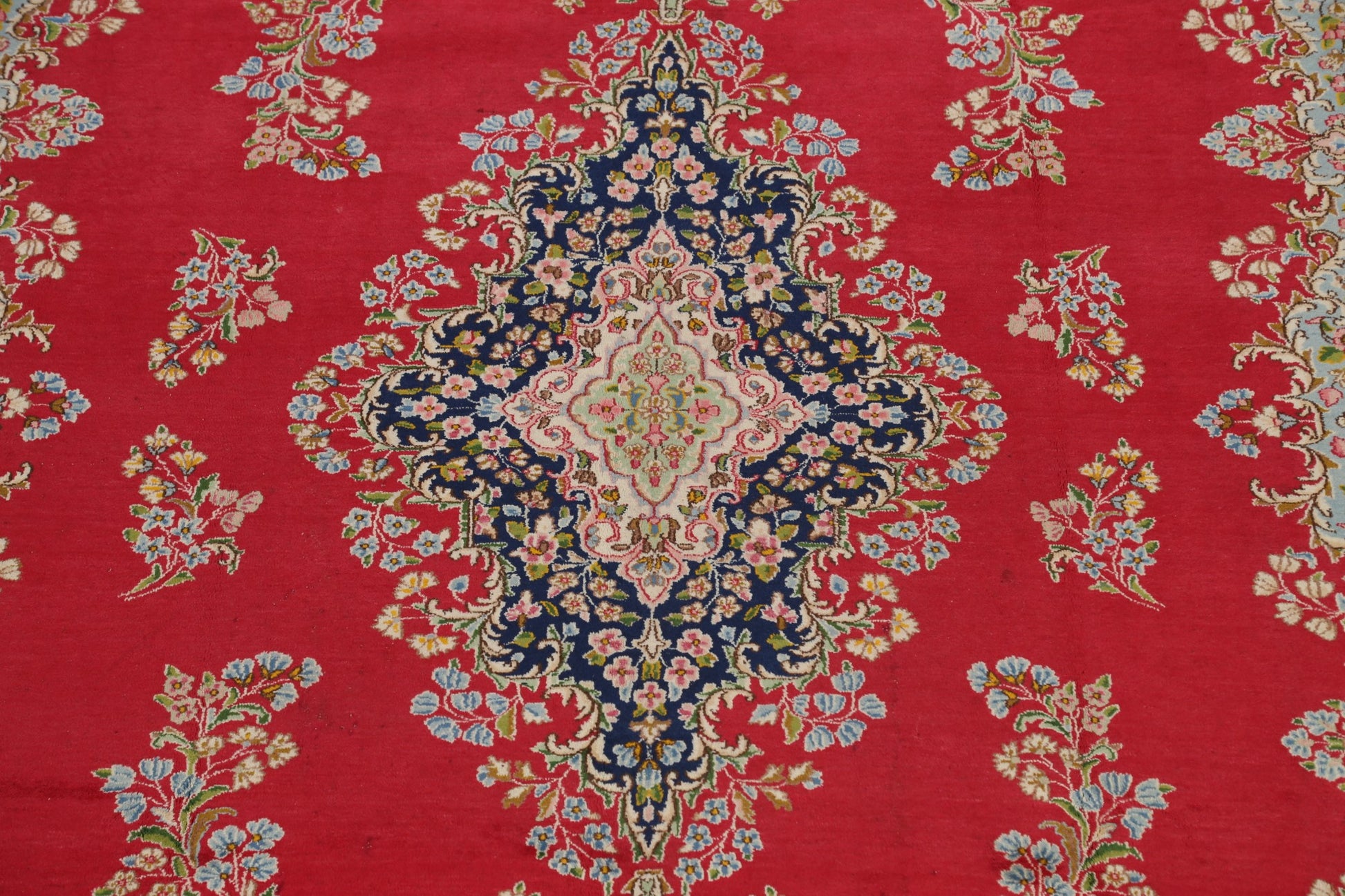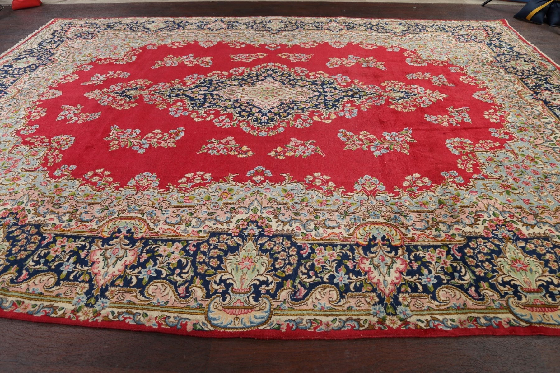 A Beautiful Genuine Persia ( Persia ) Kerman rug is Hand Knotted by skillful weavers in Persia ( Persia ) with 100% Wool Material. This rug is in Very Good (Low Pile Spots) condition. dimensions are 13' 4'' X 9' 11'' in foot and 406 X 302 in centimeter. the primary color is Red.