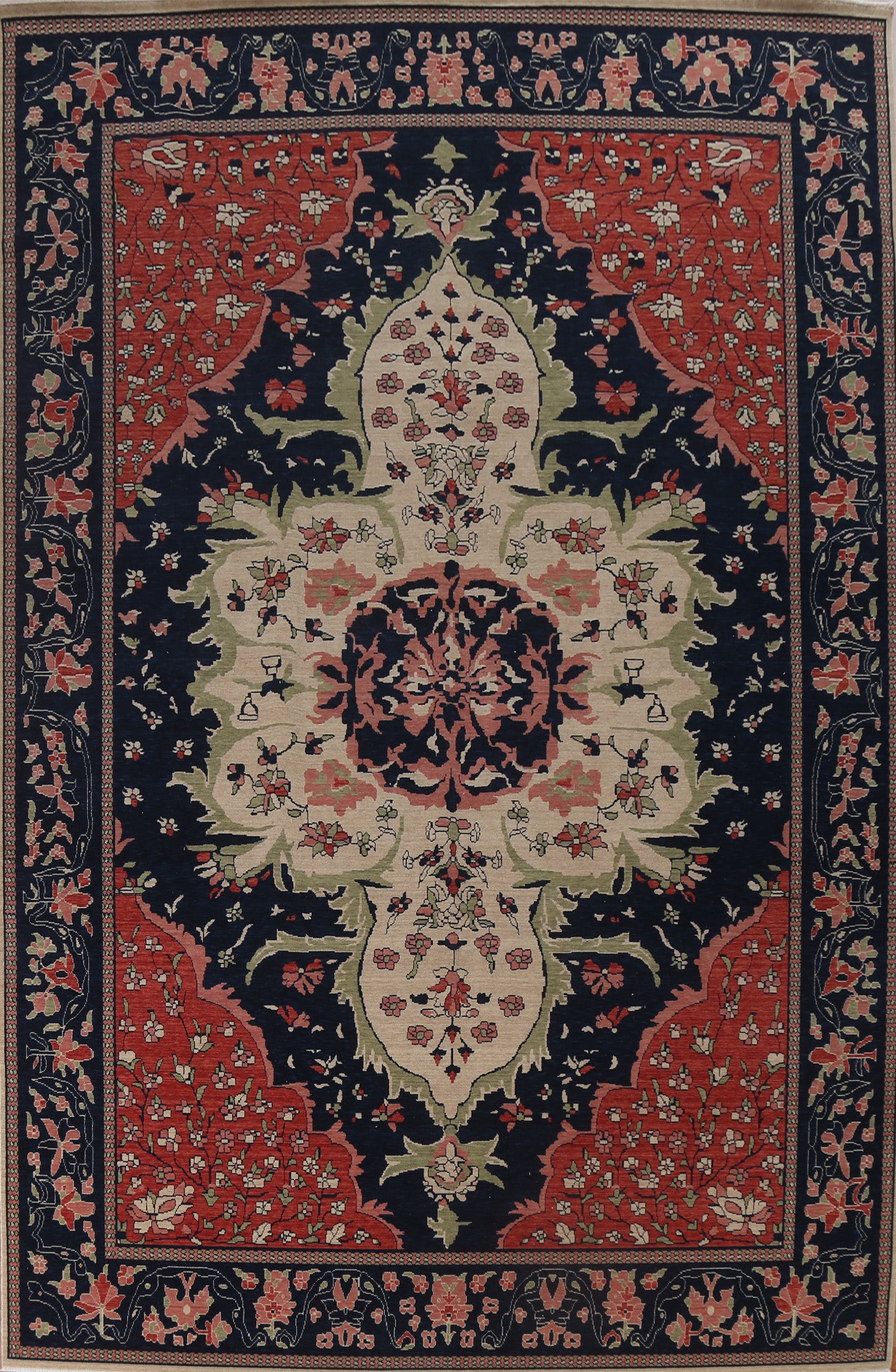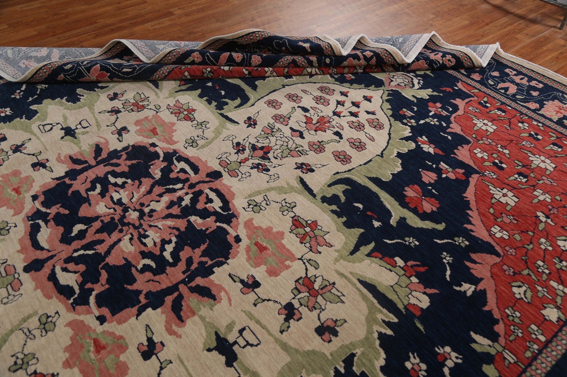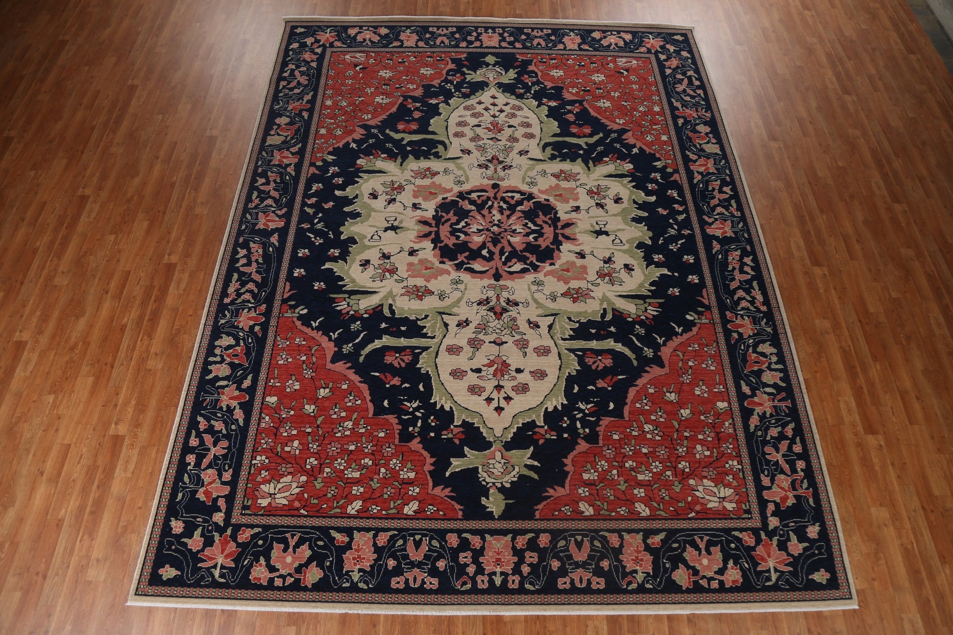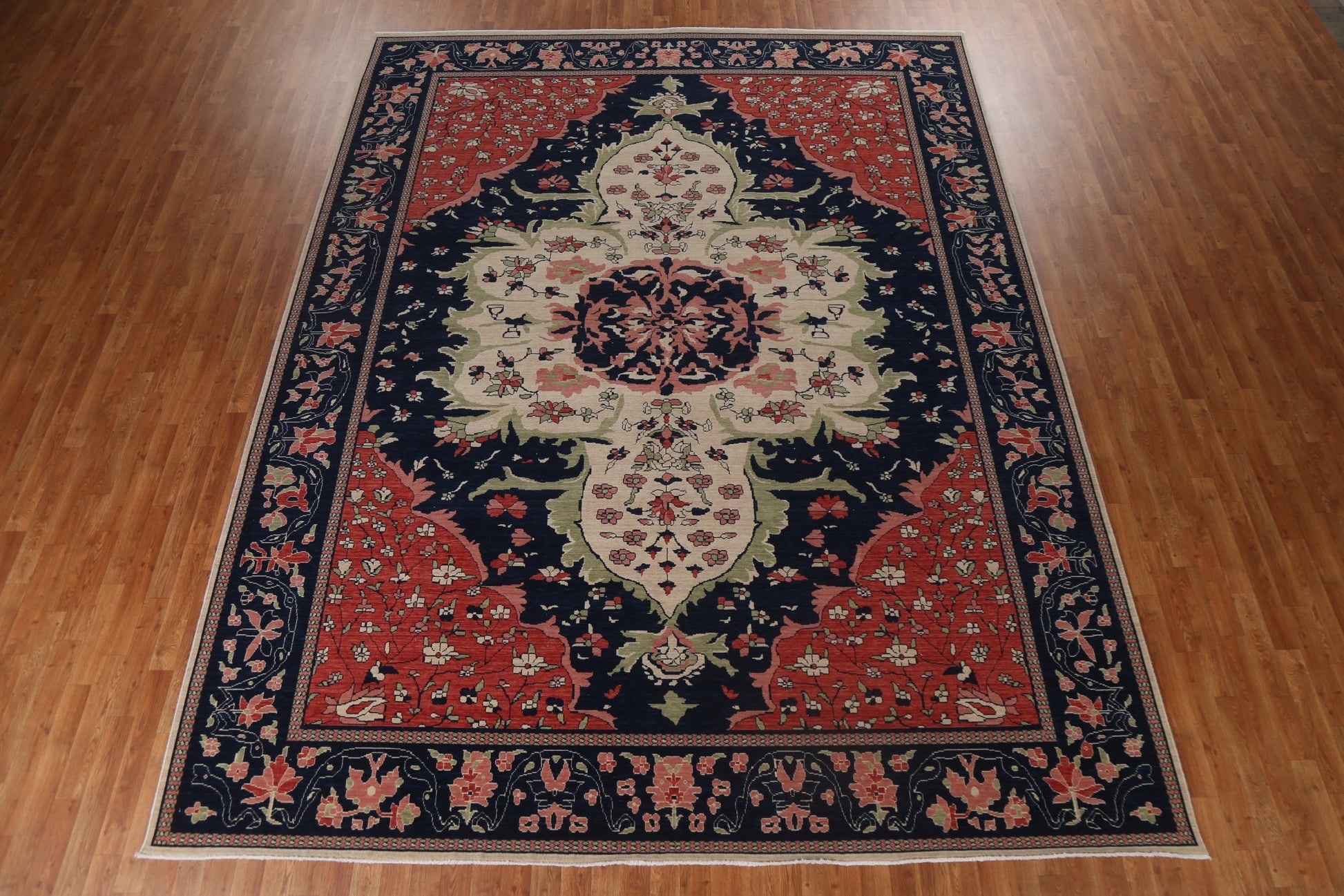 A Beautiful Genuine Turkey Sarouk (Farahan) rug is Hand Knotted by skillful weavers in Turkey with 100% Wool Material. This rug is in New, First Quality condition. dimensions are 12' 9'' X 9' 10'' in foot and 389 X 300 in centimeter. the primary color is Navy Blue & Blues.