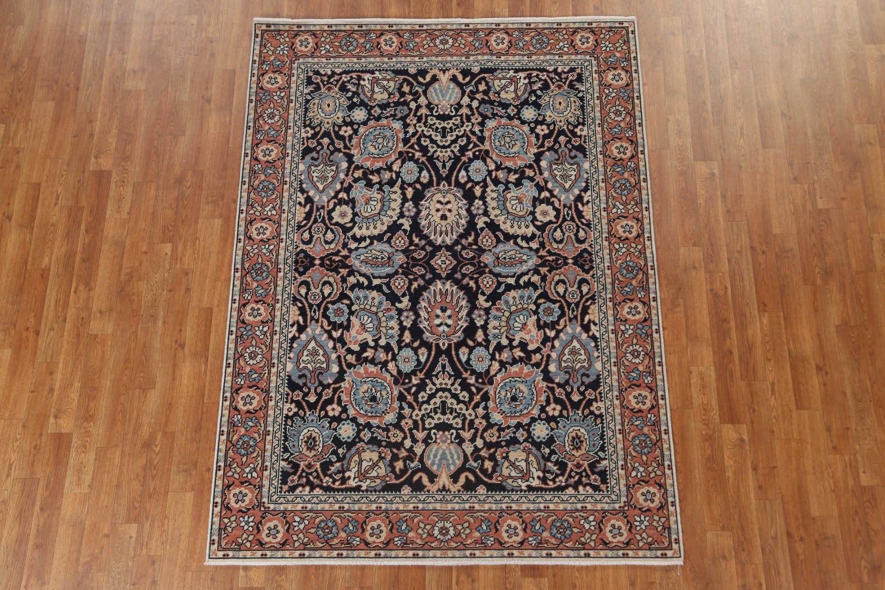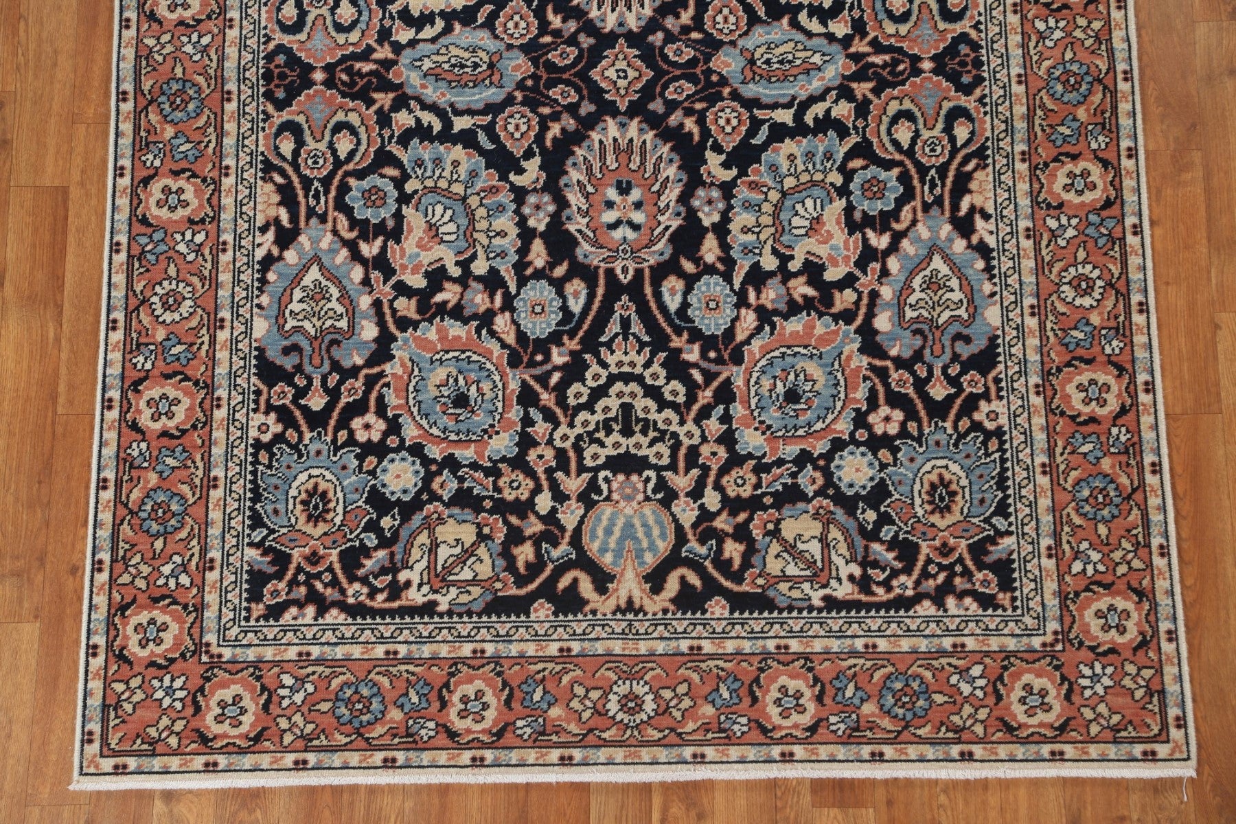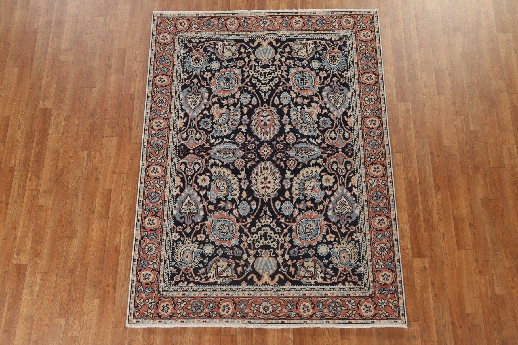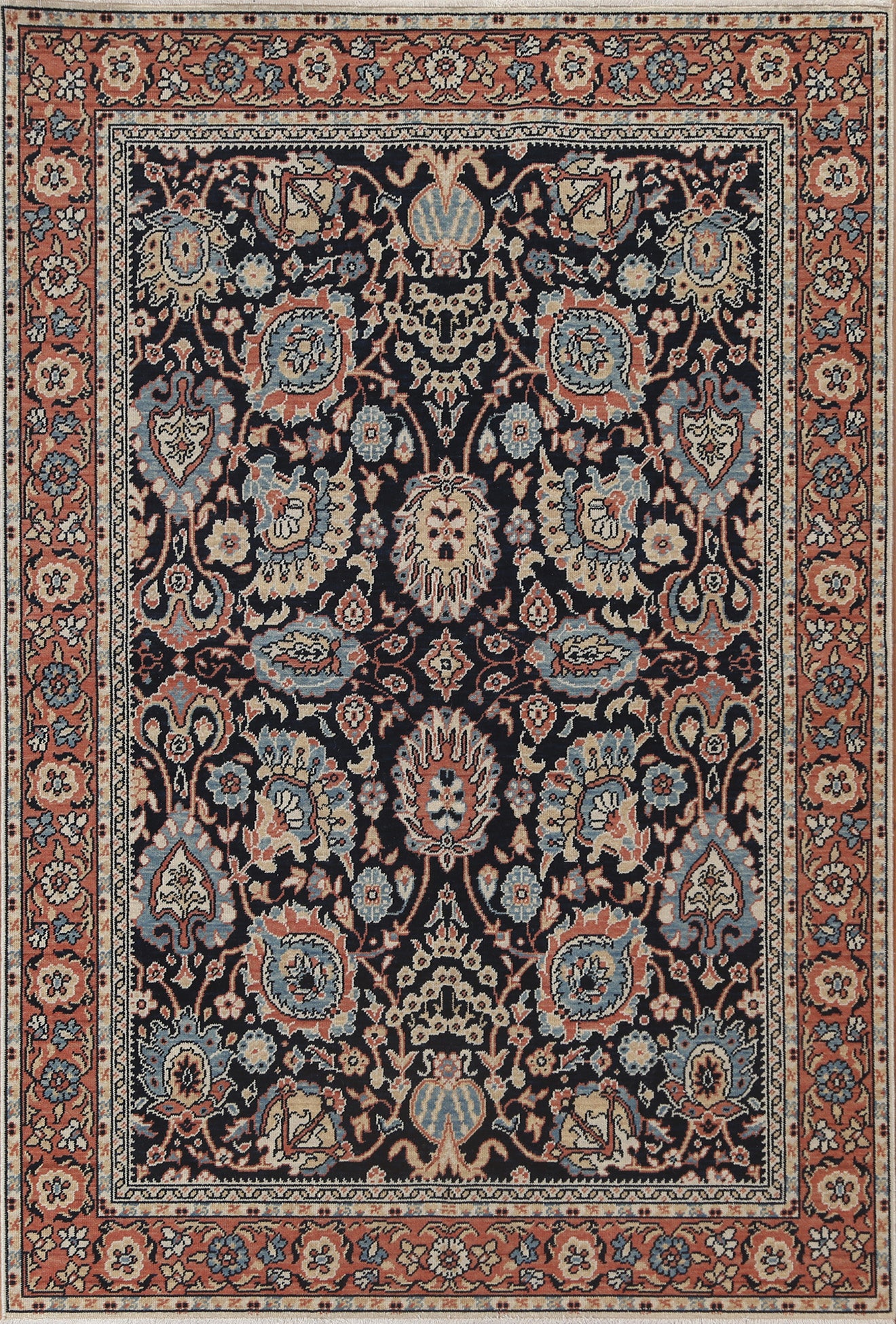 A Beautiful Genuine Turkey Sultanabad (Ziegler) rug is Hand Knotted by skillful weavers in Turkey with 100% Wool Material. This rug is in New, First Quality condition. dimensions are 6' 10'' X 5' 0'' in foot and 208 X 152 in centimeter. the primary color is Navy Blue & Blues.