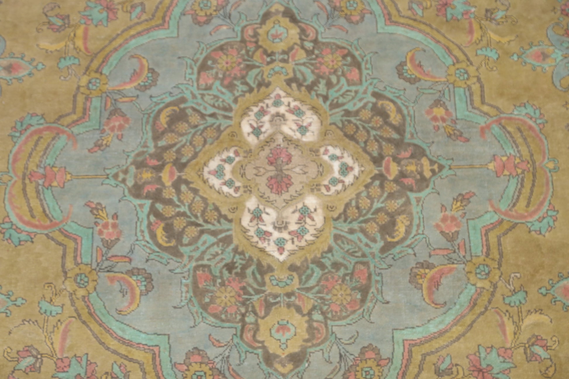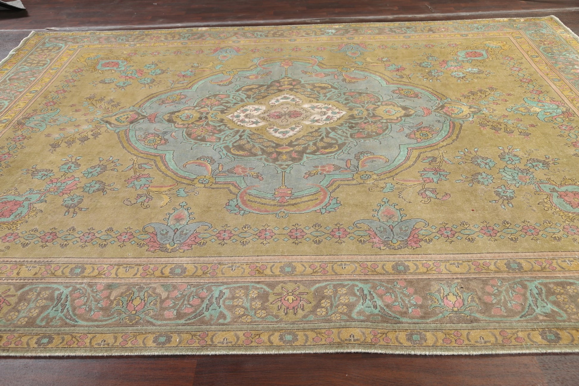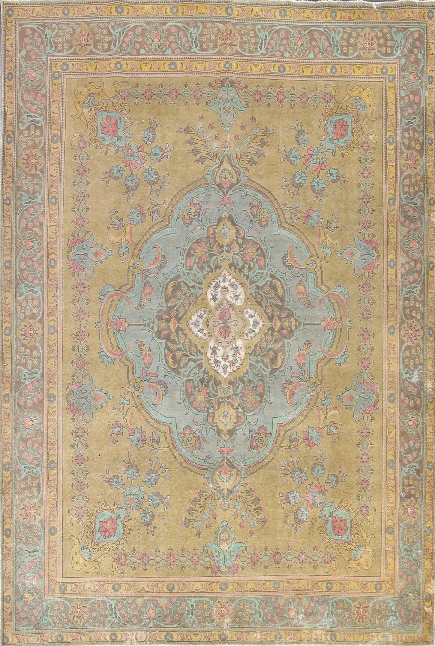 A Beautiful Genuine Persia ( Persia ) Tabriz rug is Hand Knotted by skillful weavers in Persia ( Persia ) with 100% Wool Material. This rug is in Very Good (Evenly Low Pile) condition. dimensions are 12' 7'' X 9' 8'' in foot and 384 X 295 in centimeter. the primary color is Green.