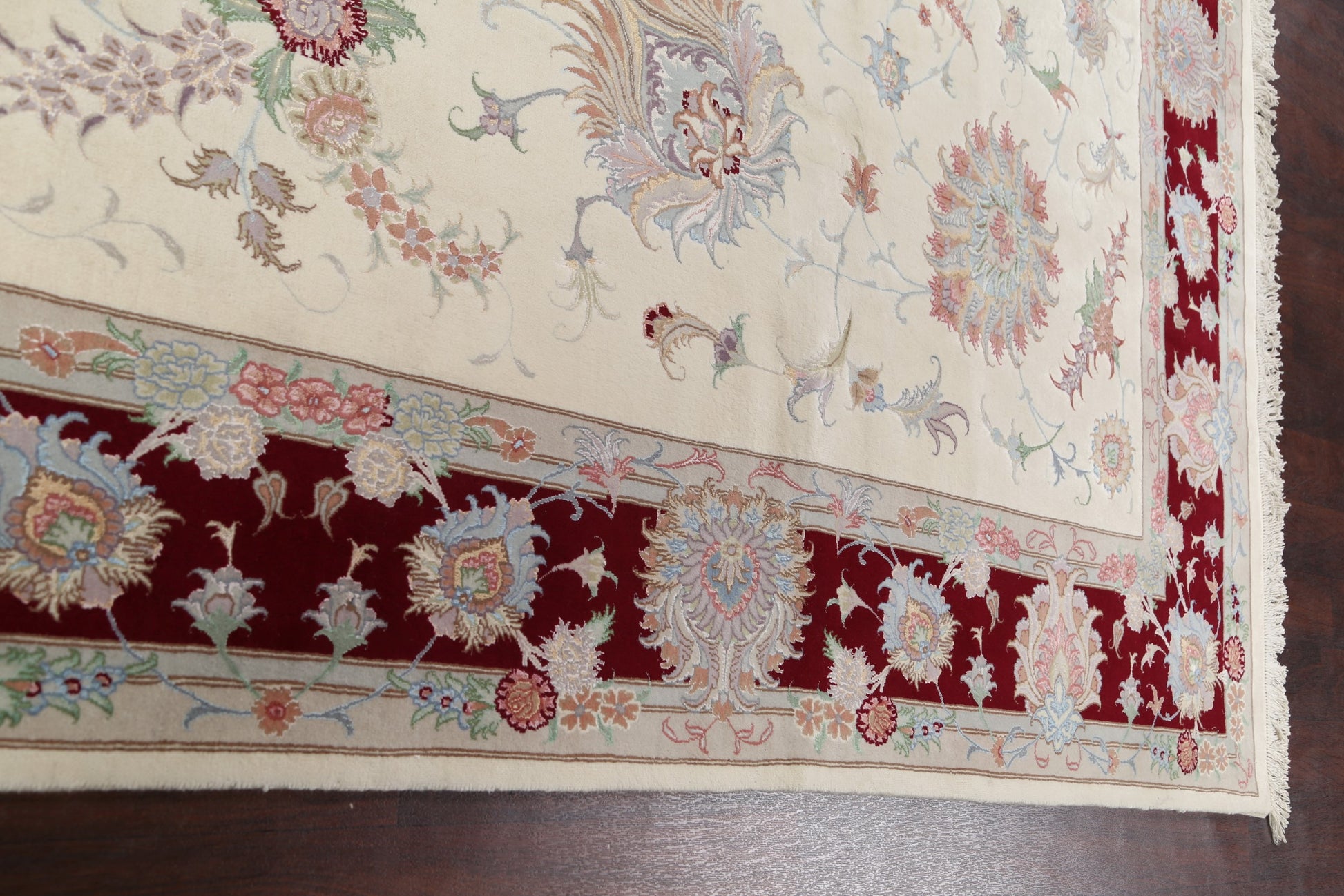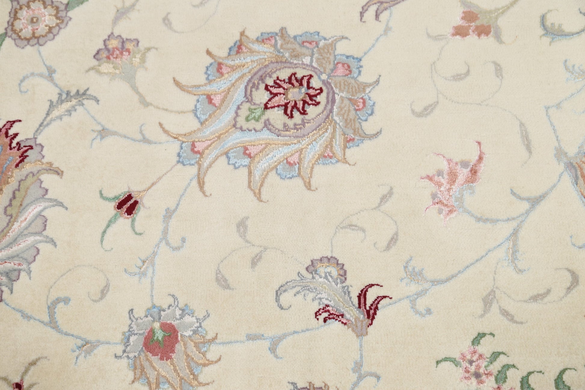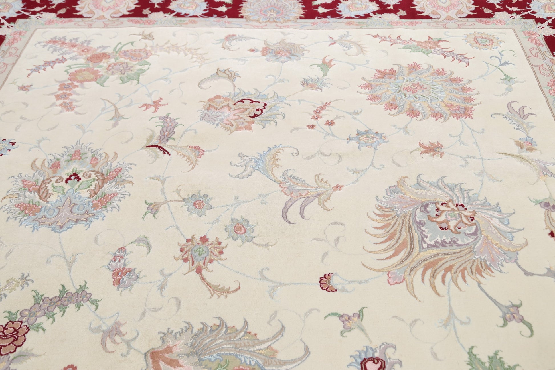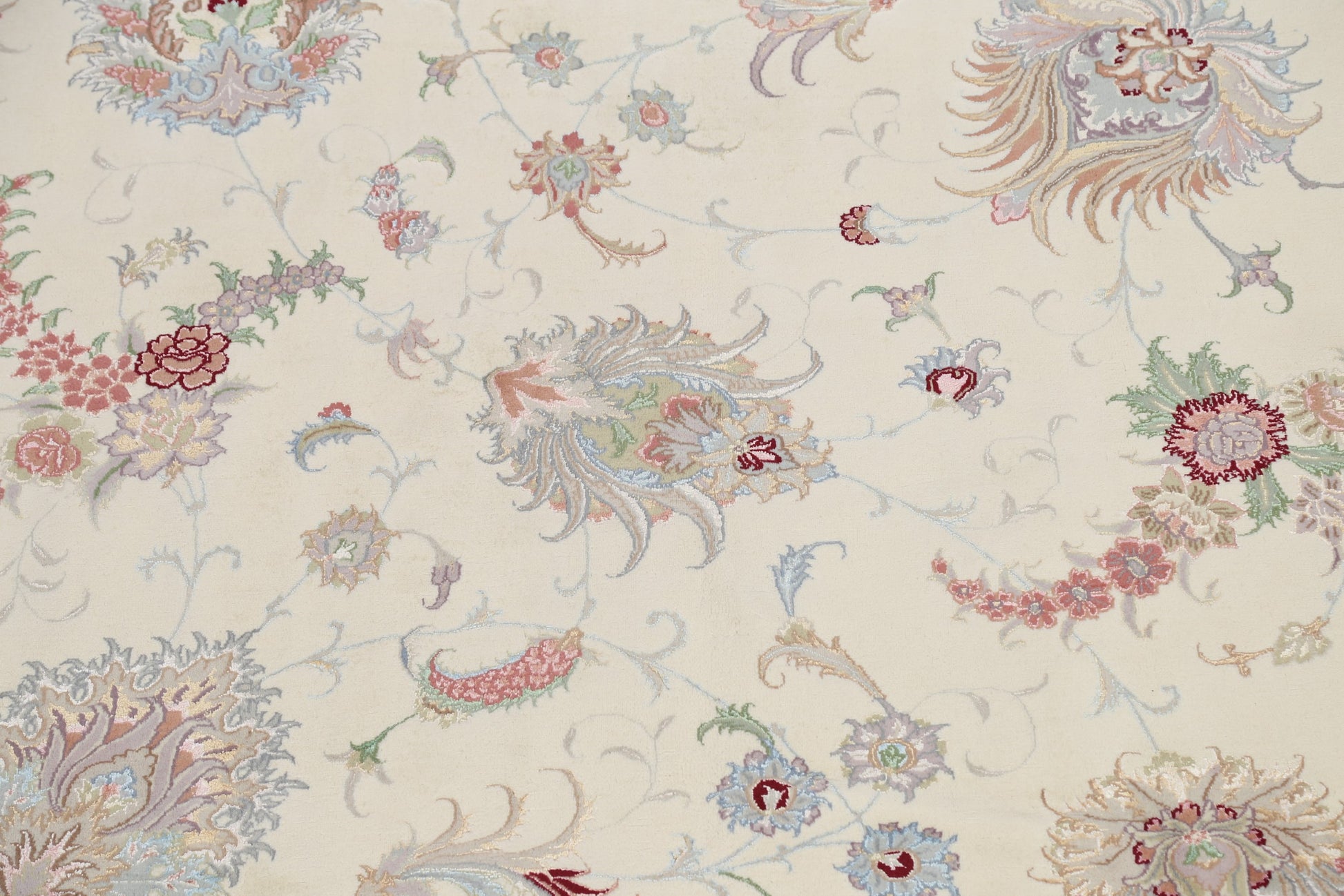 A Beautiful Genuine Persia ( Persia ) Tabriz rug is Hand Knotted by skillful weavers in Persia ( Persia ) with Wool & Silk Material. This rug is in New, First Quality condition. dimensions are 11' 1'' X 8' 0'' in foot and 338 X 244 in centimeter. the primary color is Beige & Ivories.