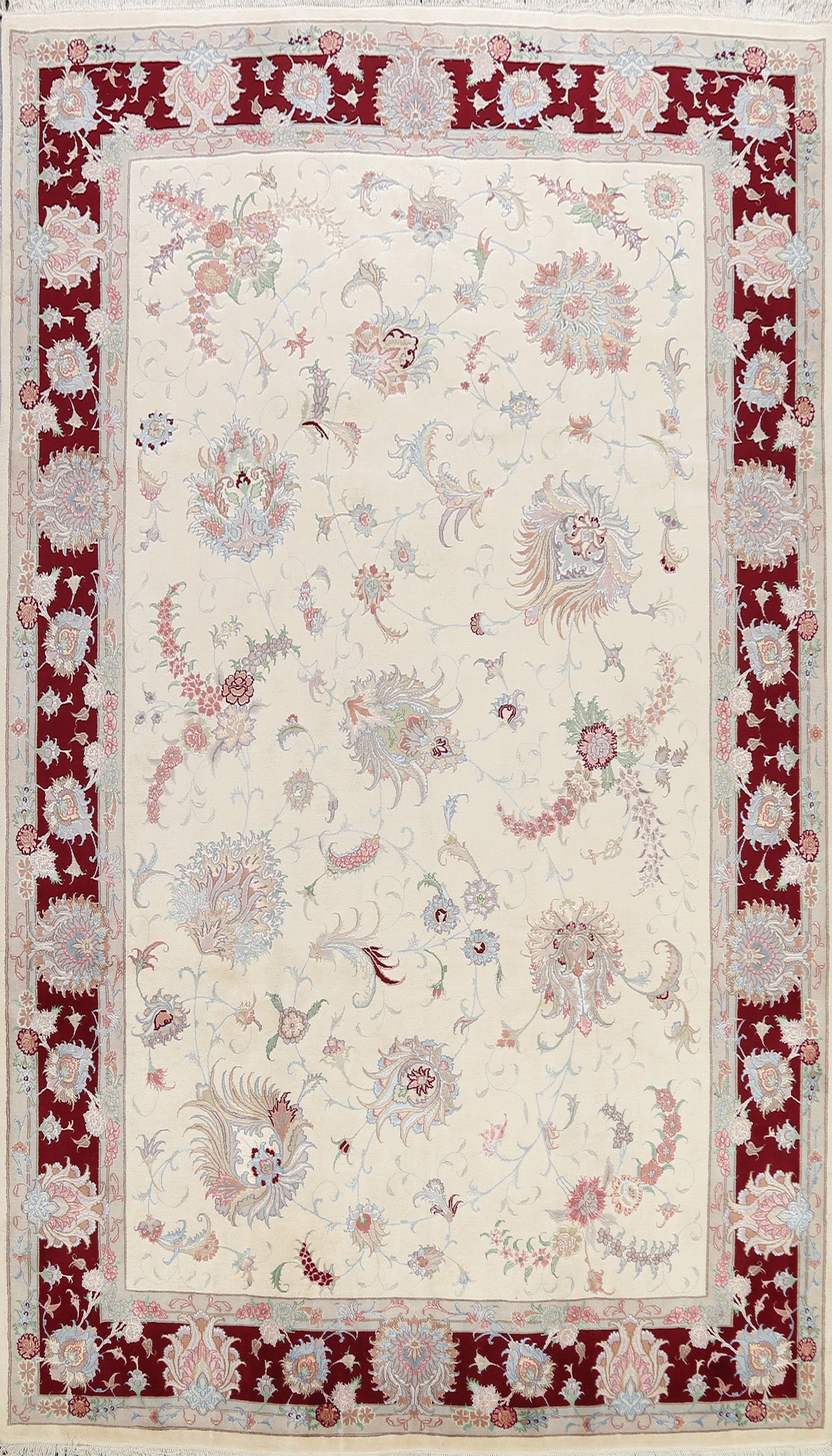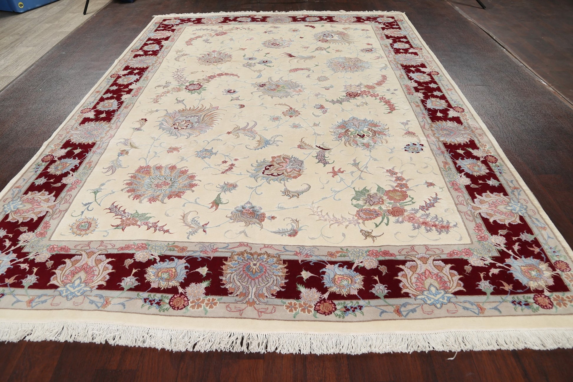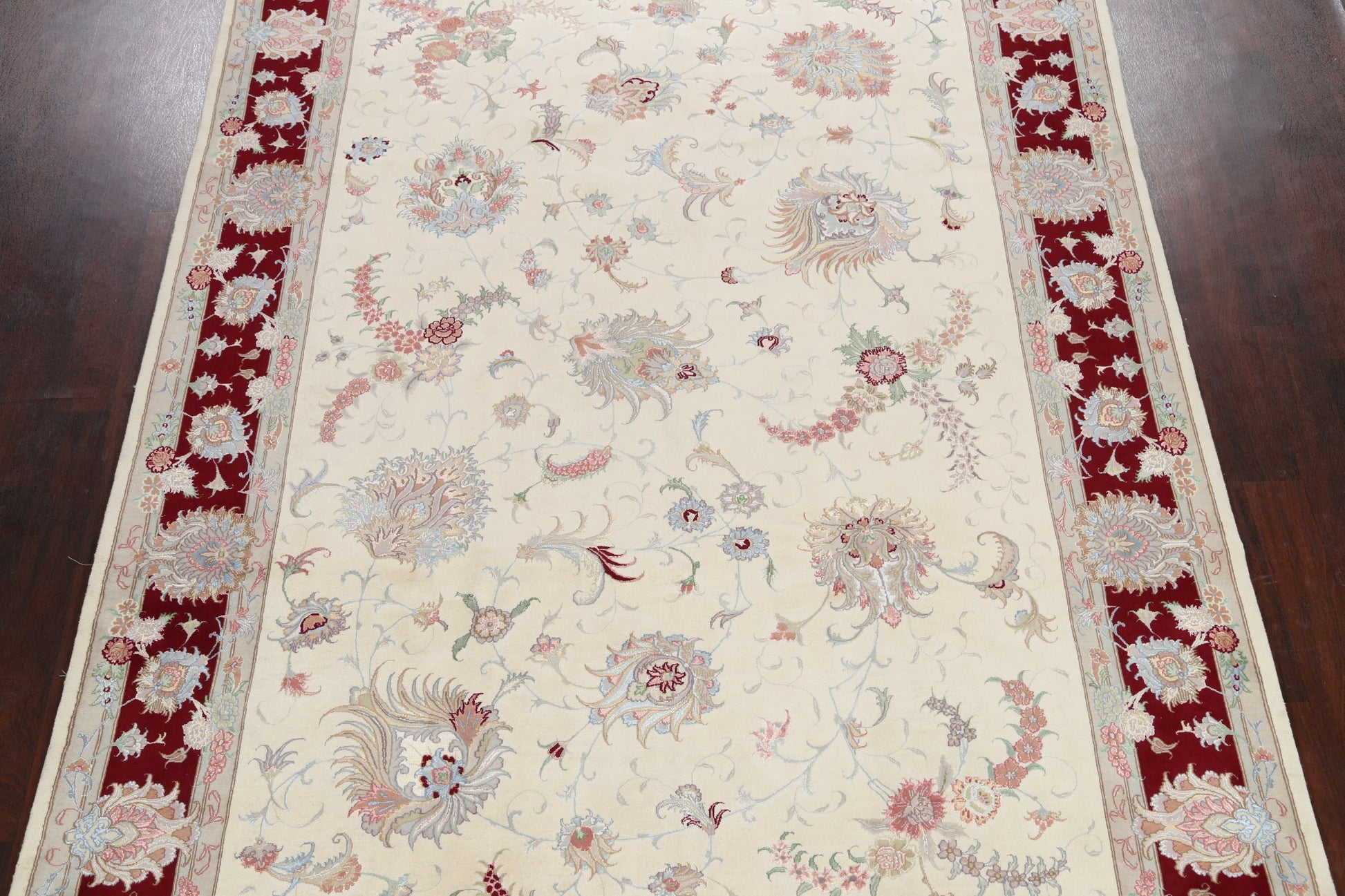 A Beautiful Genuine Persia ( Persia ) Tabriz rug is Hand Knotted by skillful weavers in Persia ( Persia ) with Wool & Silk Material. This rug is in New, First Quality condition. dimensions are 11' 1'' X 8' 0'' in foot and 338 X 244 in centimeter. the primary color is Beige & Ivories.