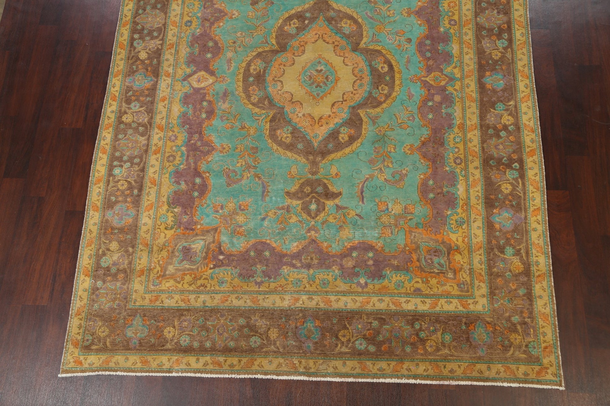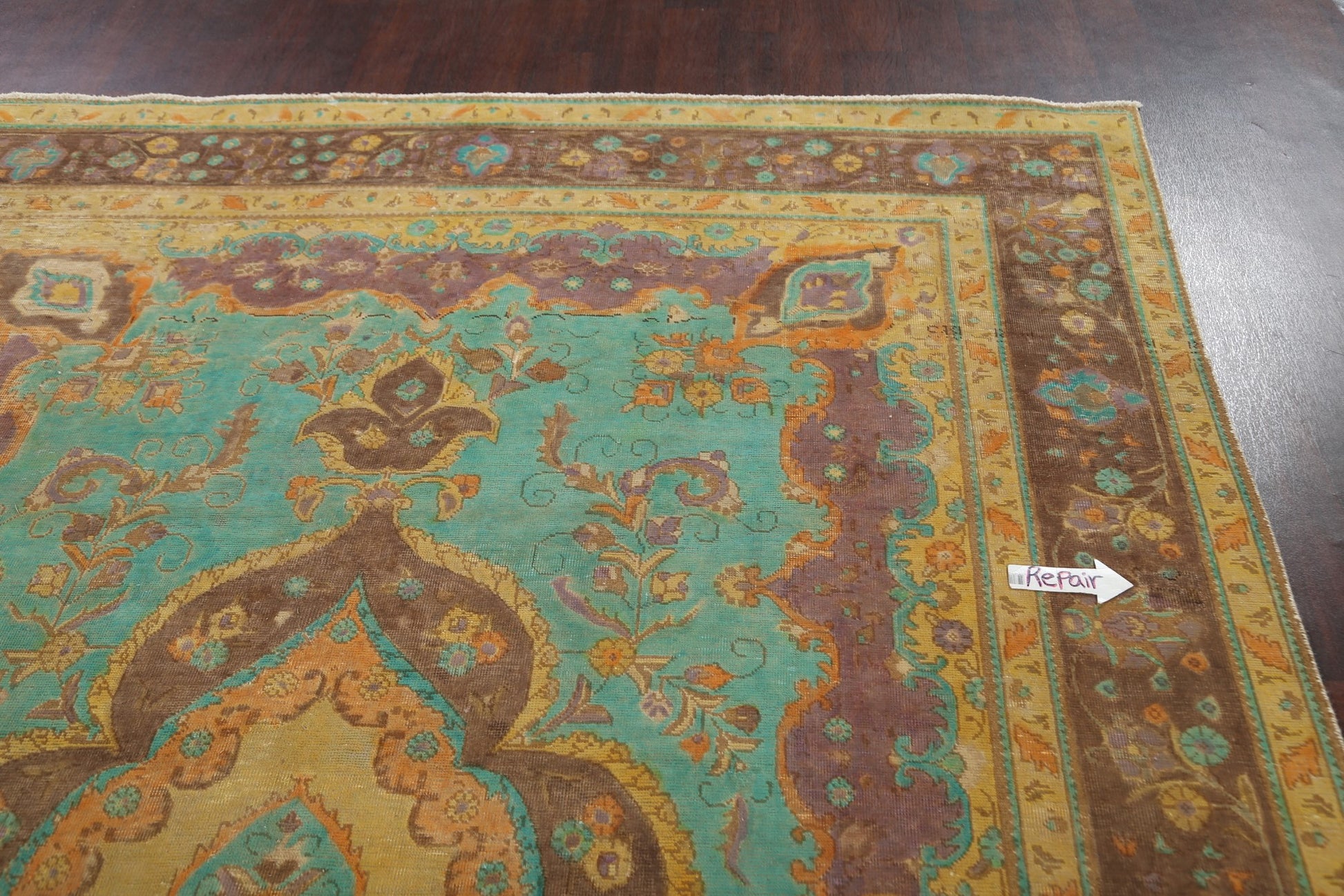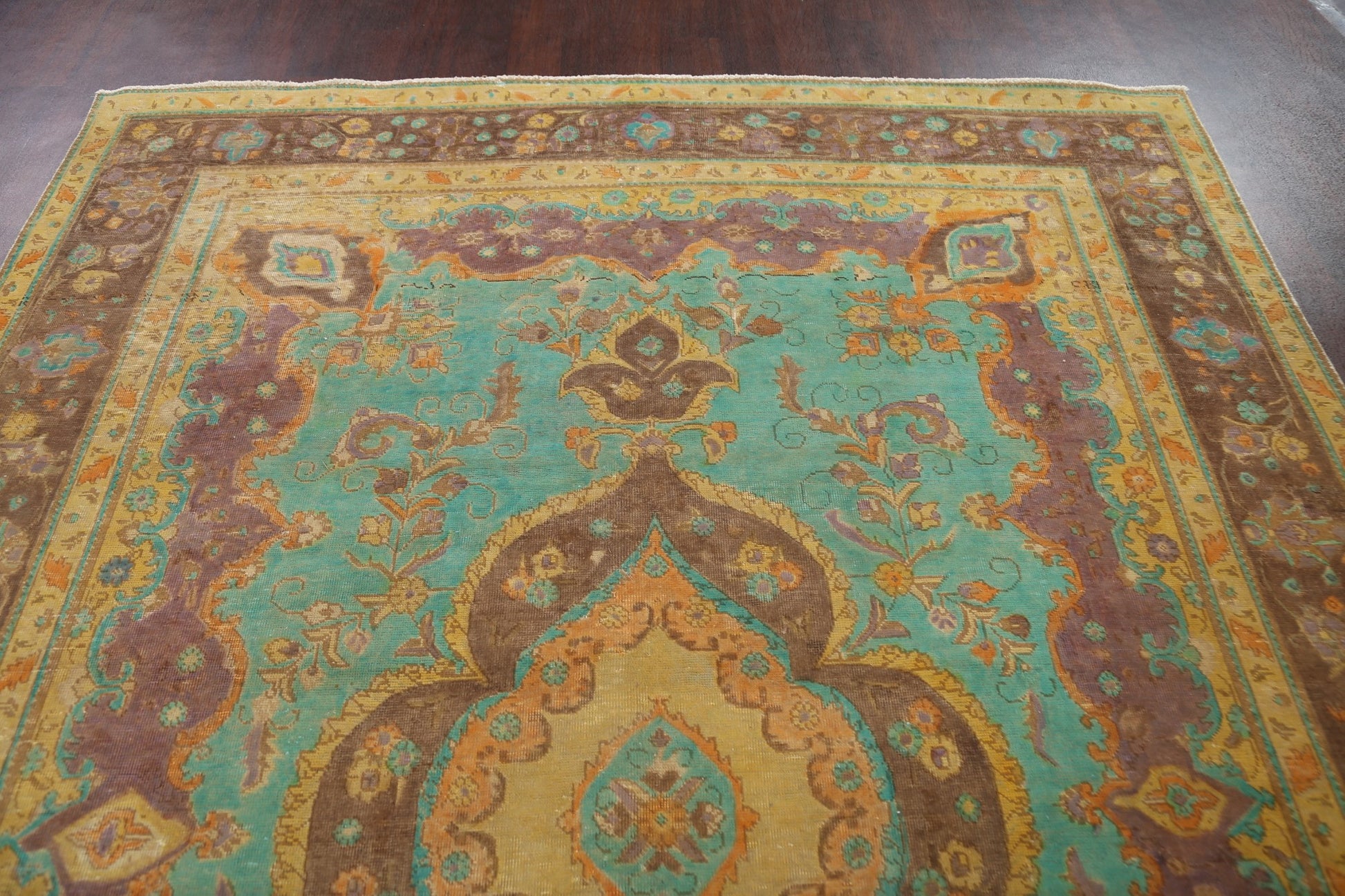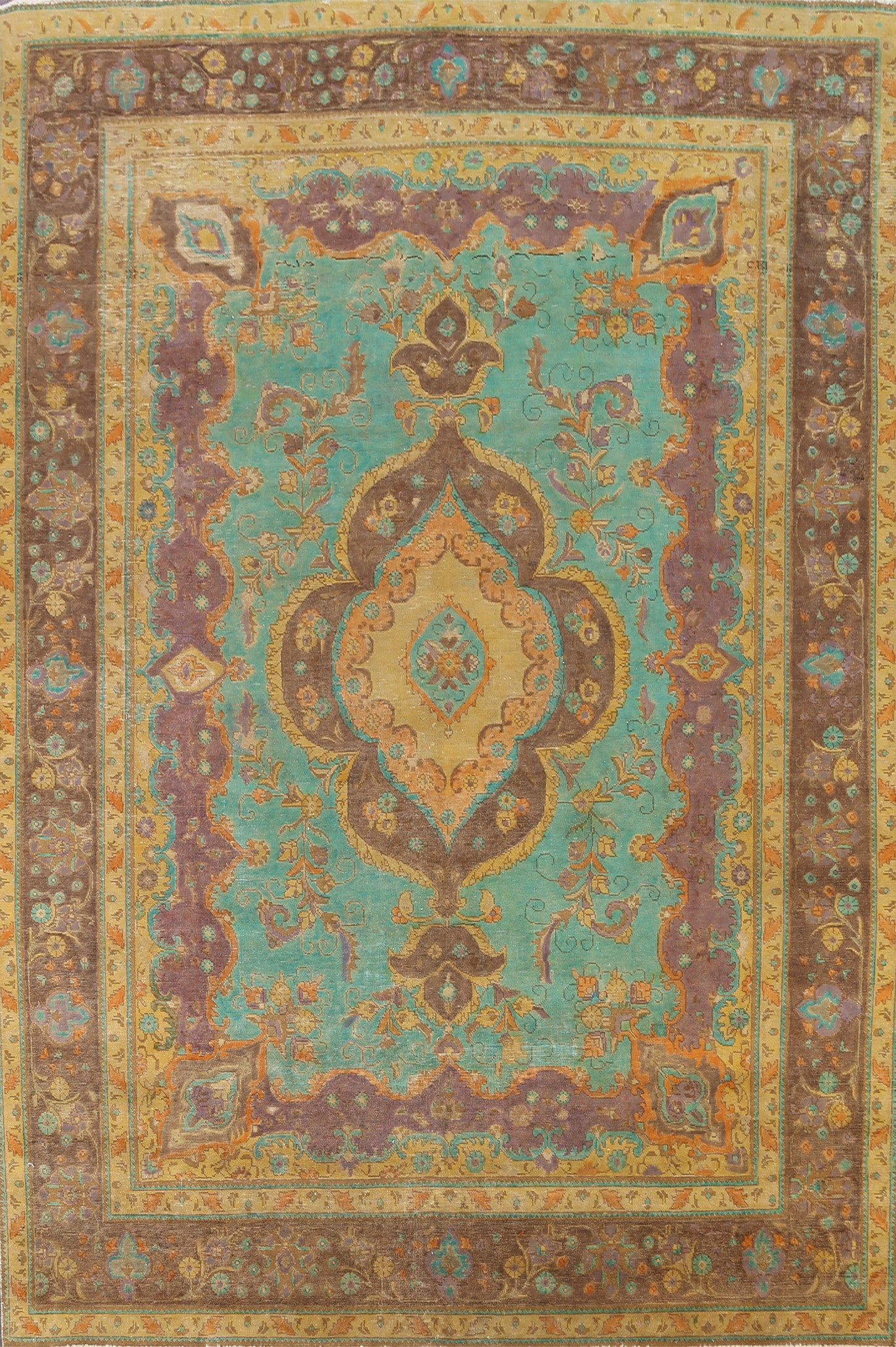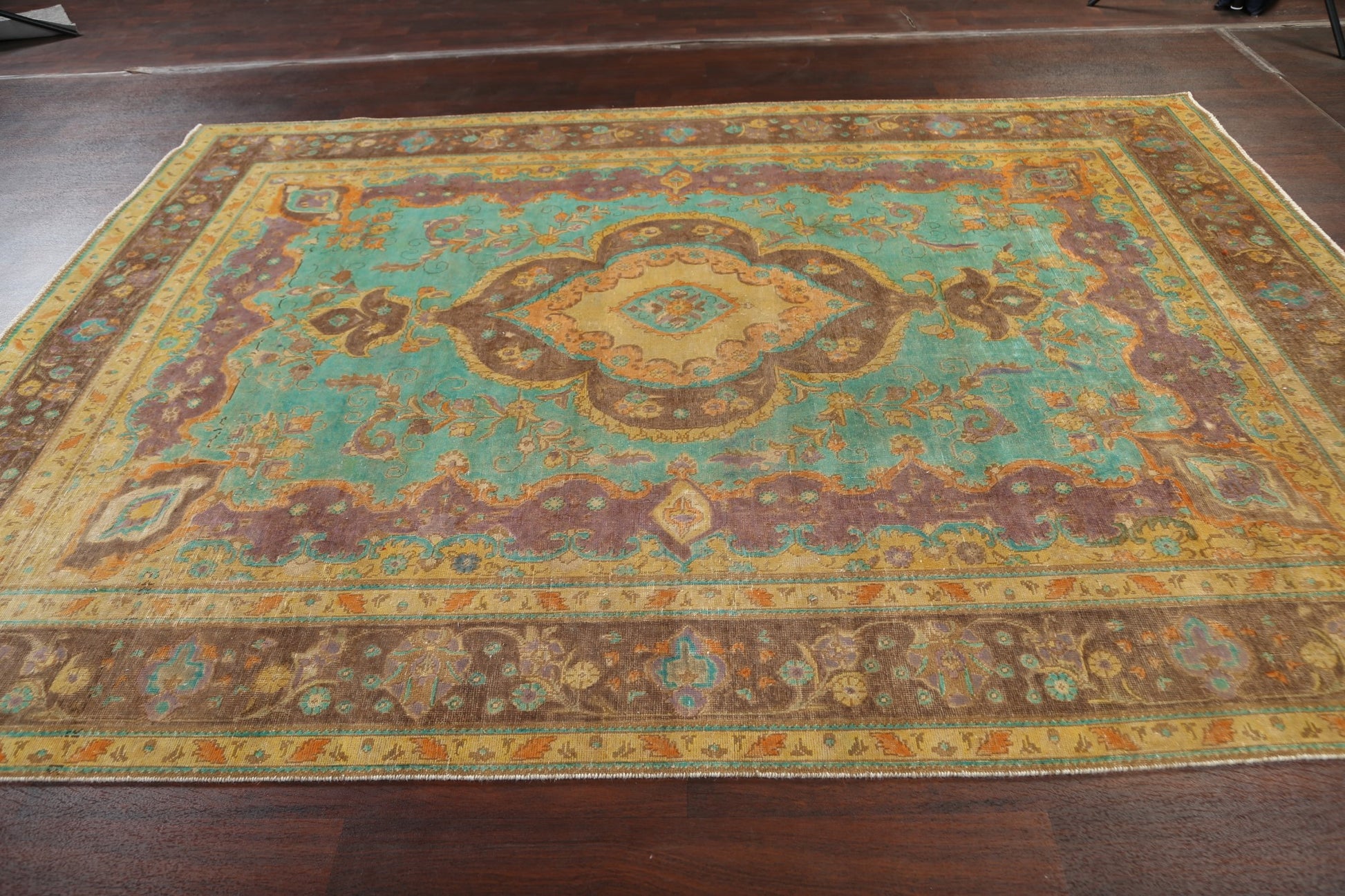 A Beautiful Genuine Persia ( Persia ) Tabriz rug is Hand Knotted by skillful weavers in Persia ( Persia ) with 100% Wool Material. This rug is in Very Good ( Evenly Low Pile-Repair) condition. dimensions are 10' 9'' X 7' 11'' in foot and 328 X 241 in centimeter. the primary color is Green.