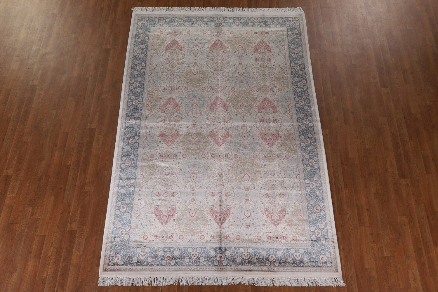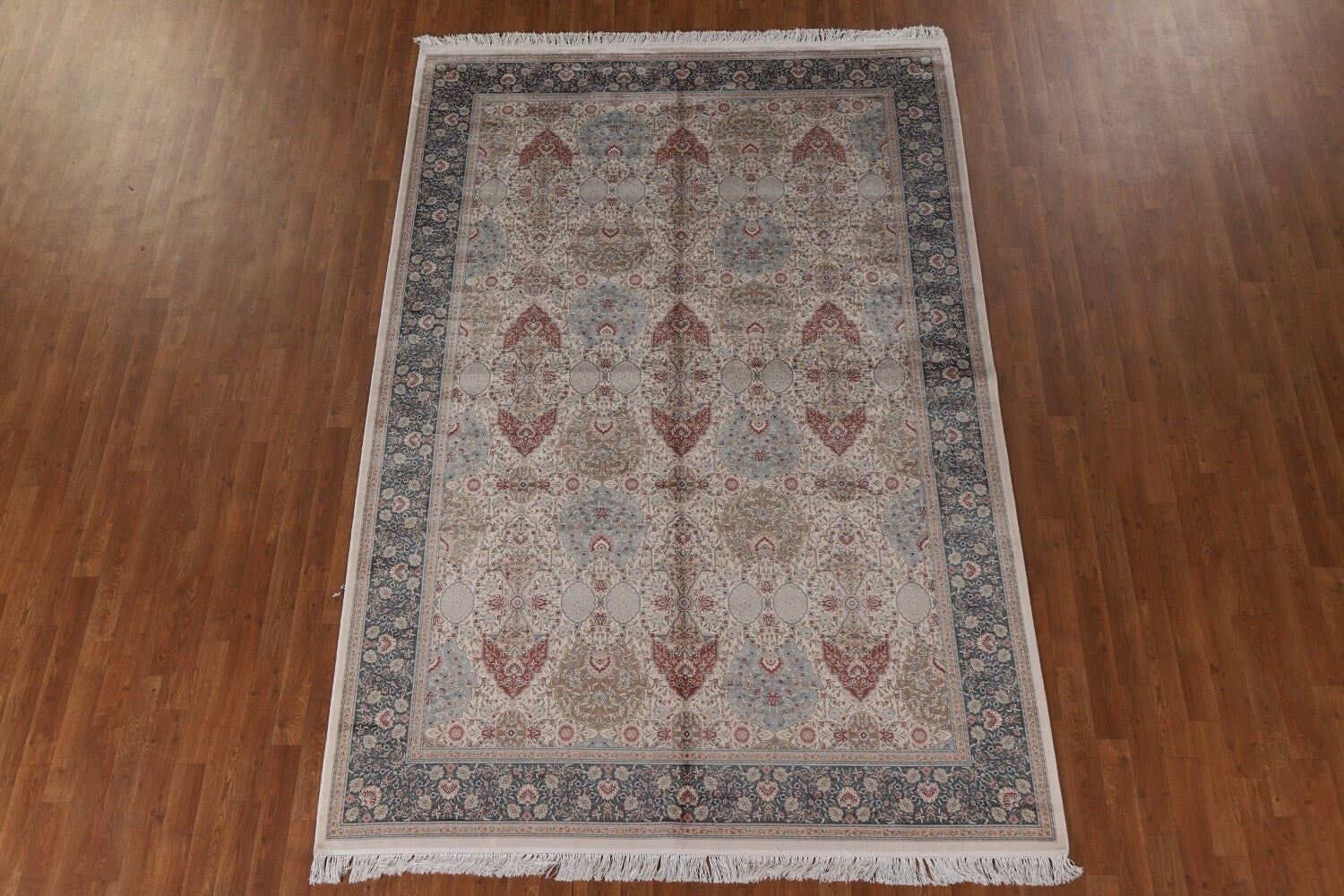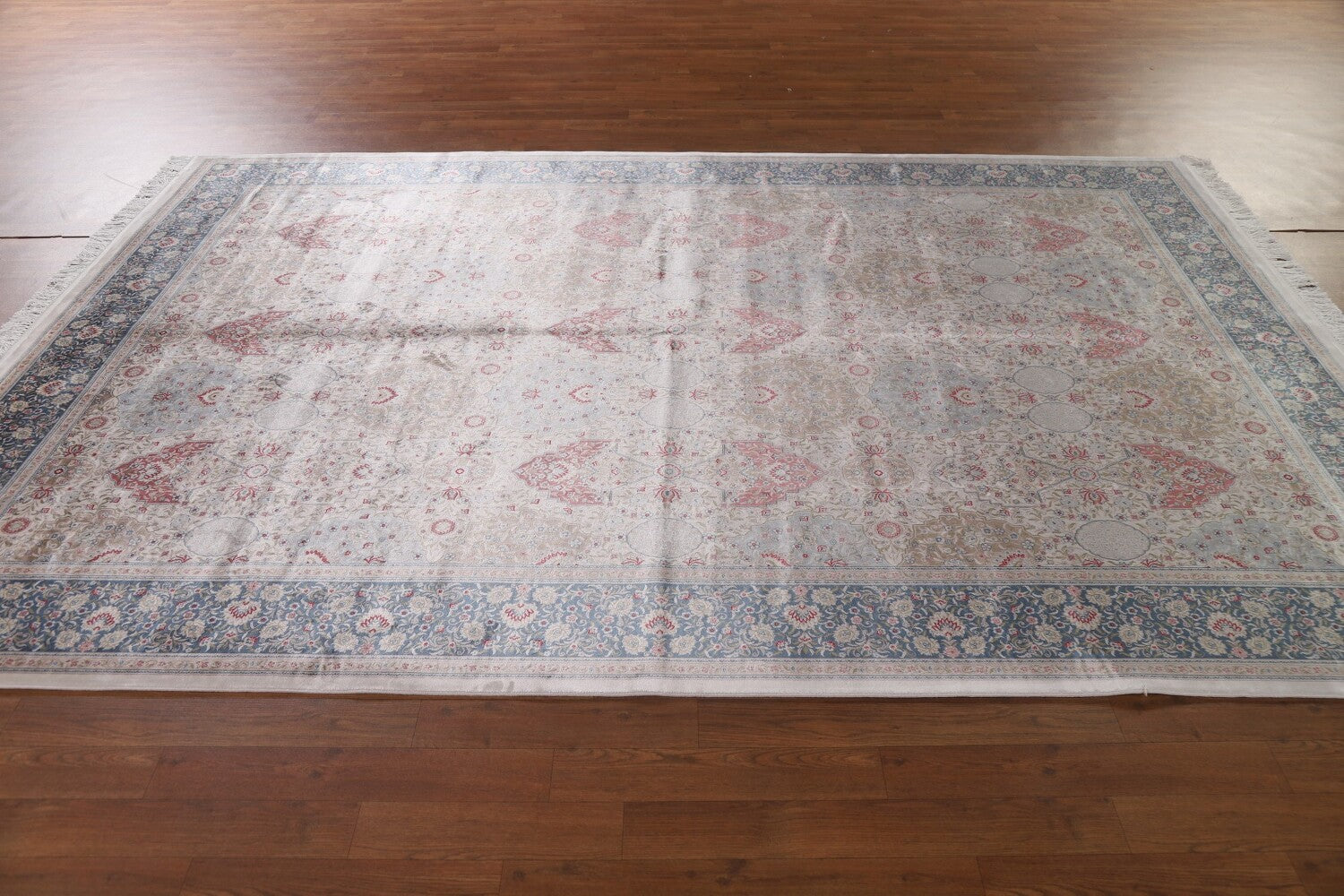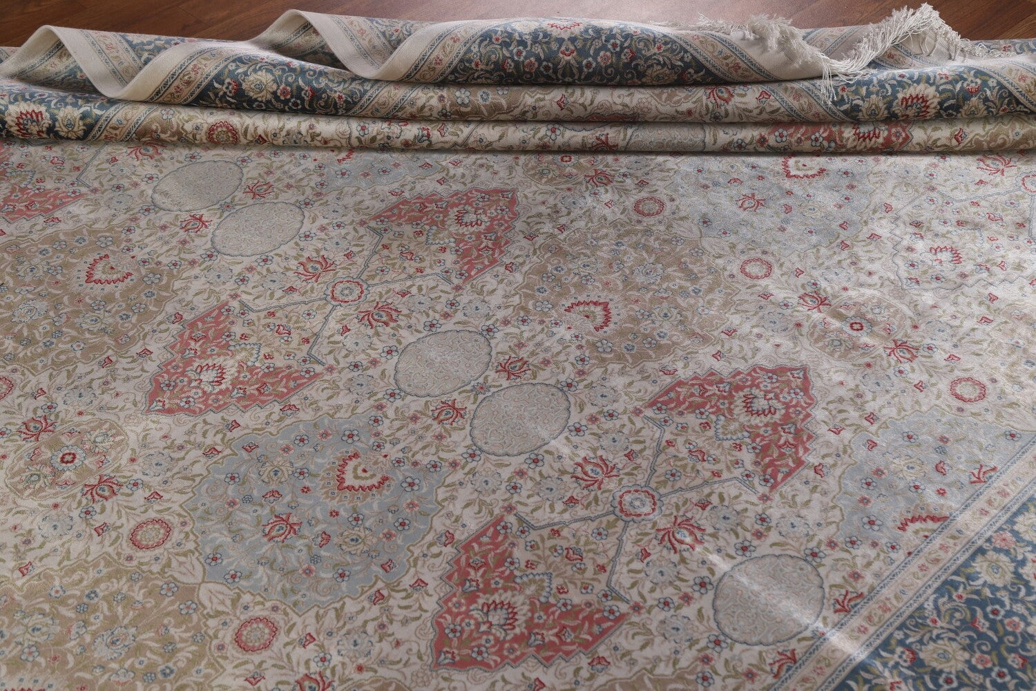 A Beautiful Genuine Turkey Tabriz rug is Machine Made by skillful weavers in Turkey with 90% Silk - 10% Polyester Material. This rug is in condition. dimensions are 9' 7'' X 6' 5'' in foot and 292 X 196 in centimeter. the primary color is Beige & Ivories.