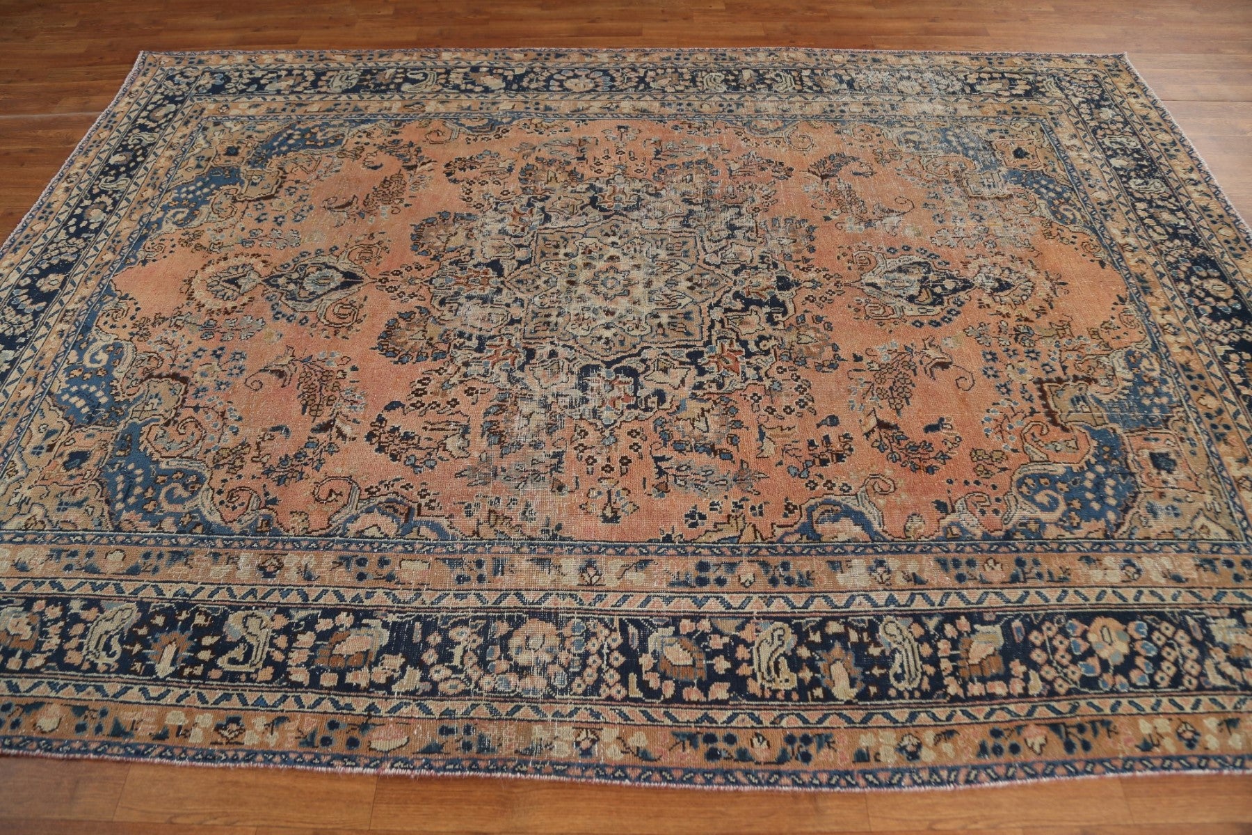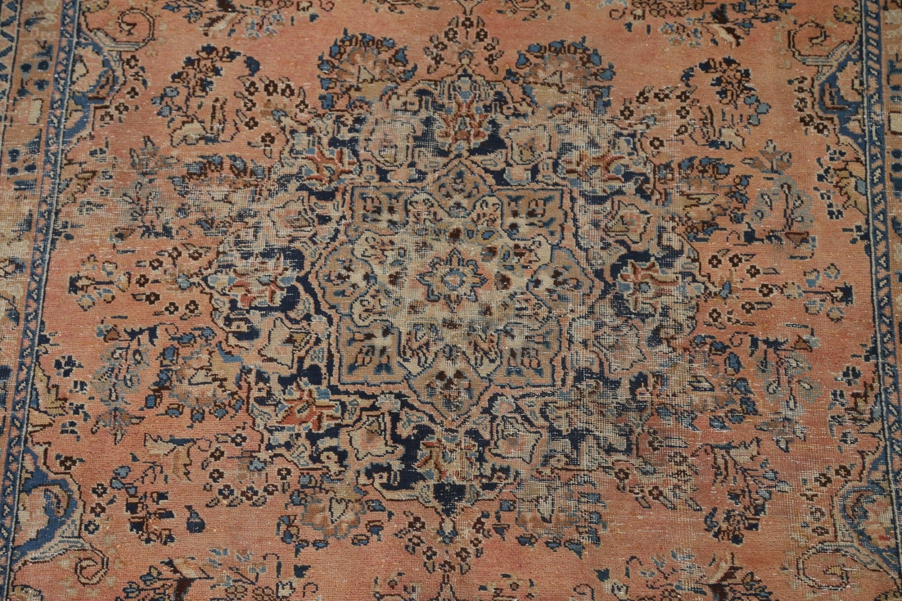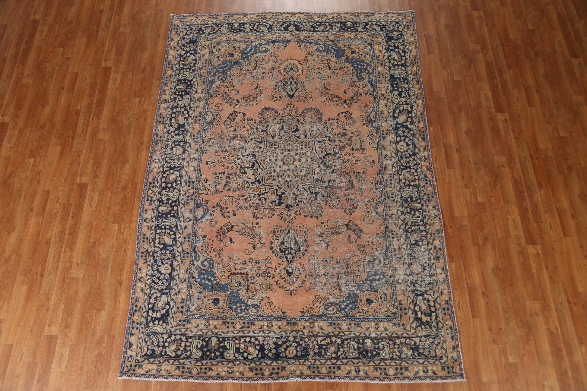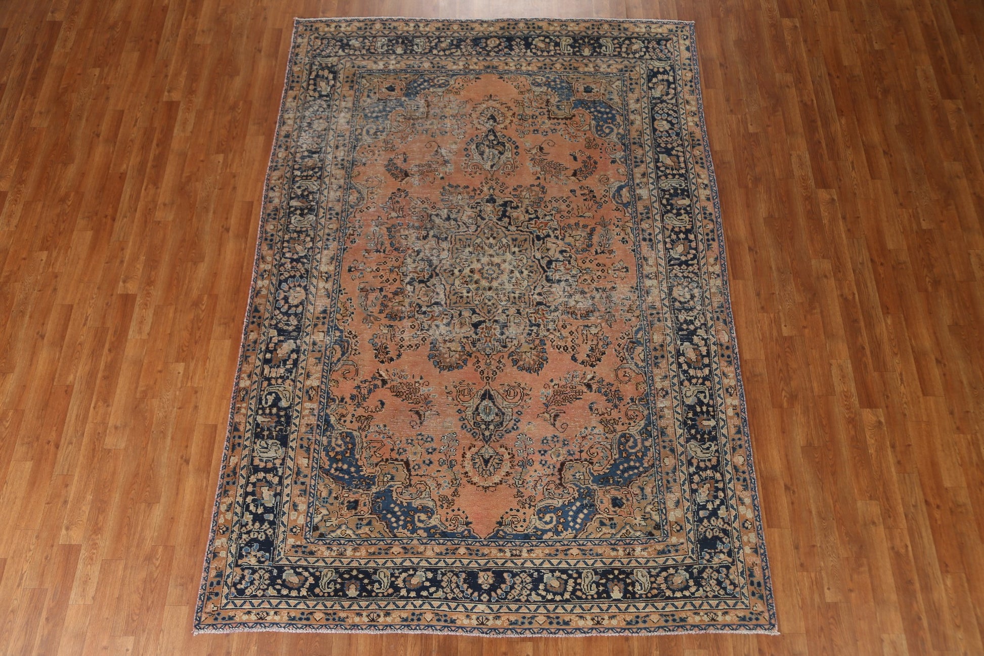 A Beautiful Genuine Persia ( Persia ) Mashad rug is Hand Knotted by skillful weavers in Persia ( Persia ) with 100% Wool Material. This rug is in Good (Evenly Low Pile-Worn) condition. dimensions are 9' 2'' X 6' 4'' in foot and 279 X 193 in centimeter. the primary color is Coral.