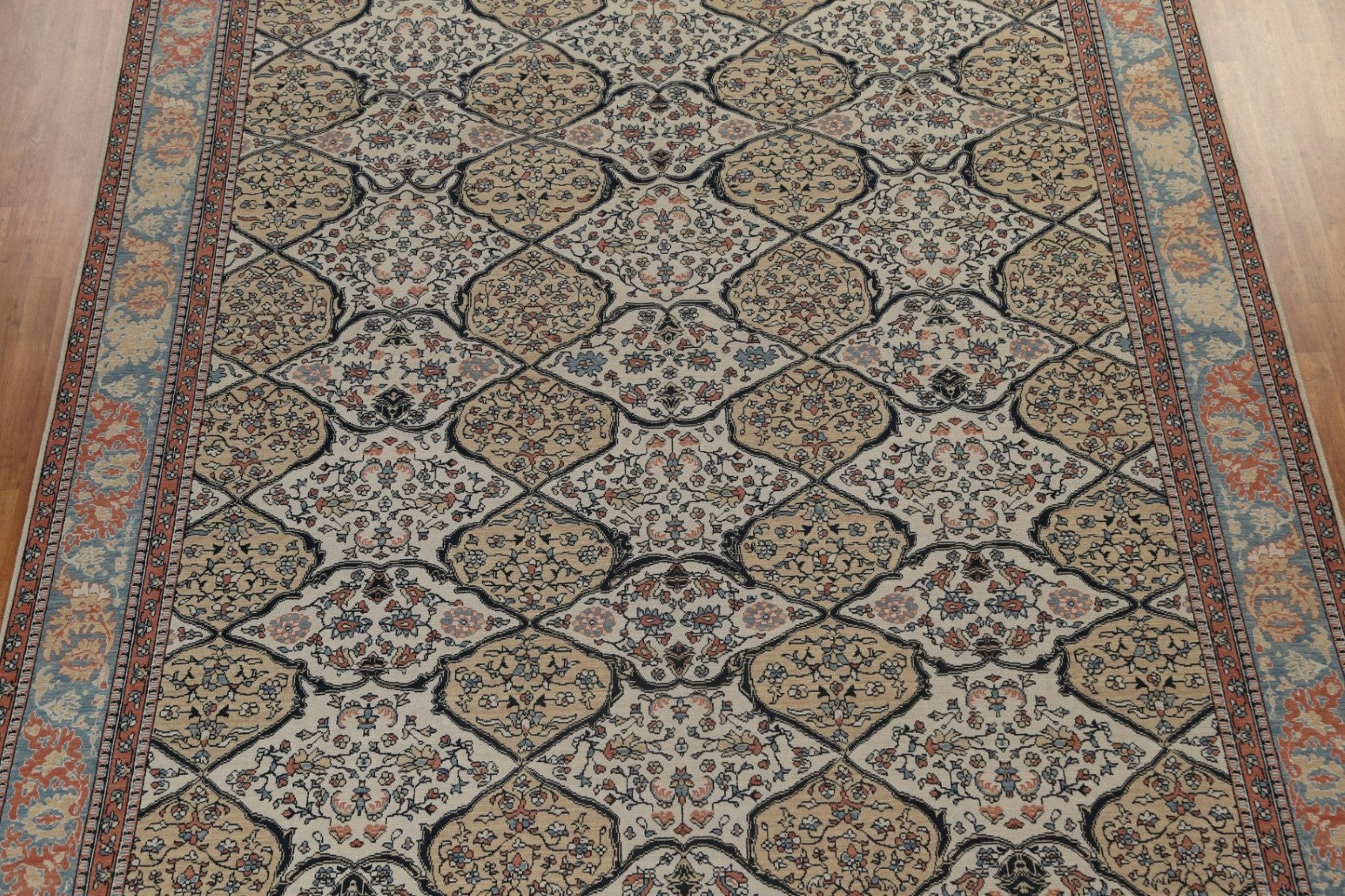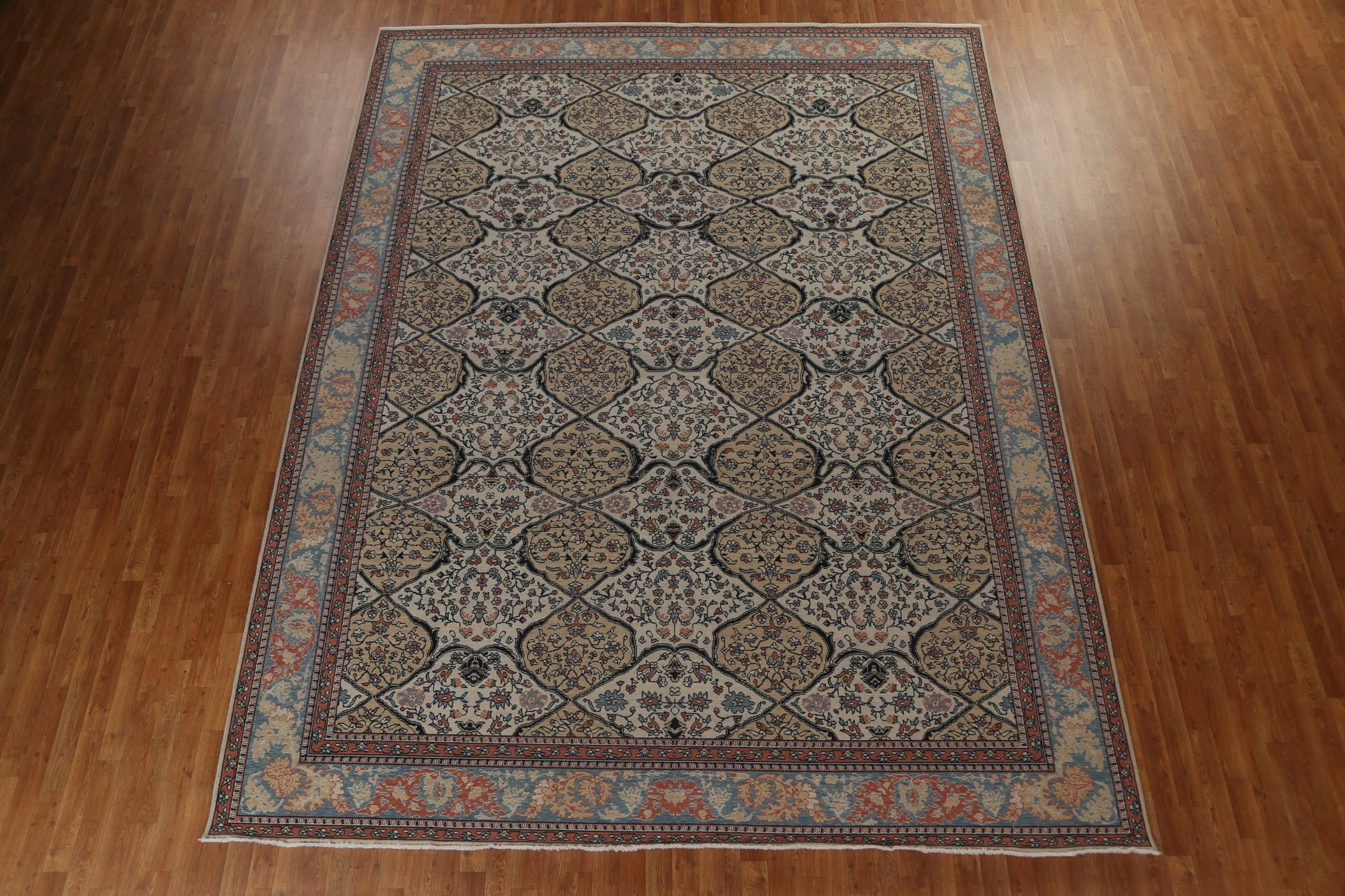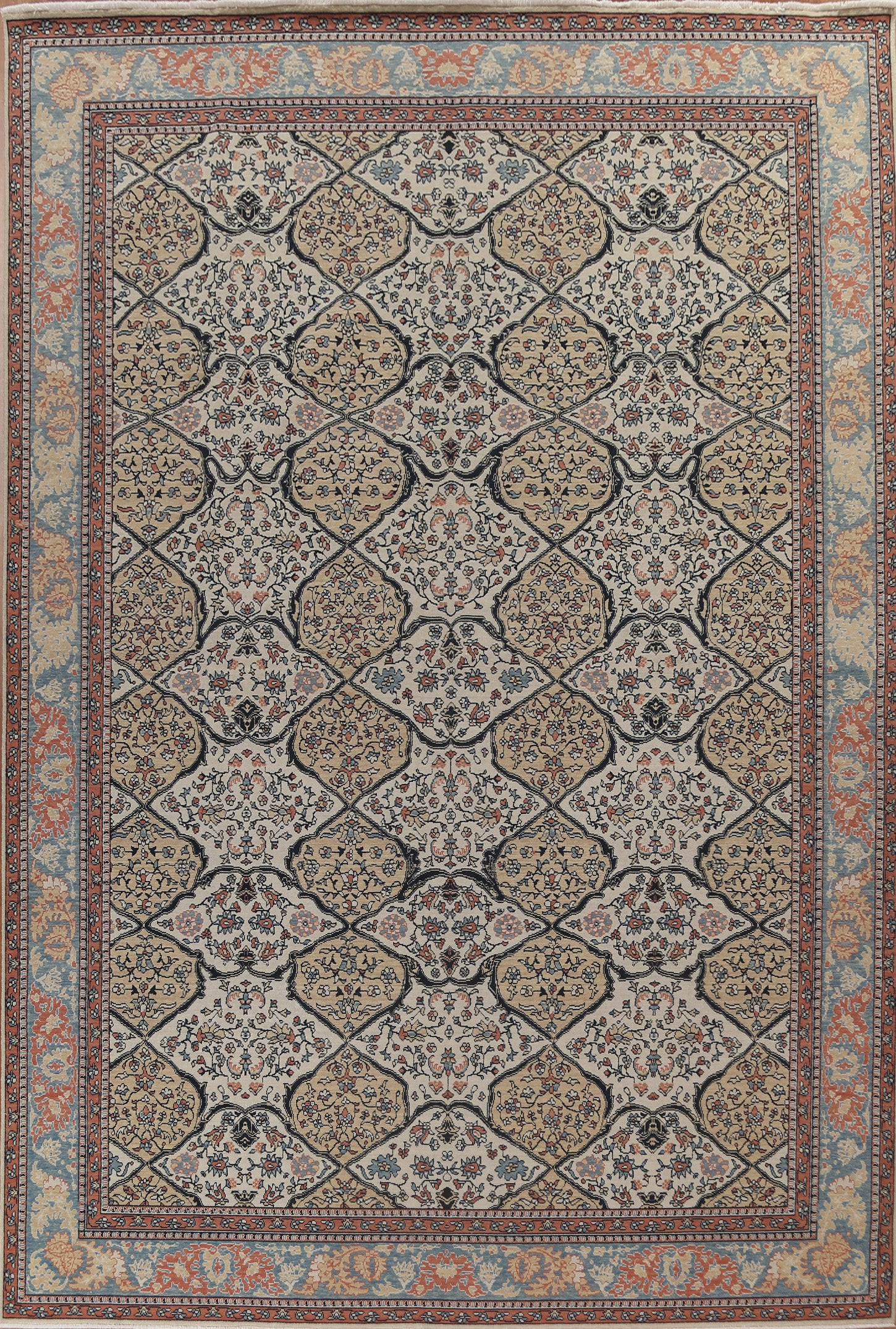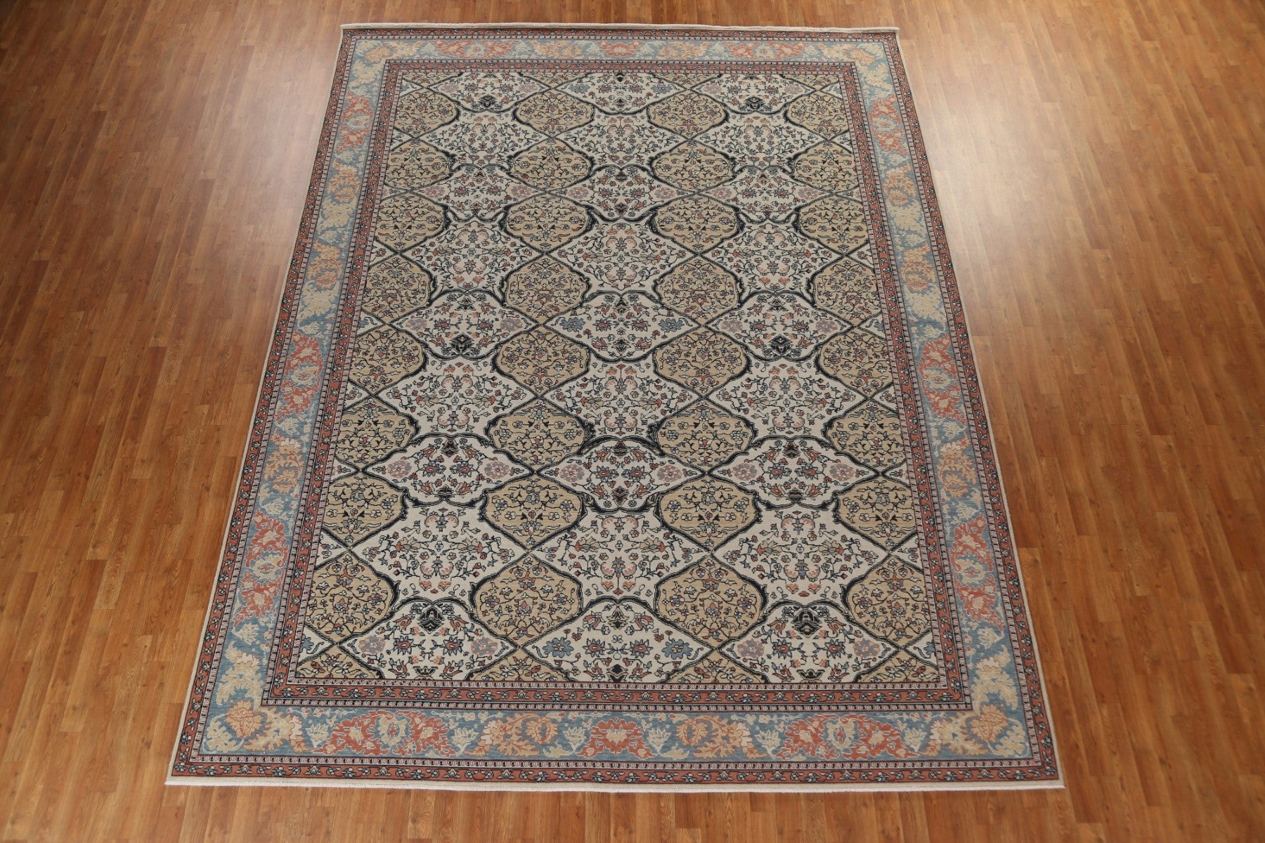 A Beautiful Genuine Turkey Bakhtiari rug is Hand Knotted by skillful weavers in Turkey with 100% Wool Material. This rug is in New, First Quality condition. dimensions are 12' 11'' X 9' 10'' in foot and 394 X 300 in centimeter. the primary color is Beige & Ivories.