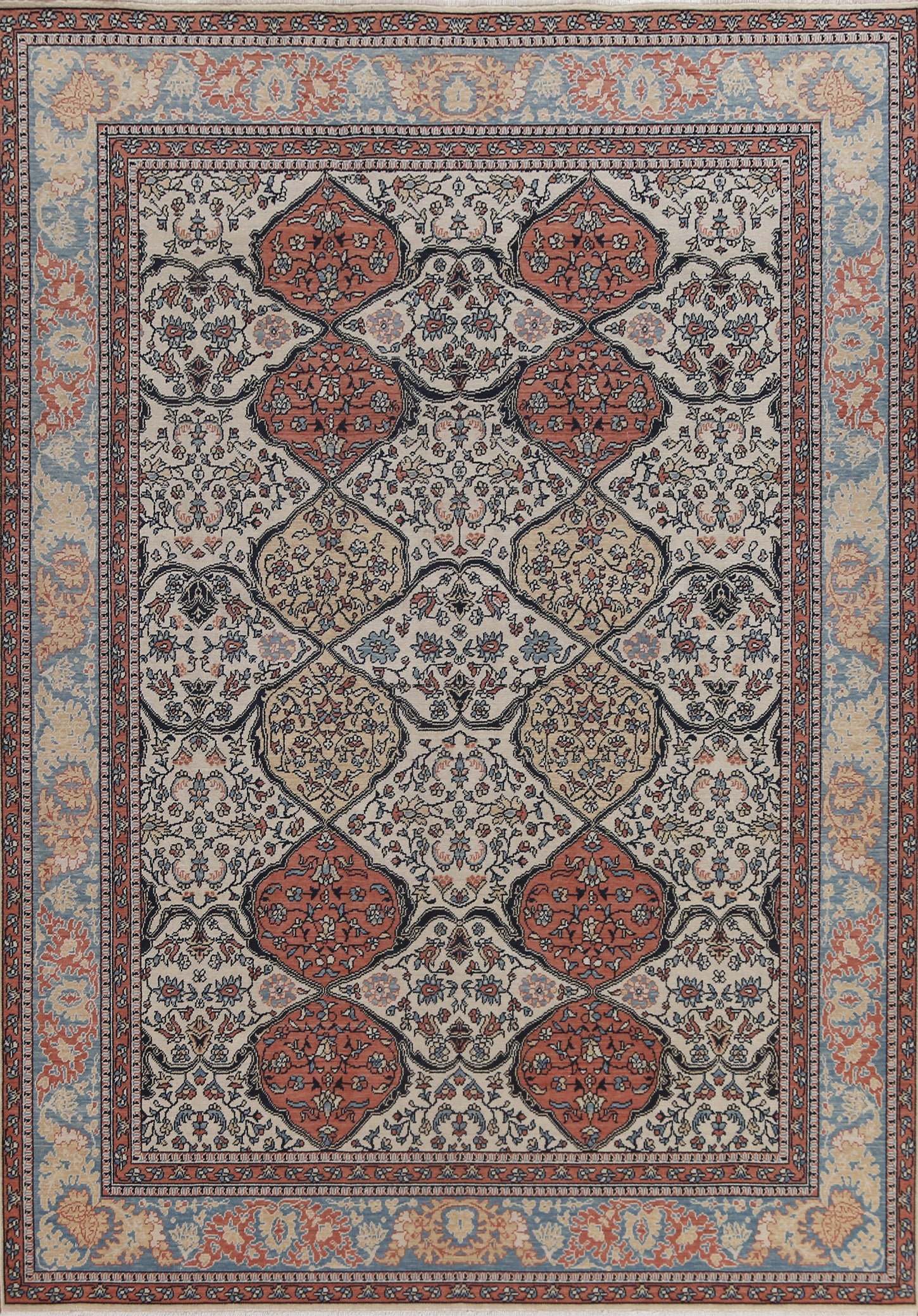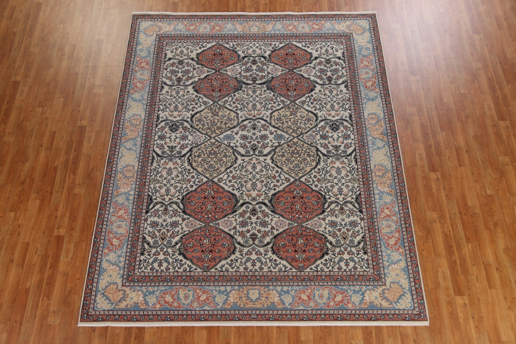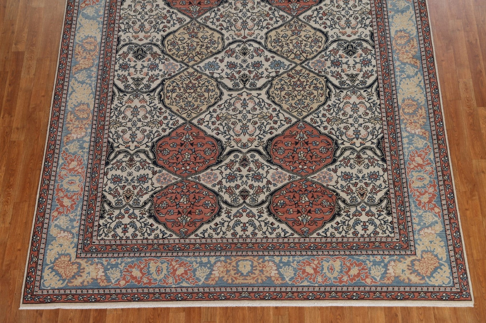 A Beautiful Genuine Turkey Bakhtiari rug is Hand Knotted by skillful weavers in Turkey with 100% Wool Material. This rug is in New, First Quality condition. dimensions are 9' 9'' X 7' 10'' in foot and 297 X 239 in centimeter. the primary color is Beige & Ivories.
