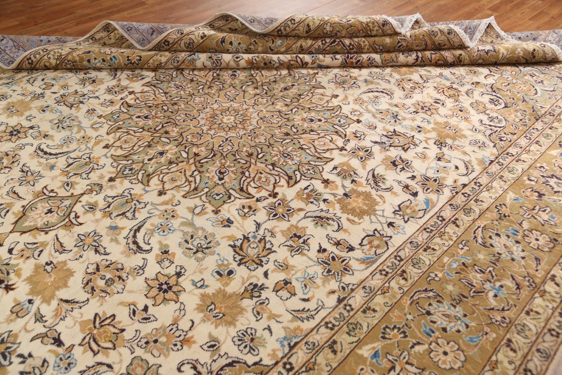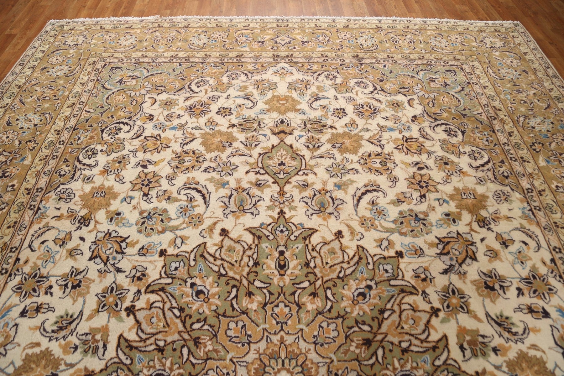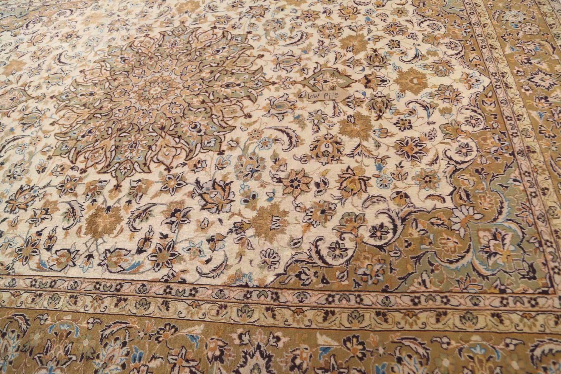 A Beautiful Genuine Persia ( Persia ) Kashan rug is Hand Knotted by skillful weavers in Persia ( Persia ) with 100% Wool Material. This rug is in Very Good ( Low Pile ) condition. dimensions are 13' 2'' X 9' 8'' in foot and 401 X 295 in centimeter. the primary color is Beige & Ivories.
