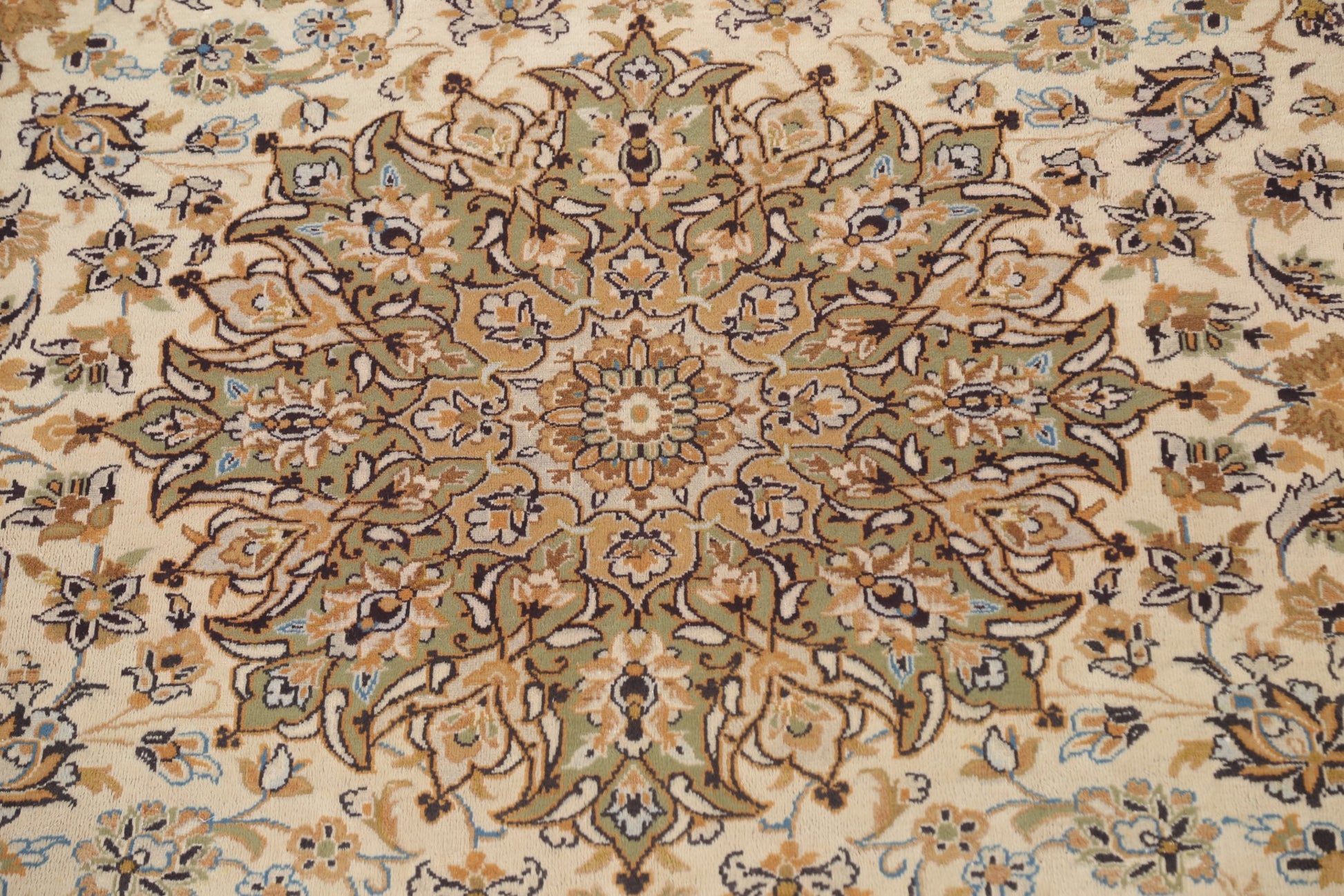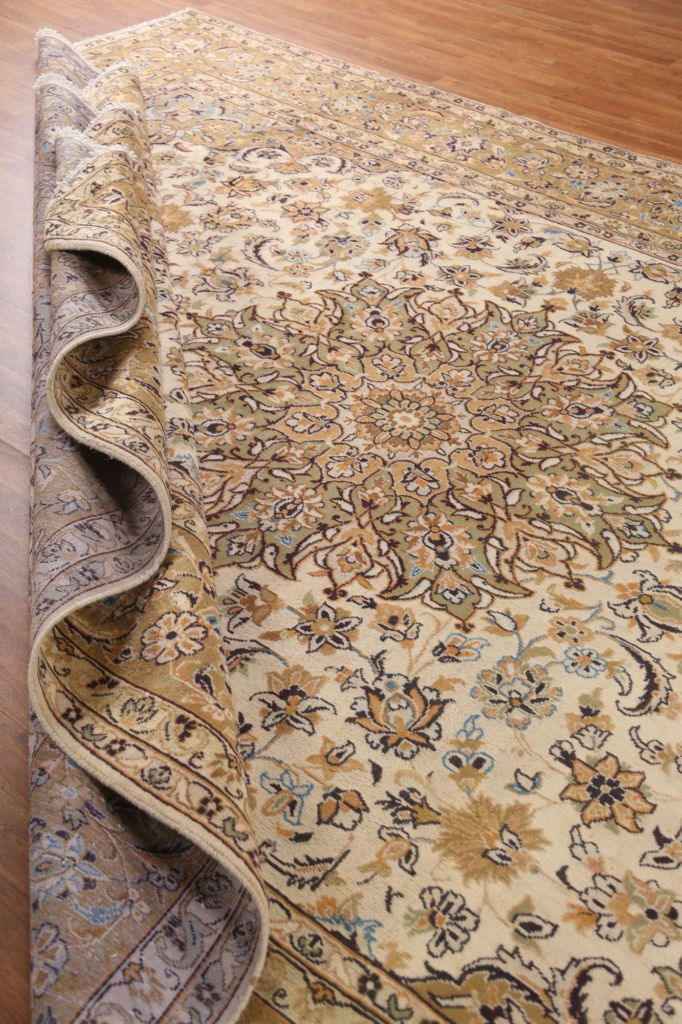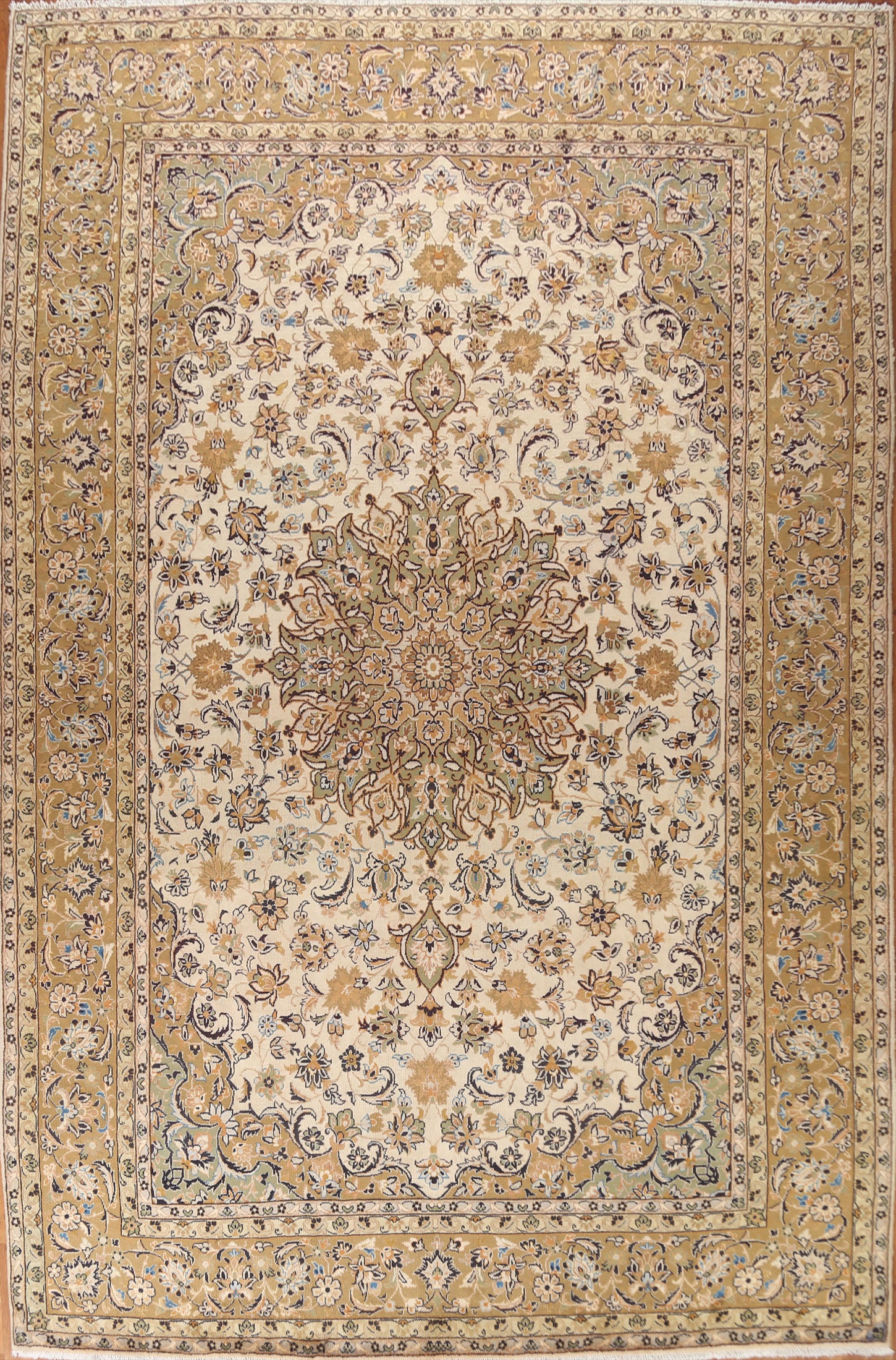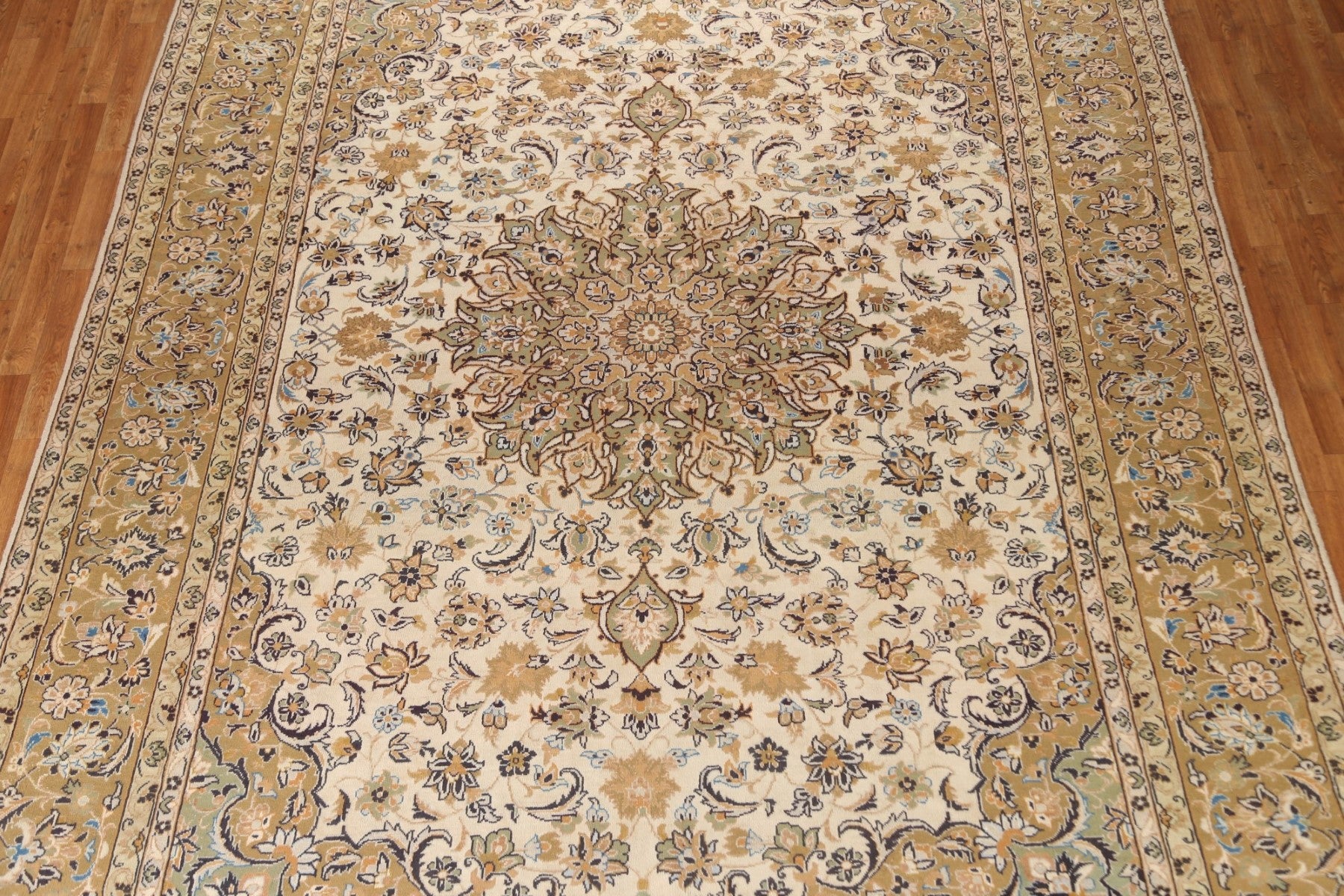 A Beautiful Genuine Persia ( Persia ) Kashan rug is Hand Knotted by skillful weavers in Persia ( Persia ) with 100% Wool Material. This rug is in Very Good ( Low Pile ) condition. dimensions are 13' 2'' X 9' 8'' in foot and 401 X 295 in centimeter. the primary color is Beige & Ivories.