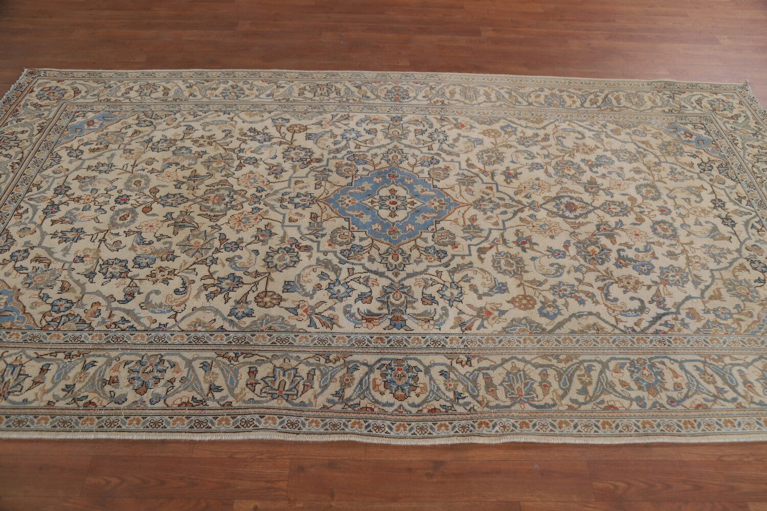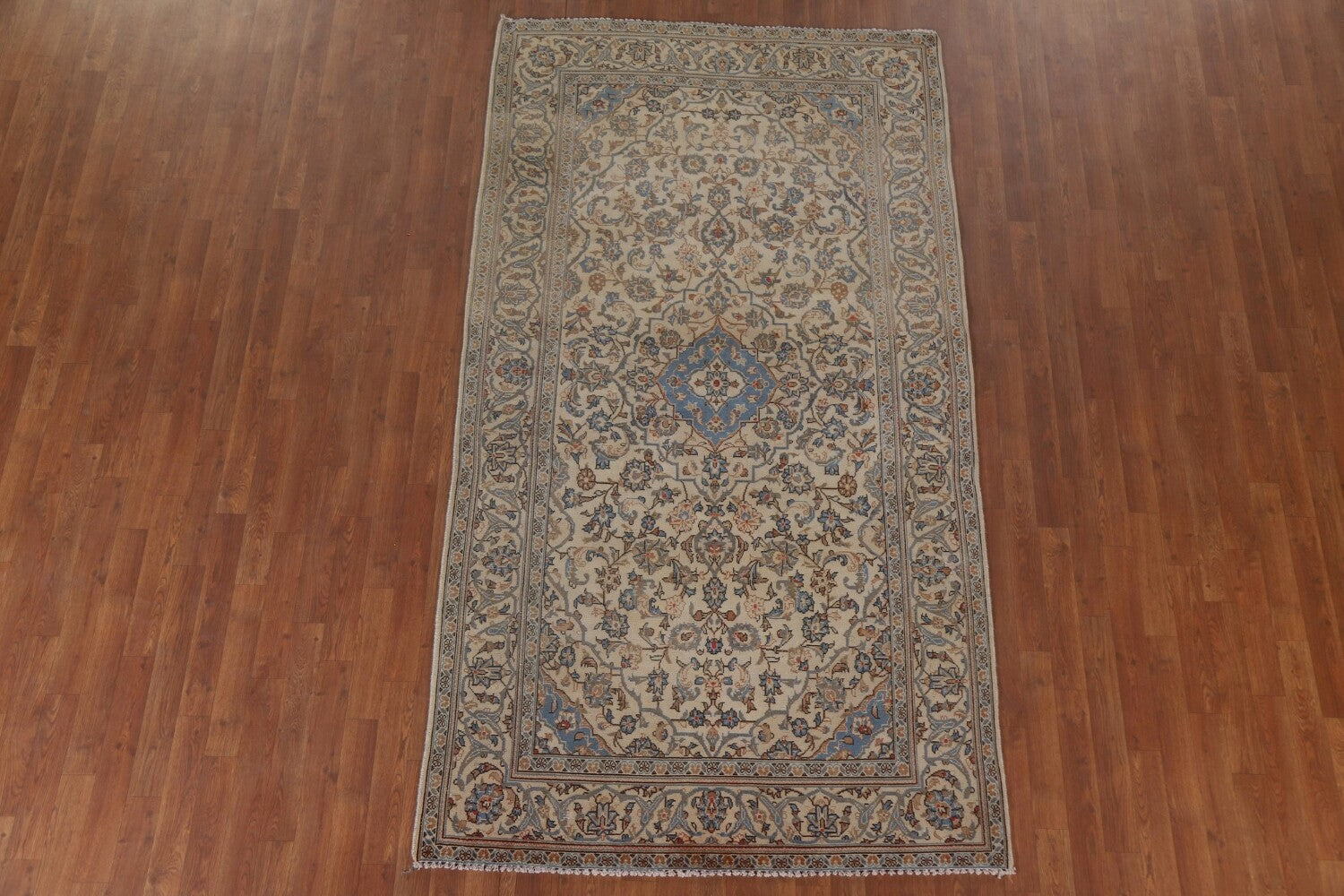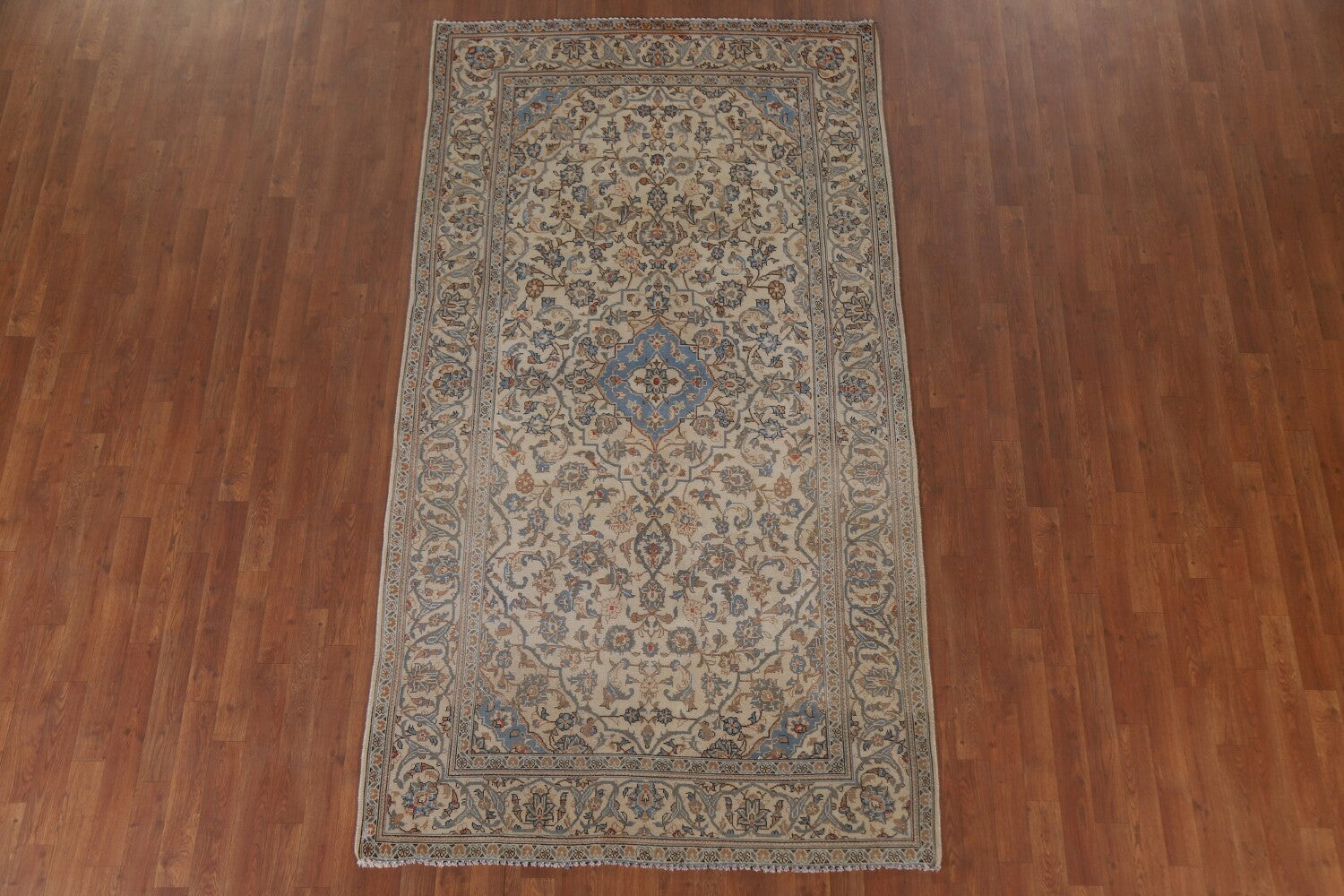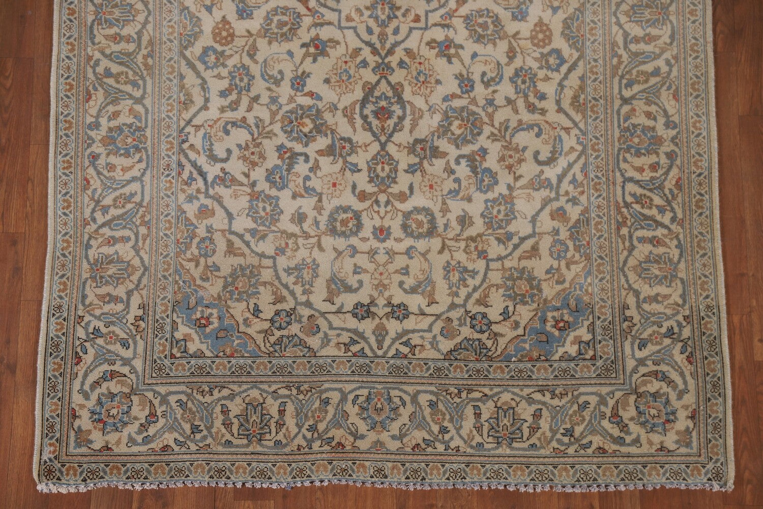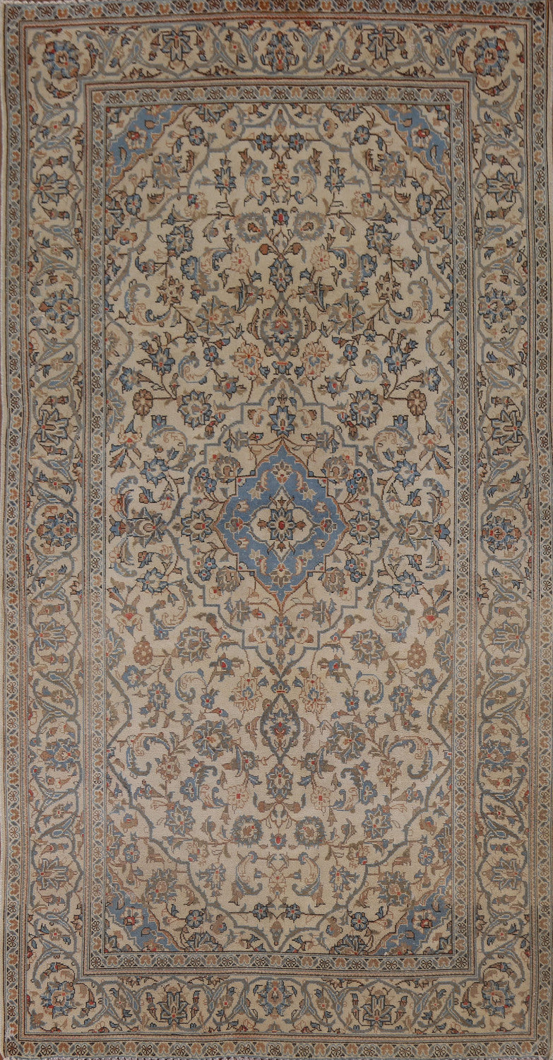 A Beautiful Genuine Persia ( Persia ) Kashan rug is Hand Knotted by skillful weavers in Persia ( Persia ) with 100% Wool Material. This rug is in Very Good (Low Pile-Abrash) condition. dimensions are 8' 9'' X 4' 9'' in foot and 267 X 145 in centimeter. the primary color is Beige & Ivories.