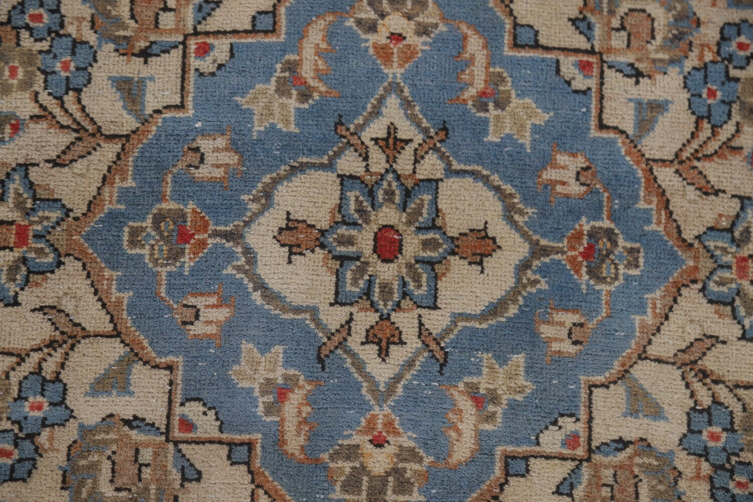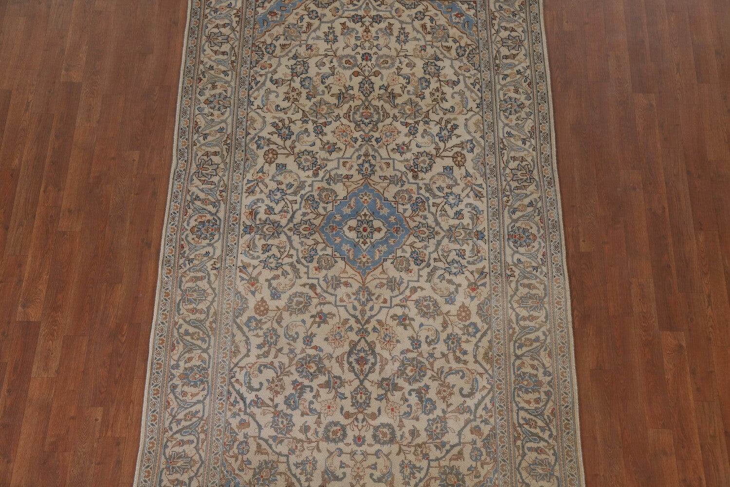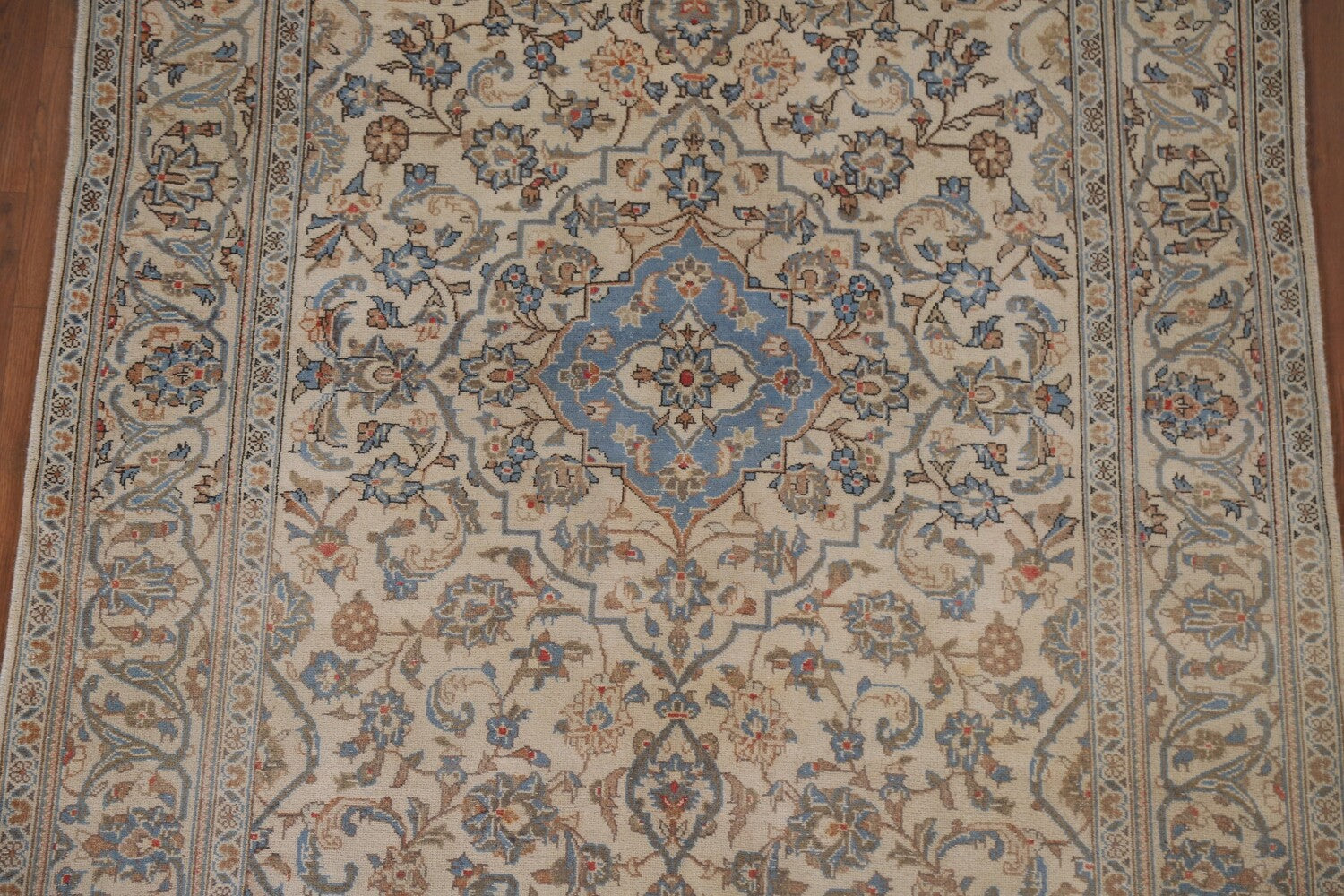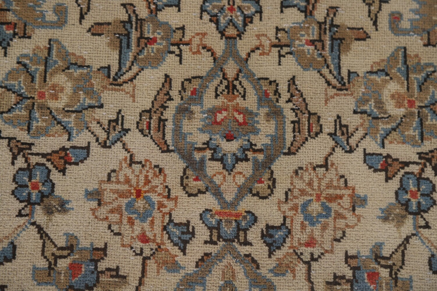 A Beautiful Genuine Persia ( Persia ) Kashan rug is Hand Knotted by skillful weavers in Persia ( Persia ) with 100% Wool Material. This rug is in Very Good (Low Pile-Abrash) condition. dimensions are 8' 9'' X 4' 9'' in foot and 267 X 145 in centimeter. the primary color is Beige & Ivories.