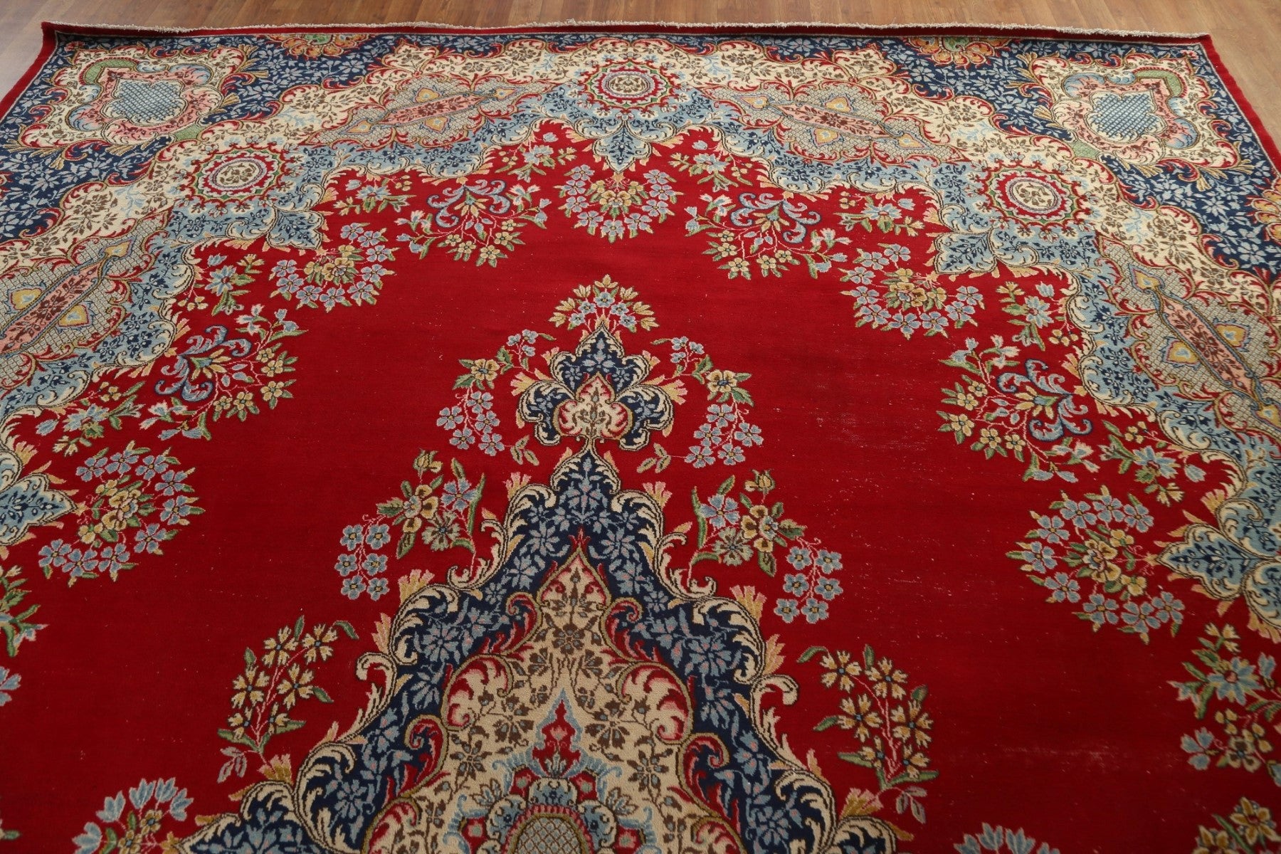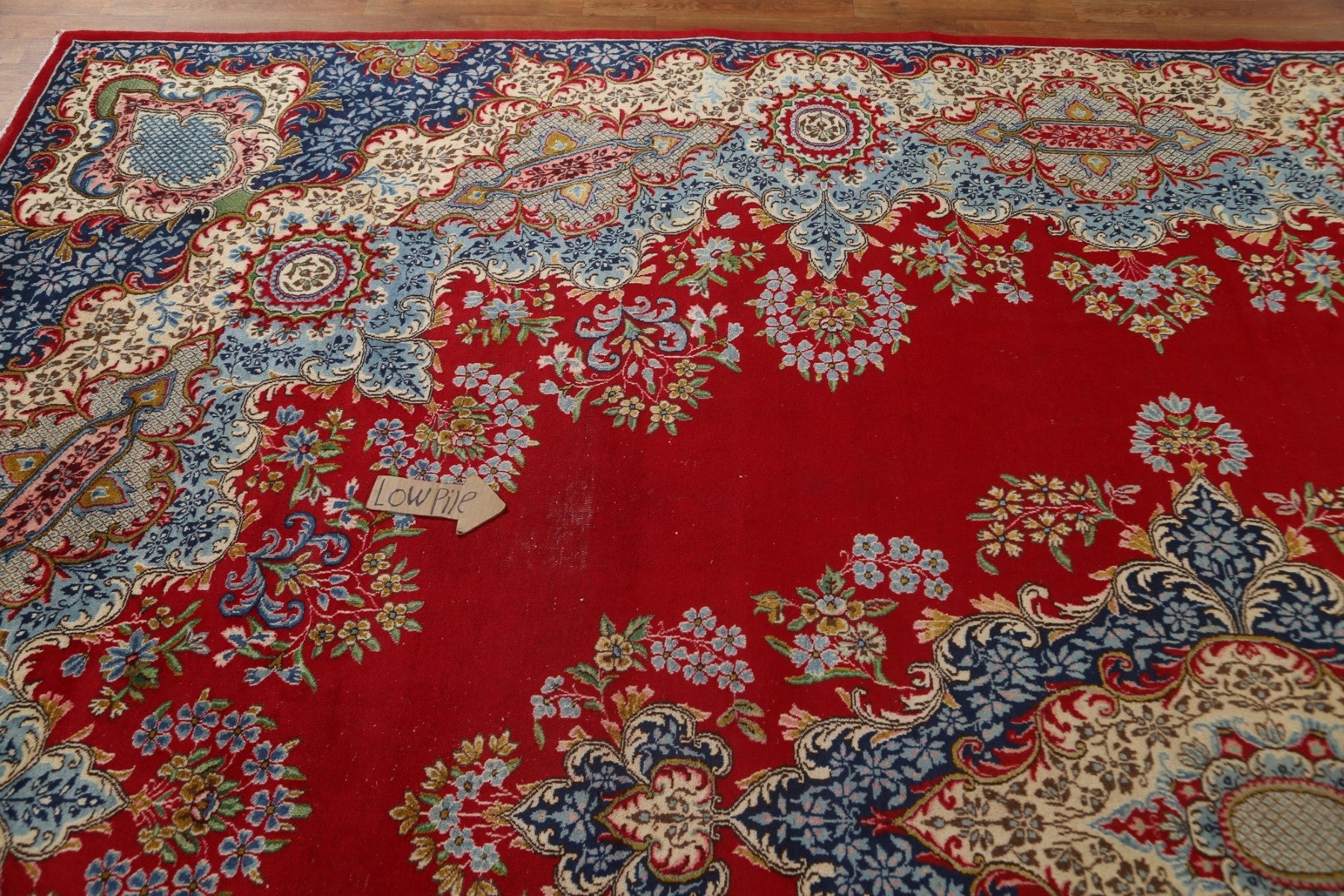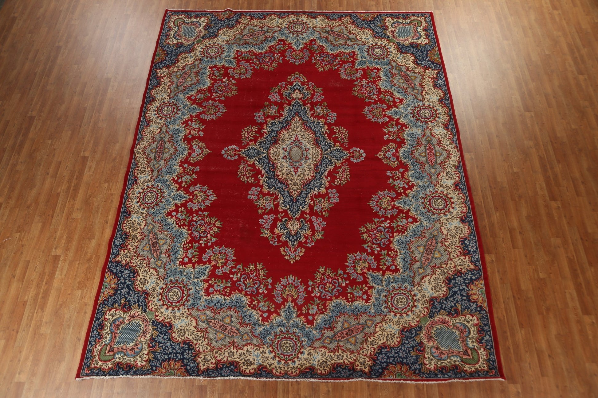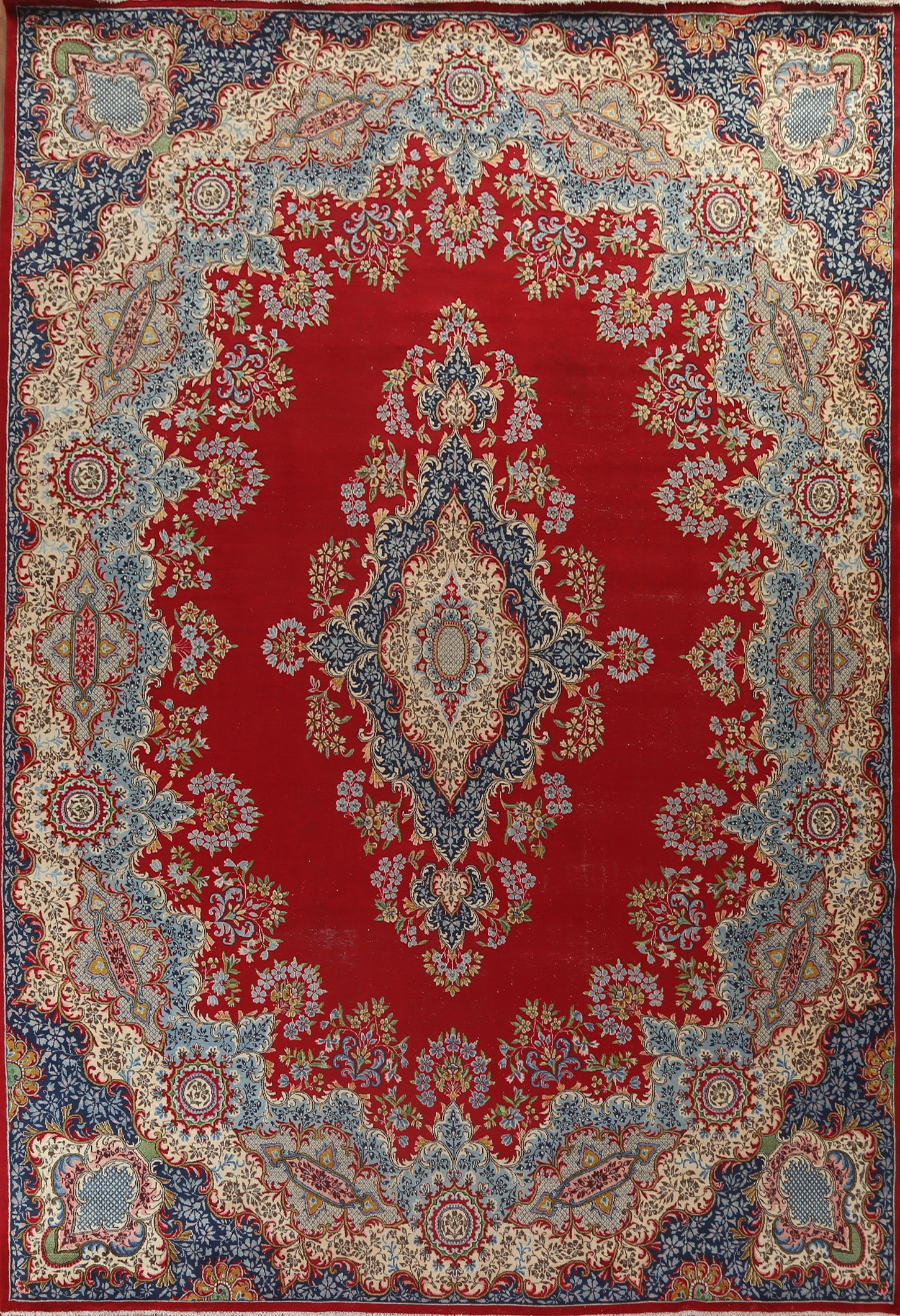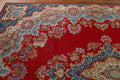 A Beautiful Genuine Persia ( Persia ) Kerman rug is Hand Knotted by skillful weavers in Persia ( Persia ) with 100% Wool Material. This rug is in Very Good (Low Pile) condition. dimensions are 13' 2'' X 10' 1'' in foot and 401 X 307 in centimeter. the primary color is Red.