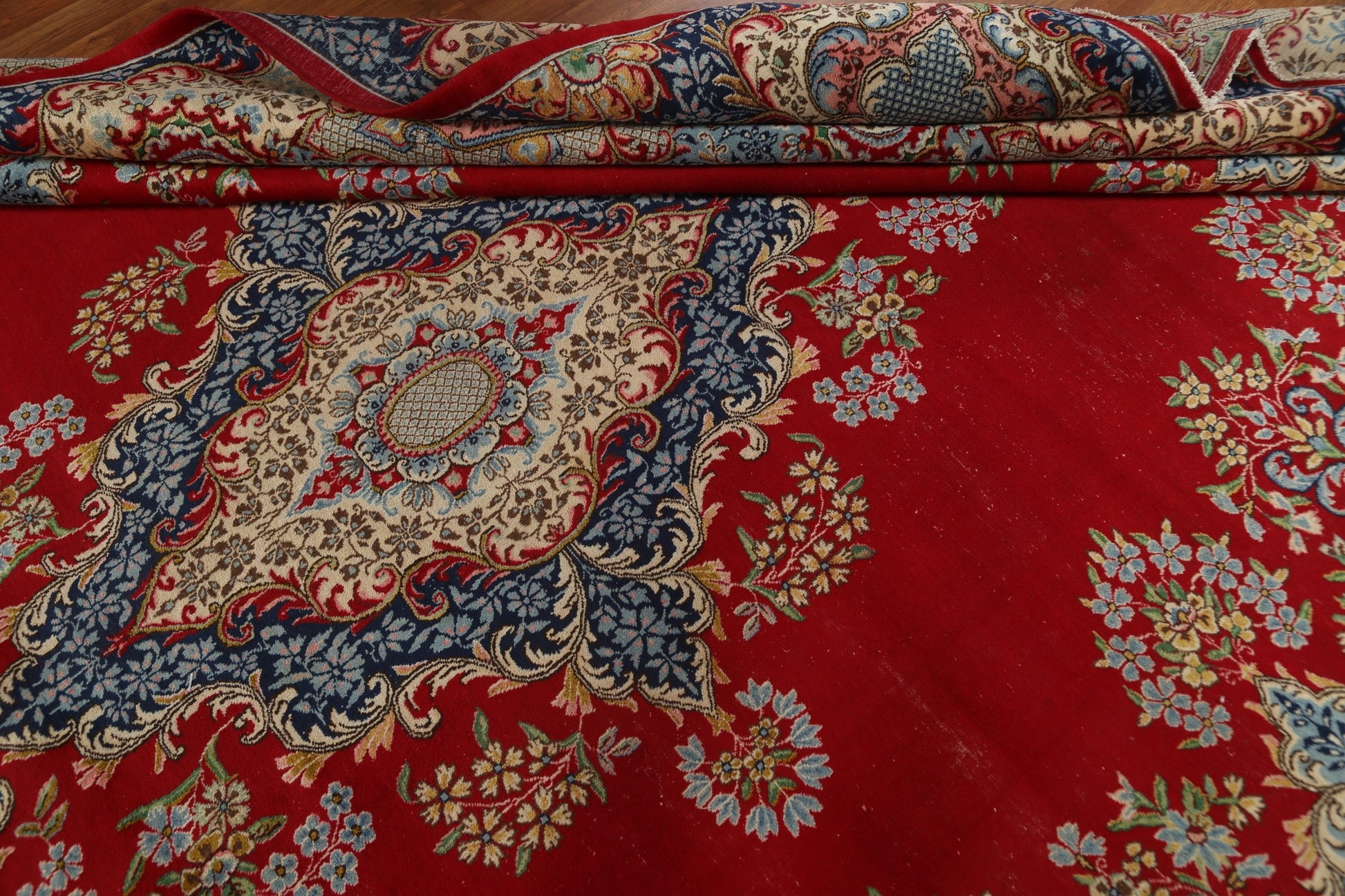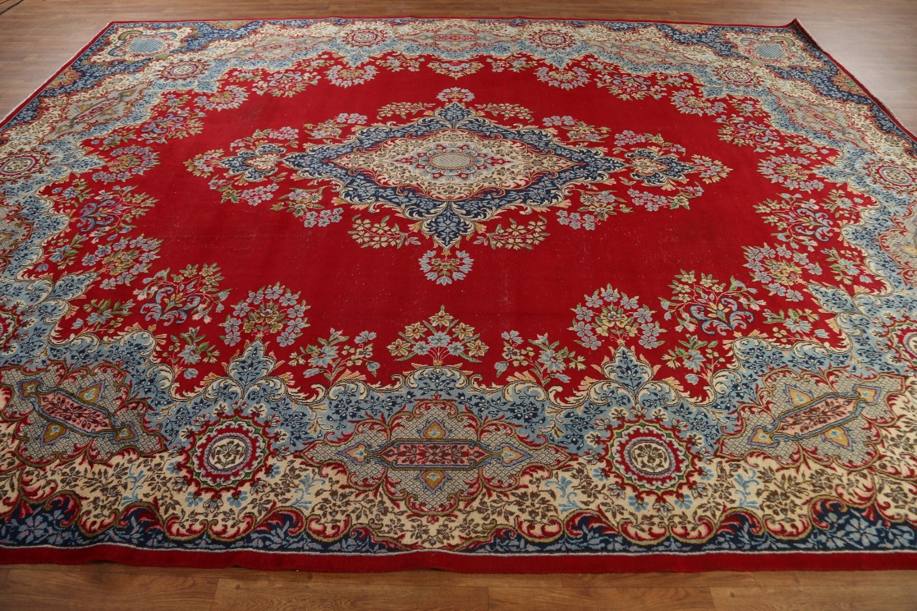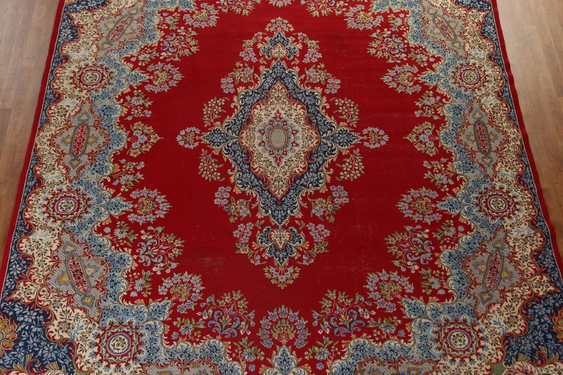 A Beautiful Genuine Persia ( Persia ) Kerman rug is Hand Knotted by skillful weavers in Persia ( Persia ) with 100% Wool Material. This rug is in Very Good (Low Pile) condition. dimensions are 13' 2'' X 10' 1'' in foot and 401 X 307 in centimeter. the primary color is Red.