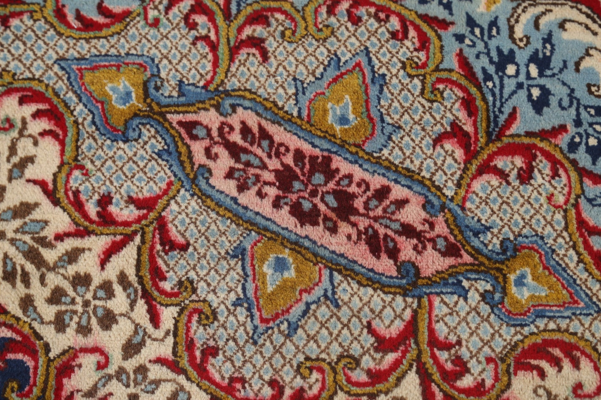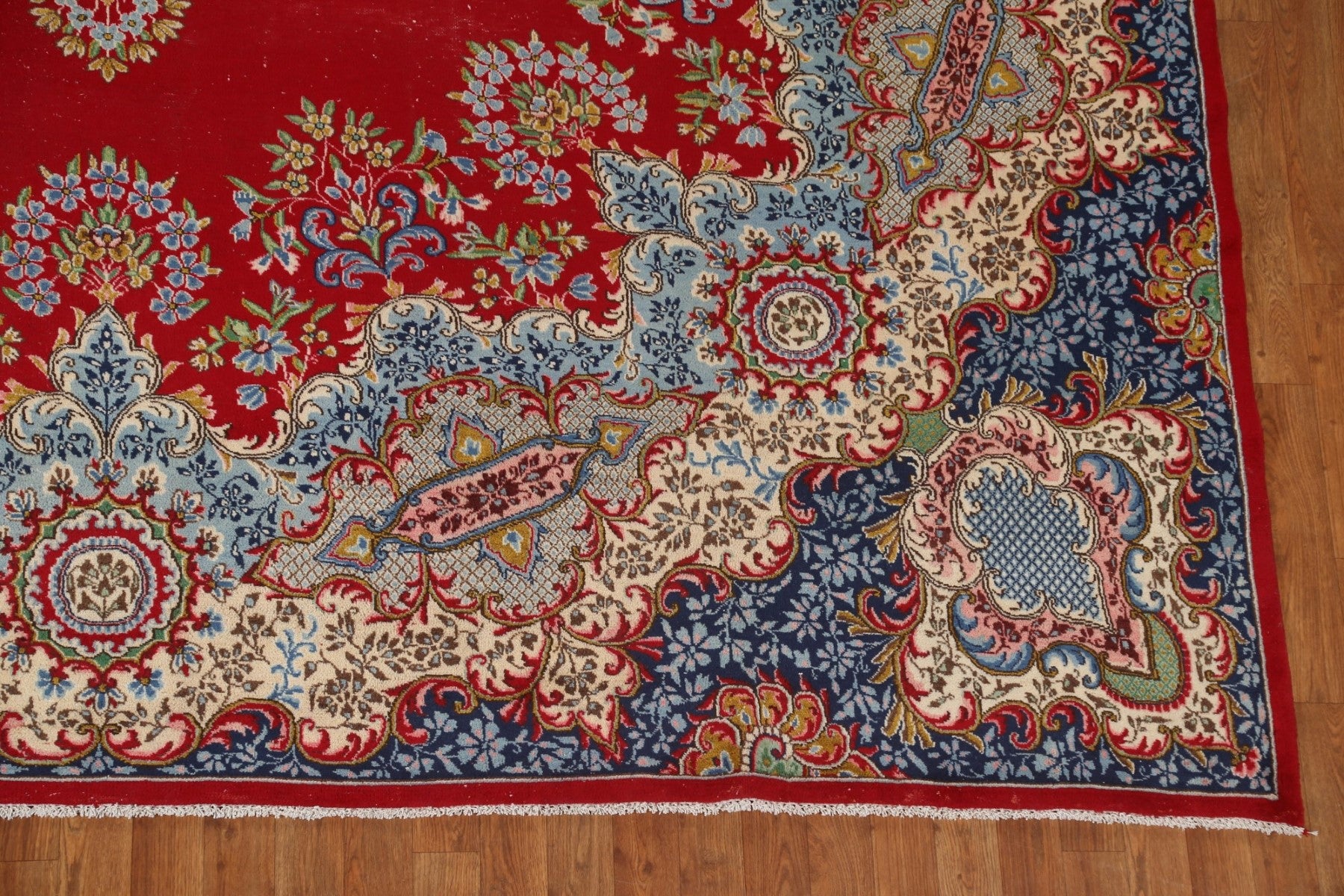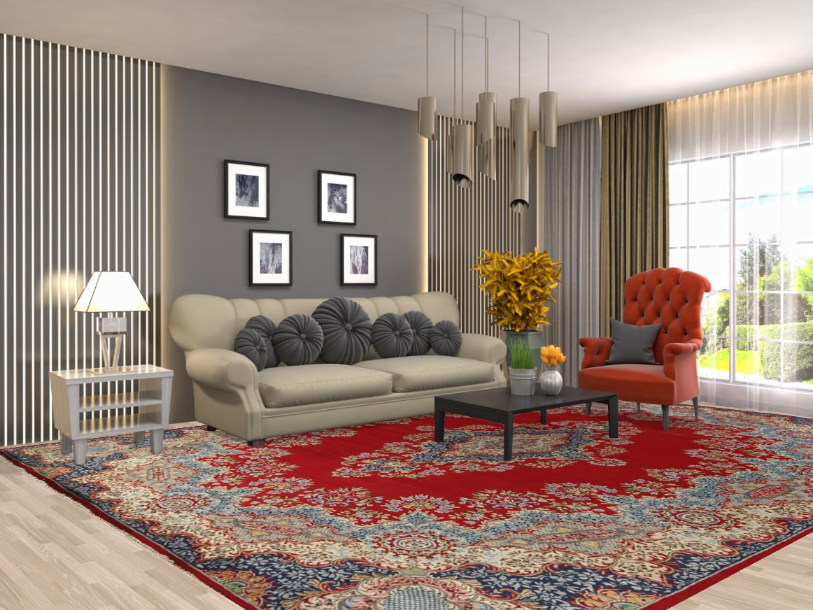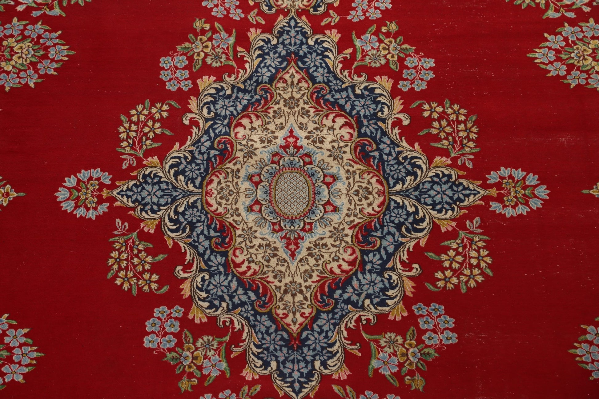 A Beautiful Genuine Persia ( Persia ) Kerman rug is Hand Knotted by skillful weavers in Persia ( Persia ) with 100% Wool Material. This rug is in Very Good (Low Pile) condition. dimensions are 13' 2'' X 10' 1'' in foot and 401 X 307 in centimeter. the primary color is Red.