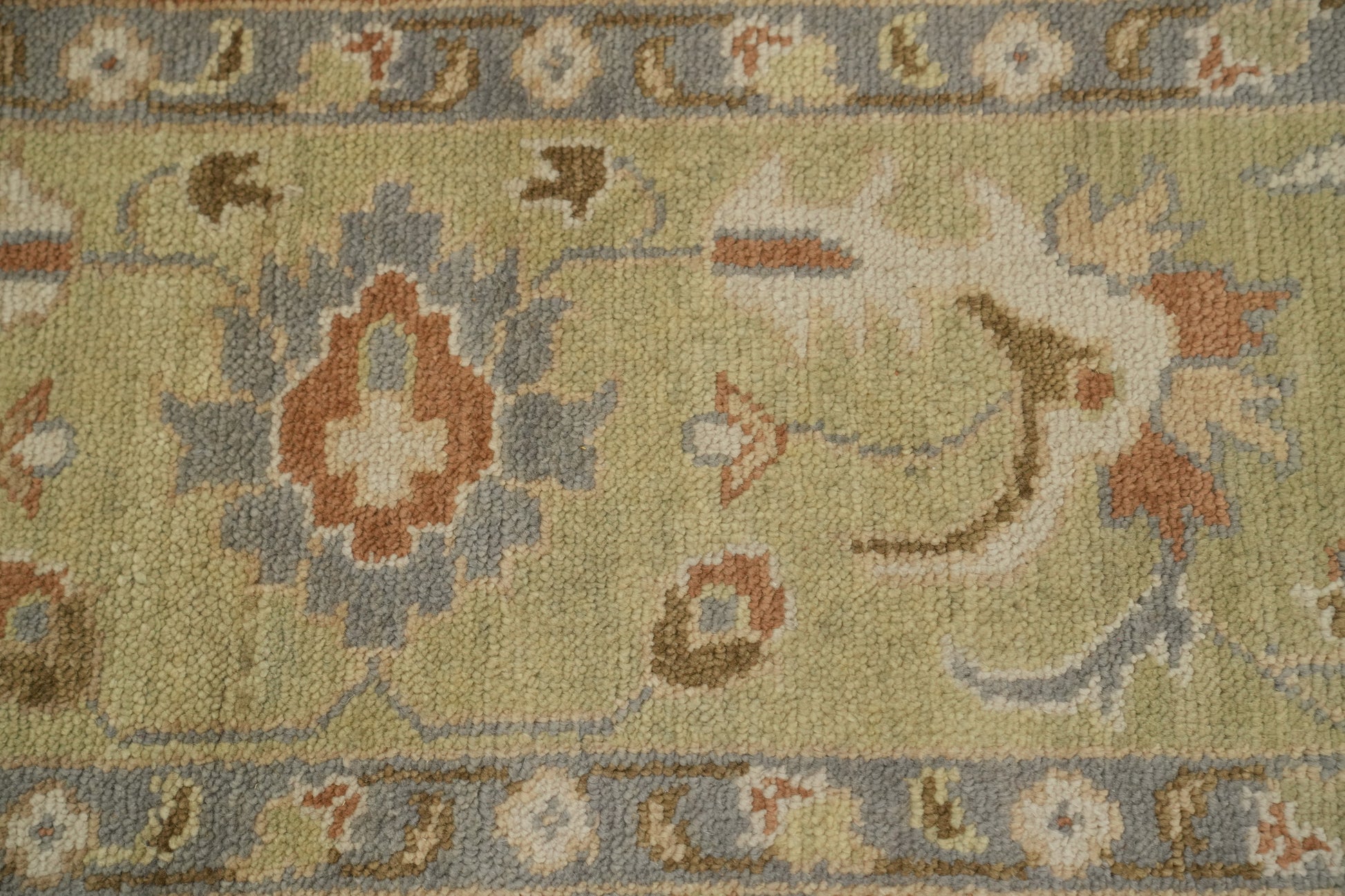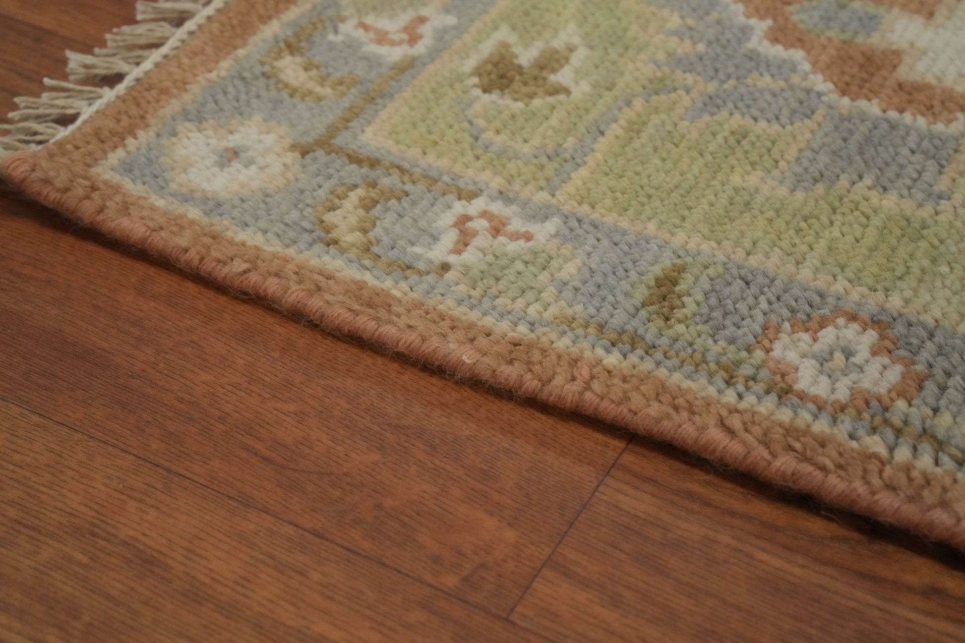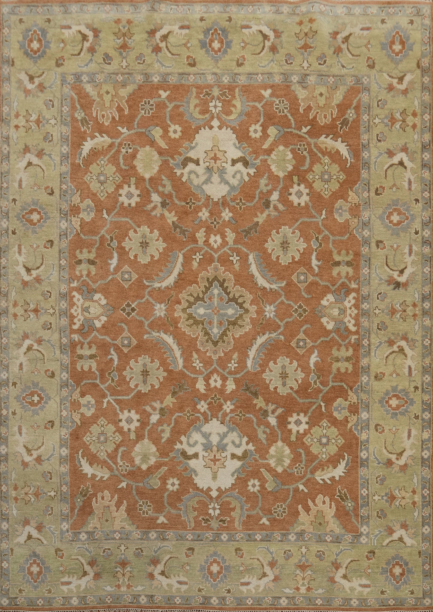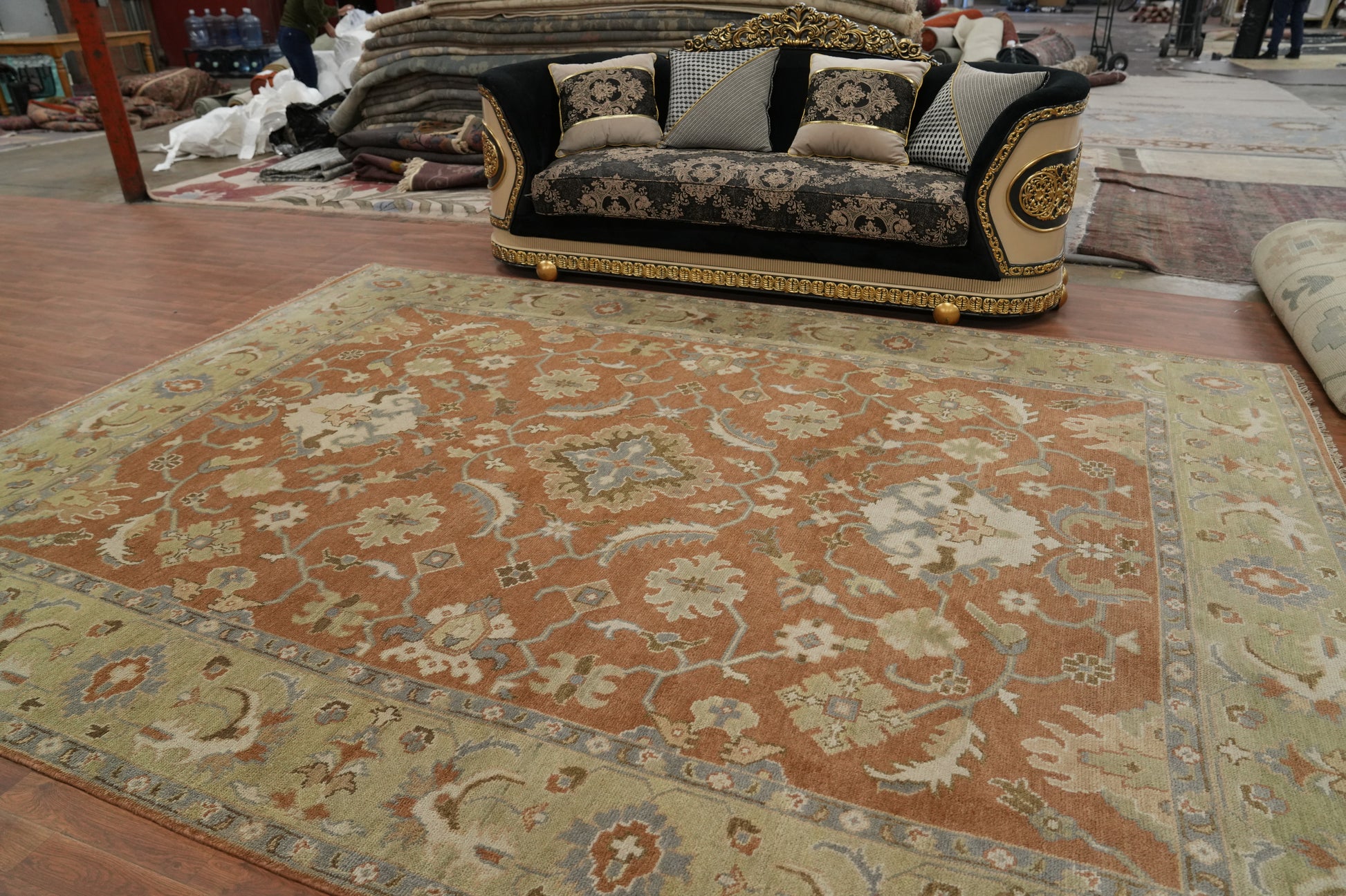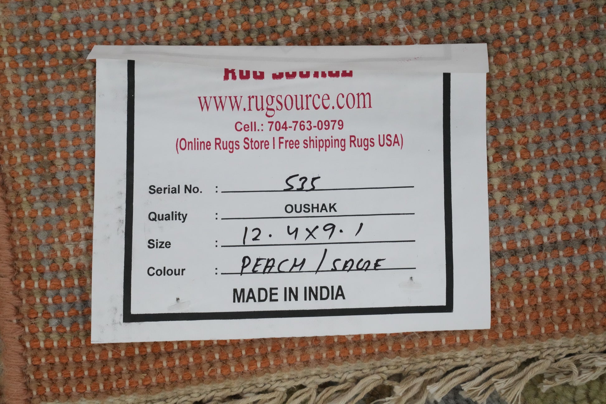 A Beautiful Genuine India Oushak rug is Hand Knotted by skillful weavers in India with 100% Wool Material. This rug is in New, First Quality condition. dimensions are 12' 4'' X 9' 1'' in foot and  376 X 277 in centimeter. the primary color is Oranges & Rust.