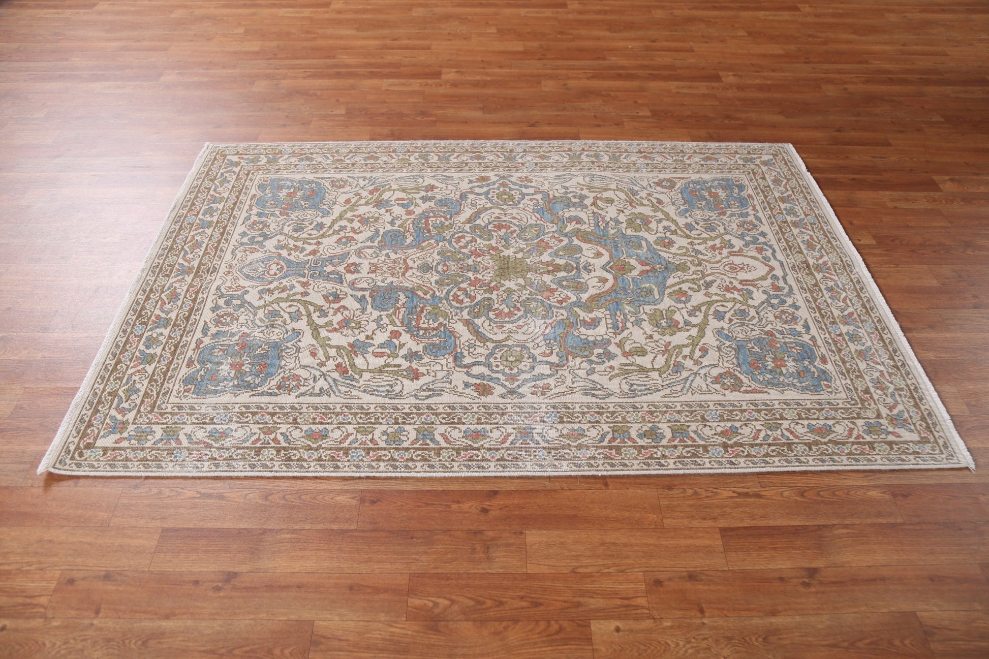 A Beautiful Genuine Turkey Oushak rug is Hand Knotted by skillful weavers in Turkey with 100% Wool Material. This rug is in New, First Quality condition. dimensions are 5' 10'' X 3' 11'' in foot and 178 X 119 in centimeter. the primary color is Beige & Ivories.