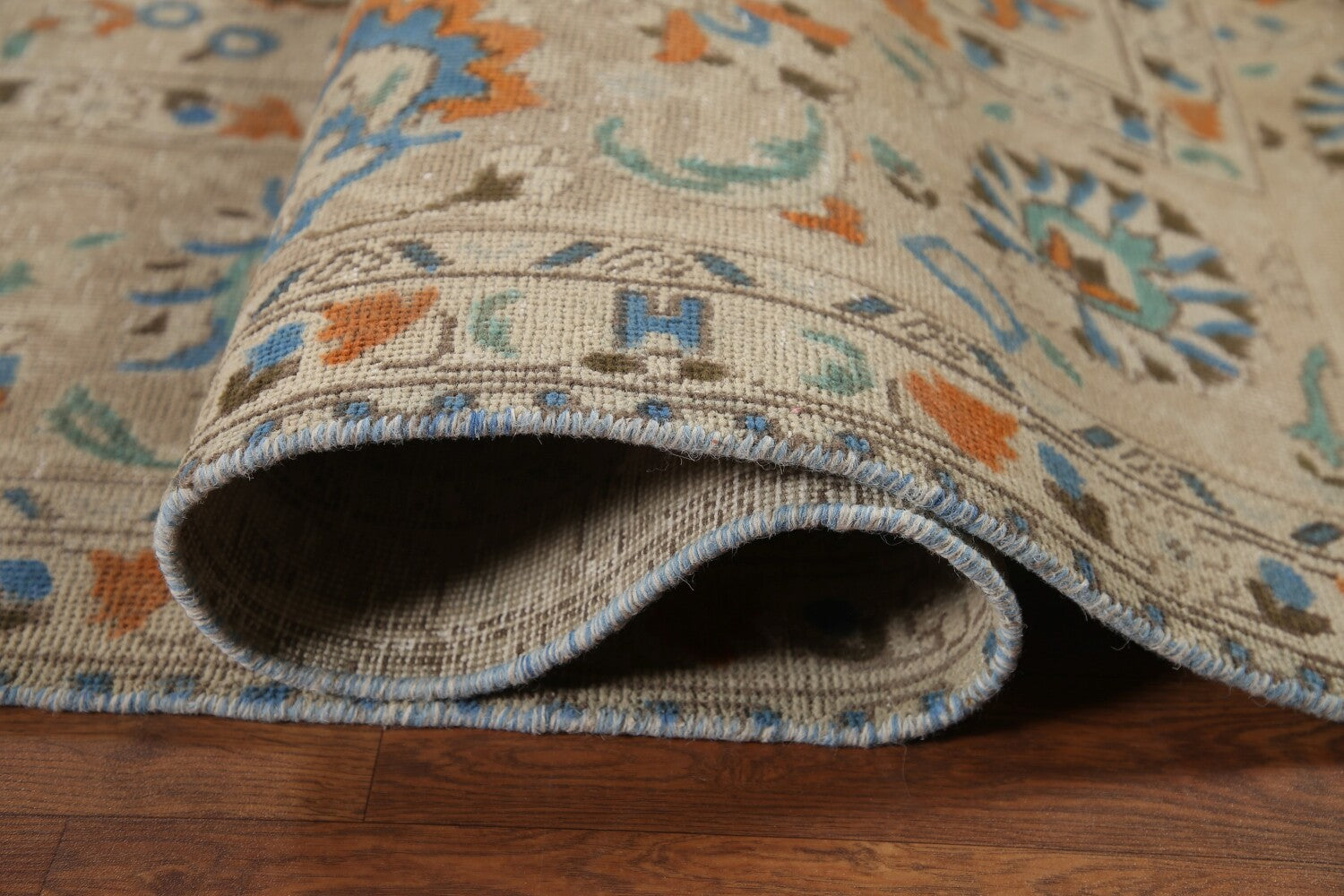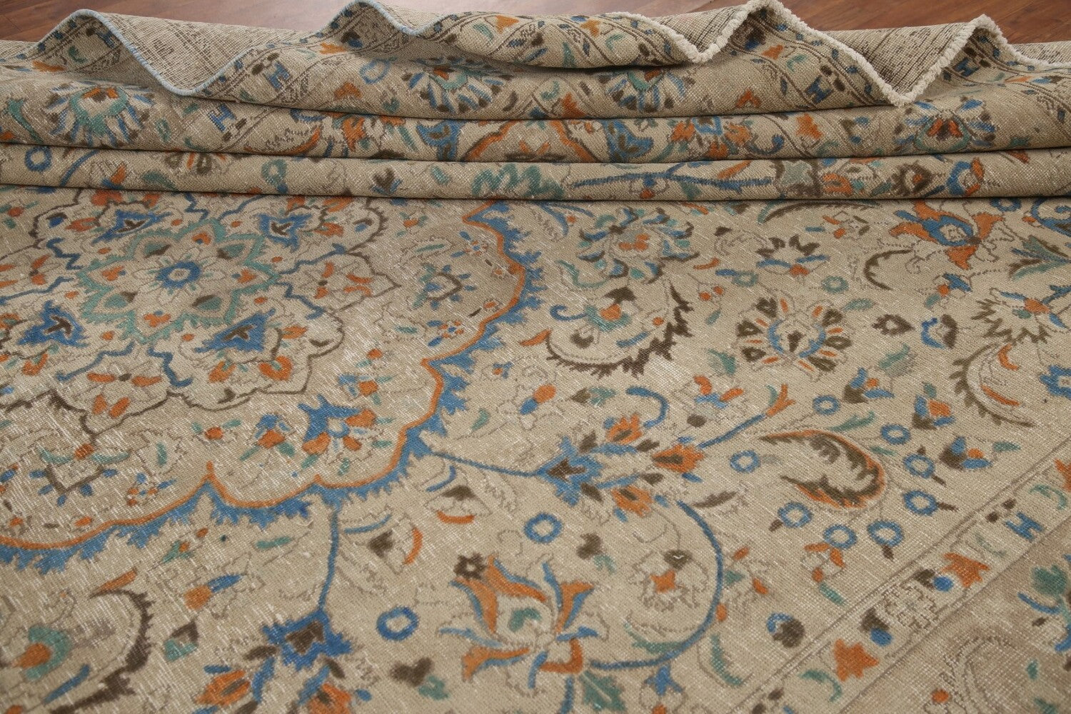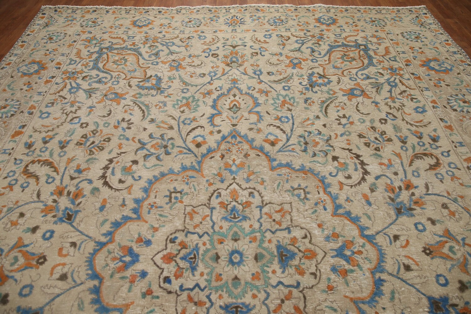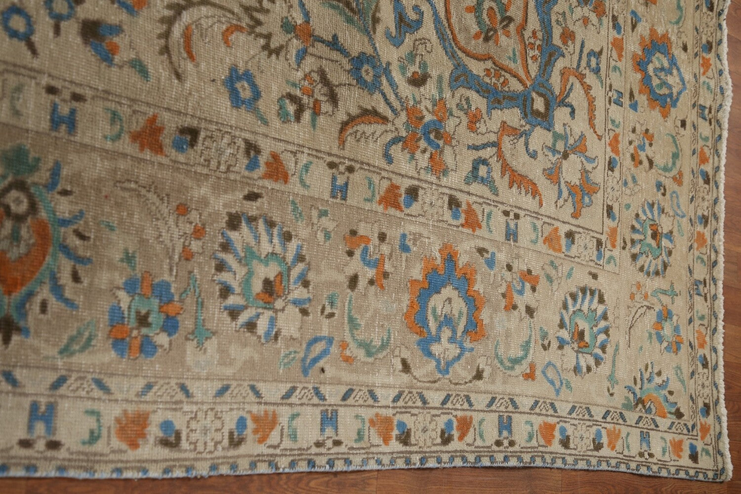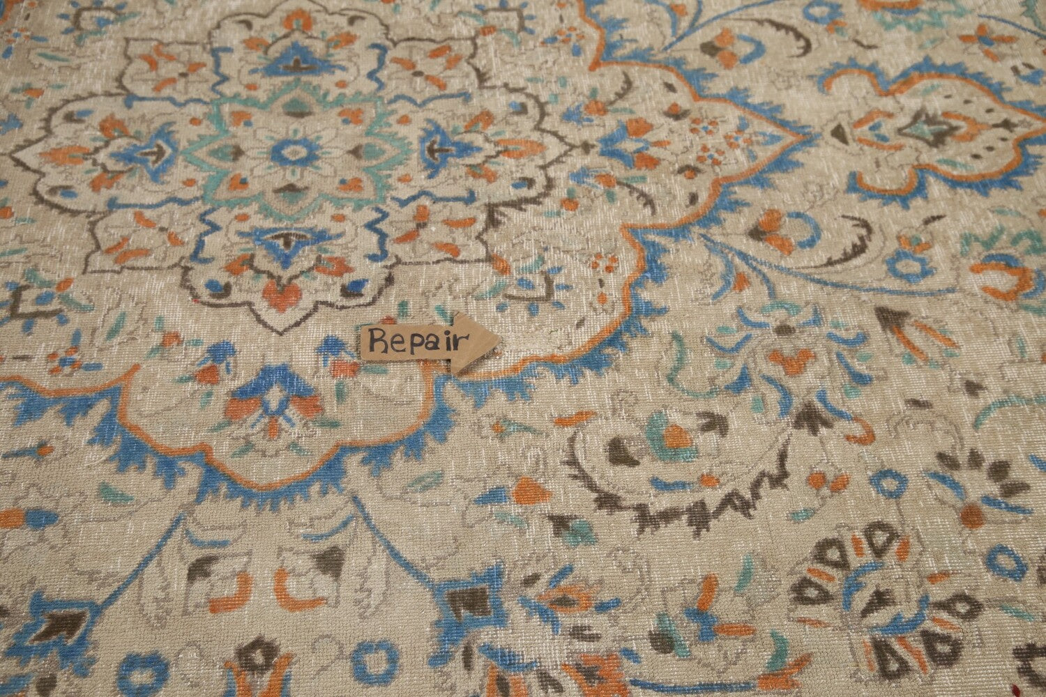 A Beautiful Genuine Persia ( Persia ) Tabriz rug is Hand Knotted by skillful weavers in Persia ( Persia ) with 100% Wool Material. This rug is in Very Good ( Low Pile- Repair) condition. dimensions are 13' 1'' X 9' 9'' in foot and 399 X 297 in centimeter. the primary color is Beige & Ivories.