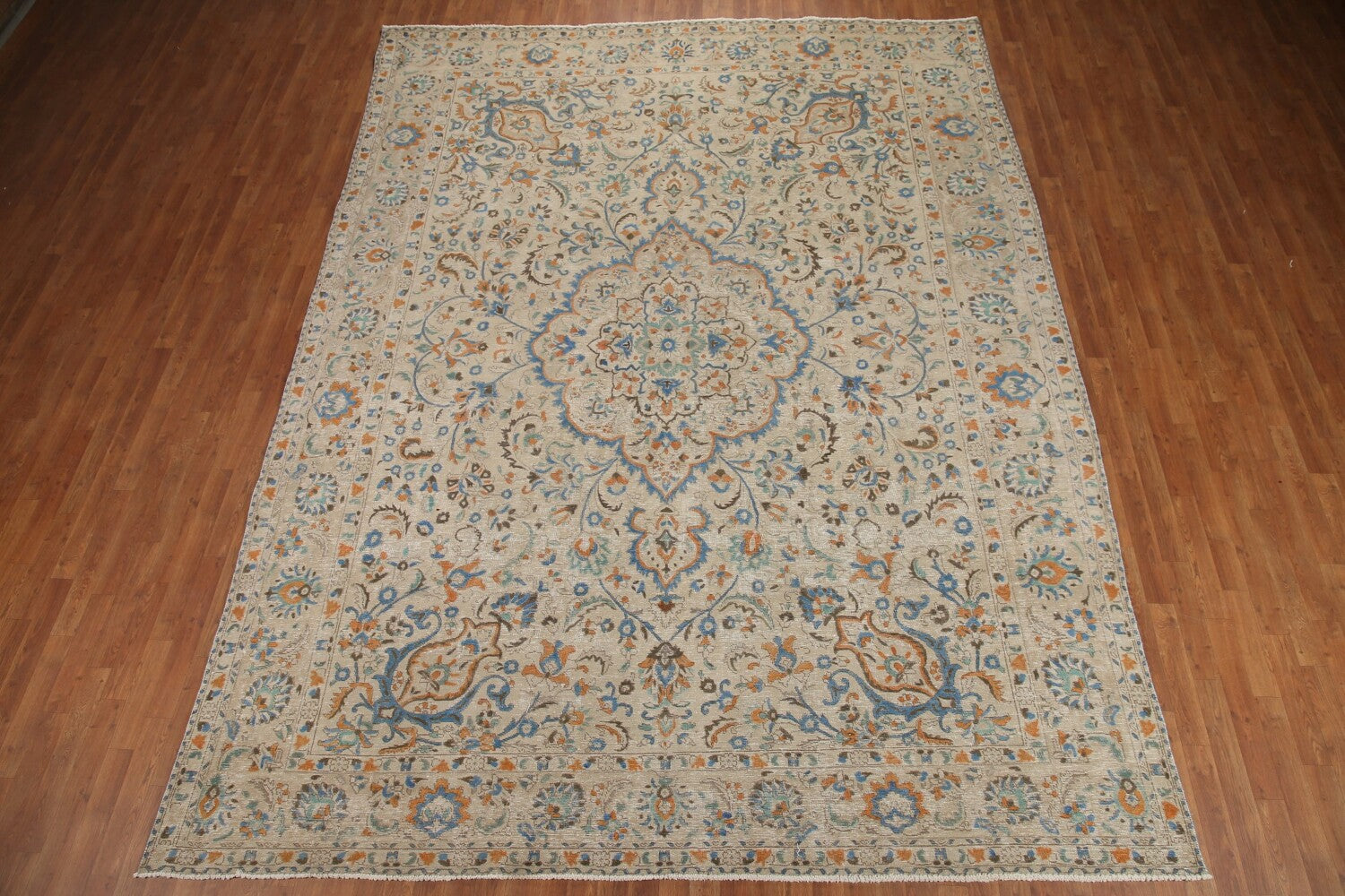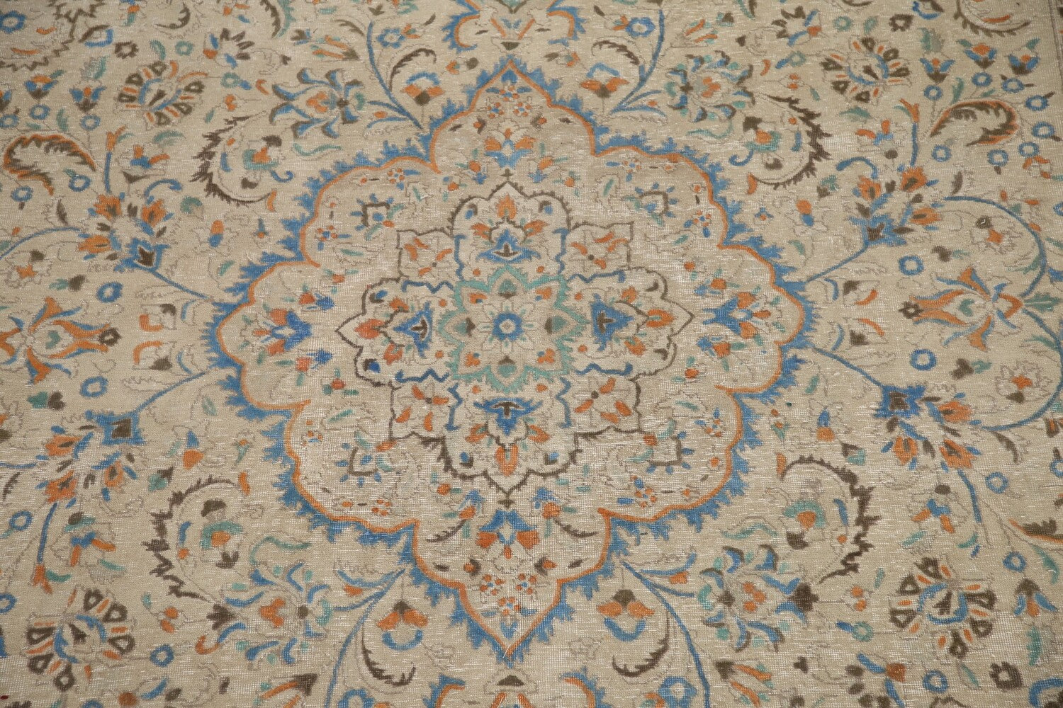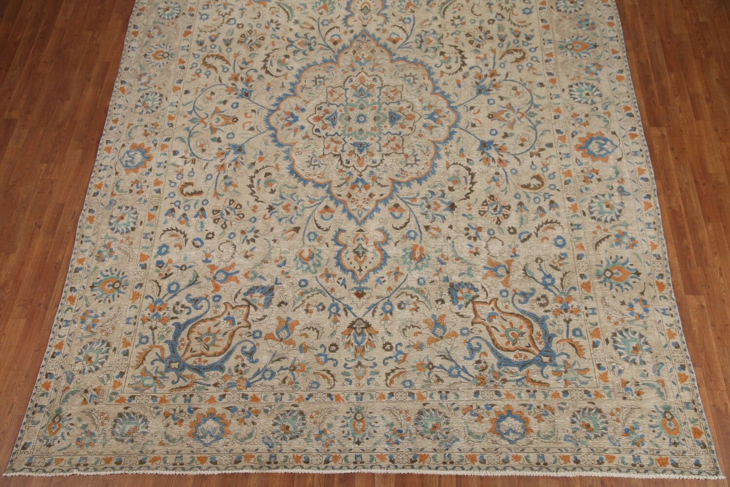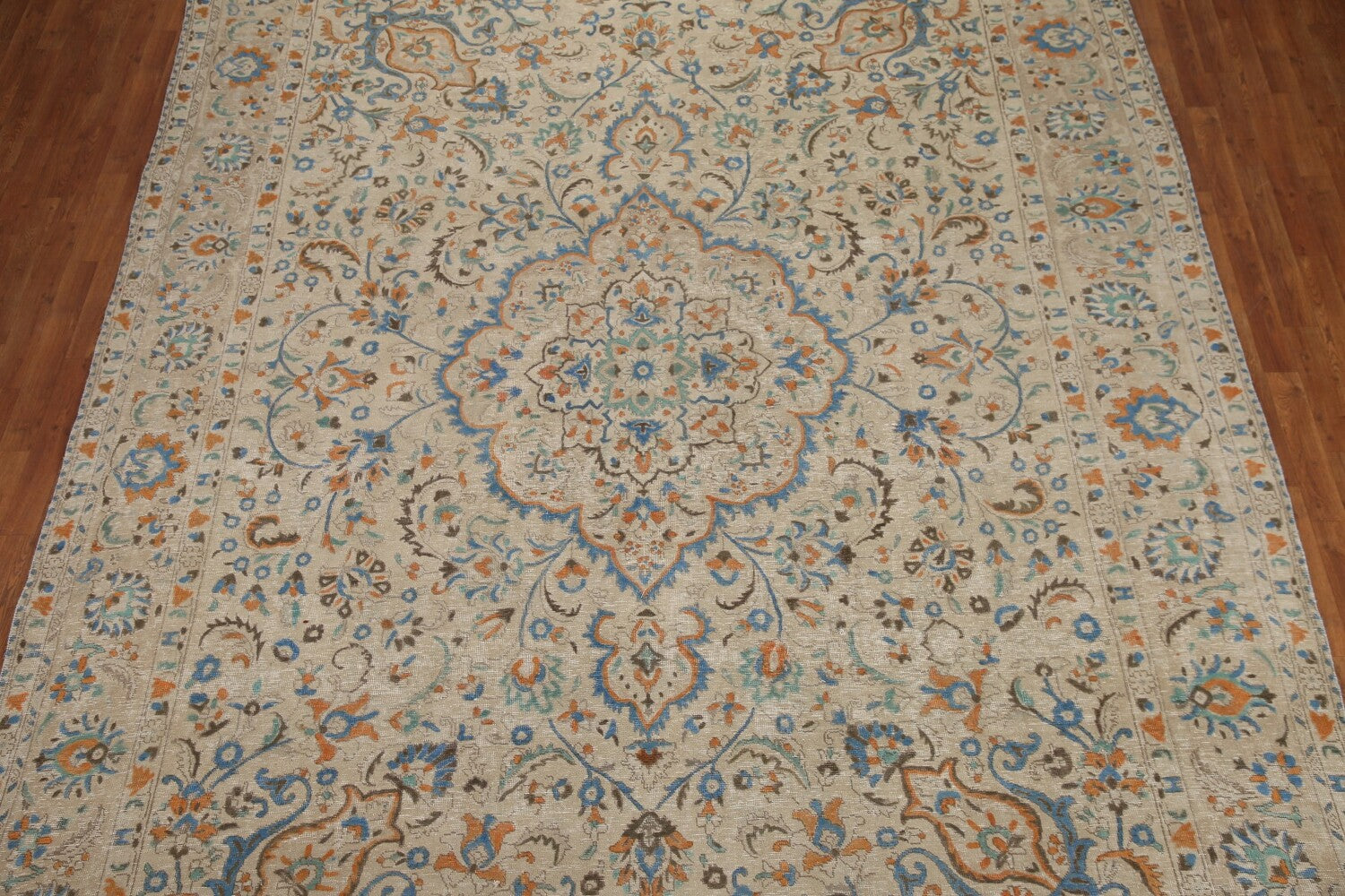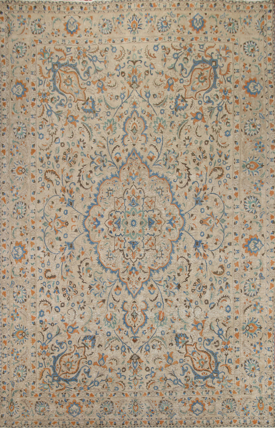 A Beautiful Genuine Persia ( Persia ) Tabriz rug is Hand Knotted by skillful weavers in Persia ( Persia ) with 100% Wool Material. This rug is in Very Good ( Low Pile- Repair) condition. dimensions are 13' 1'' X 9' 9'' in foot and 399 X 297 in centimeter. the primary color is Beige & Ivories.