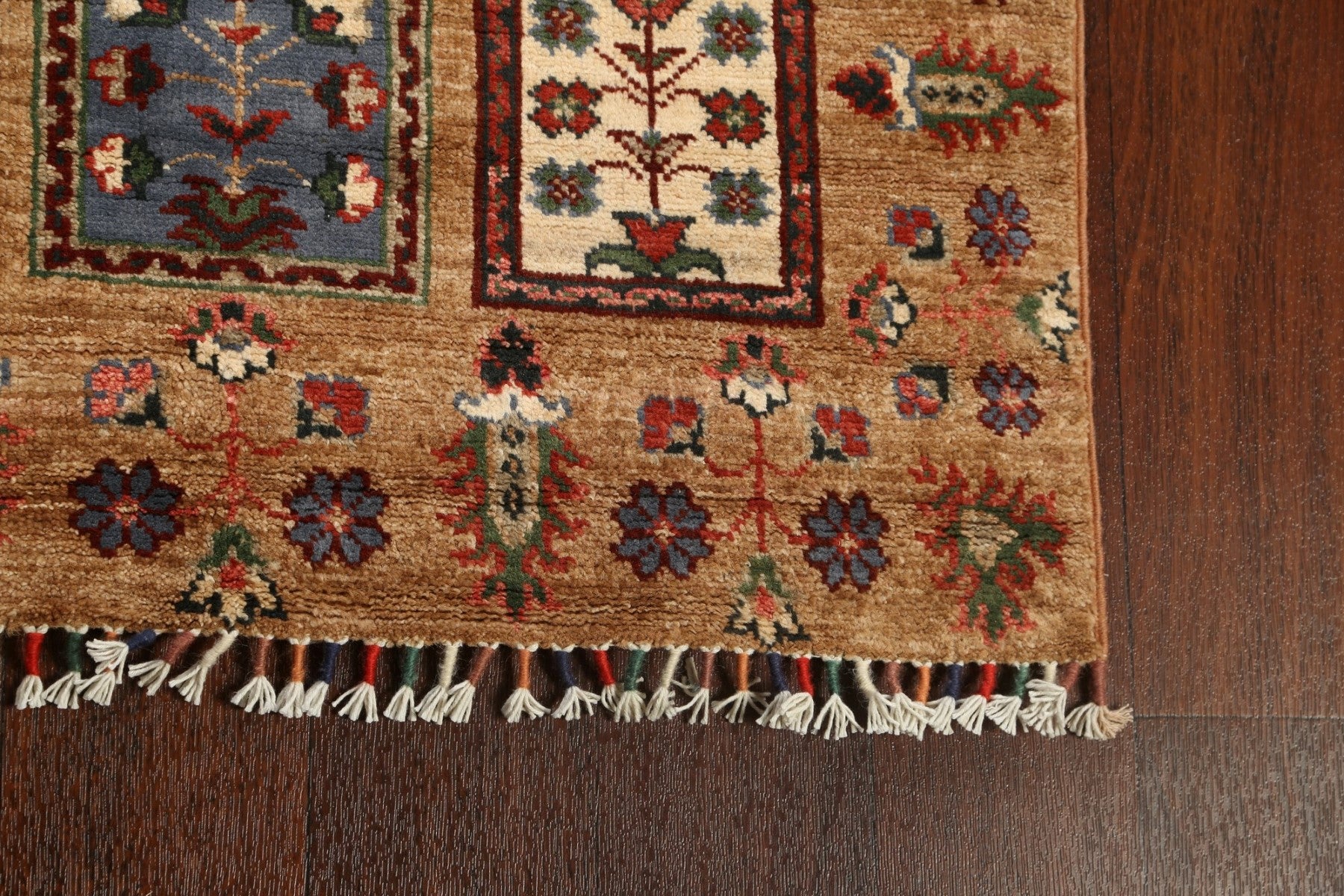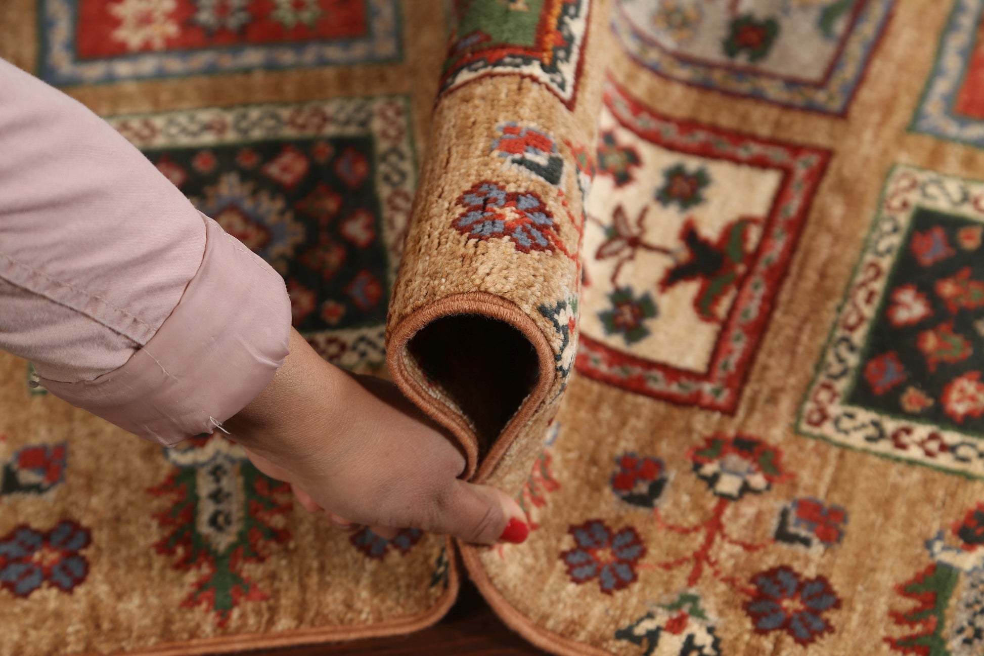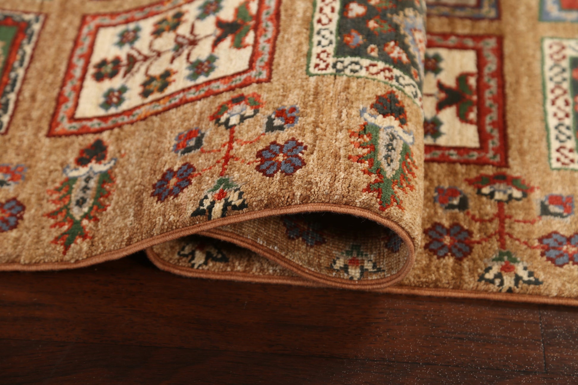 A Beautiful Genuine Pakistan Kazak rug is Hand Knotted by skillful weavers in Pakistan with 100% Wool Material. This rug is in New, First Quality condition. dimensions are 9' 7'' X 2' 7'' in foot and 292 X 79 in centimeter. the primary color is Brown.