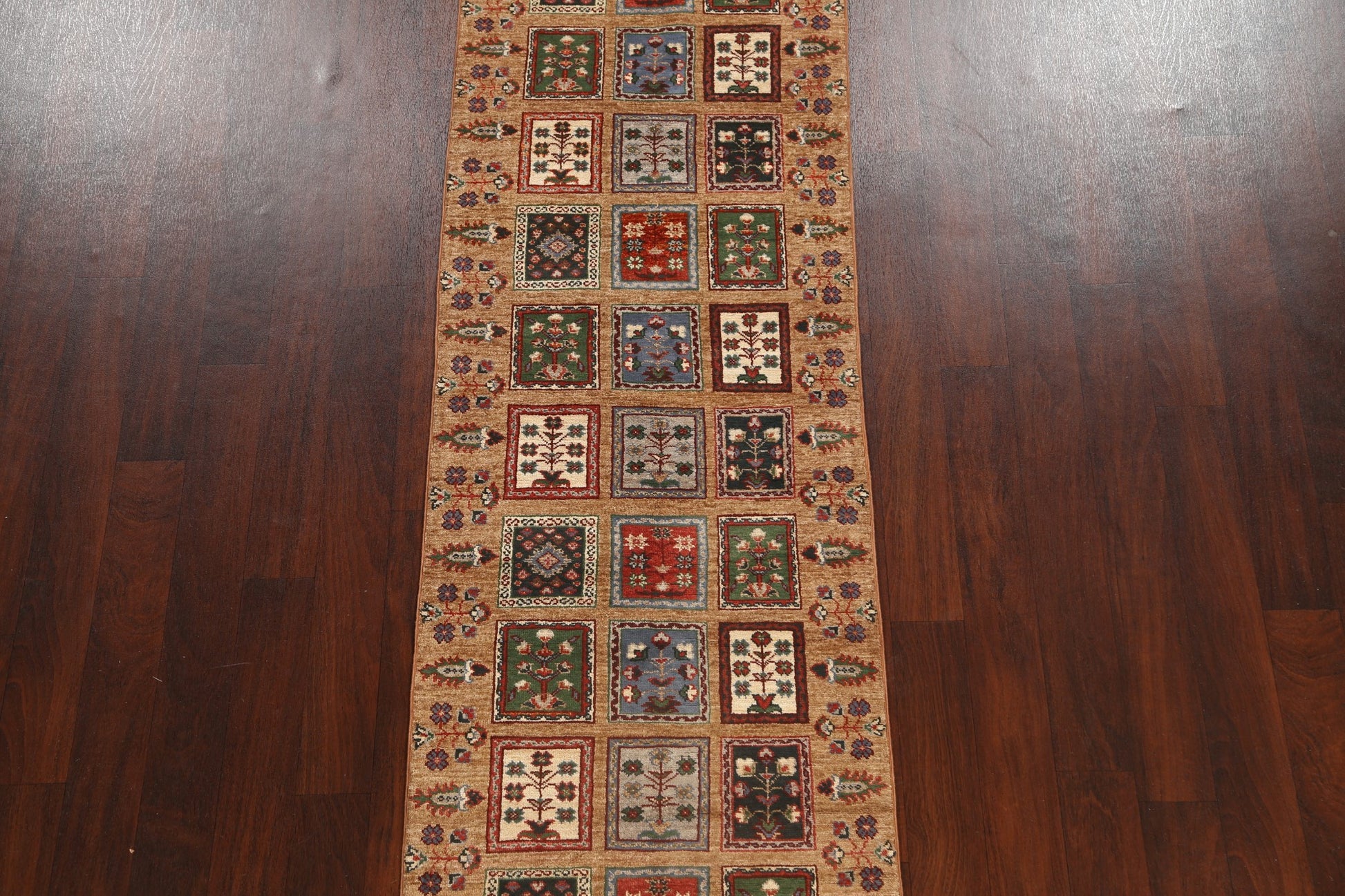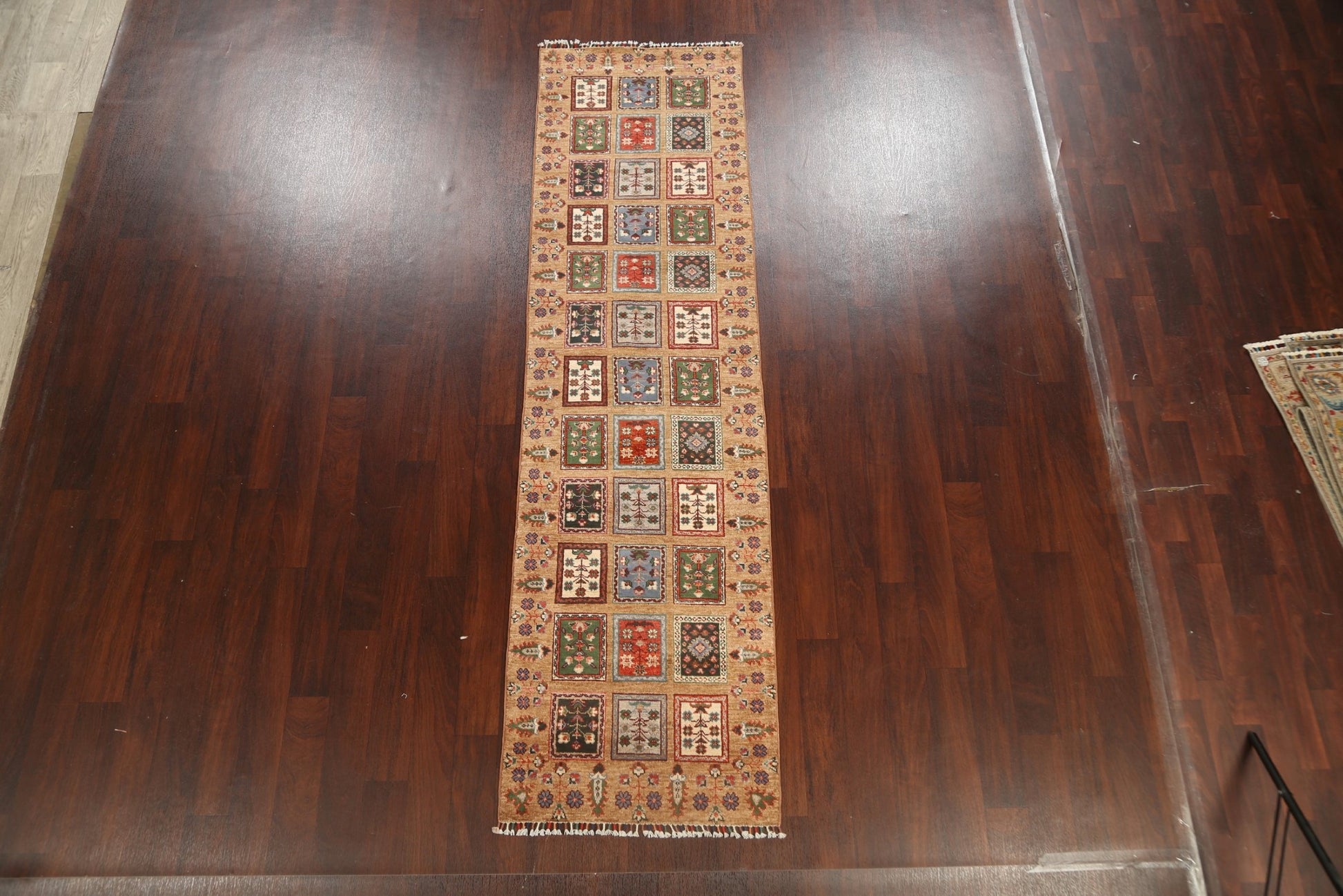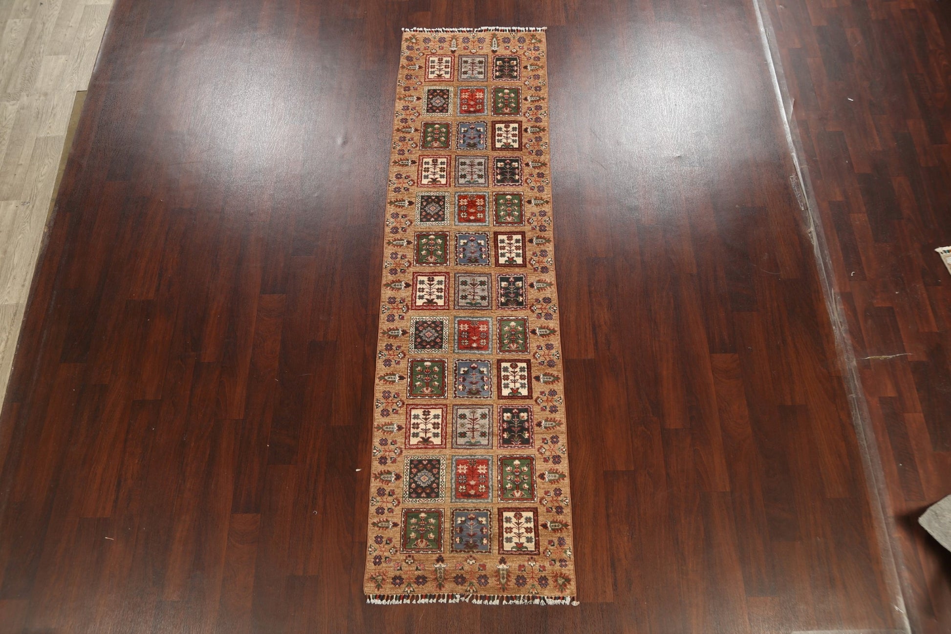 A Beautiful Genuine Pakistan Kazak rug is Hand Knotted by skillful weavers in Pakistan with 100% Wool Material. This rug is in New, First Quality condition. dimensions are 9' 7'' X 2' 7'' in foot and 292 X 79 in centimeter. the primary color is Brown.