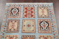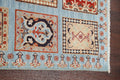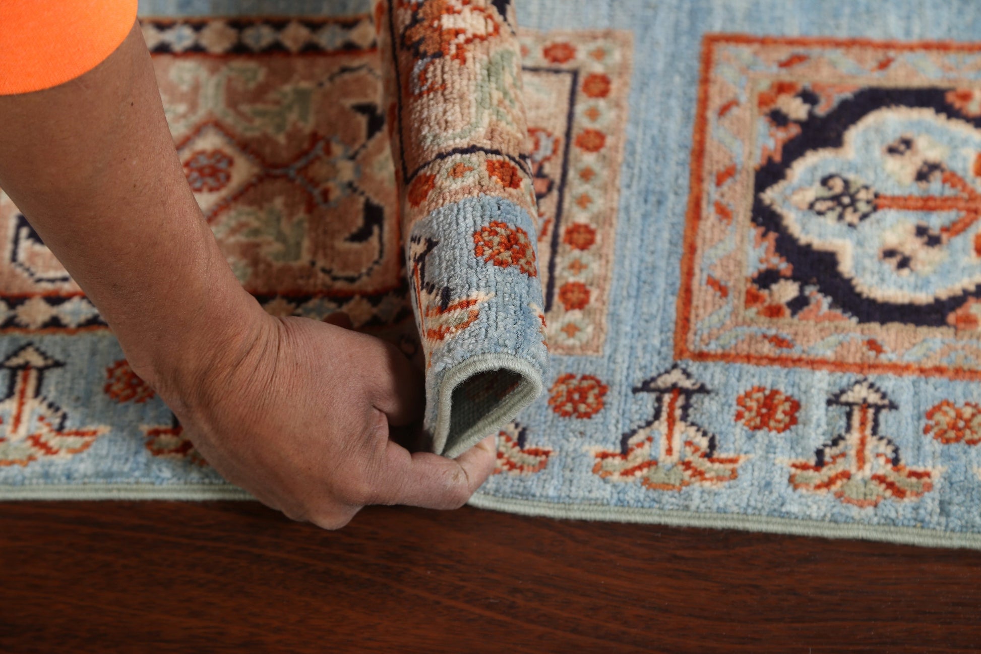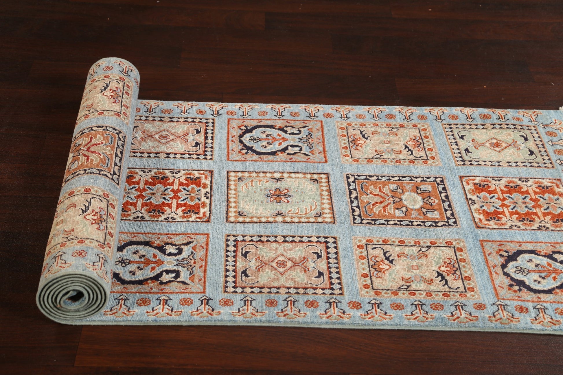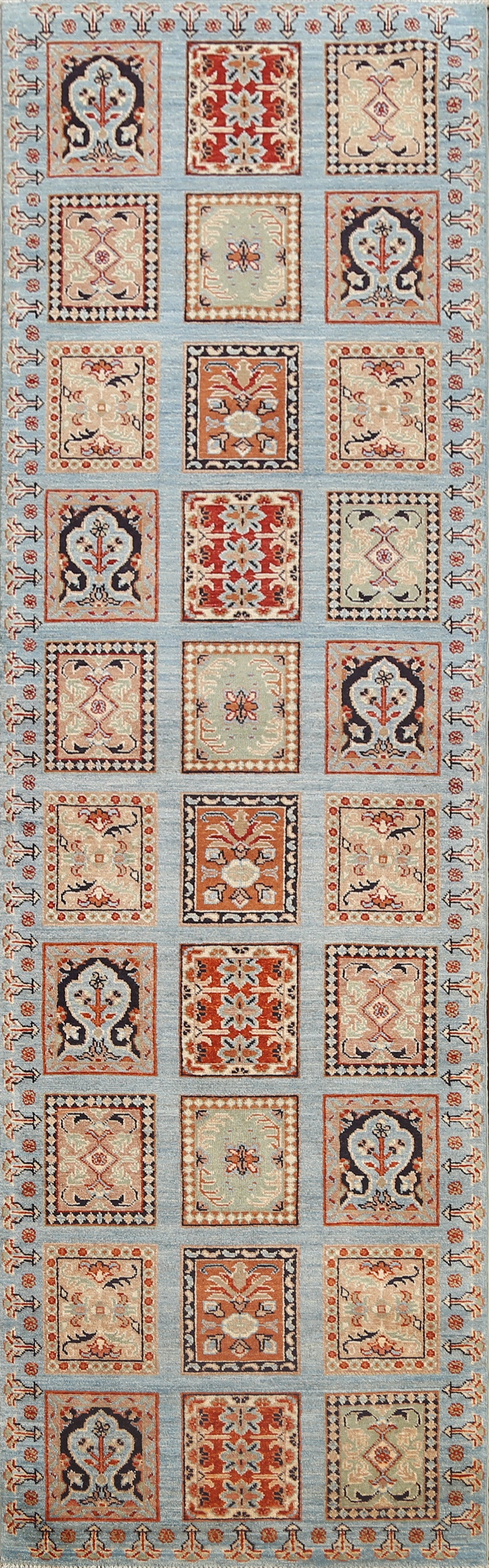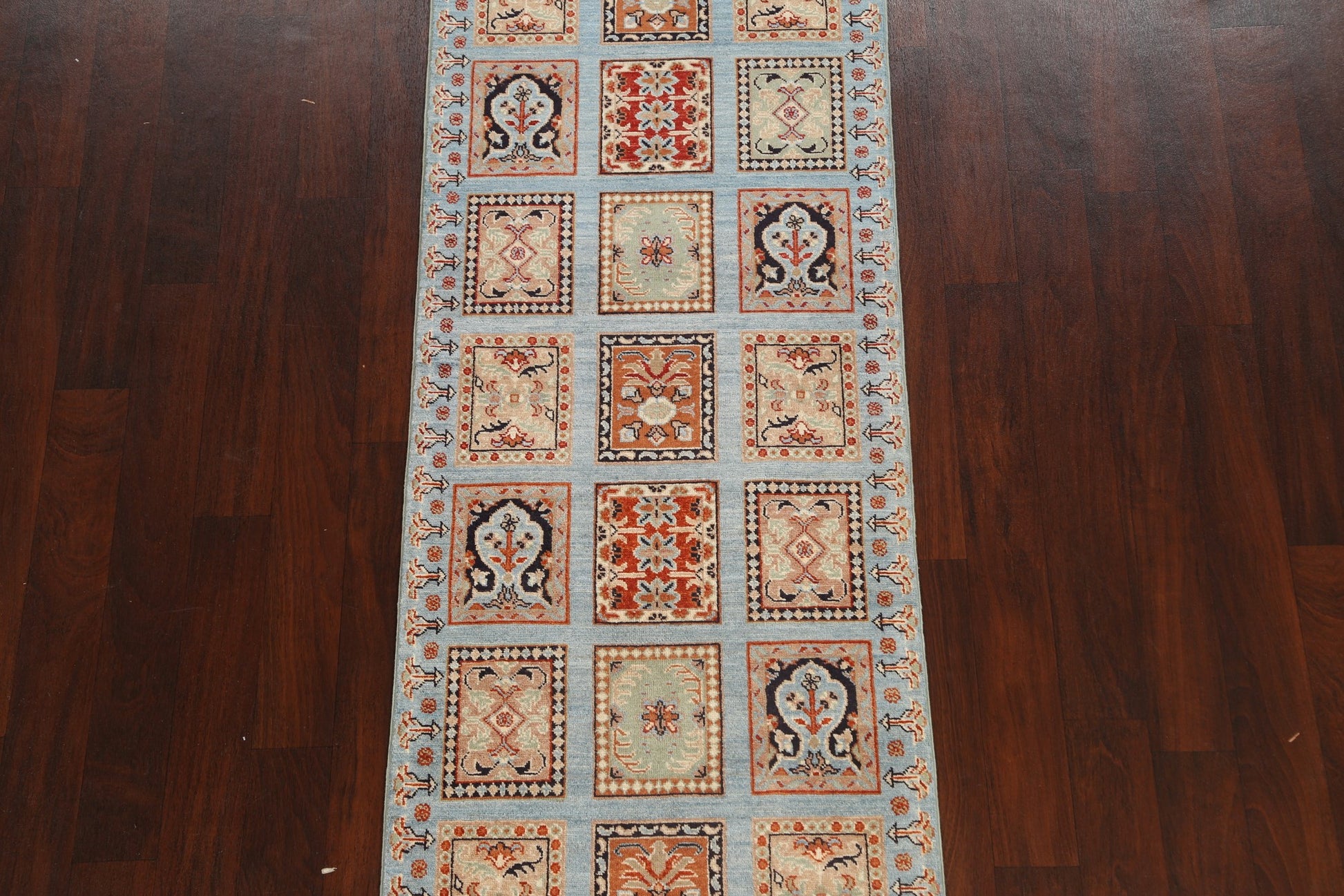 A Beautiful Genuine Pakistan Kazak rug is Hand Knotted by skillful weavers in Pakistan with 100% Wool Material. This rug is in New, First Quality condition. dimensions are 9' 7'' X 2' 9'' in foot and 292 X 84 in centimeter. the primary color is Navy Blue & Blues.