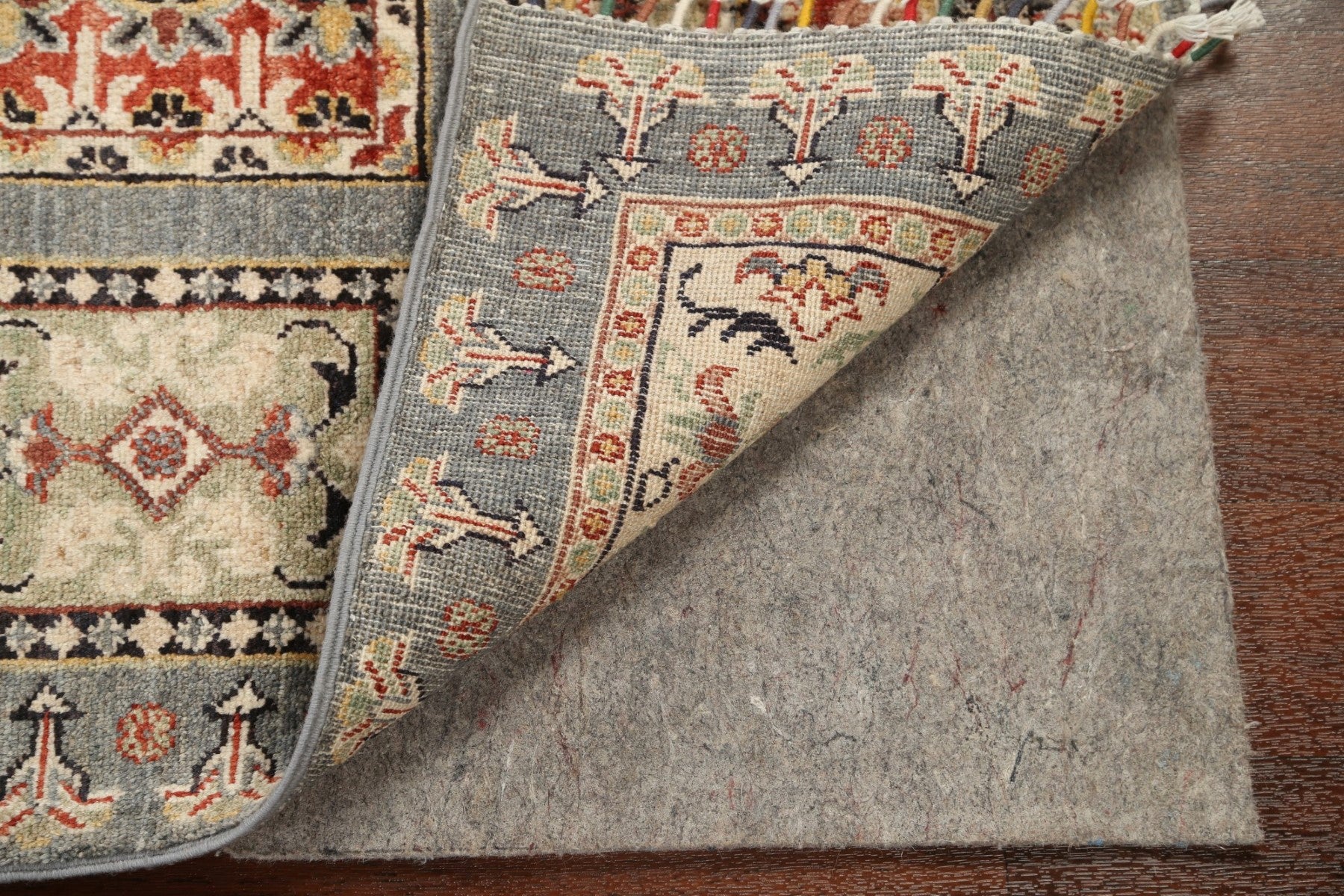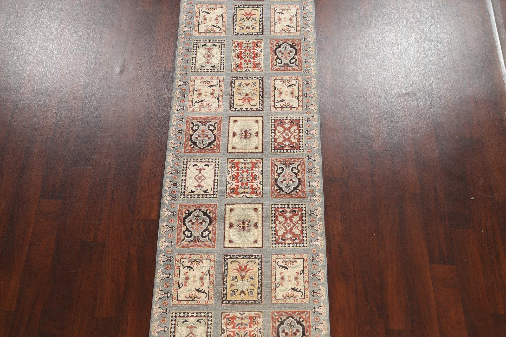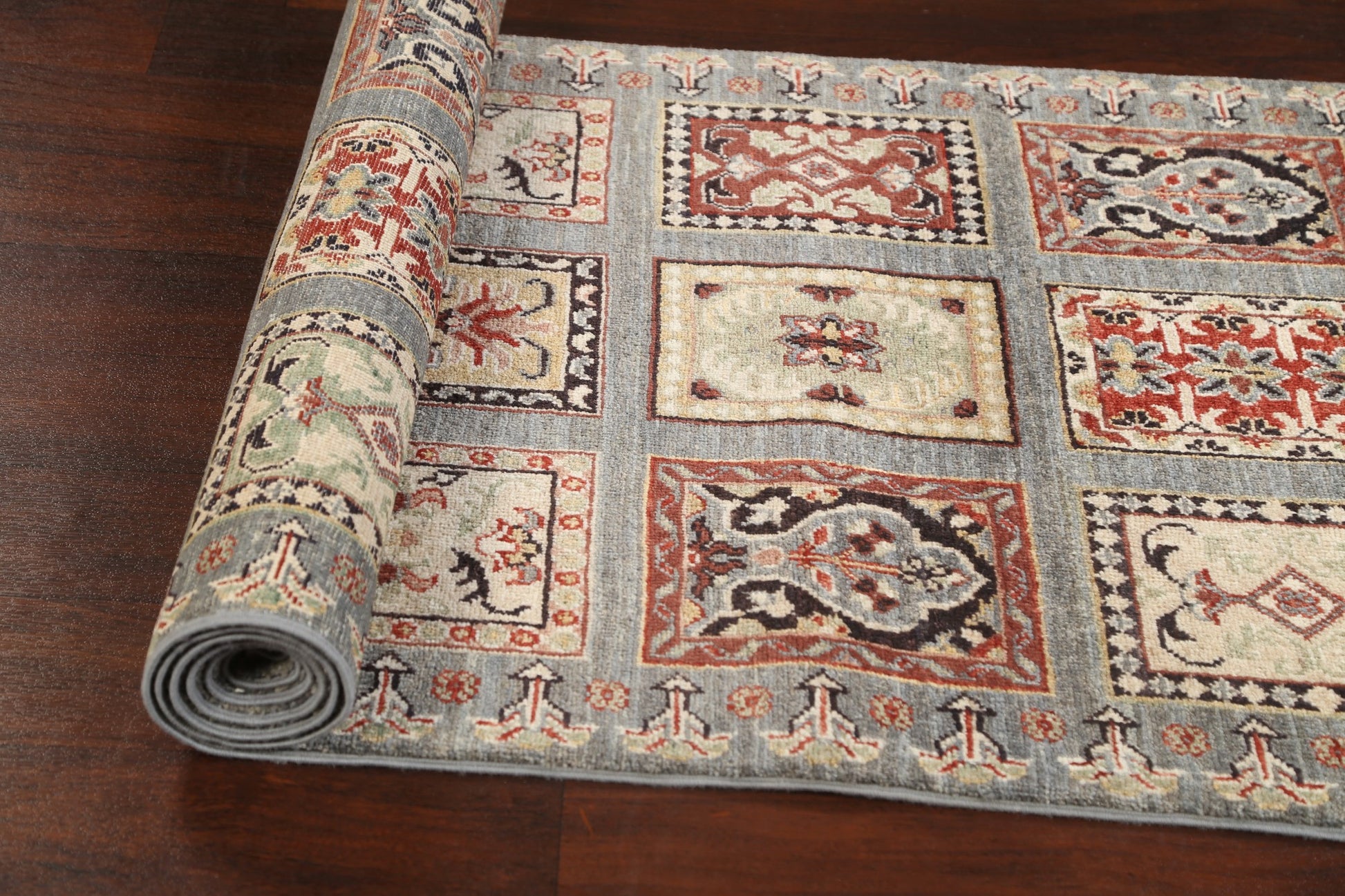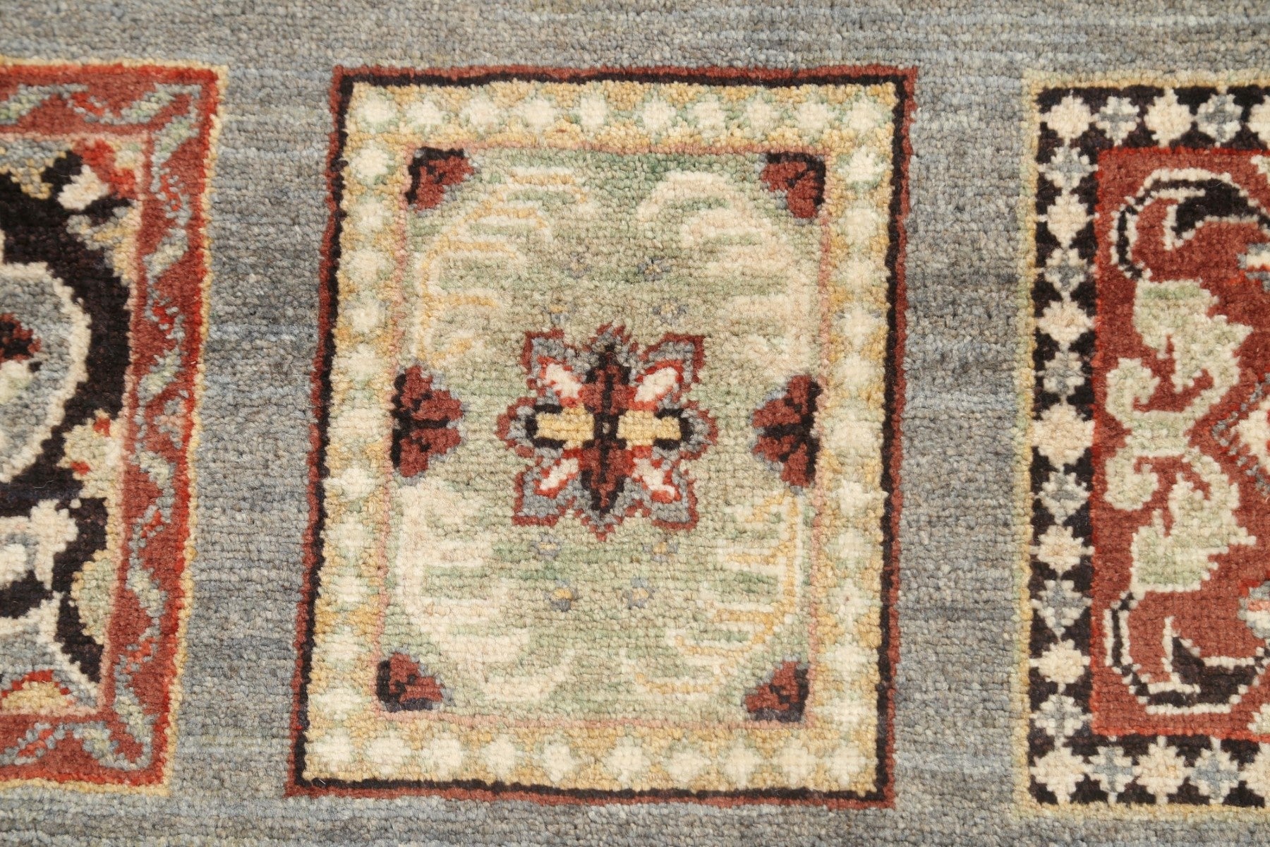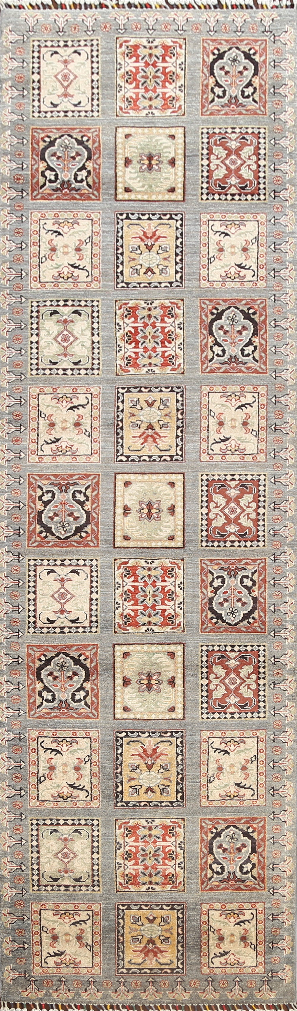 A Beautiful Genuine Pakistan Kazak rug is Hand Knotted by skillful weavers in Pakistan with 100% Wool Material. This rug is in New, First Quality condition. dimensions are 11' 0'' X 2' 9'' in foot and 335 X 84 in centimeter. the primary color is Greys & Charcoal.