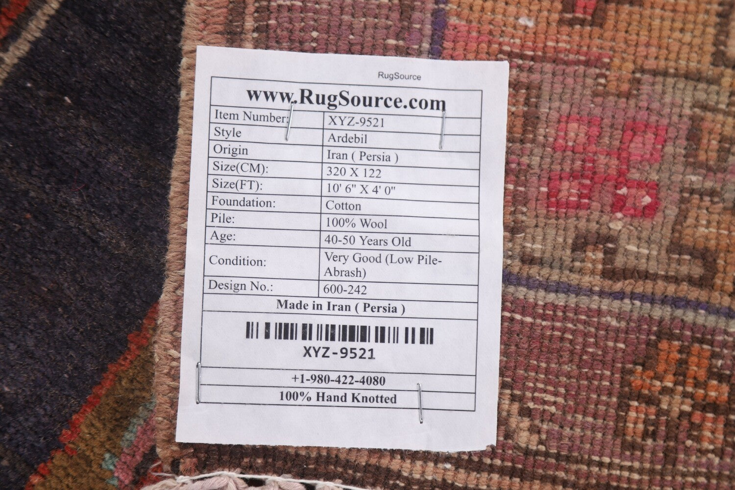 A Beautiful Genuine Persia ( Persia ) Ardebil rug is Hand Knotted by skillful weavers in Persia ( Persia ) with 100% Wool Material. This rug is in Very Good (Low Pile-Abrash) condition. dimensions are 10' 6'' X 4' 0'' in foot and 320 X 122 in centimeter. the primary color is Multi-Colored.