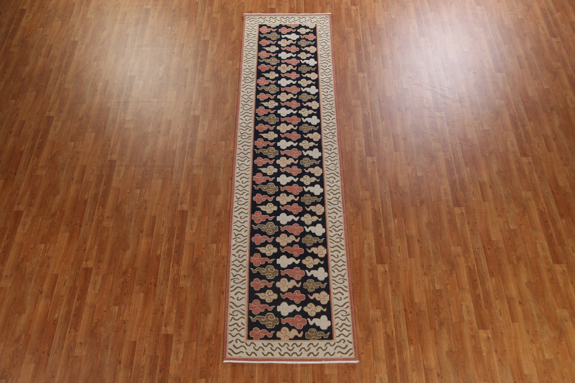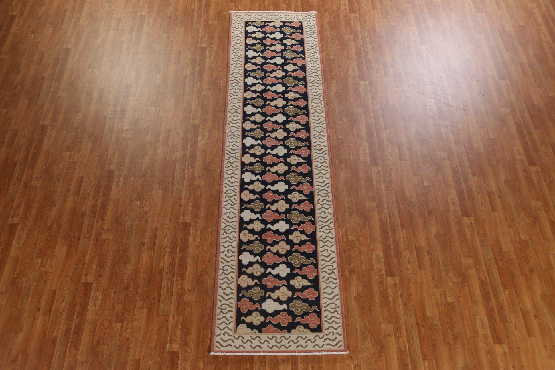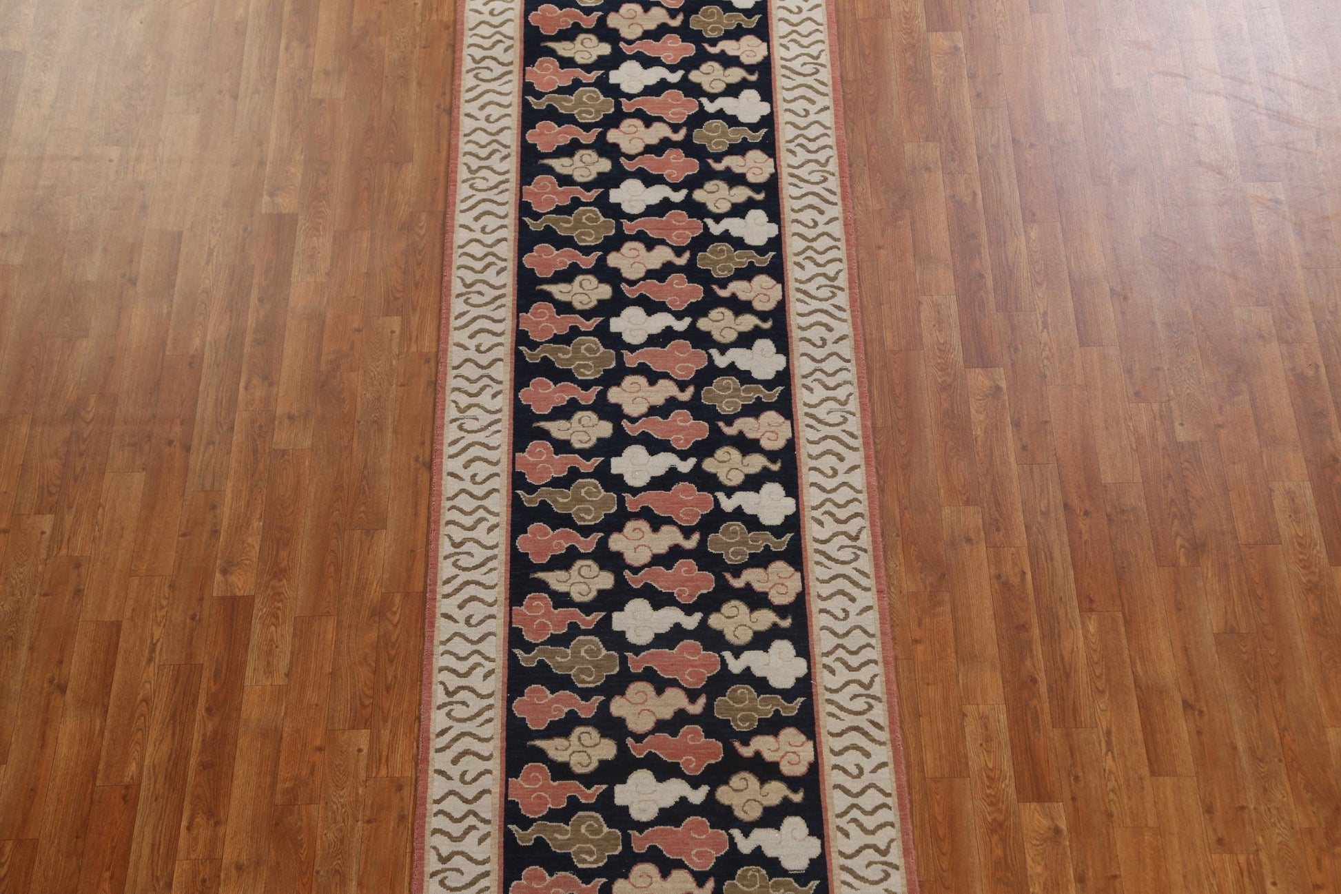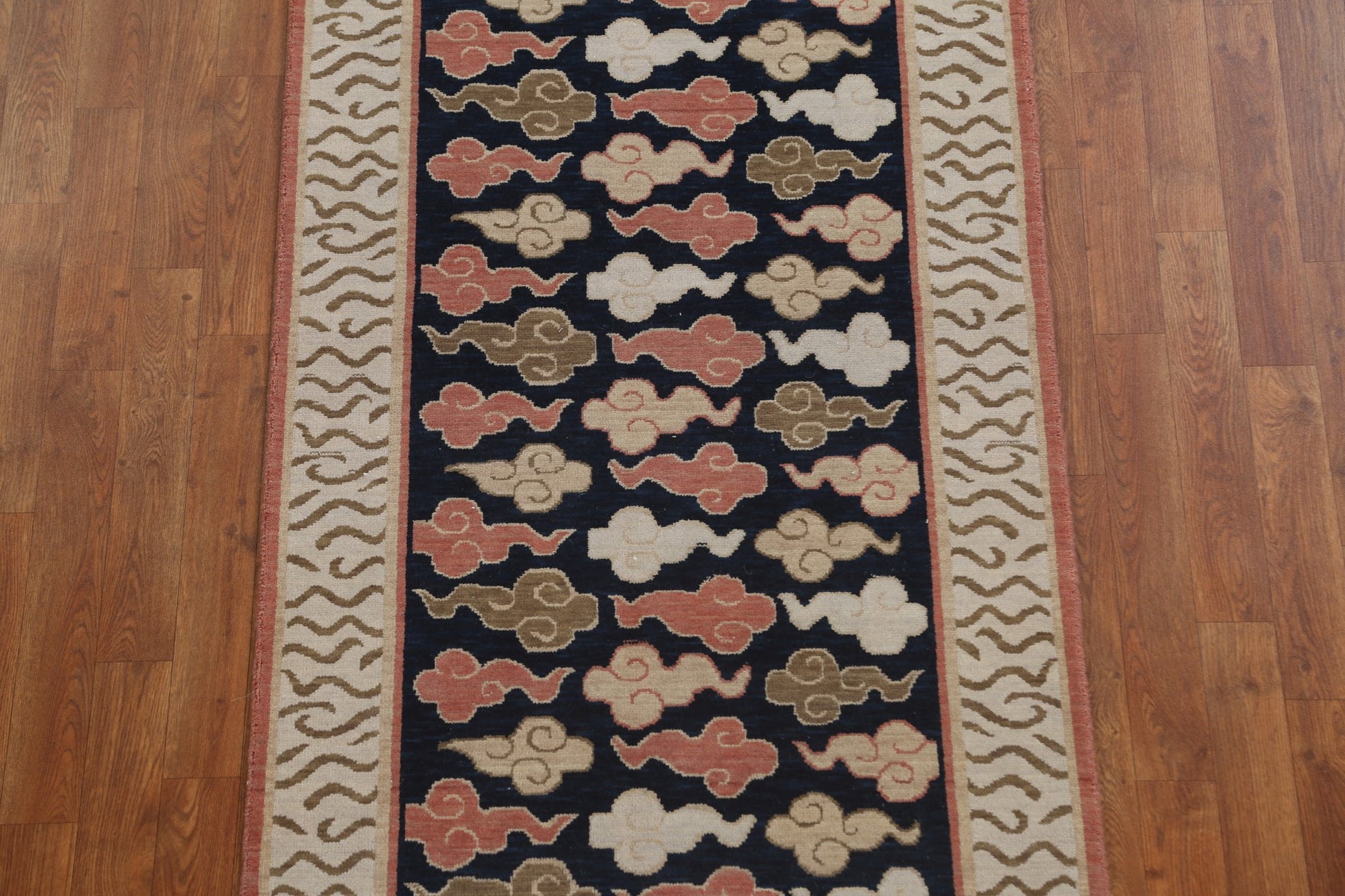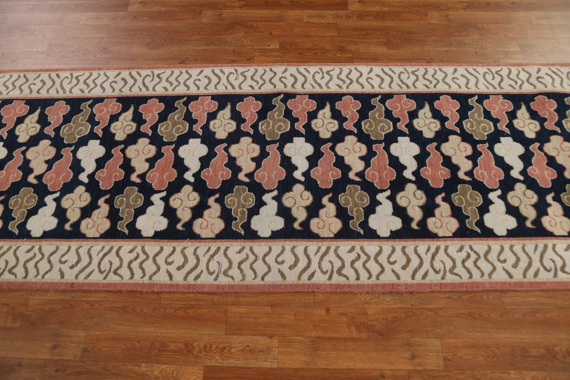 A Beautiful Genuine Turkey Art Deco rug is Hand Knotted by skillful weavers in Turkey with 100% Wool Material. This rug is in New, First Quality condition. dimensions are 11' 8'' X 2' 11'' in foot and 356 X 89 in centimeter. the primary color is Navy Blue & Blues.